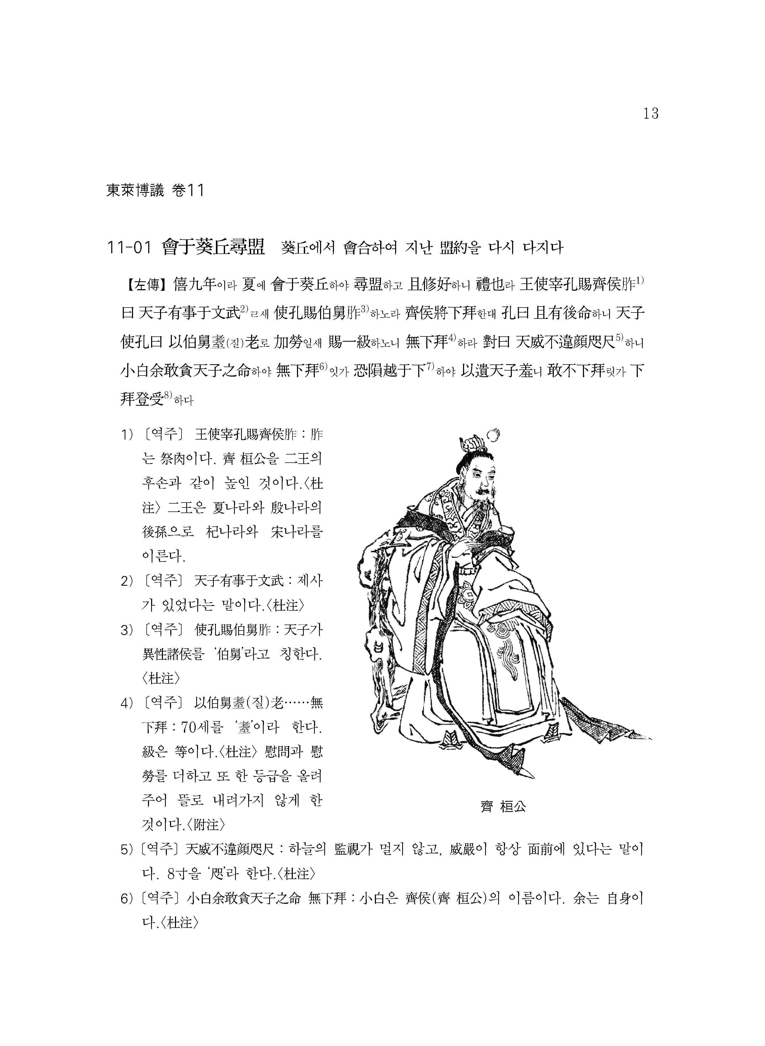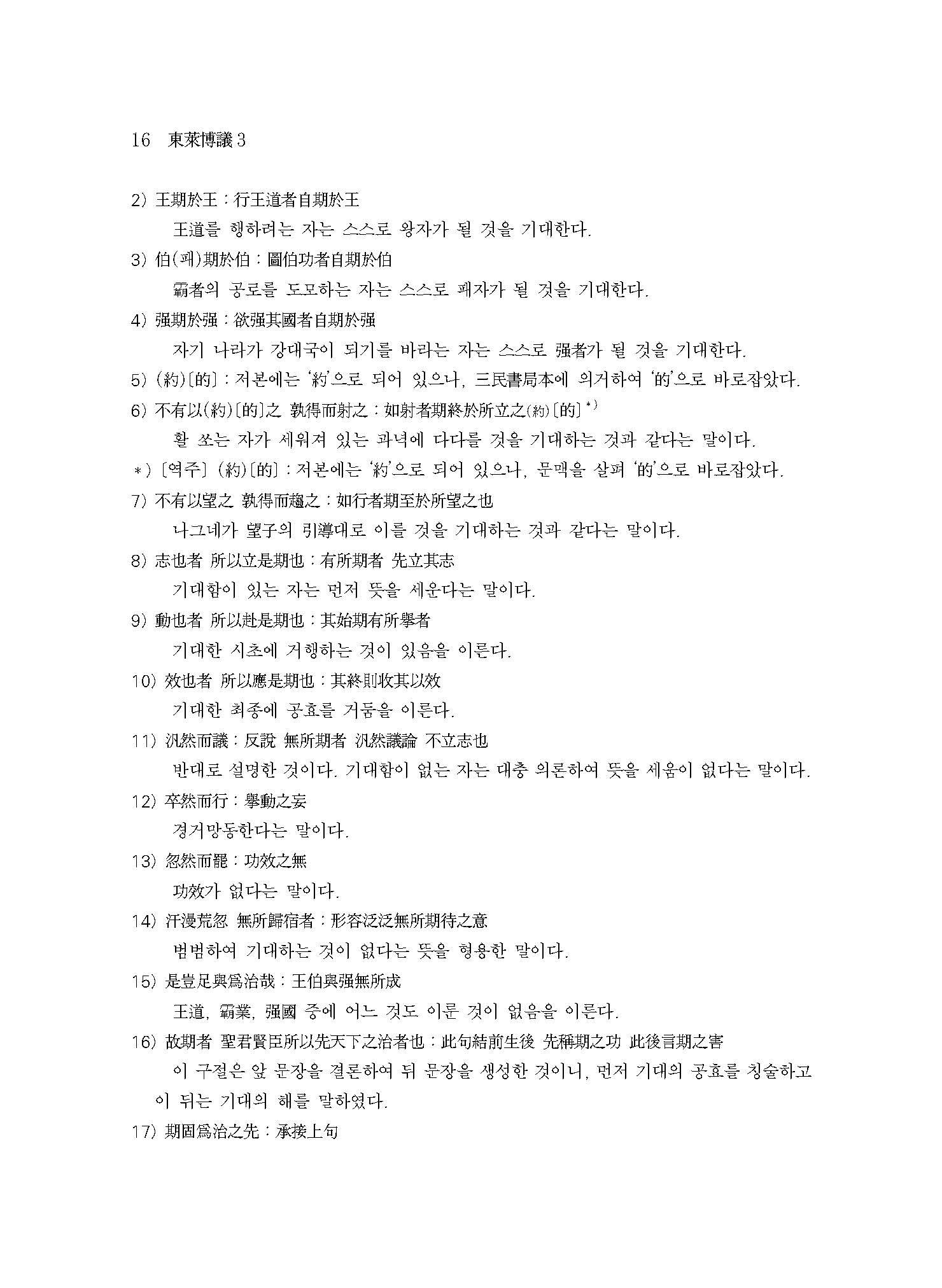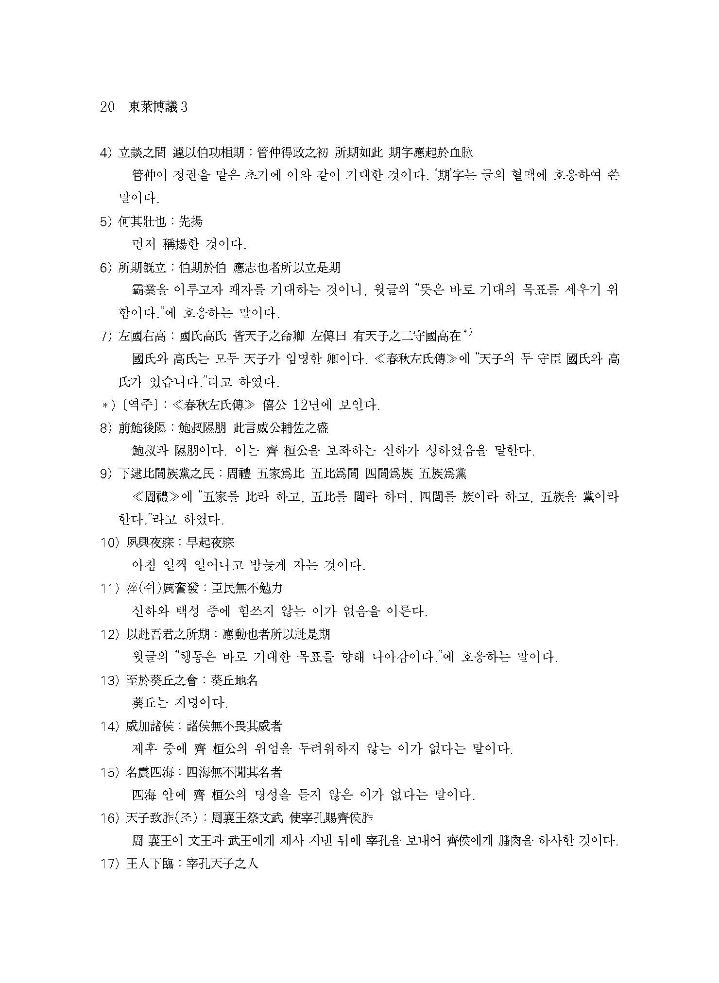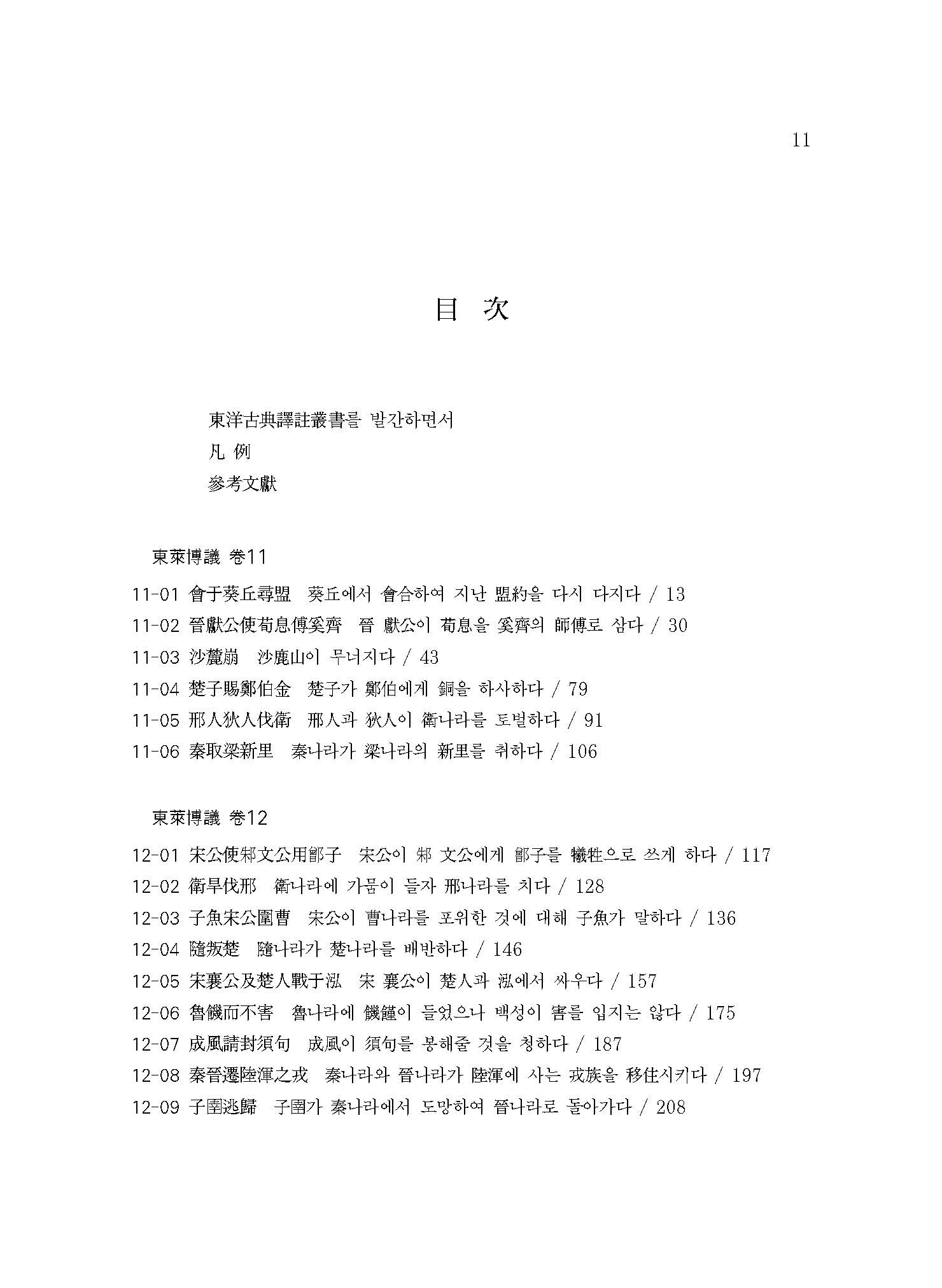 ≪역주 동래박의 3≫은 저본 11~15권까지의 내용을 담았다. 원문에는 전통적 방식의 현토懸吐를 하여 단락별로 번역문과 함께 실어놓음으로써, 원문의 문장구조를 이해하기 쉽도록 하였다. 또한 역주譯註에서는 관련 고사故事와 인물人物뿐만 아니라, 내용 이해에 필요한 역사적 사실이나 제도적인 면까지 심도 있게 밝힘으로써 일반 독자들도 쉽게 이해할 수 있도록 하였다. ≪춘추좌씨전≫의 대표적인 평론서評論書인 ≪동래박의≫를 통해 ≪춘추좌씨전≫을 요약하여 봄과 아울러 역사 평론의 진미를 맛볼 수 있을 것이다.