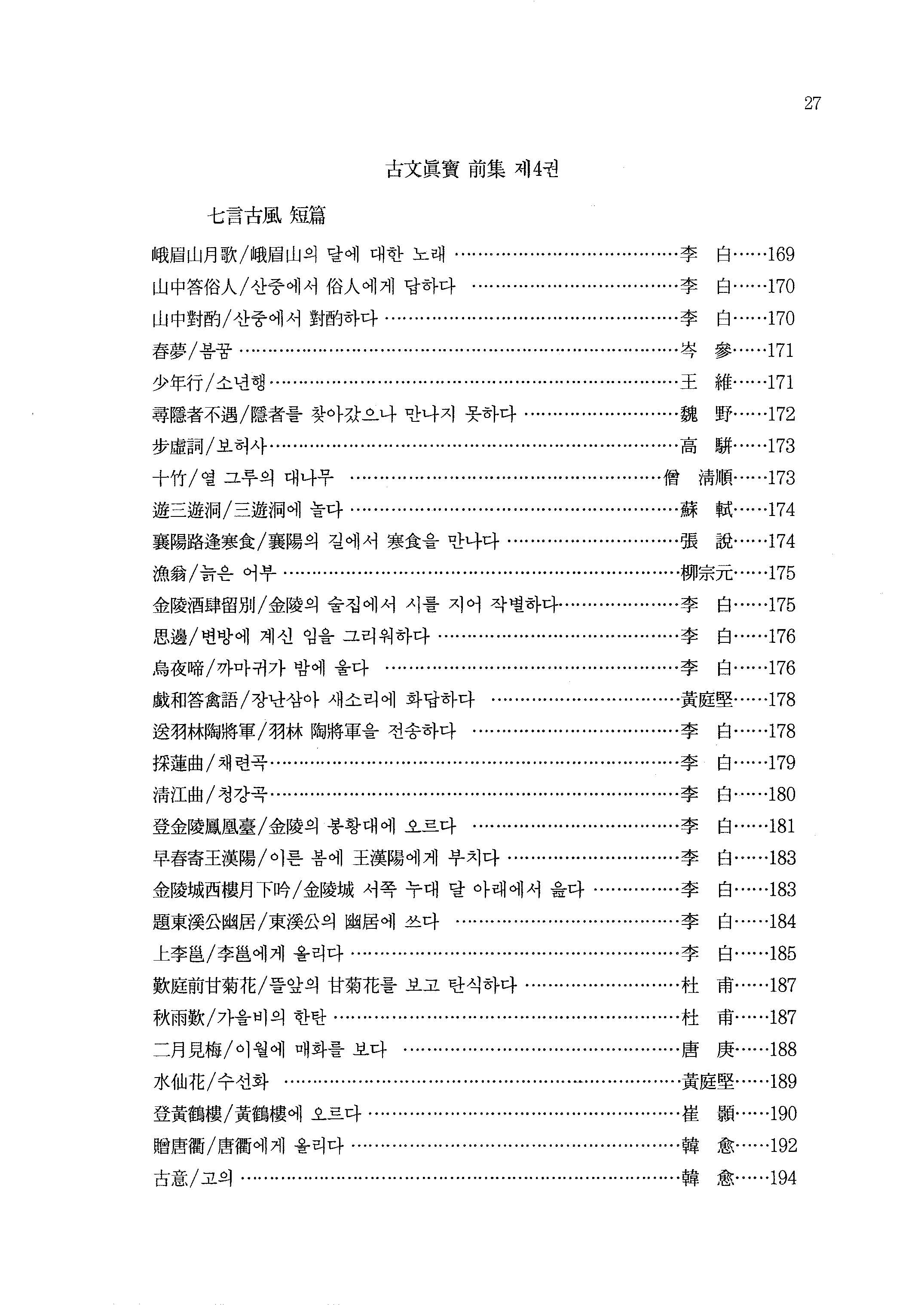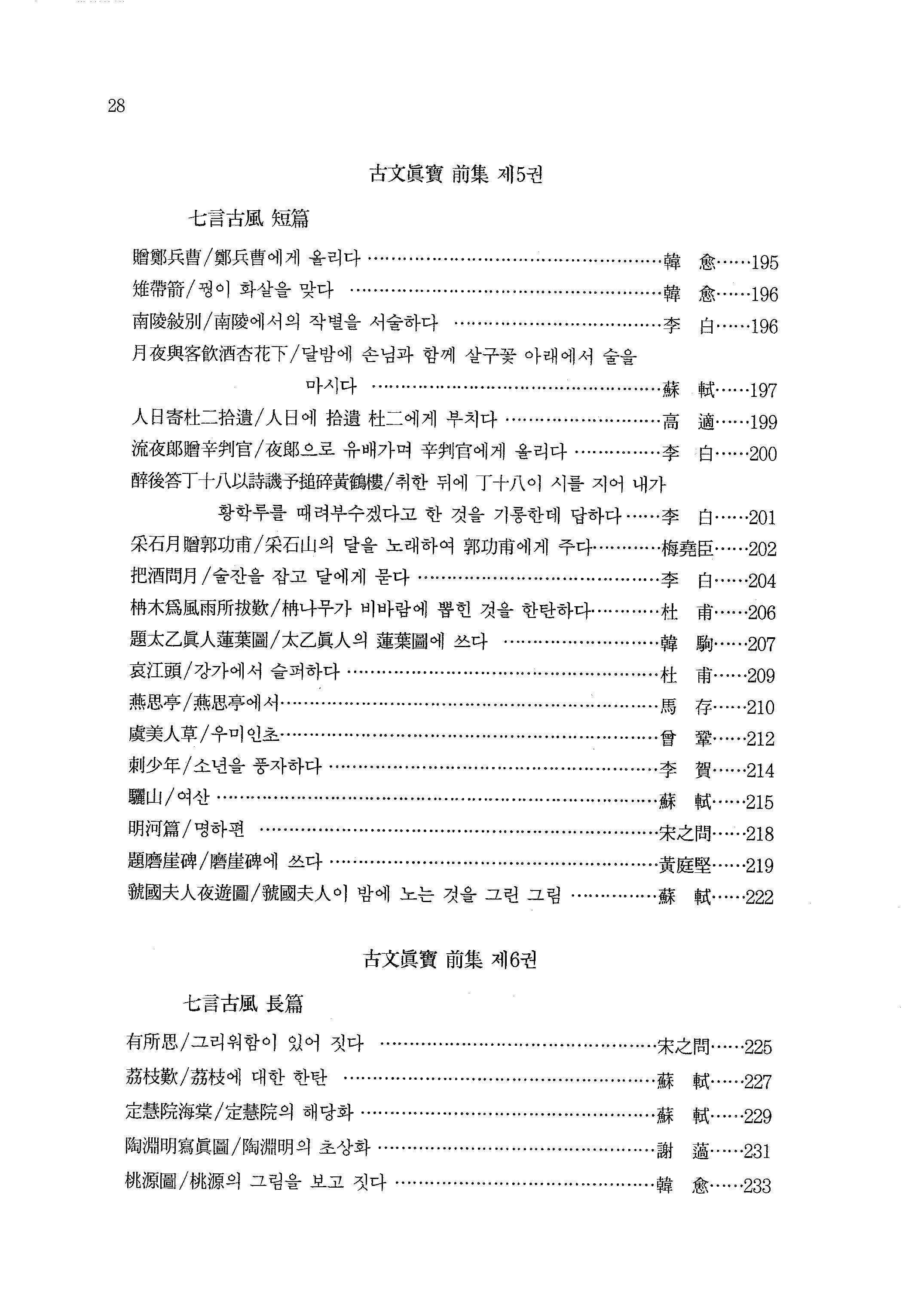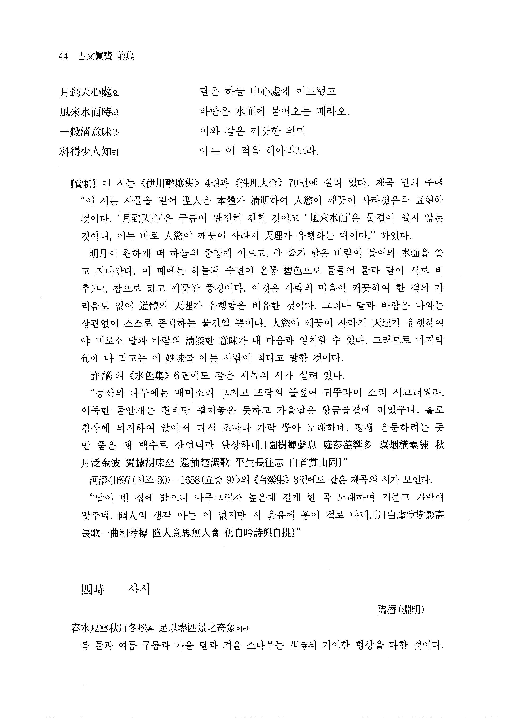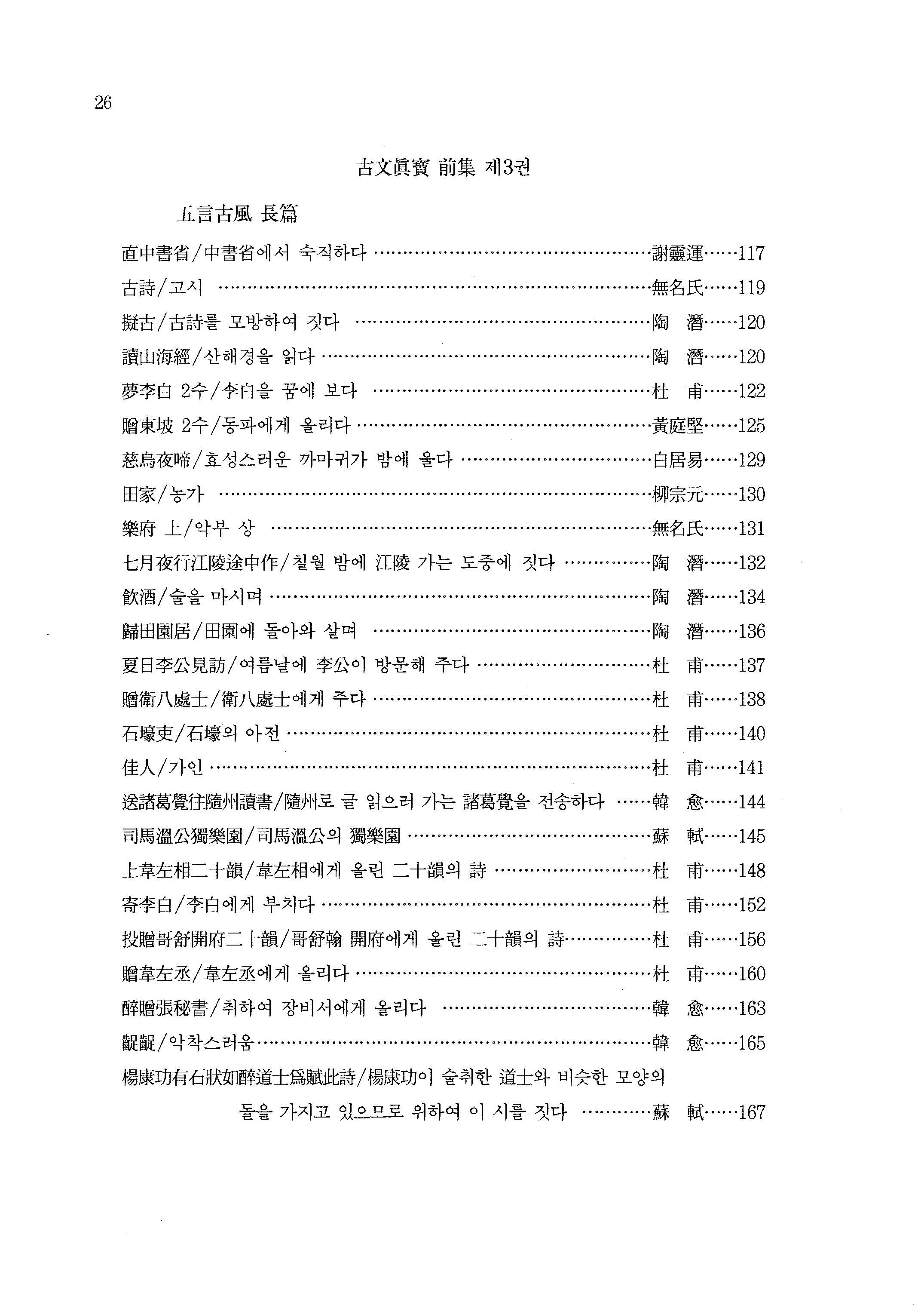 이미 四書三經을 현토 완역했던 成百曉교수가 수차에 걸쳐 강독한 연구 성과를 엮은 것으로, 우리 先祖들은 經學에 치중한 나머지 經傳을 풀이한 내용은 많이 있으나 古文眞寶와 같은 文章 위주의 選集類에 손을 댄 것은 참으로 드물다. 그런 만큼 우리 祖上들이 남긴 기록을 뽑아 本書에 收錄한 것은 더욱 意義있는 작업이라고 자부한다. 본서의 出刊으로 韓中詩 연구에 진일보하기를 기대하는 바이다.