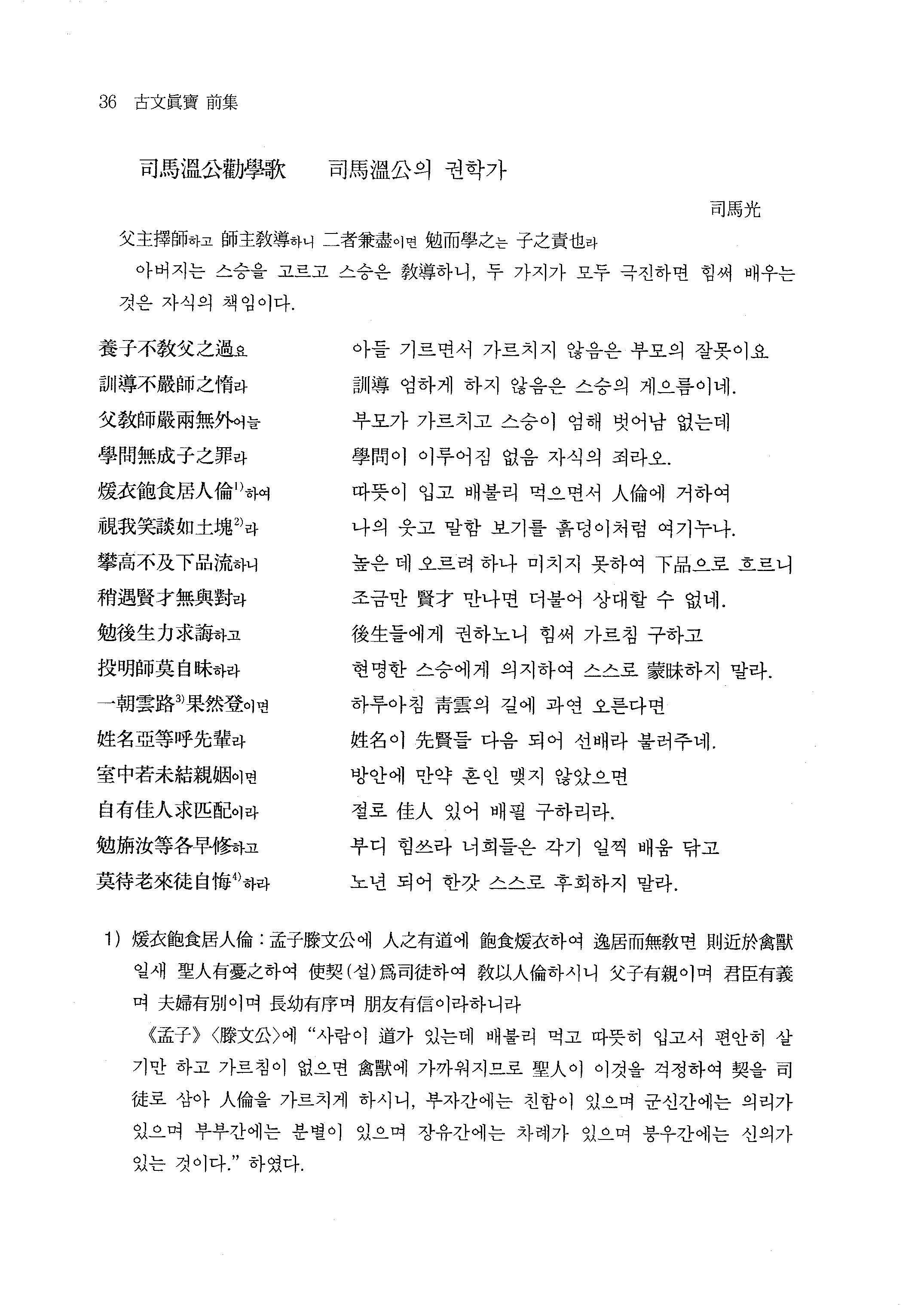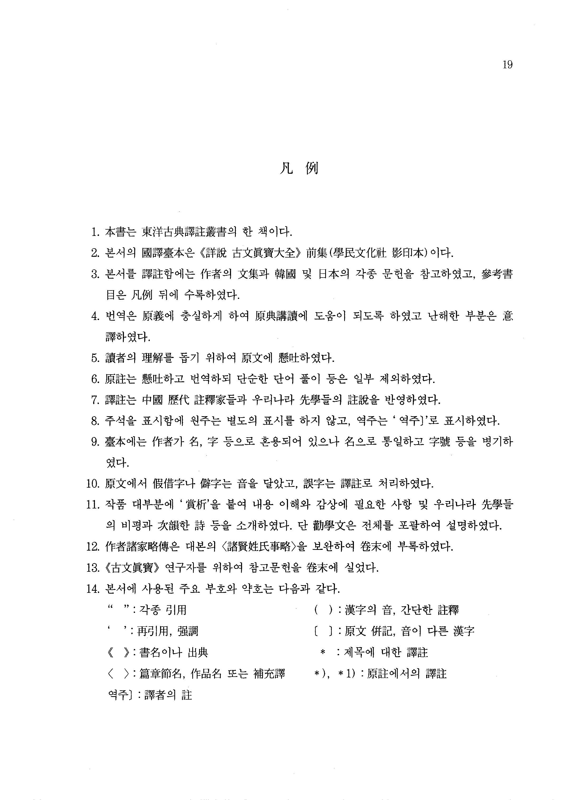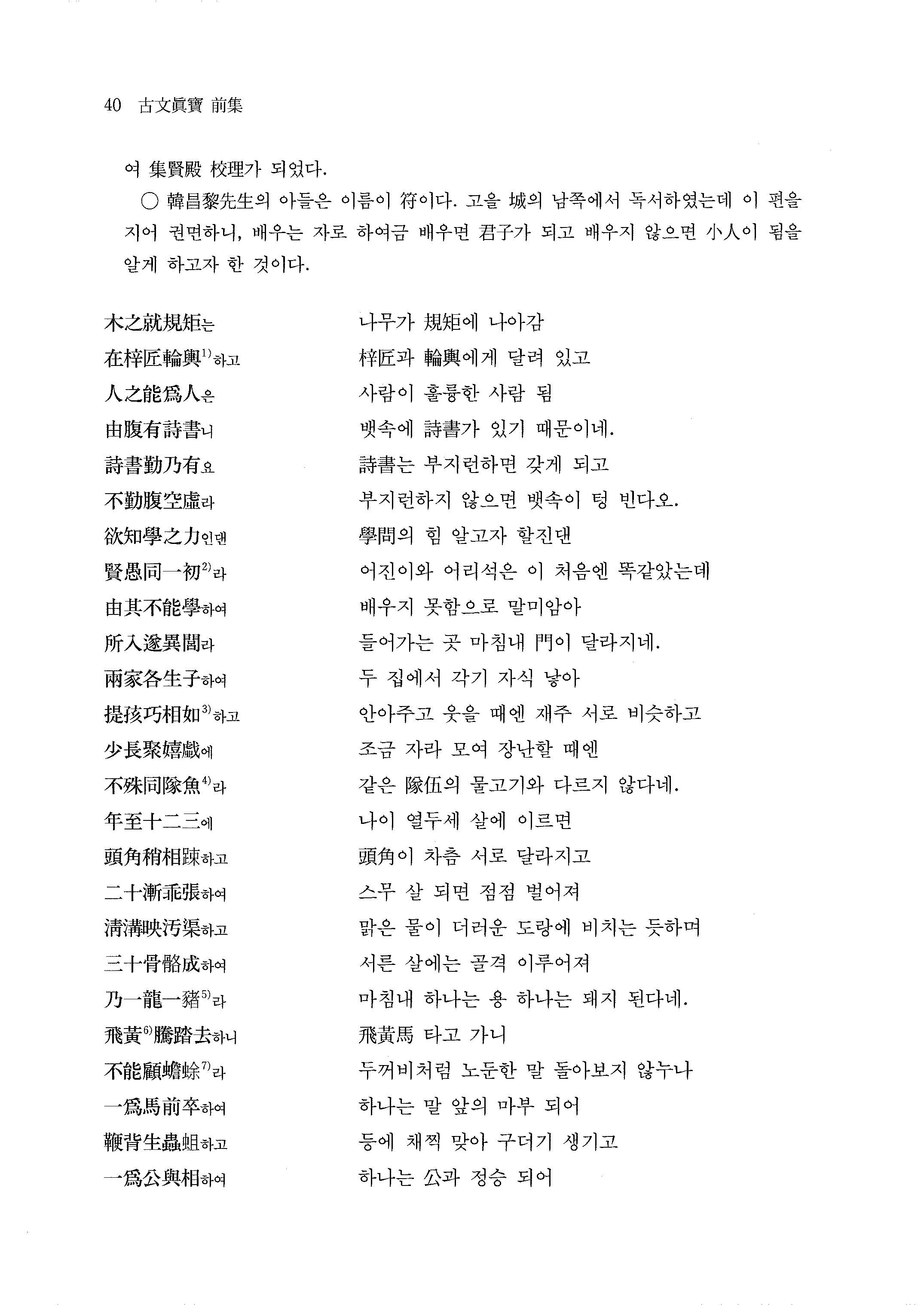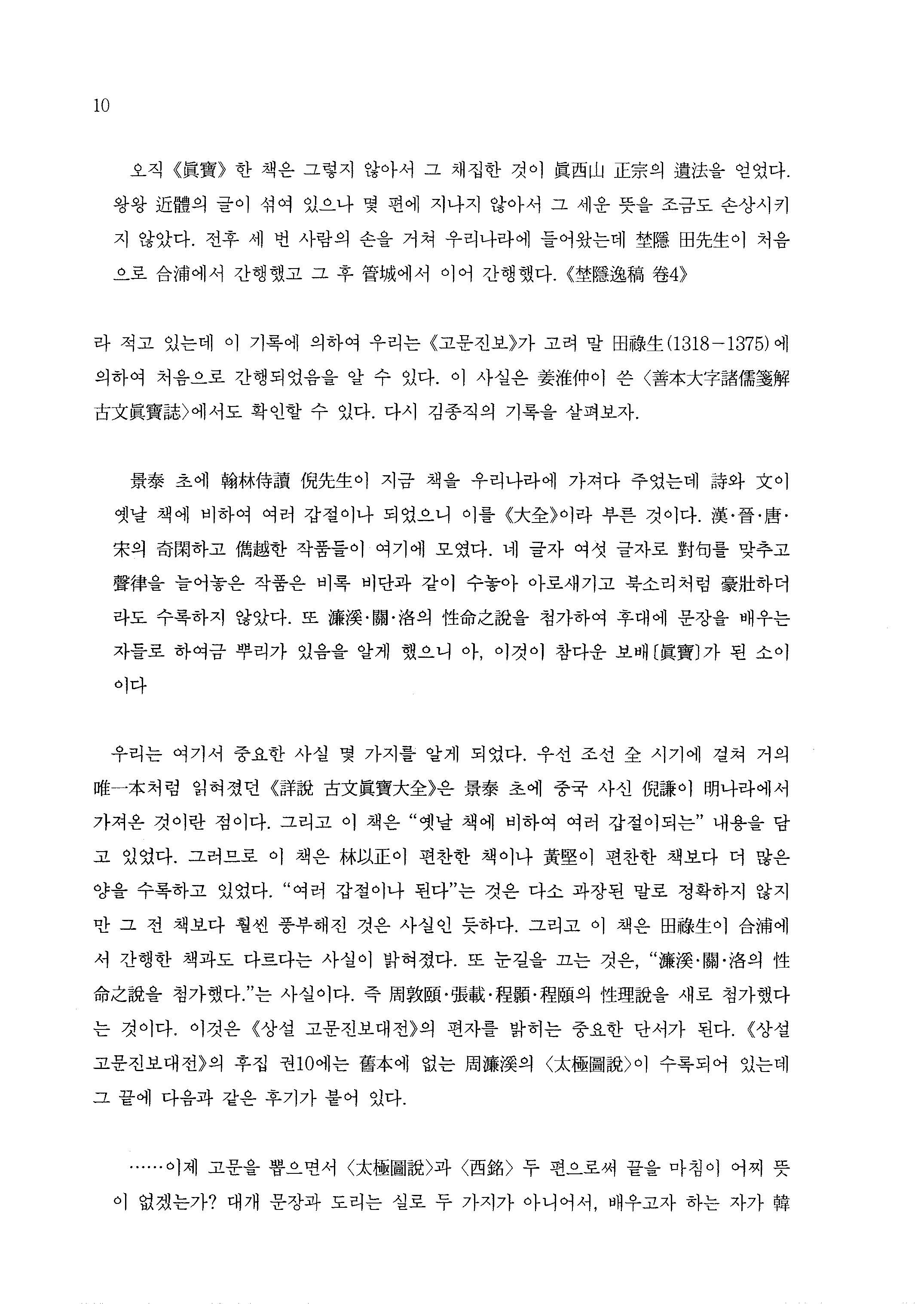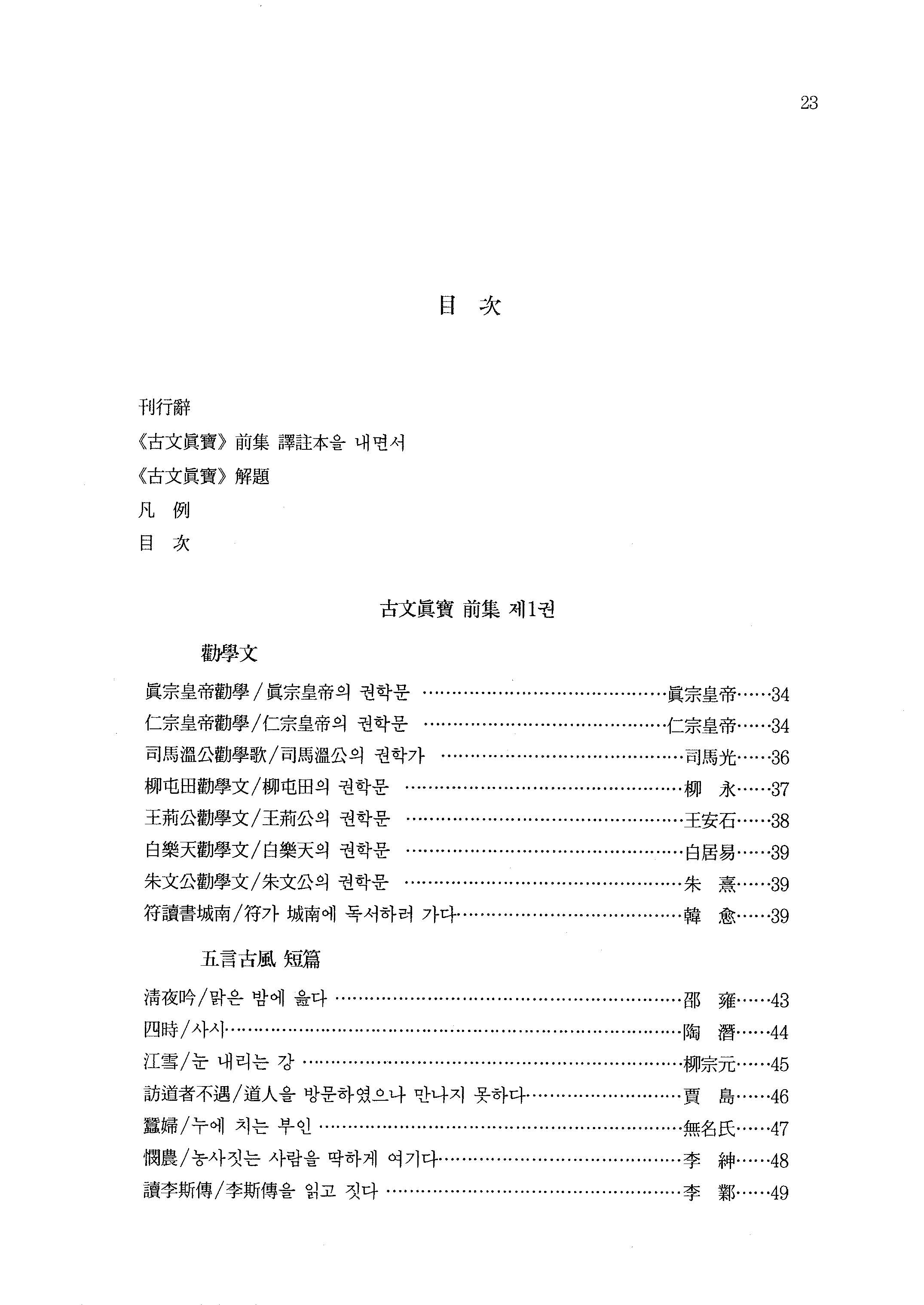 이미 四書三經을 현토 완역했던 成百曉교수가 수차에 걸쳐 강독한 연구 성과를 엮은 것으로, 우리 先祖들은 經學에 치중한 나머지 經傳을 풀이한 내용은 많이 있으나 古文眞寶와 같은 文章 위주의 選集類에 손을 댄 것은 참으로 드물다. 그런 만큼 우리 祖上들이 남긴 기록을 뽑아 本書에 收錄한 것은 더욱 意義있는 작업이라고 자부한다. 본서의 出刊으로 韓中詩 연구에 진일보하기를 기대하는 바이다.