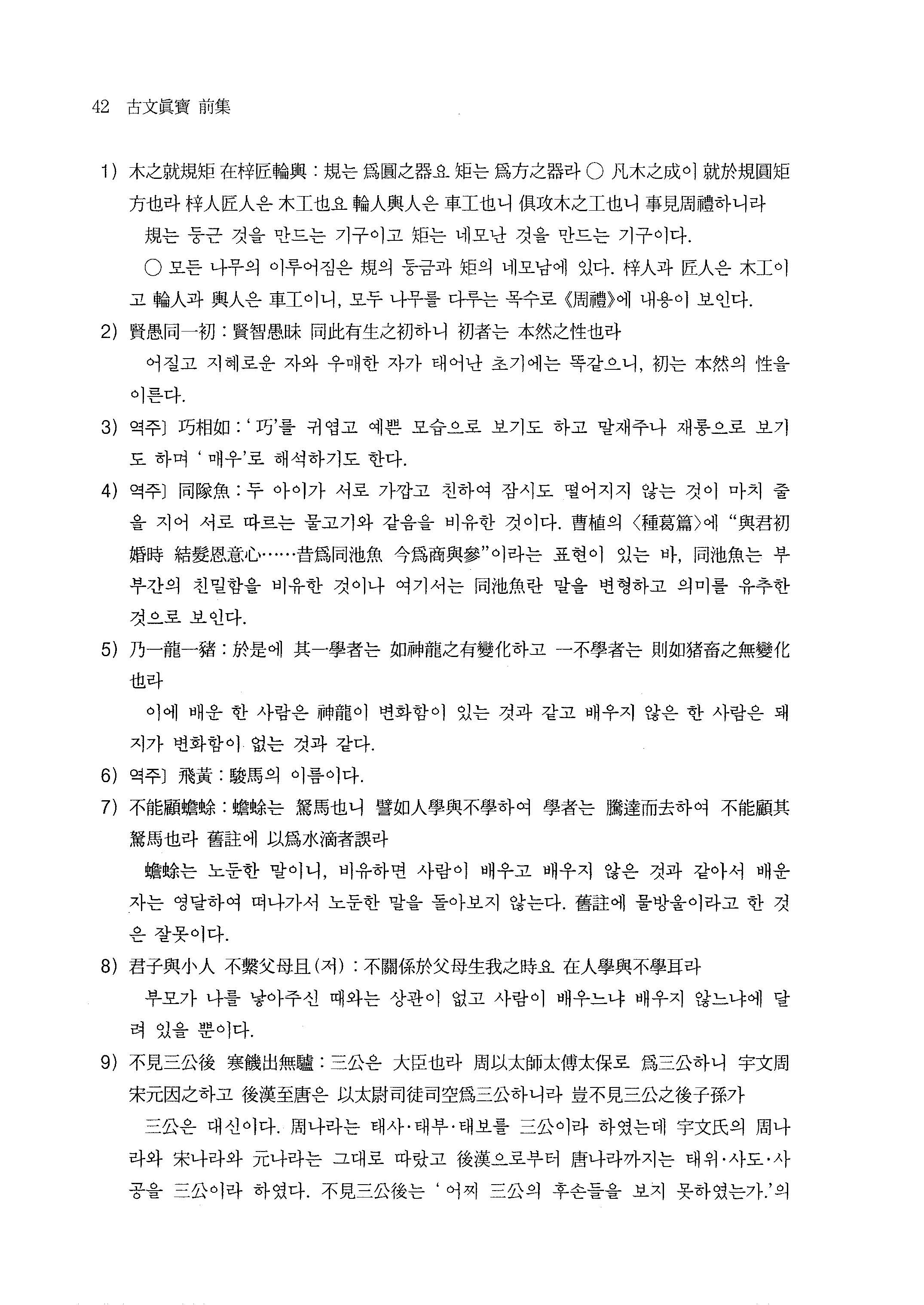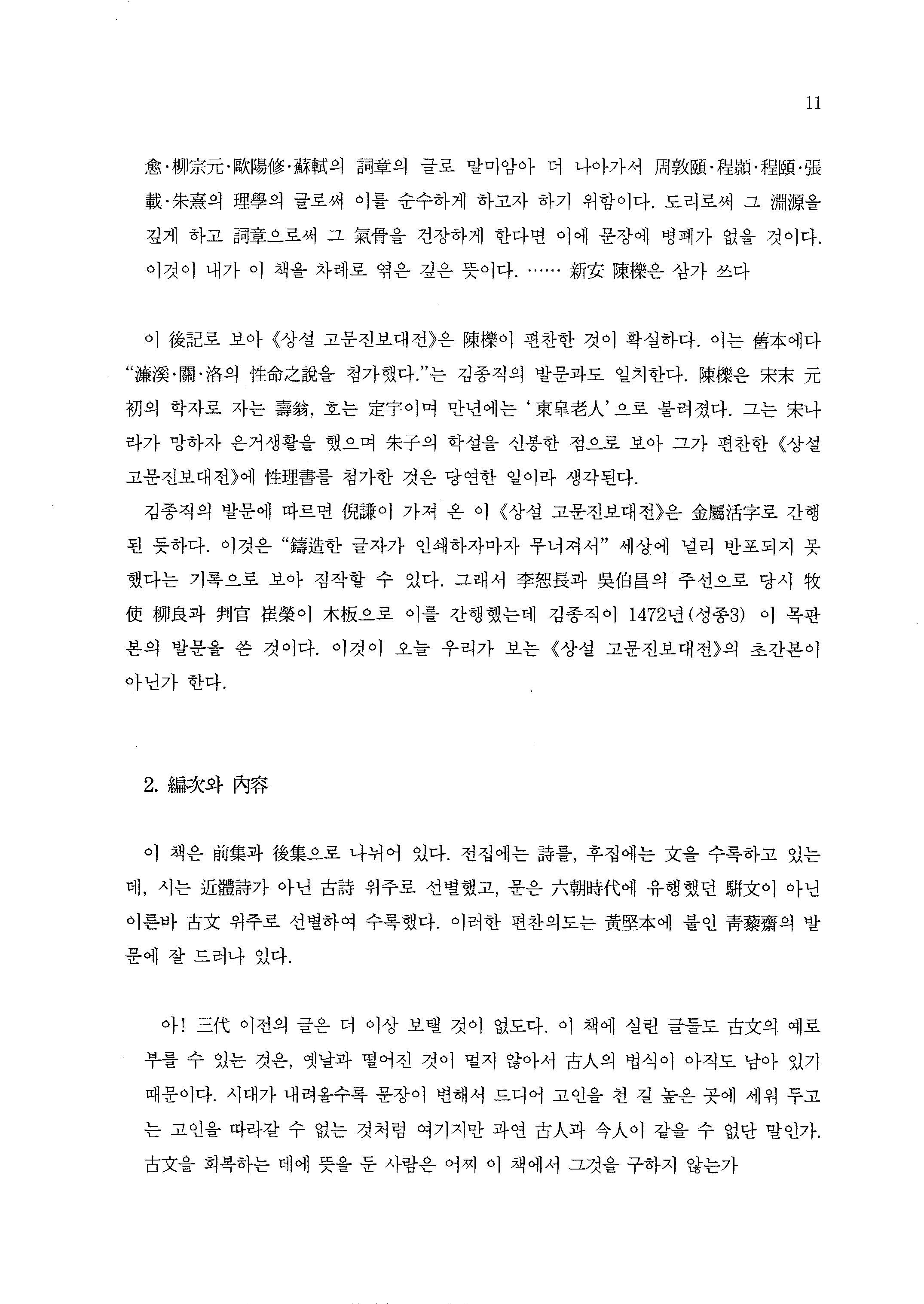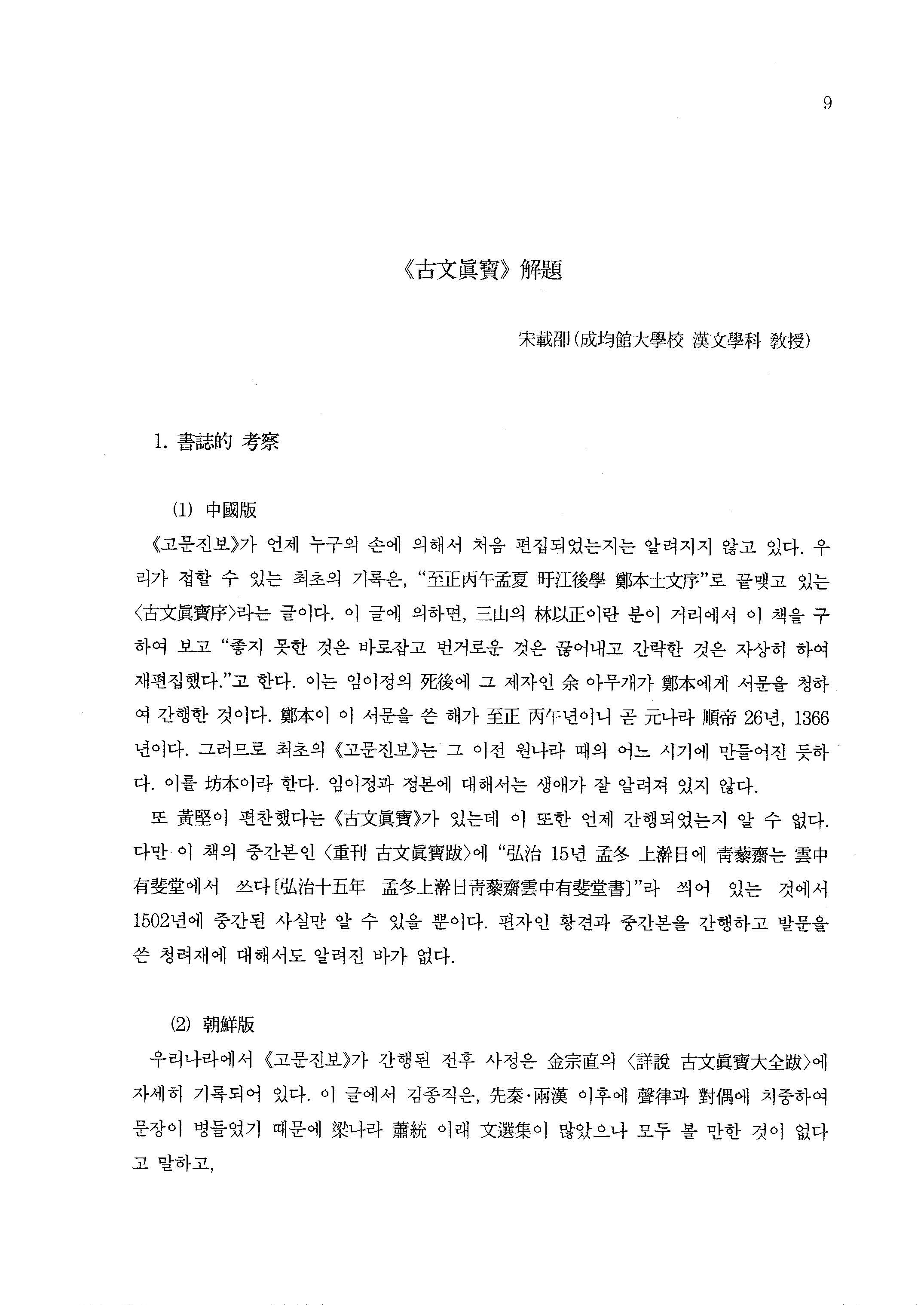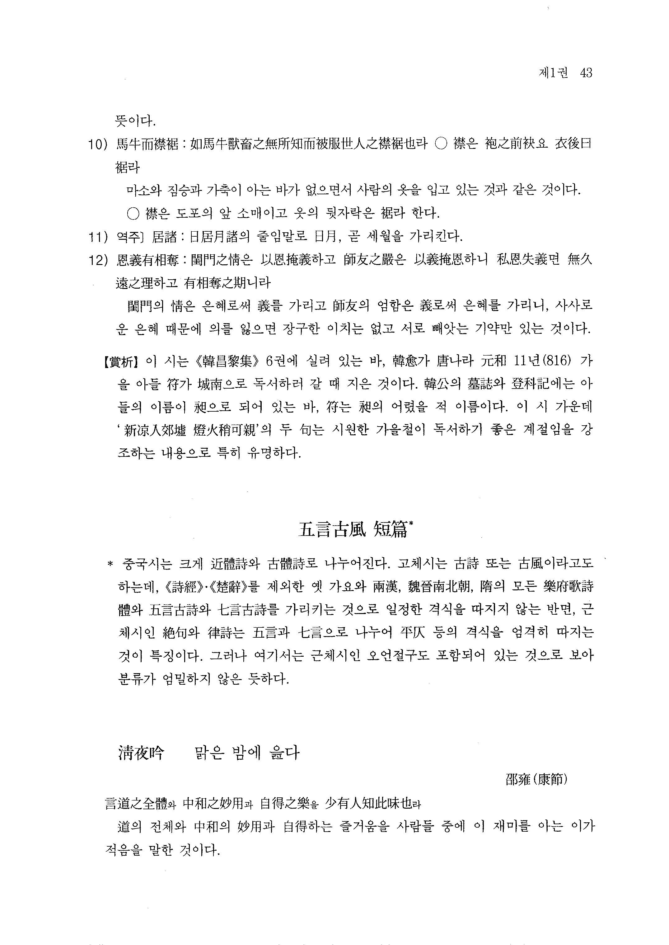 이미 四書三經을 현토 완역했던 成百曉교수가 수차에 걸쳐 강독한 연구 성과를 엮은 것으로, 우리 先祖들은 經學에 치중한 나머지 經傳을 풀이한 내용은 많이 있으나 古文眞寶와 같은 文章 위주의 選集類에 손을 댄 것은 참으로 드물다. 그런 만큼 우리 祖上들이 남긴 기록을 뽑아 本書에 收錄한 것은 더욱 意義있는 작업이라고 자부한다. 본서의 出刊으로 韓中詩 연구에 진일보하기를 기대하는 바이다.