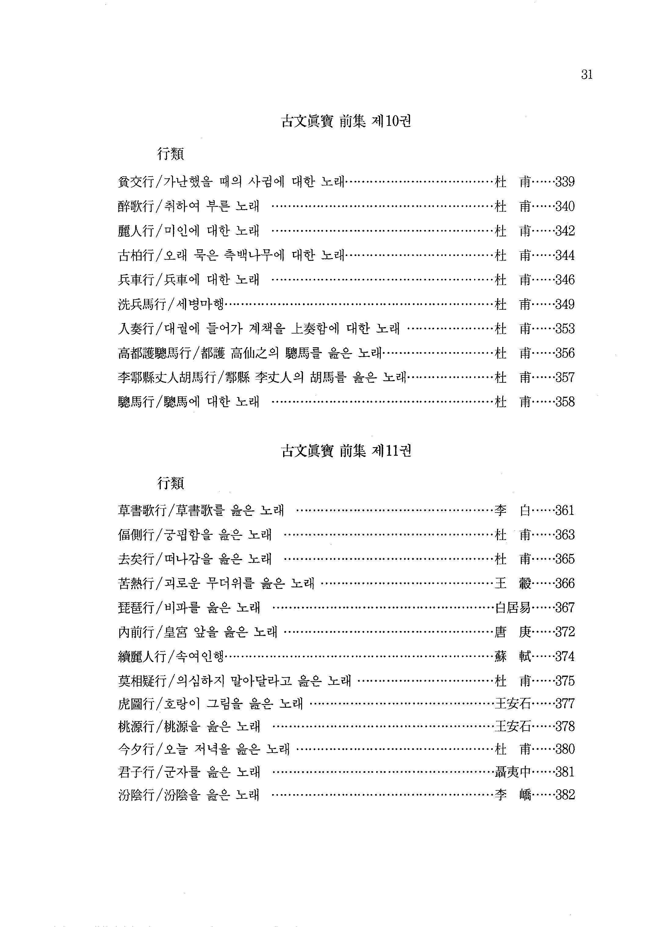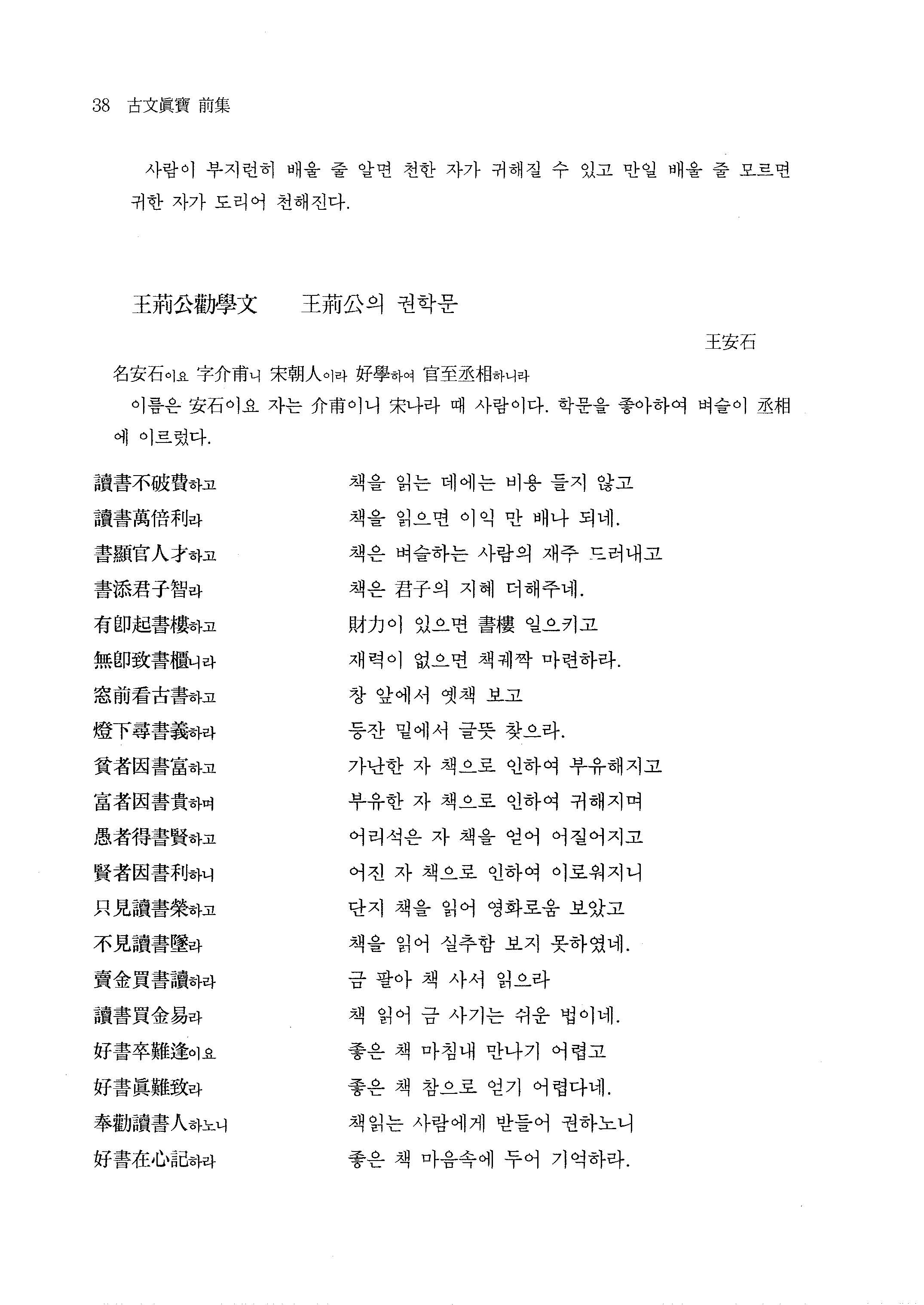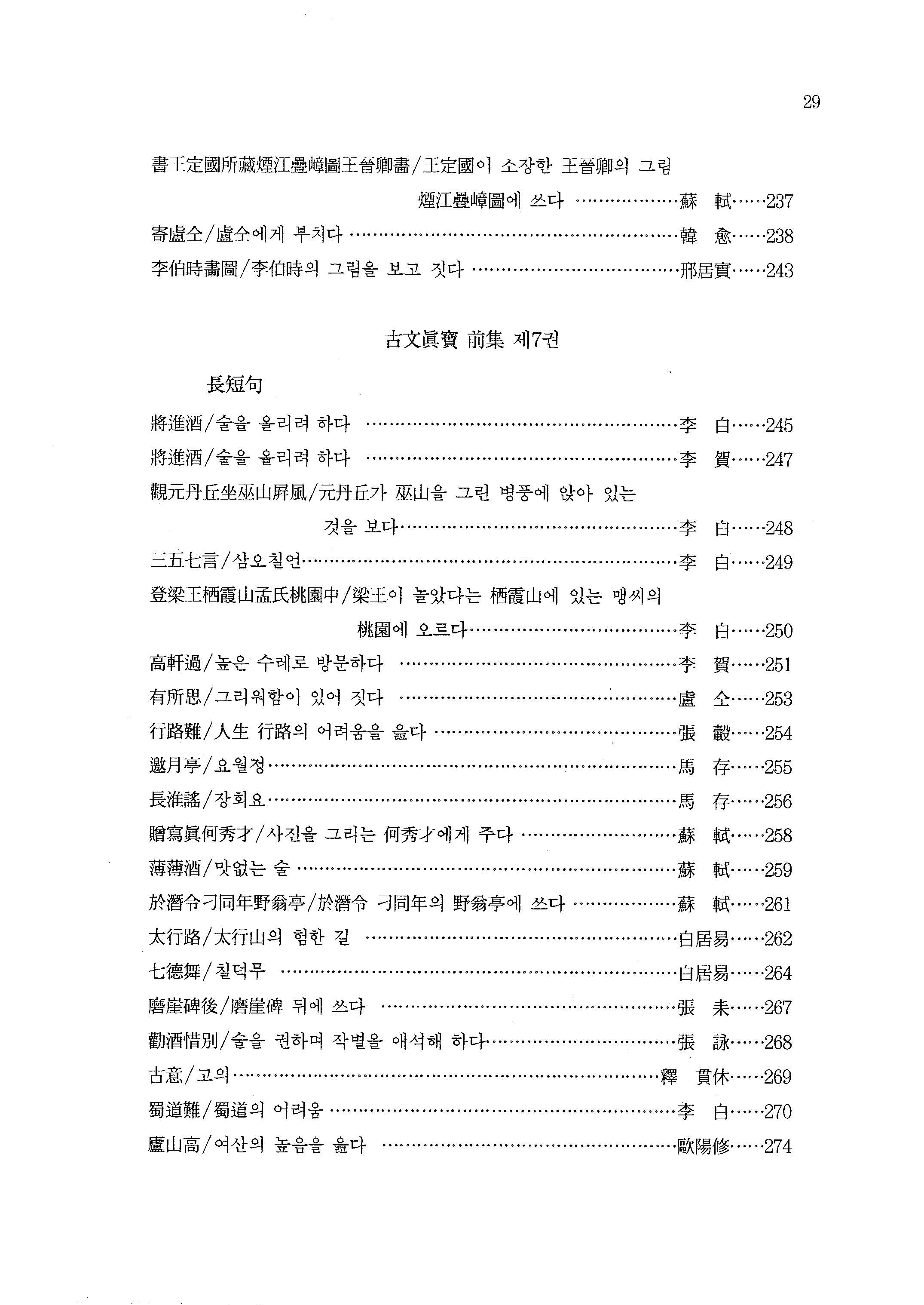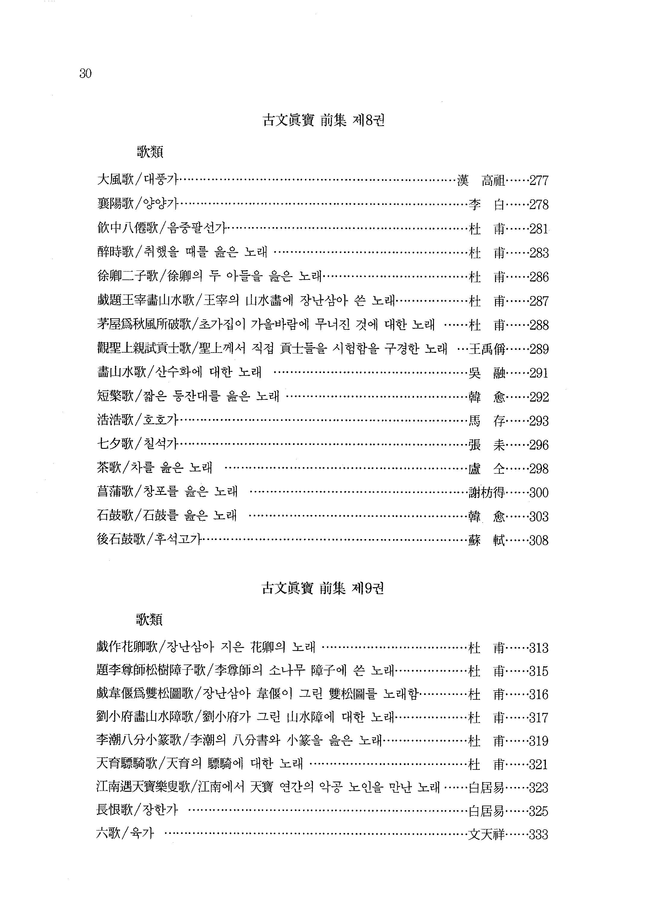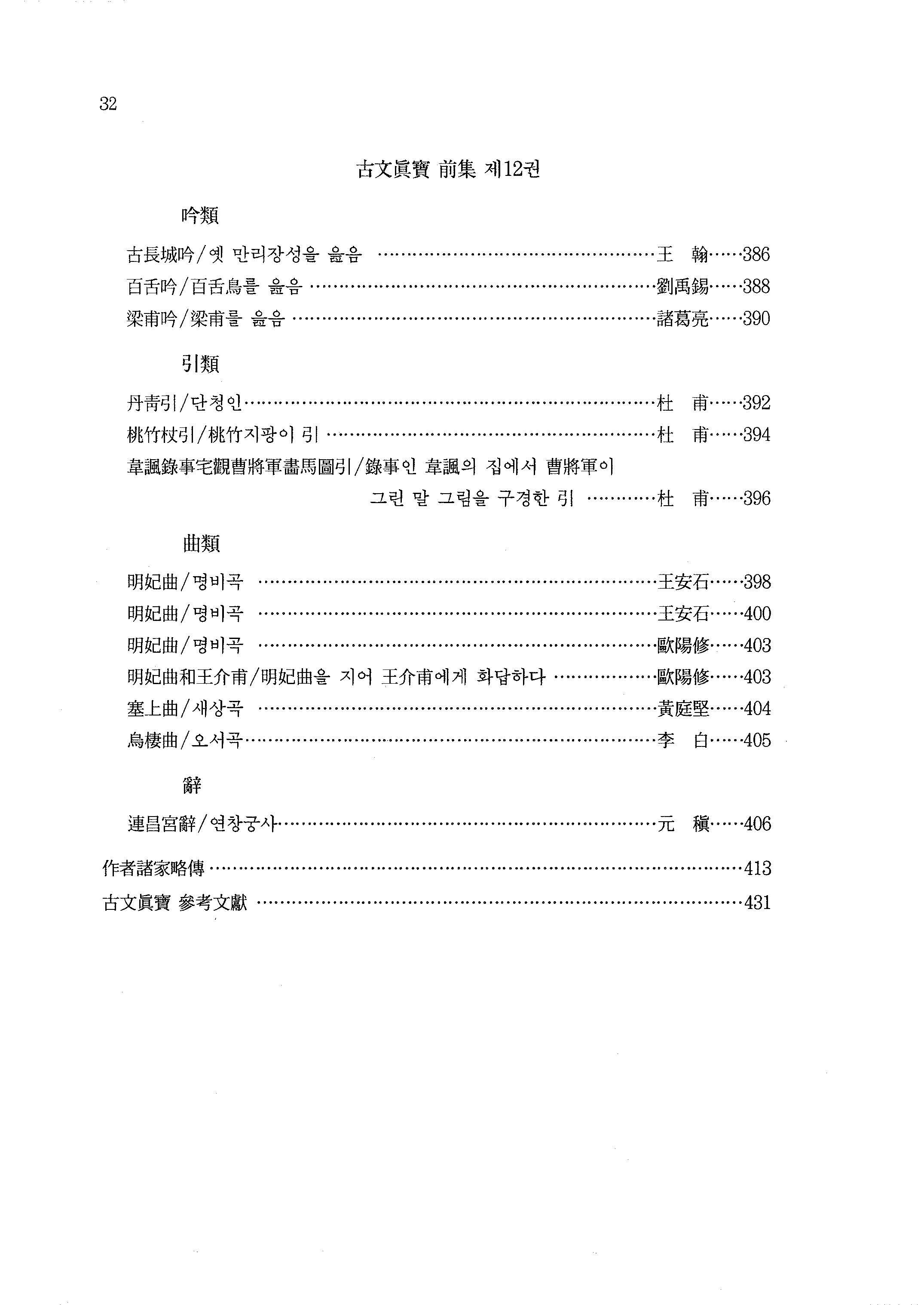 이미 四書三經을 현토 완역했던 成百曉교수가 수차에 걸쳐 강독한 연구 성과를 엮은 것으로, 우리 先祖들은 經學에 치중한 나머지 經傳을 풀이한 내용은 많이 있으나 古文眞寶와 같은 文章 위주의 選集類에 손을 댄 것은 참으로 드물다. 그런 만큼 우리 祖上들이 남긴 기록을 뽑아 本書에 收錄한 것은 더욱 意義있는 작업이라고 자부한다. 본서의 出刊으로 韓中詩 연구에 진일보하기를 기대하는 바이다.
