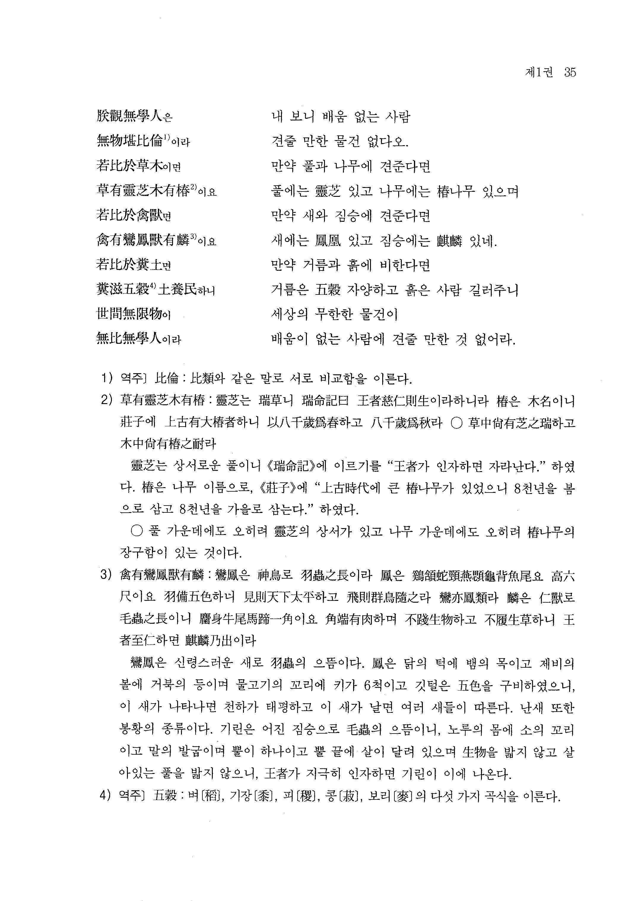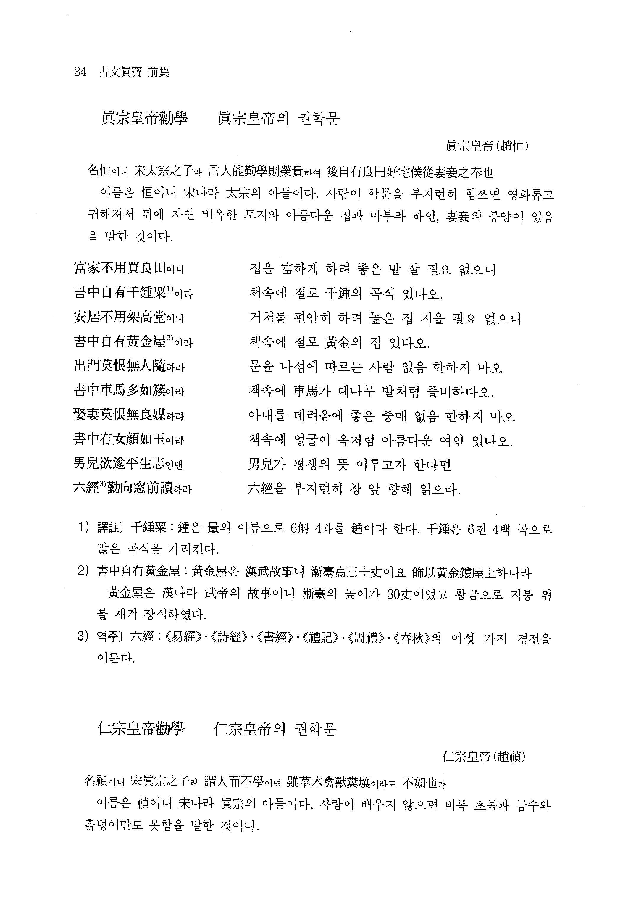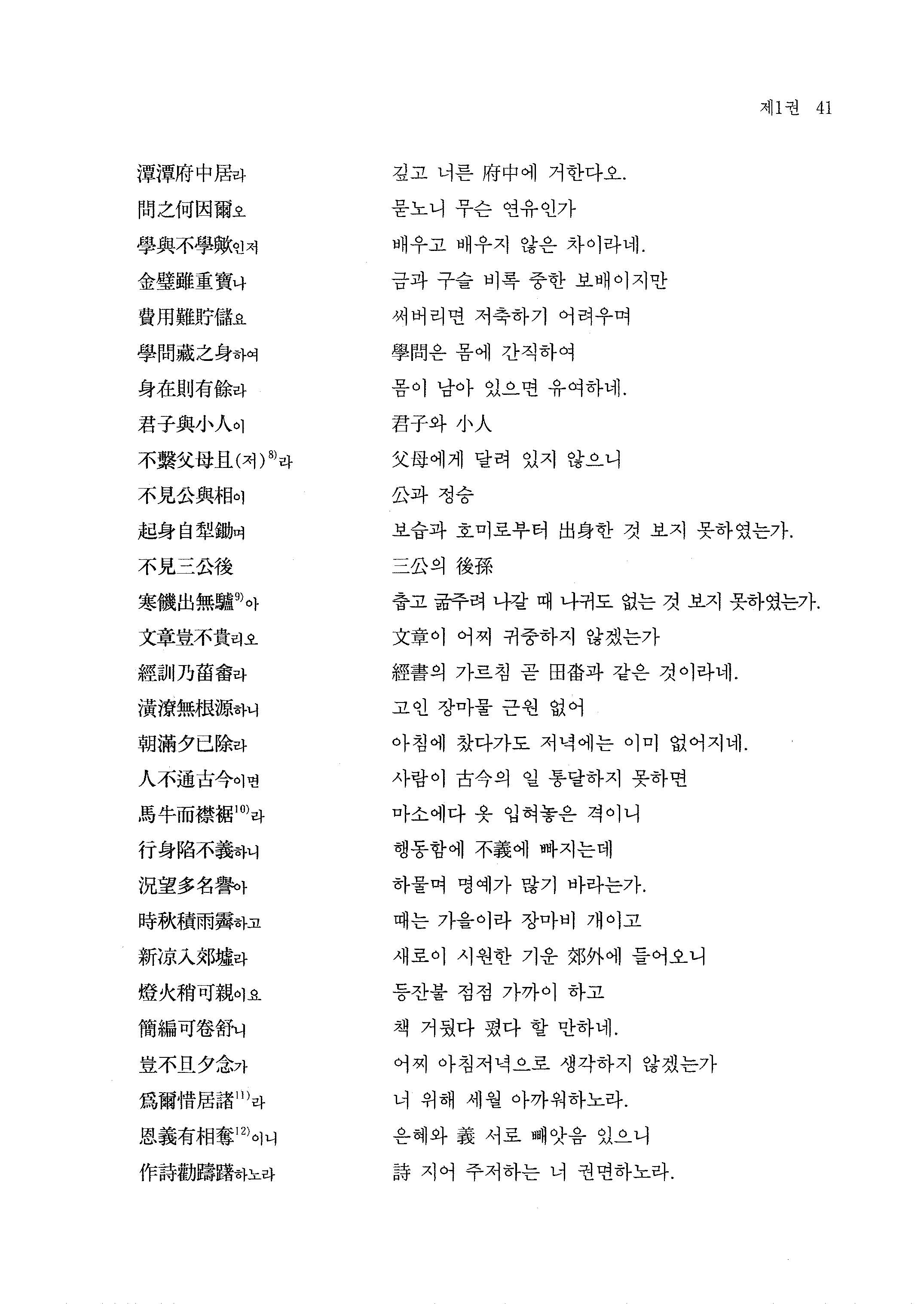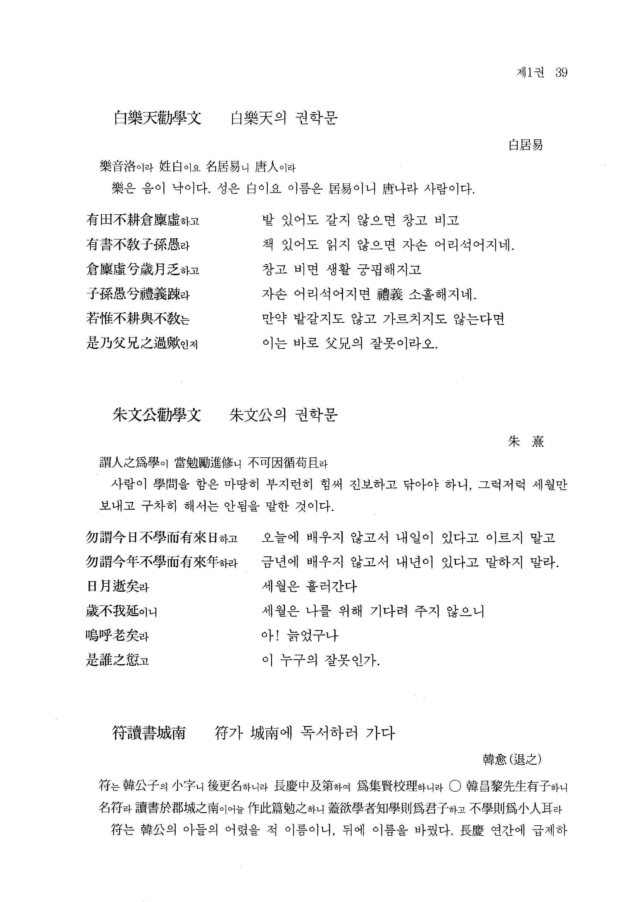 이미 四書三經을 현토 완역했던 成百曉교수가 수차에 걸쳐 강독한 연구 성과를 엮은 것으로, 우리 先祖들은 經學에 치중한 나머지 經傳을 풀이한 내용은 많이 있으나 古文眞寶와 같은 文章 위주의 選集類에 손을 댄 것은 참으로 드물다. 그런 만큼 우리 祖上들이 남긴 기록을 뽑아 本書에 收錄한 것은 더욱 意義있는 작업이라고 자부한다. 본서의 出刊으로 韓中詩 연구에 진일보하기를 기대하는 바이다.