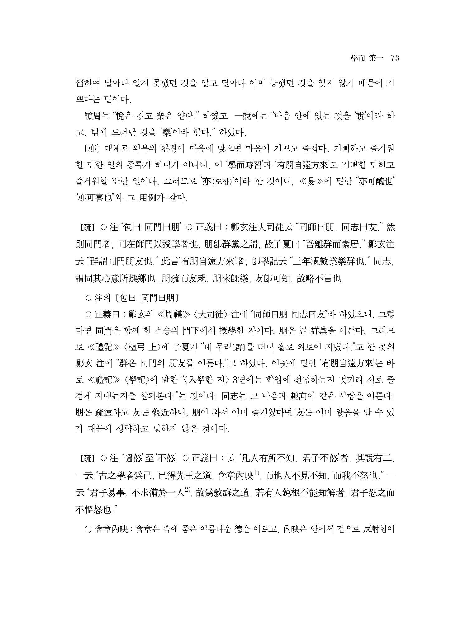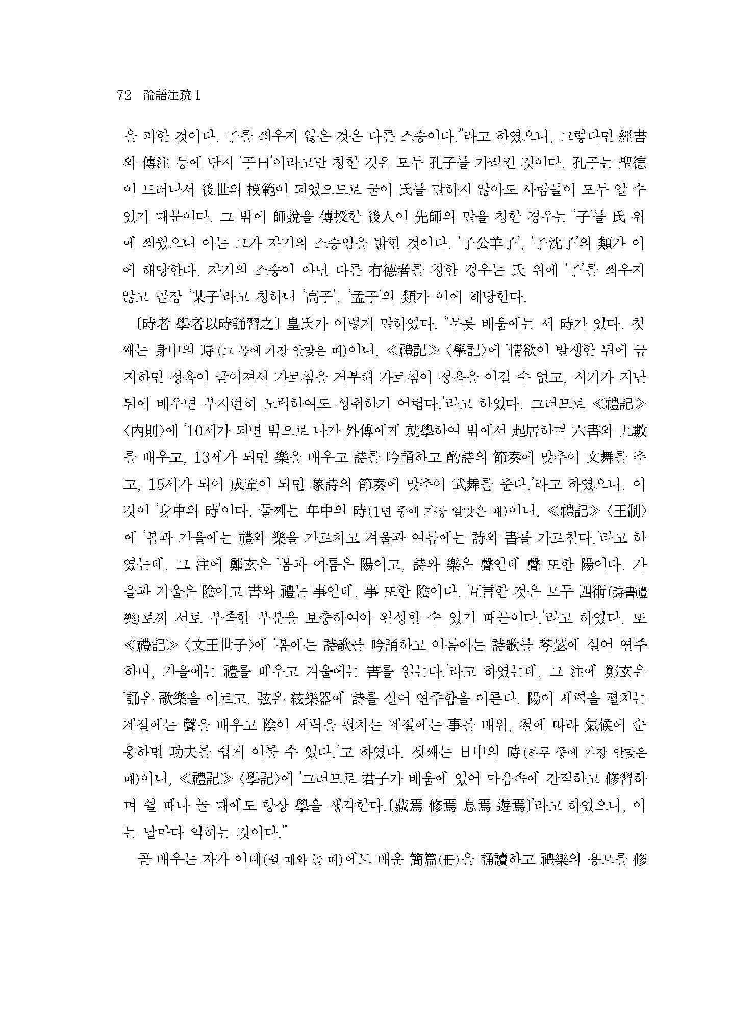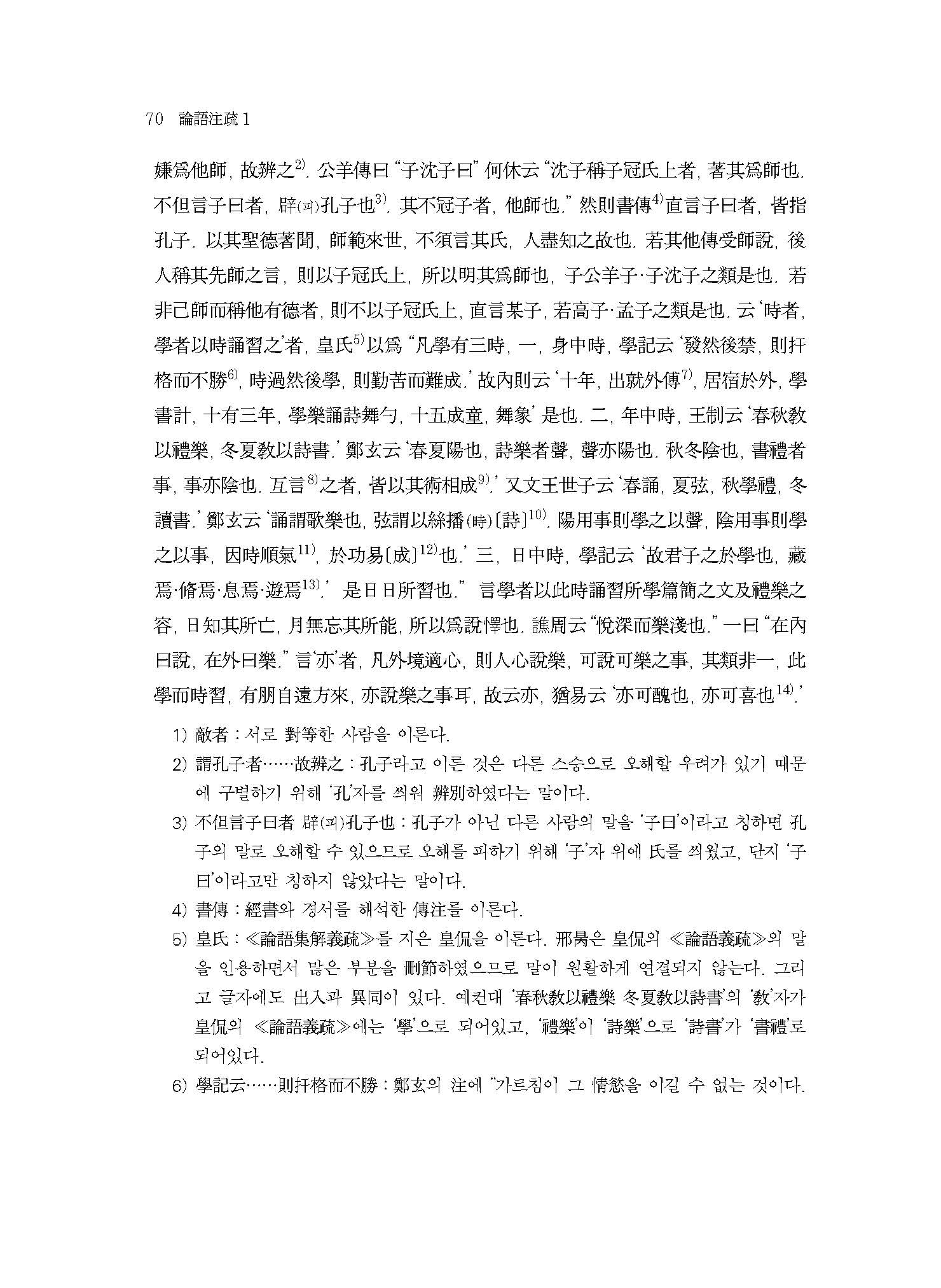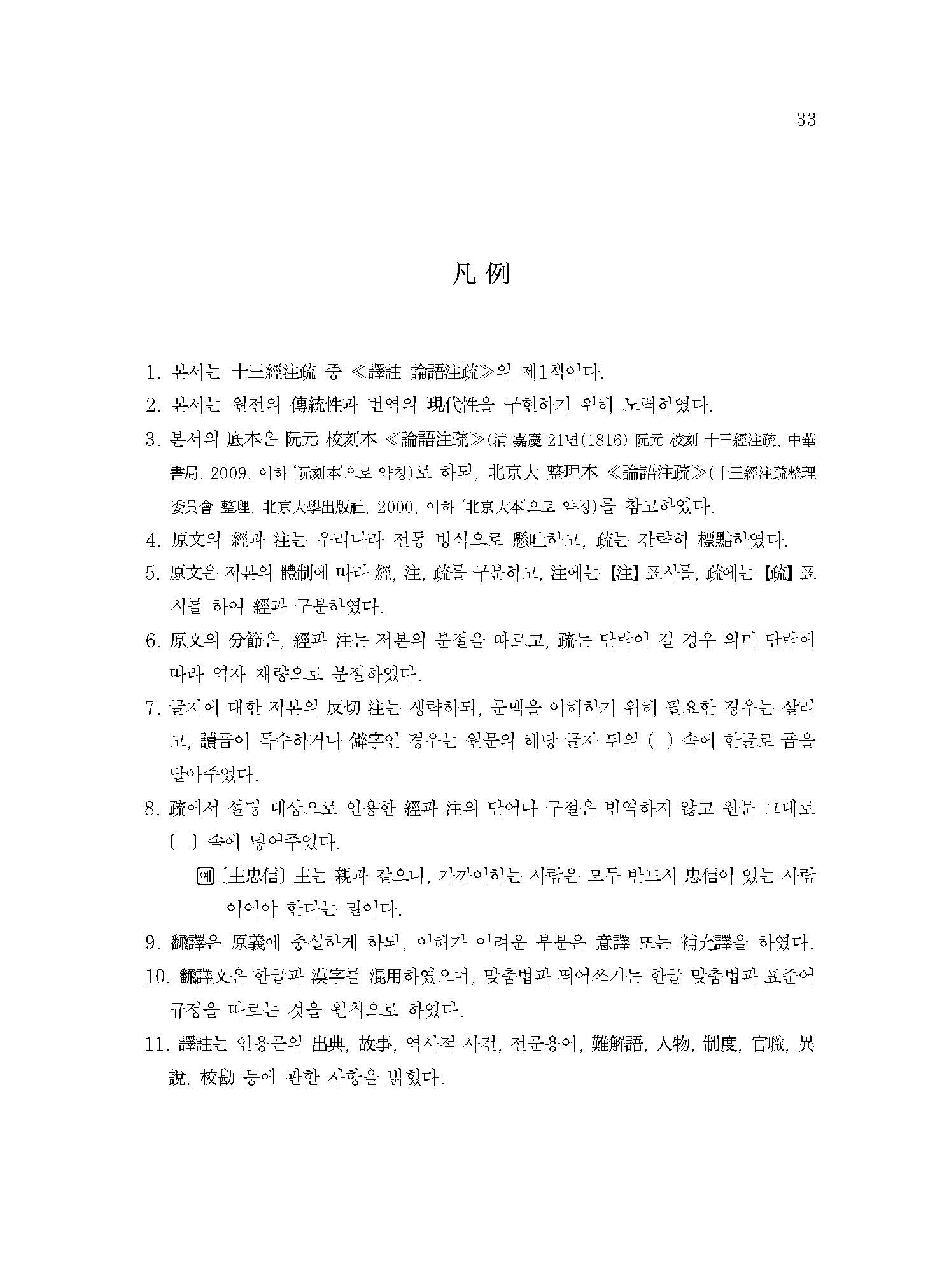 ≪역주譯註 논어주소論語注疏1≫은 지난 40여 년 동안 전통 한학을 계승·발전시키고 고전의 번역과 교육 및 현대화에 이바지한 원로 한학자(정태현鄭太鉉)와 신진 연구자(이성민李聖敏)가 협동으로 연구번역하여, 신구新舊 학자의 조화 속에서 탄생한 역작力作이다. 또한 본 역서譯書는 원문이나 주석 모두 한 자 한 자 정확한 축자역逐字譯으로 원전을 충실하게 독해하기 위해 반드시 지켜야 할 학문적 엄밀성을 철저하게 추구하고 있다. 게다가 원문原文의 경문經文과 주注에는 우리나라 전통적 방식의 현토懸吐를 하였고, 소疏에는 간략한 표점標點을 하였으며, 상세한 역주譯註를 달아 독자의 이해를 돕고 있다.