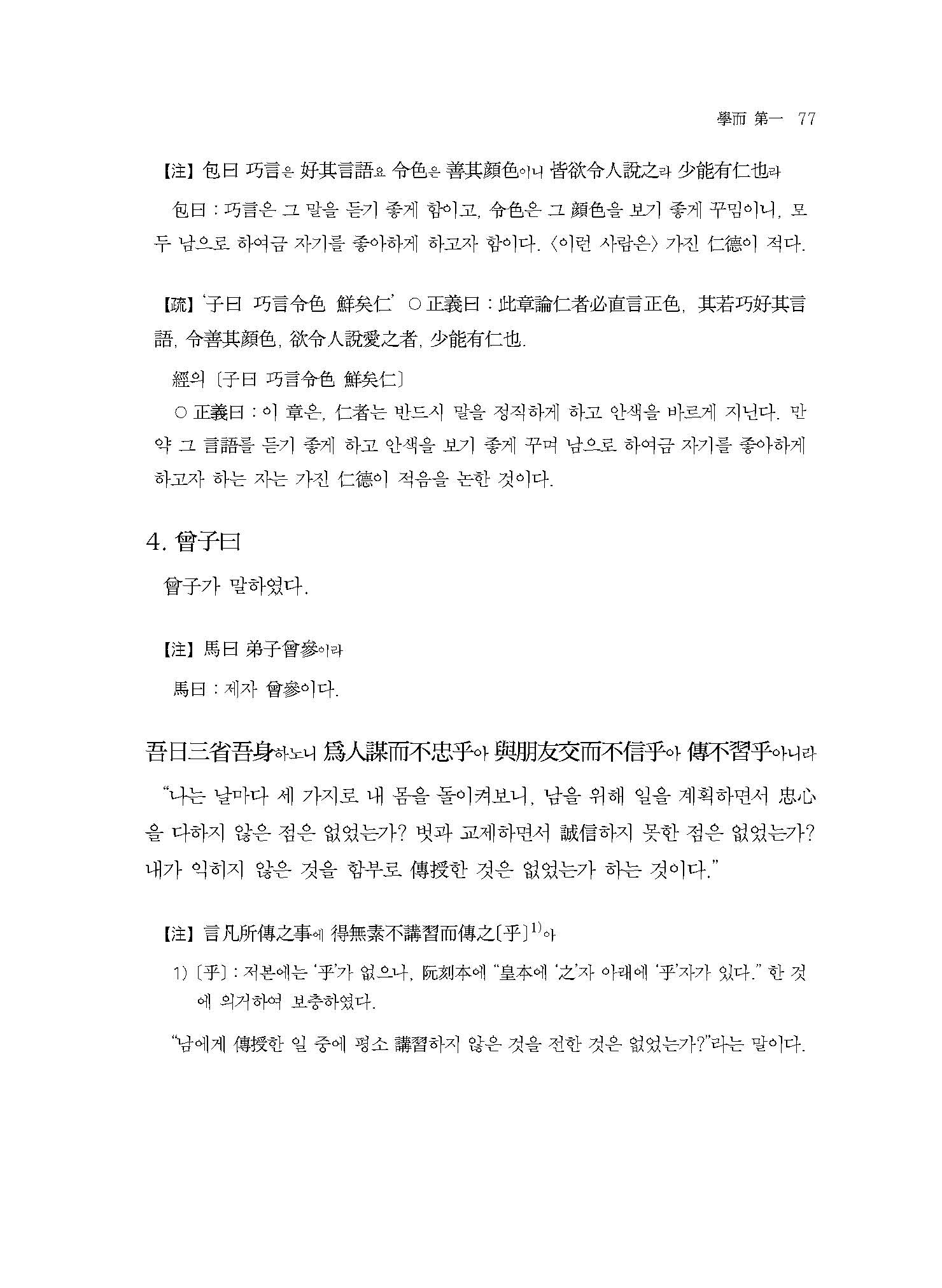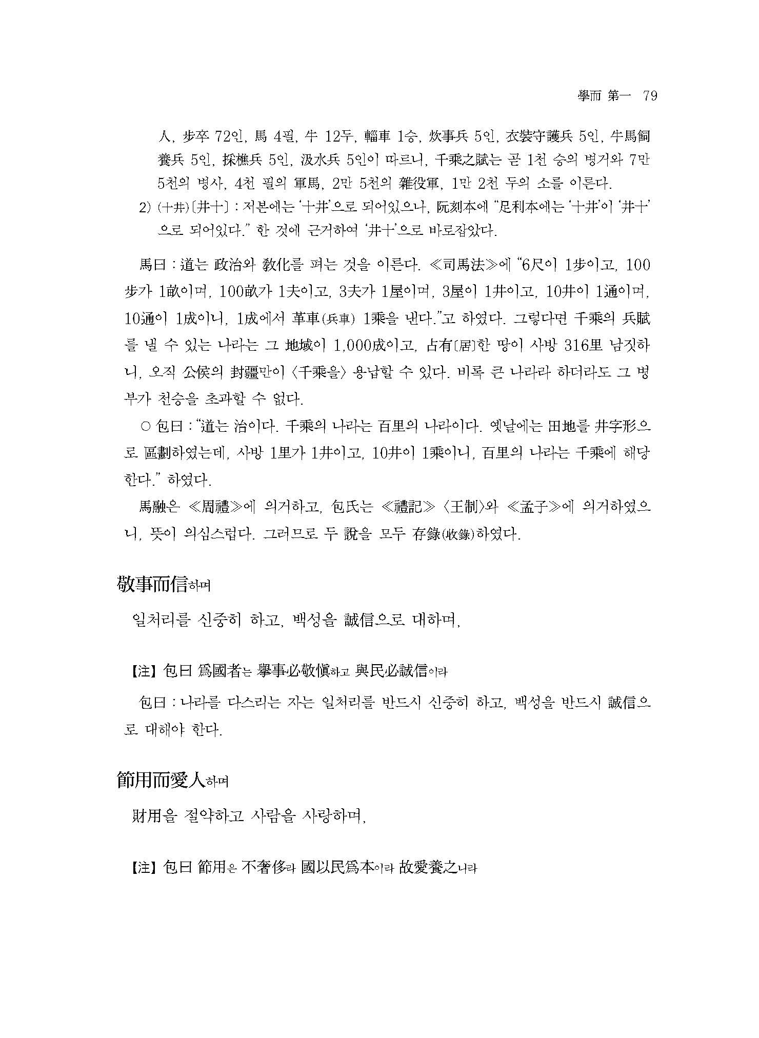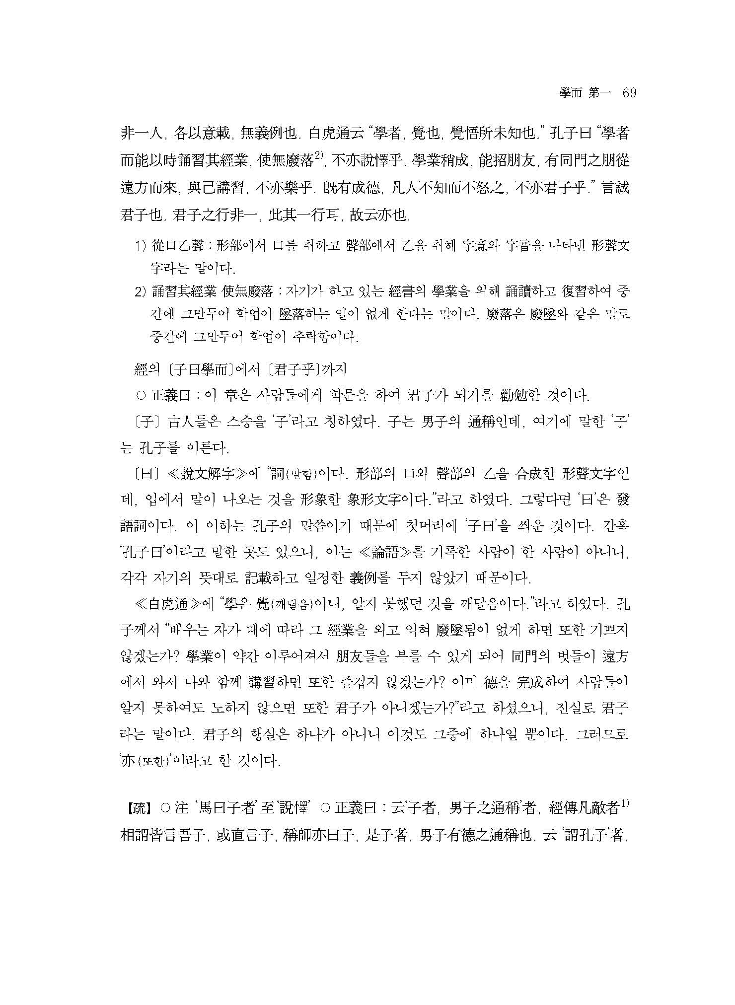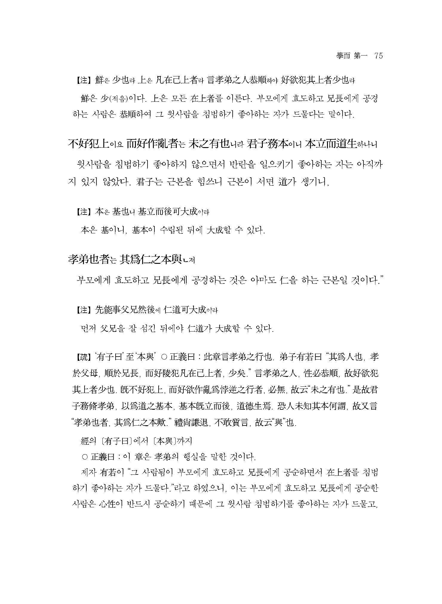 ≪역주譯註 논어주소論語注疏1≫은 지난 40여 년 동안 전통 한학을 계승·발전시키고 고전의 번역과 교육 및 현대화에 이바지한 원로 한학자(정태현鄭太鉉)와 신진 연구자(이성민李聖敏)가 협동으로 연구번역하여, 신구新舊 학자의 조화 속에서 탄생한 역작力作이다. 또한 본 역서譯書는 원문이나 주석 모두 한 자 한 자 정확한 축자역逐字譯으로 원전을 충실하게 독해하기 위해 반드시 지켜야 할 학문적 엄밀성을 철저하게 추구하고 있다. 게다가 원문原文의 경문經文과 주注에는 우리나라 전통적 방식의 현토懸吐를 하였고, 소疏에는 간략한 표점標點을 하였으며, 상세한 역주譯註를 달아 독자의 이해를 돕고 있다.