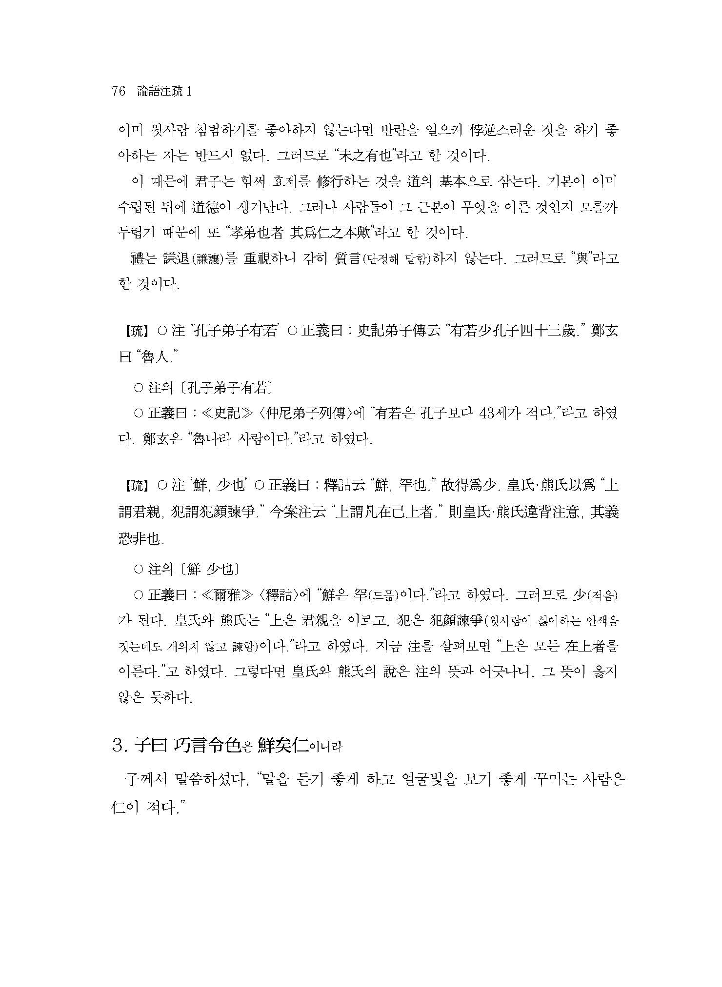 ≪역주 논어주소1≫의 출간을 계기로 ≪논어≫에 대한 새로운 연구들이 이루어질 것이다. 뿐만 아니라 ≪논어≫를 읽고자 하는 일반 독자들에게도 본 역서는 유용한 책이다. 다소 어려운 주注와 소疏는 제쳐두고 ≪논어≫ 경문經文의 번역만 일독하더라도, 기존 번역과의 차별성이 확연히 드러날 것이고, 그 과정에서 ≪논어≫를 이해하는 깊이와 폭도 그만큼 넓어질 것이다. ≪역주 논어주소1≫을 일독一讀하다 보면, 그동안 우리에게 익숙했던 주희의 ≪논어집주≫와는 다른 새로운 ≪논어≫를 접할 수 있을 것이다.