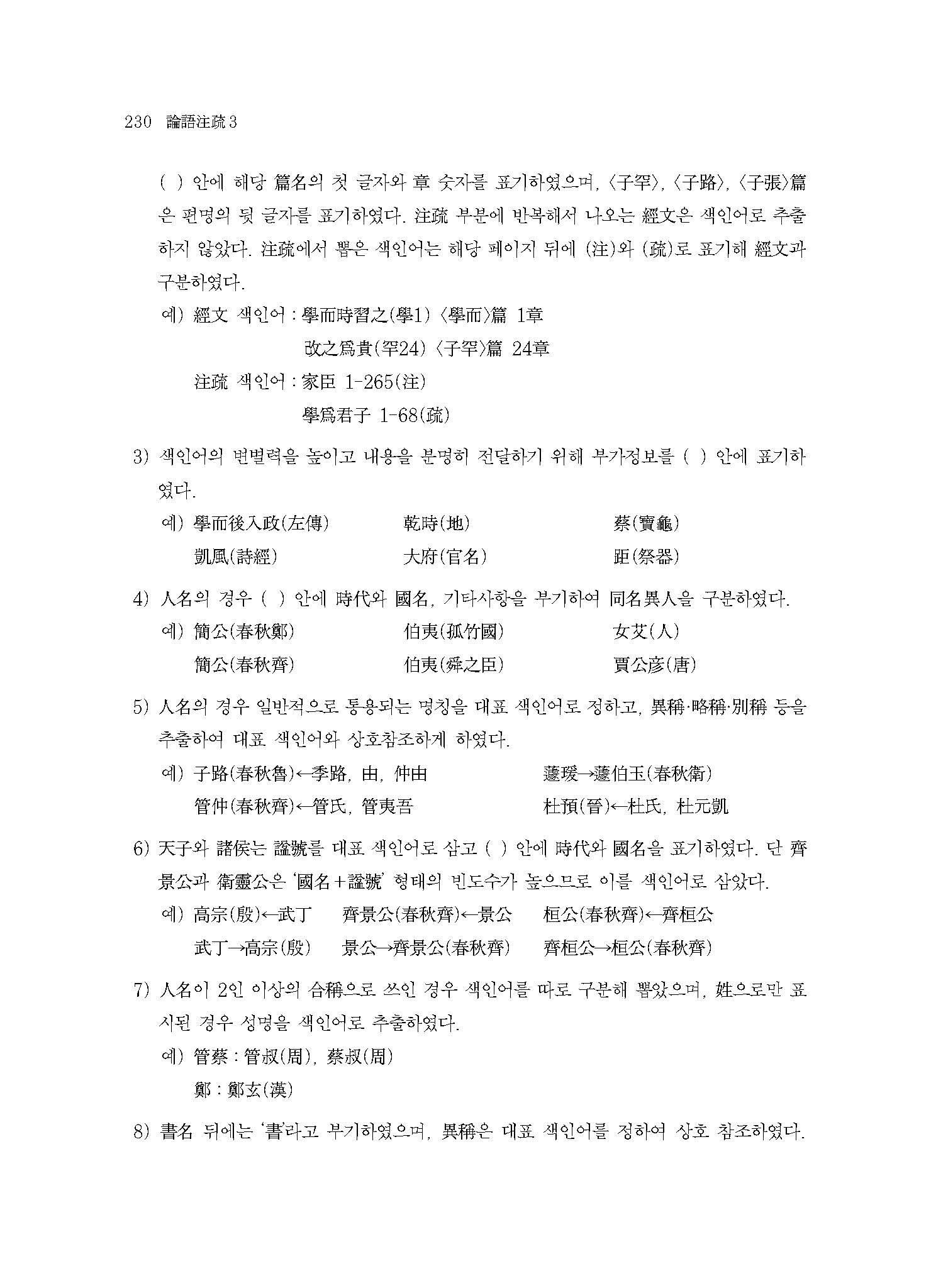 이번에 출간한 ≪역주譯註 논어주소論語注疏3≫은 십삼경주소 가운데 처음으로 ≪논어≫를 완결지은 책이다. 원전의 전통성傳統性 보존과 번역의 현대성現代性 추구를 기본 방침으로, 경문經文과 주注에는 전통 방식으로 현토懸吐하고 소疏에는 간략히 현대식으로 표점標點하여 독자들의 문장이해에 도움을 줄 뿐만 아니라 역대 한중일韓中日의 연구 성과를 반영하여 역주譯註함으로써 연구에 편의를 제공하였다. 또한 경經뿐 아니라 주注와 소疏까지도 색인索引을 첨부하여 독자들이 주注와 소疏의 내용도 쉽게 검색하여 찾아볼 수 있도록 하였다.