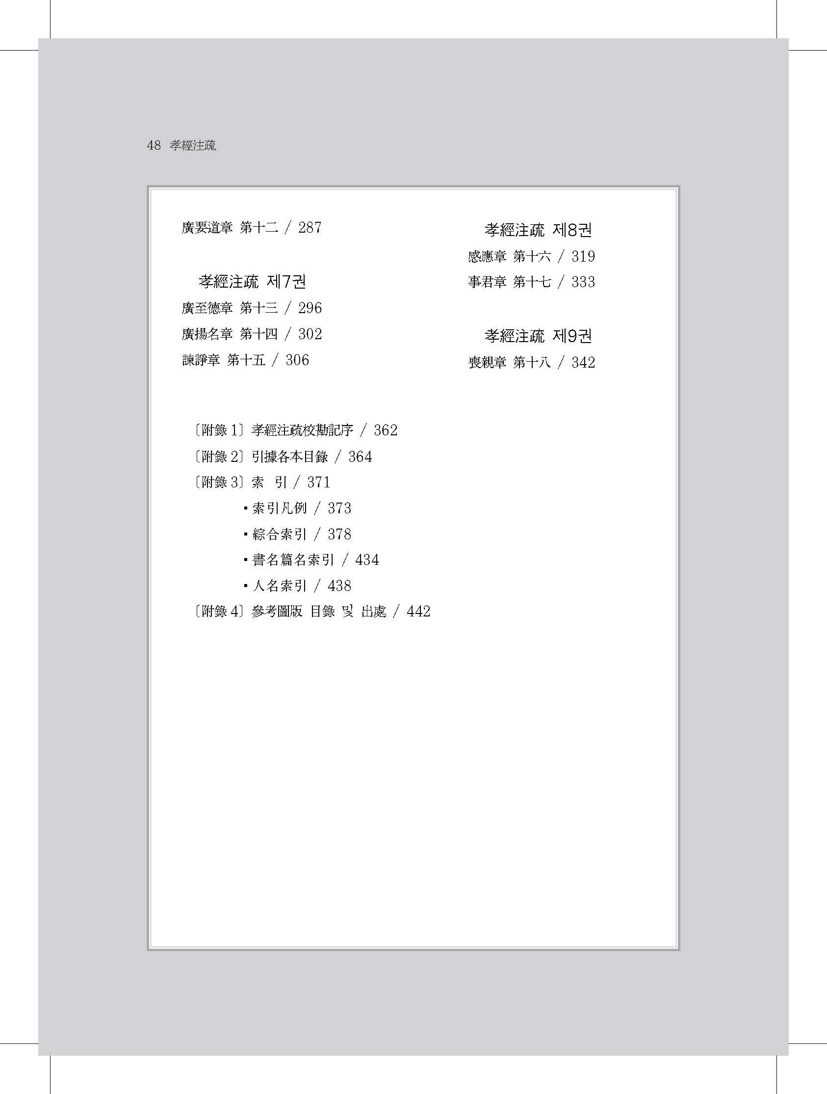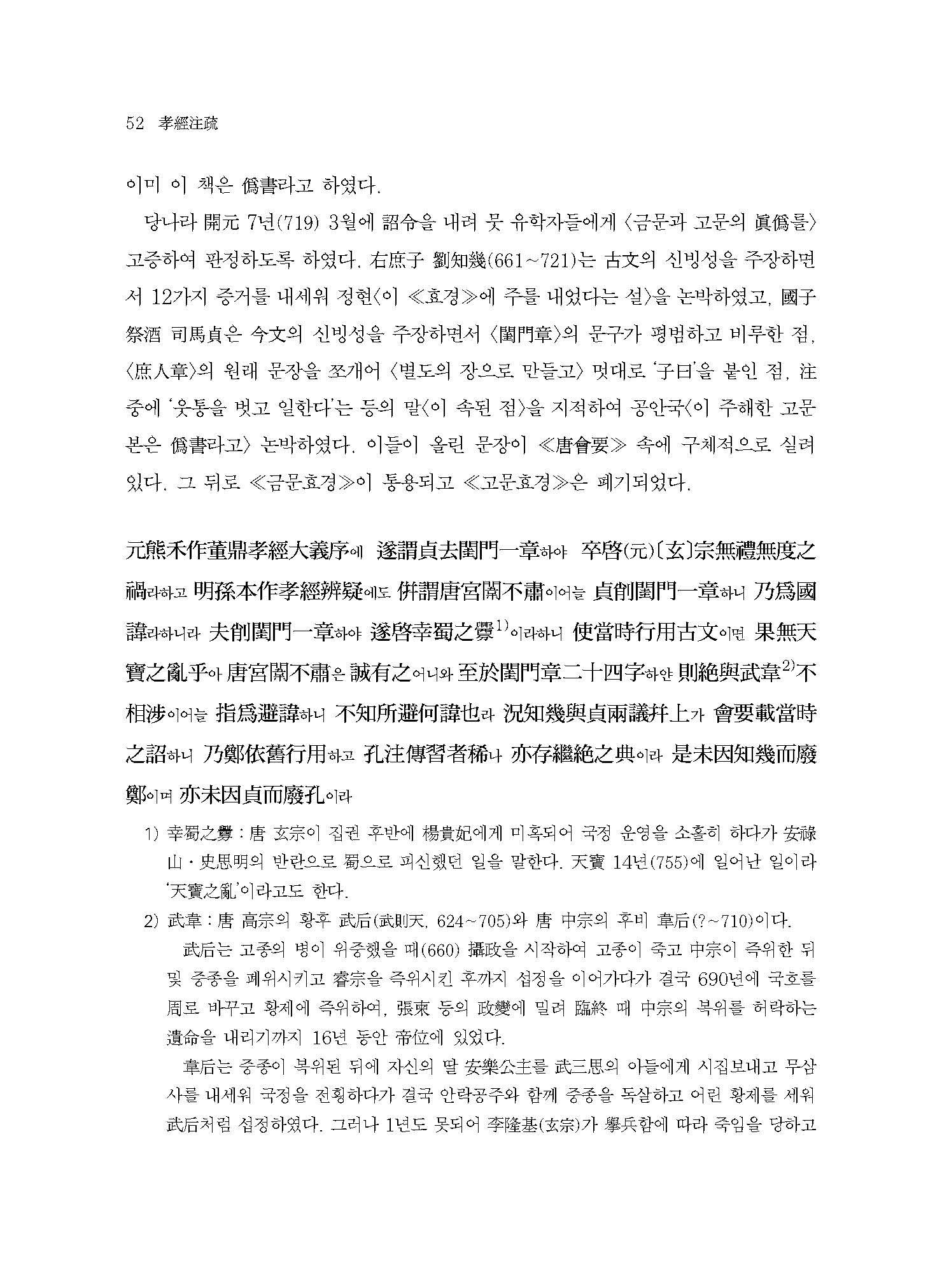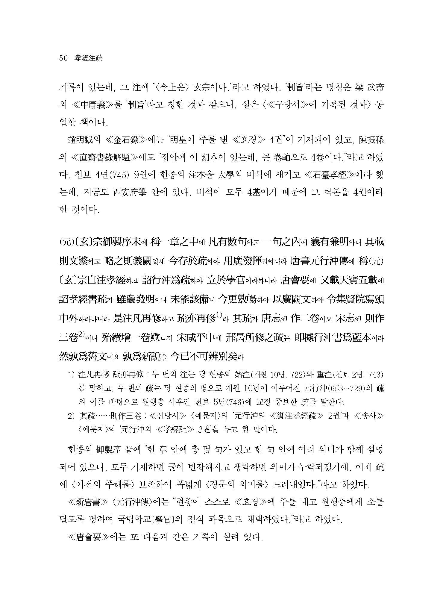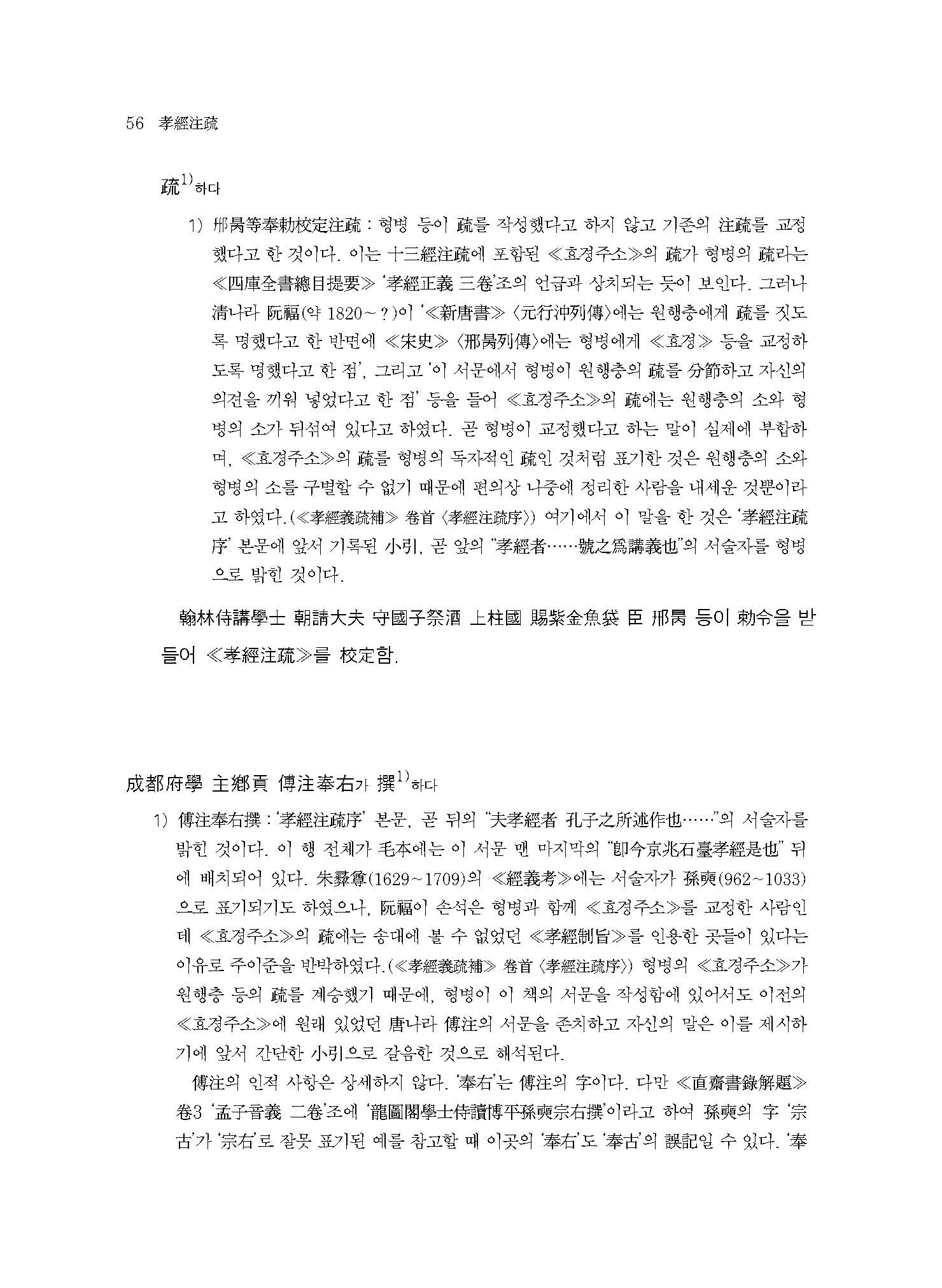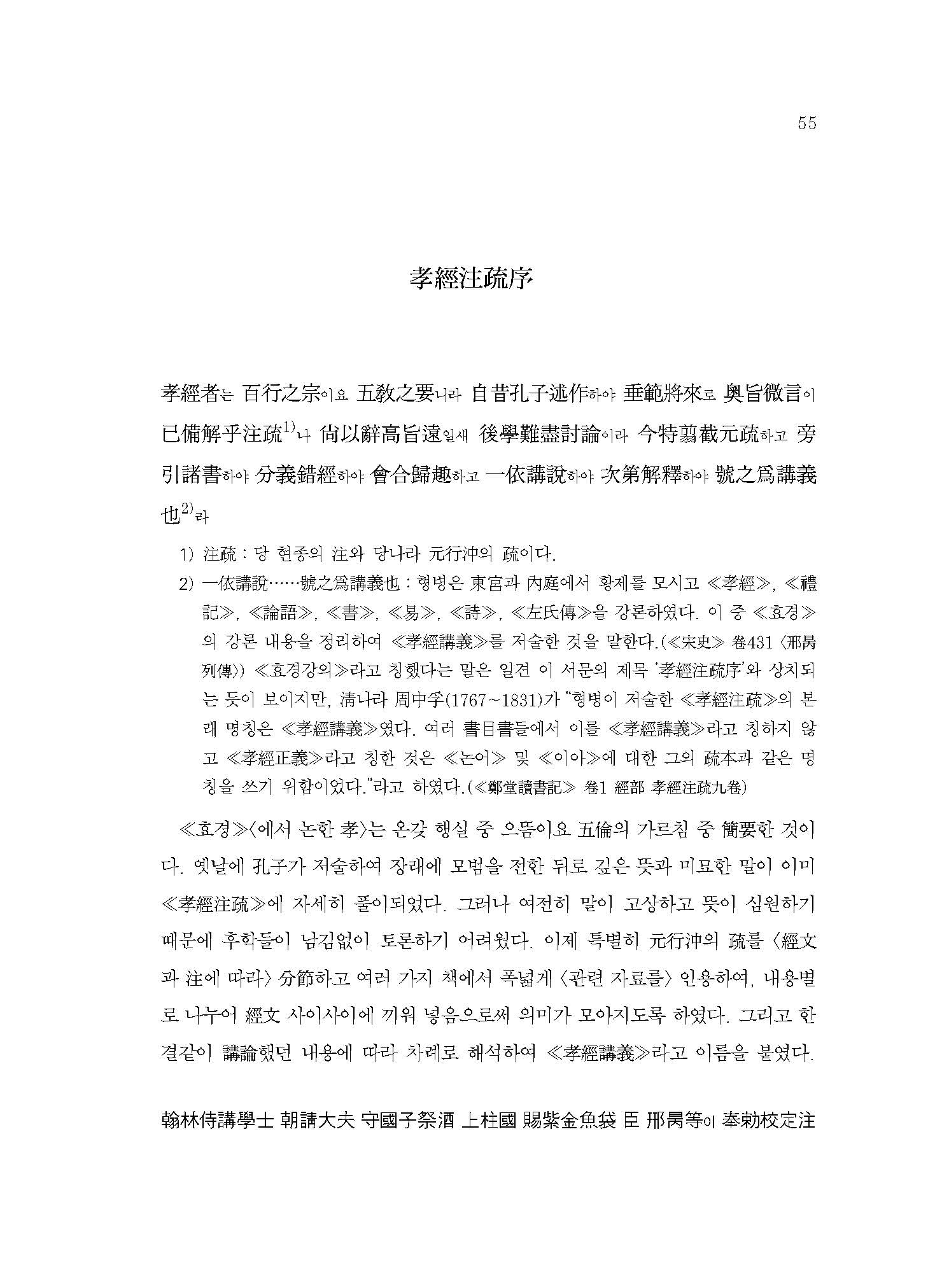 본 ≪효경주소≫는 한漢?당唐의 고주古注를 아우른 것으로 ≪효경≫ 이해의 넓은 시야를 확보한다는 데 의의가 있다. 완원阮元의 ≪효경정의≫ 해제와 형병邢昺?부주傅注의 <효경주소서孝經注疏序>, 당 현종의 <어제서병주御製序幷注>를 통해 ≪효경≫의 금고문논쟁과 ≪효경주소≫ 성립 과정에 대한 각 시대 석학들의 해설을 살펴볼 수 있다.