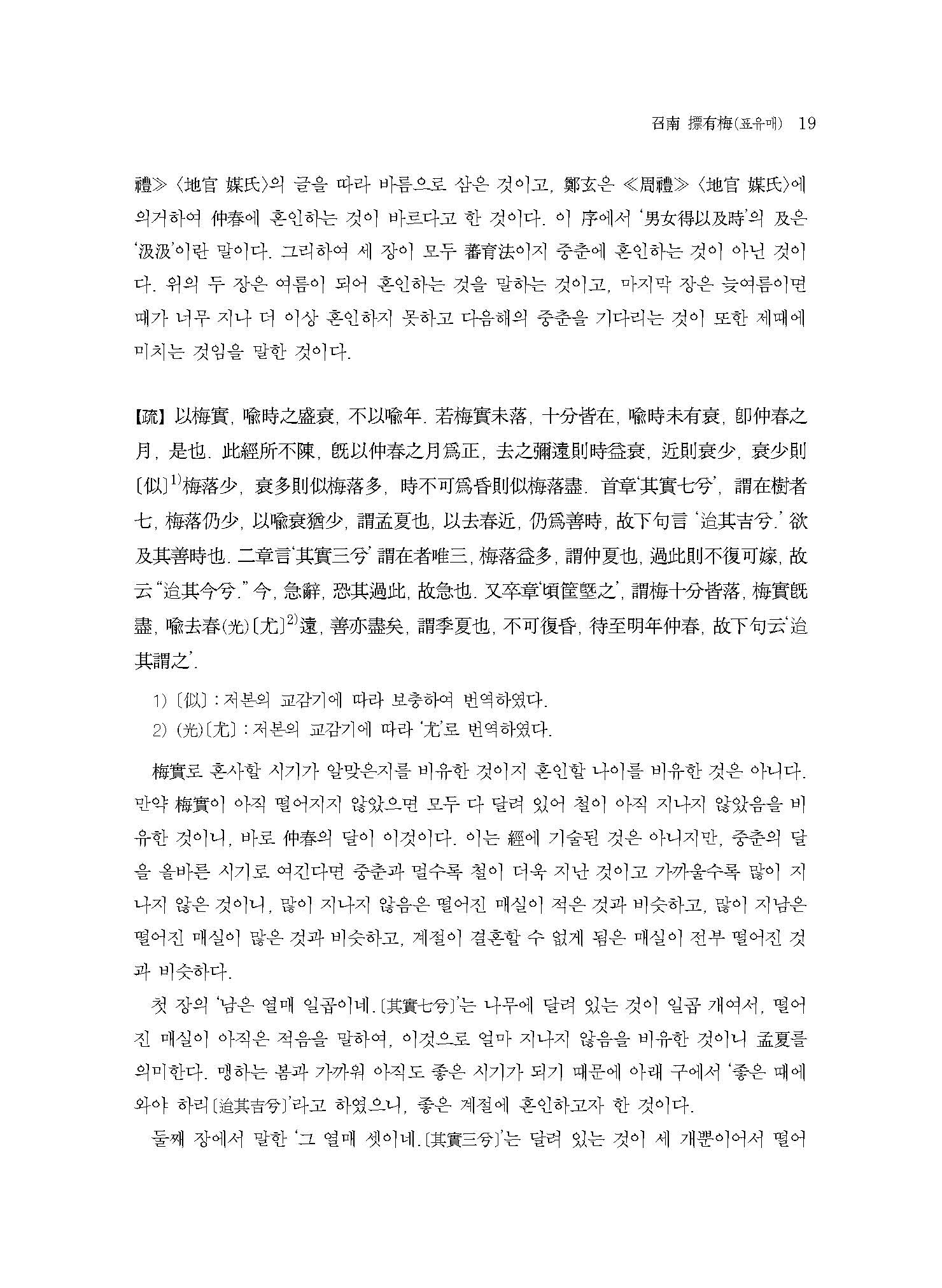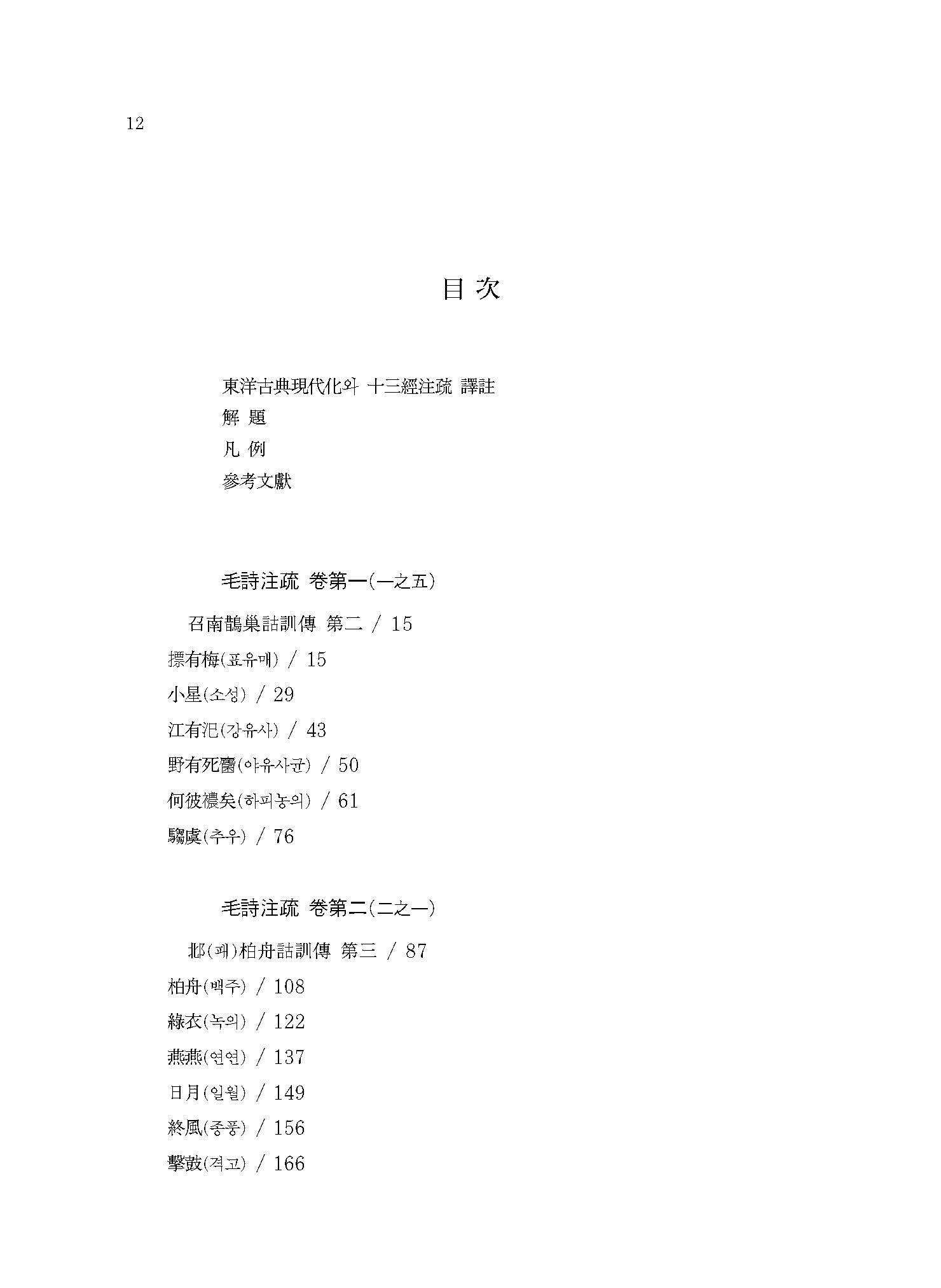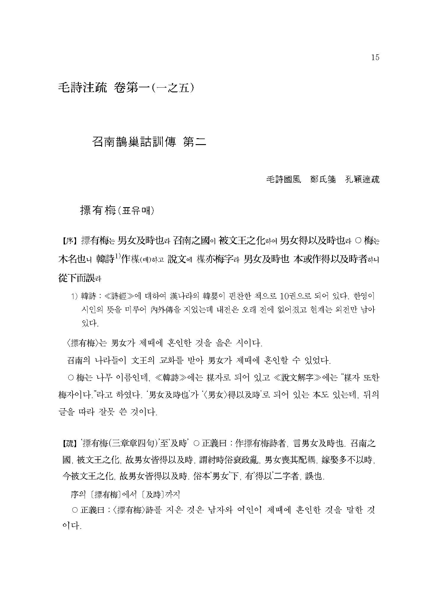 이 책은 ≪모시정의≫의 글자 하나하나를 모두 온전히 번역하는 것을 목표로 한 첫 번째 결과물이다. 한국고전번역원에서 오랜 기간 ≪시경≫을 강의한 박소동朴小東 선생의 강의 노하우와 고민이 온축되어 있다. 또한 고주古注와 신주新注를 비교하고 역대 대표 학자들의 ≪시경≫ 연구 성과를 역주譯註에 담았다. 원문原文의 경문經文과 전傳에는 우리나라 전통방식의 현토懸吐를 하고, 소疏에는 간략한 표점標點을 하여 독자의 학습에 도움을 주고자 하였다.