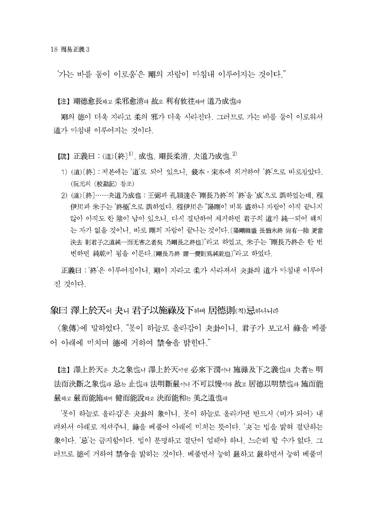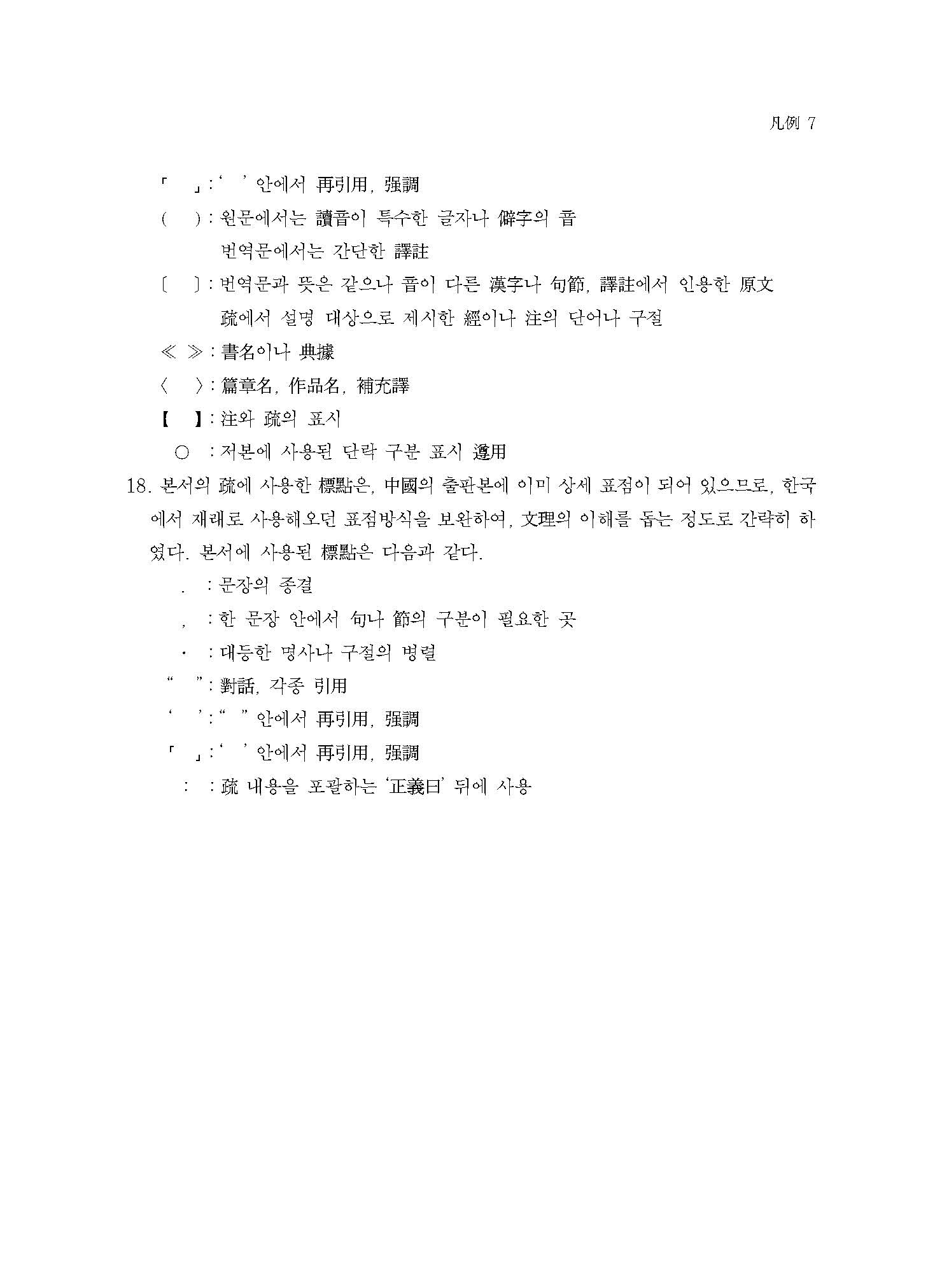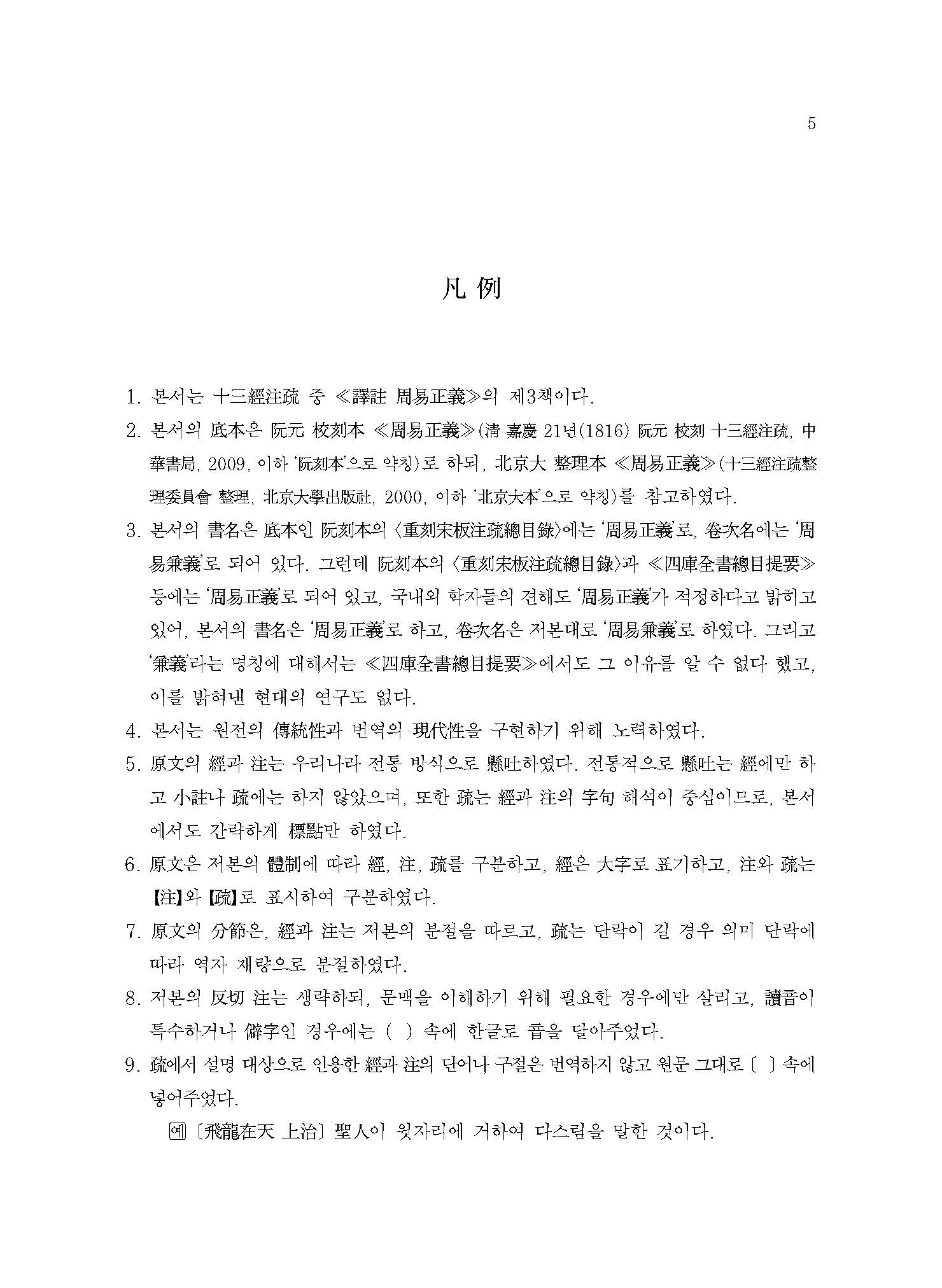본 역서는 원문의 경經과 주注에는 우리나라 전통적 방식의 현토懸吐를 하였고, 소疏에는 간략한 표점標點을 하였으며, 상세한 역주譯註를 달아 독자의 이해를 도왔다. 또한 40여 년 동안 전통 한학을 계승·발전시키고 고전의 번역과 교육 및 현대화에 이바지한 원로 한학자(성백효成百曉)와 신진 연구자(신상후申相厚)가 협동으로 연구번역하여, 신구新舊 학자의 조화 속에서 우리말로 재탄생하였다.