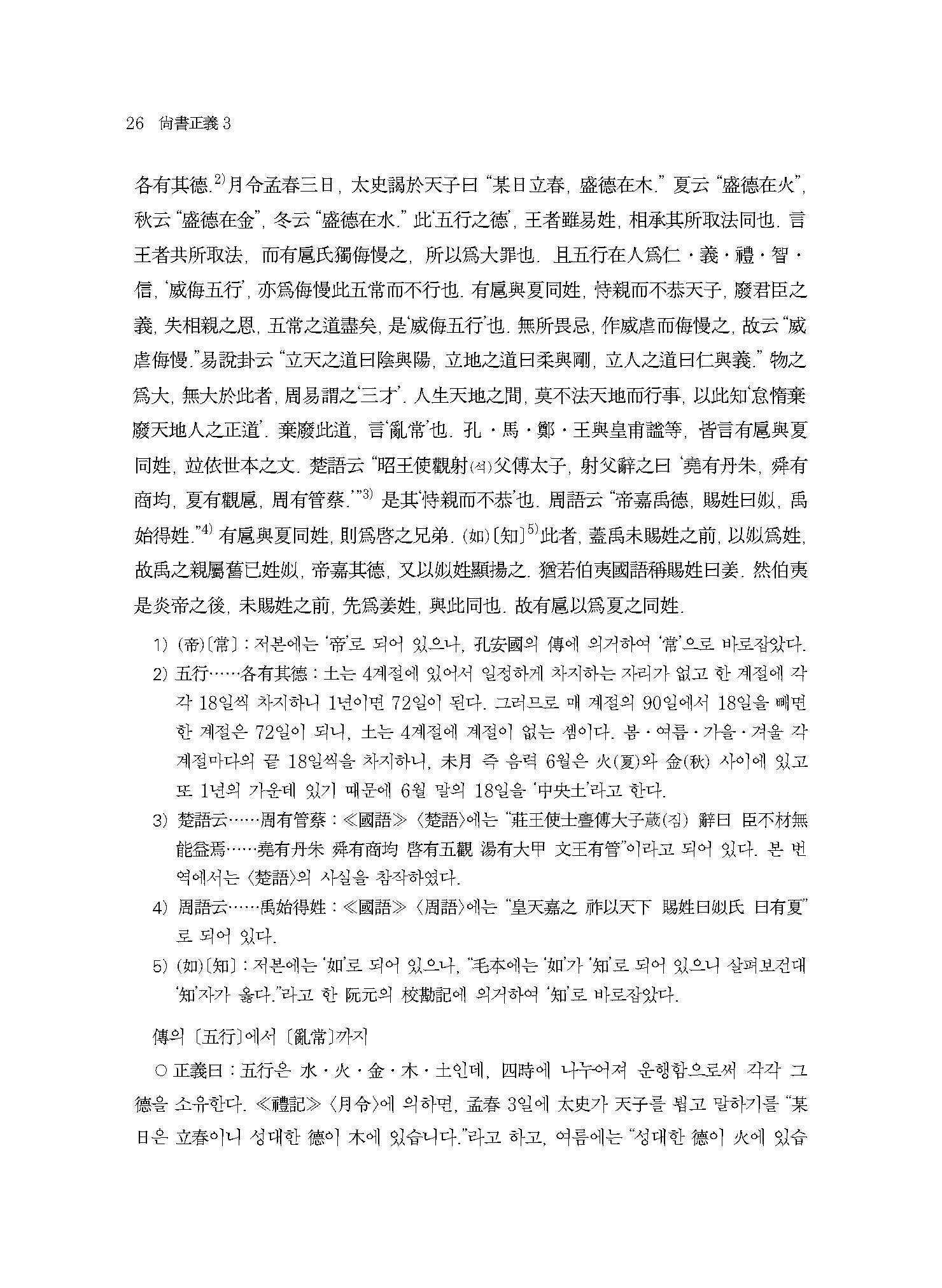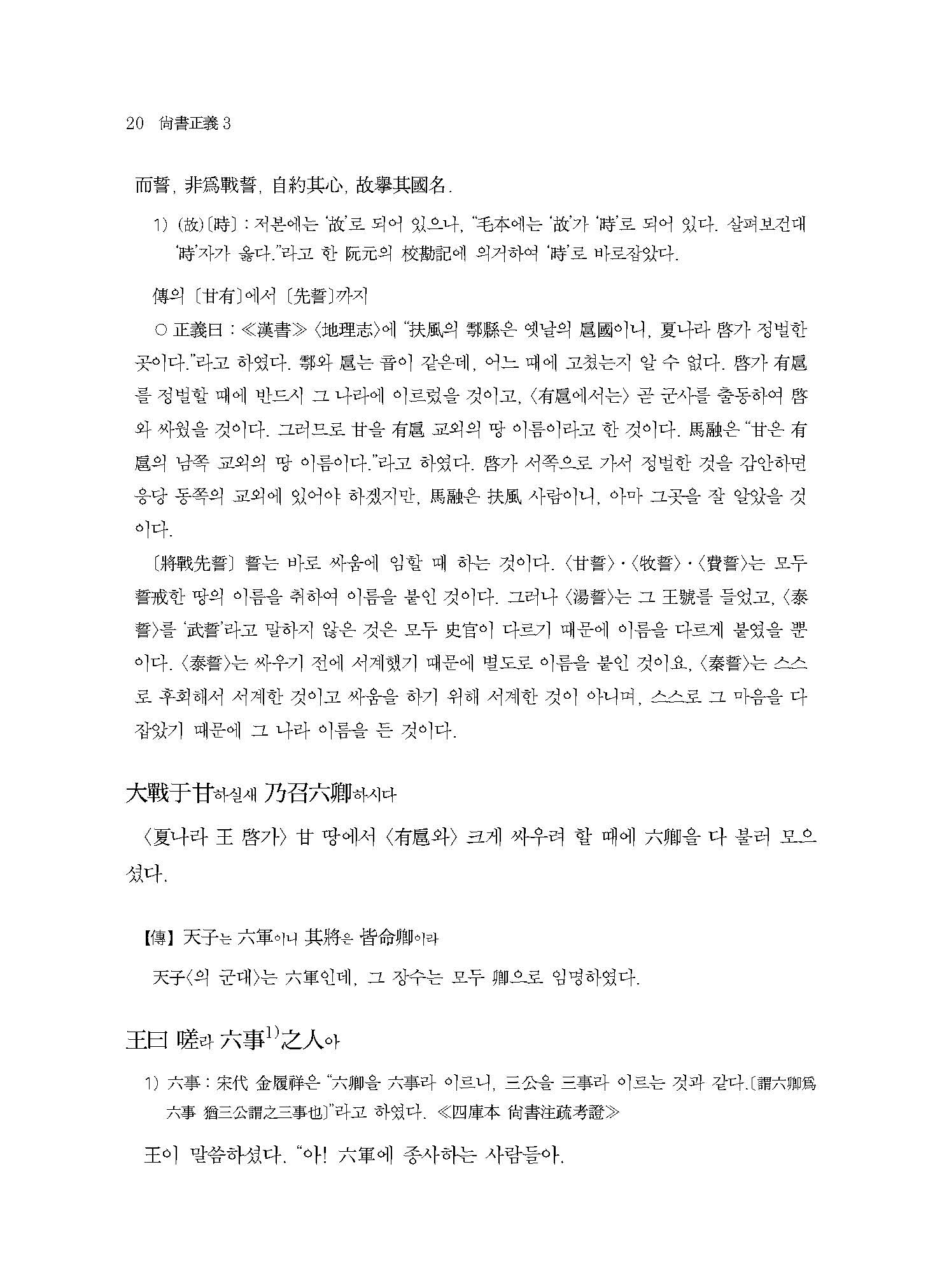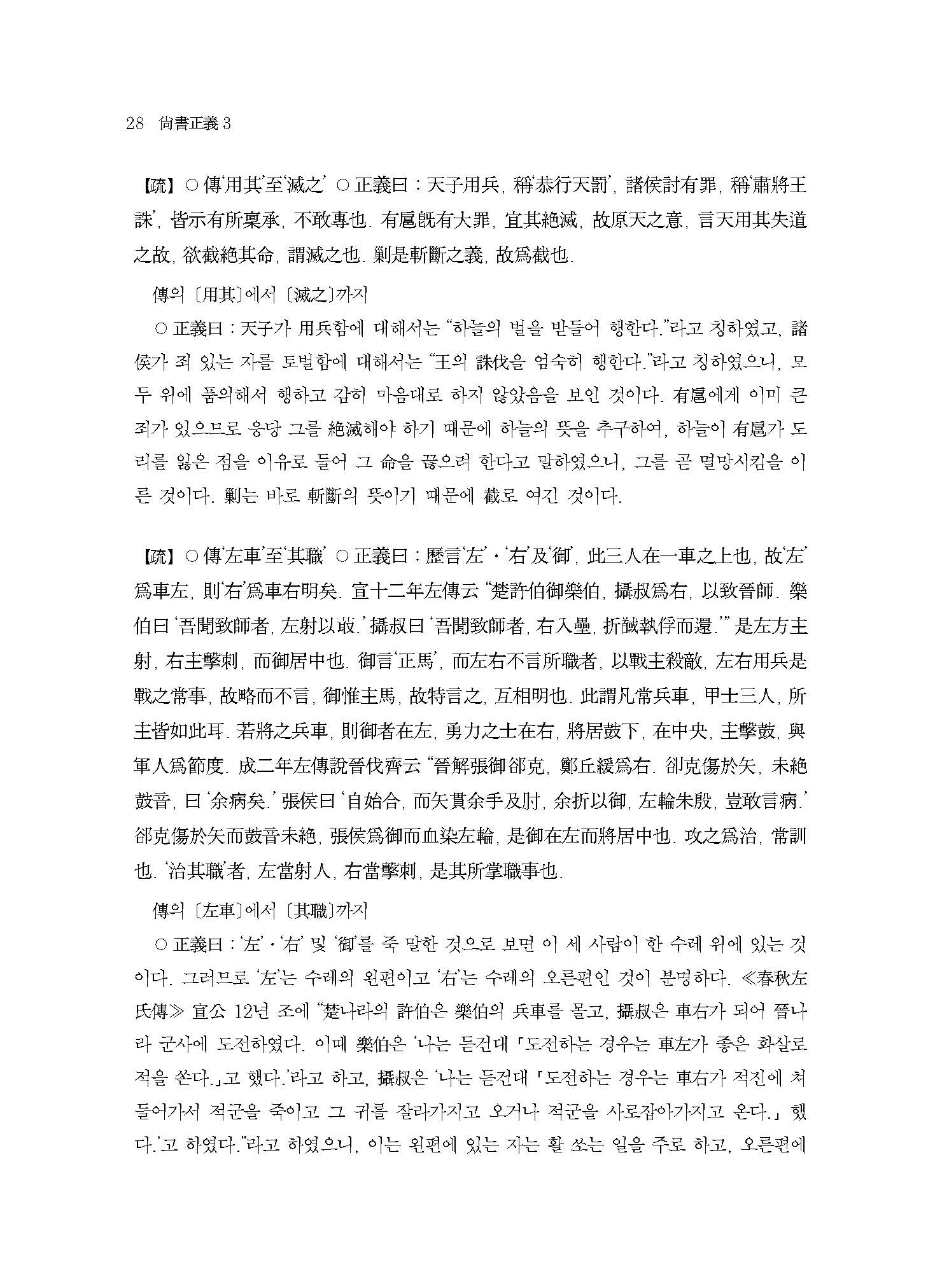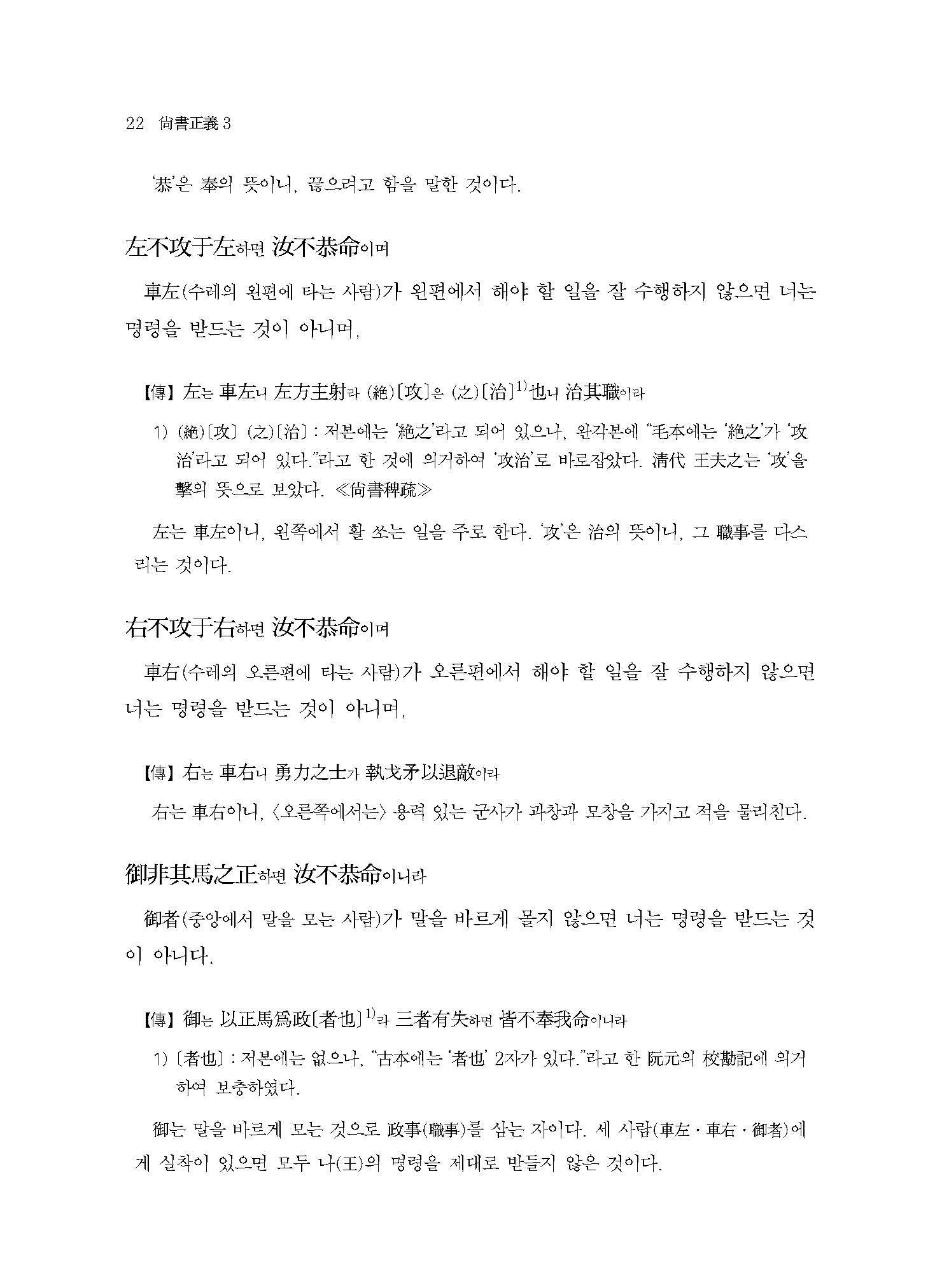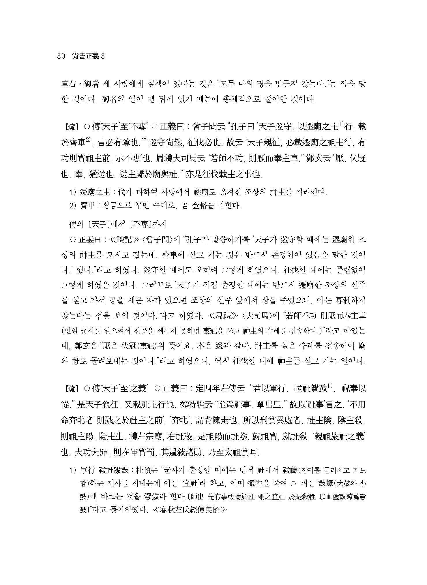 ≪역주 상서정의3≫는 전통 한학漢學의 계승 발전과 현대화에 이바지한 원로 한학자 김동주金東柱 선생이 고주古注와 신주新注를 면밀히 살피고 그 차이점을 밝혔을 뿐만 아니라 송⋅명⋅청대의 연구와 우리나라 선현들의 연구까지도 망라하였다. 게다가 원문原文의 경문經文과 전傳에는 우리나라 전통방식으로 현토懸吐하고, 소疏에는 간략한 현대식 표점標點을 하여 독자의 이해를 도왔다.