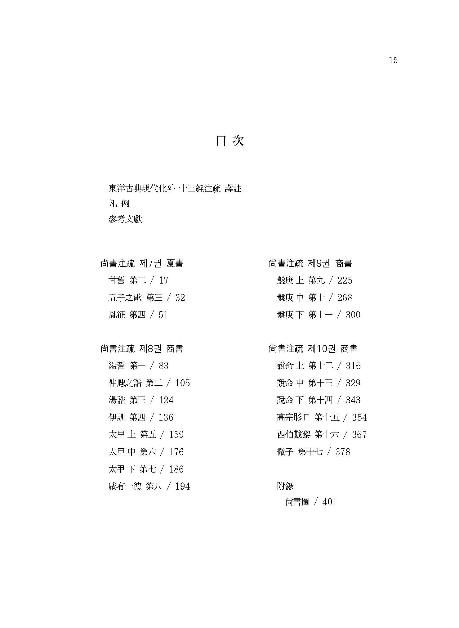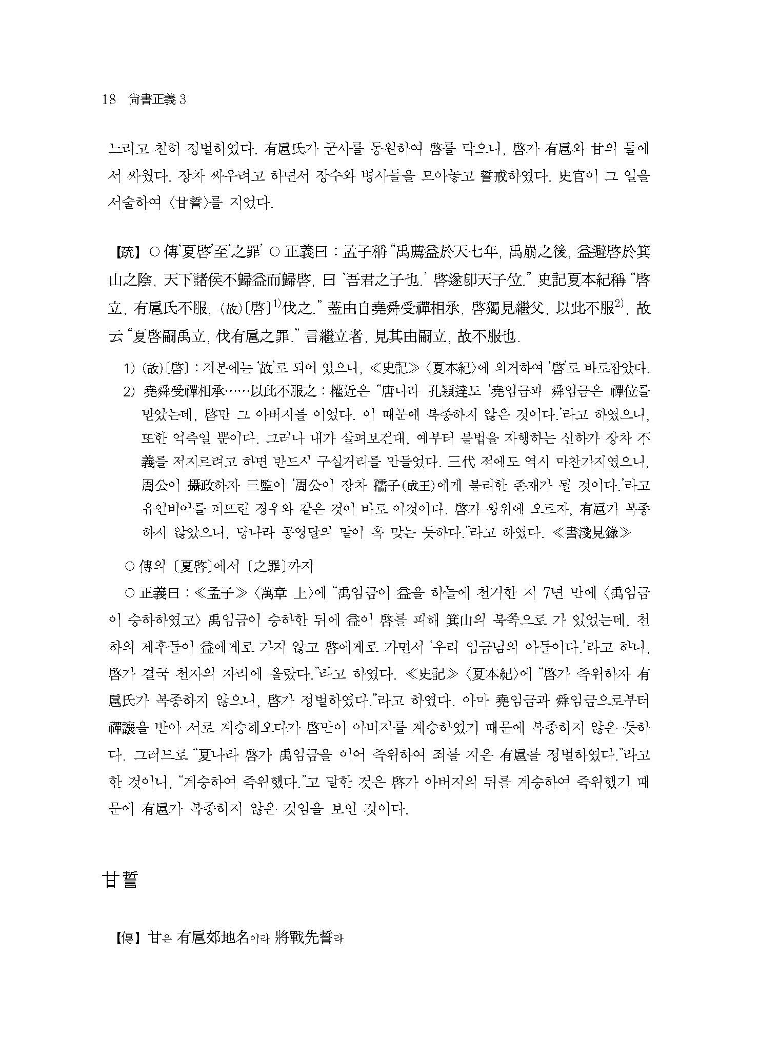 세계의 어느 누구도 감히 시도하지 못한 ≪상서정의尙書正義≫를 (사)전통문화연구회에서 최초로 경문은 물론 공안국 전과 공영달 소의 완역에 도전한다. 이번에 출간한 ≪역주譯註 상서정의尙書正義 3≫는 그 세 번째 결과물이다. 우리나라에서는 전통적으로 주자朱子의 제자인 채침蔡沈의 ≪서경집전書經集傳≫만을 신봉하여 신주新注만을 주로 연구하였으며, 지금도 이 테두리를 벗어나지 못하고 있다. 이것은 아마도 번역된 책이 없었다는 데에 가장 큰 원인이 있을 것이다.