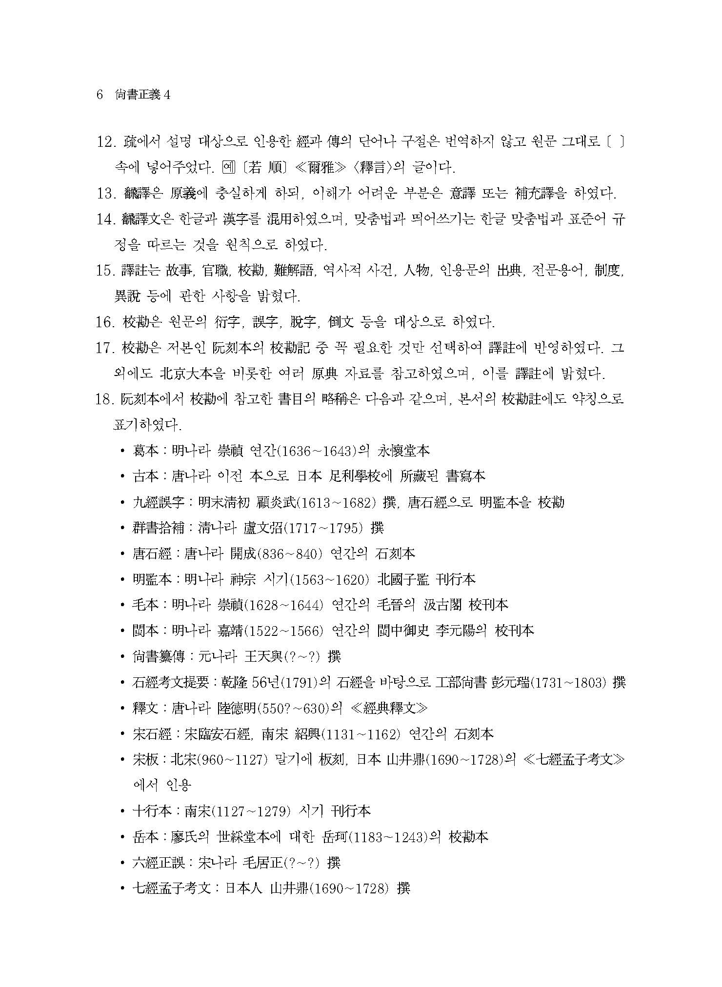 세계의 어느 누구도 감히 시도하지 못한 ≪상서정의≫를 (사)전통문화연구회에서 최초로 경문은 물론 공안국 전과 공영달 소의 완역에 도전한다. 이번에 출간한 ≪역주譯註 상서정의尙書正義 4≫는 그 네 번째 결과물이다. 우리나라에서는 전통적으로 주자朱子의 제자 채침蔡沈의 ≪서경집전書經集傳≫만을 신봉하여 신주新注만을 주로 연구하였으며, 지금도 이 테두리를 벗어나지 못하고 있다. 이것은 아마도 번역서가 없다는 데에 가장 큰 원인이 있을 것이다.