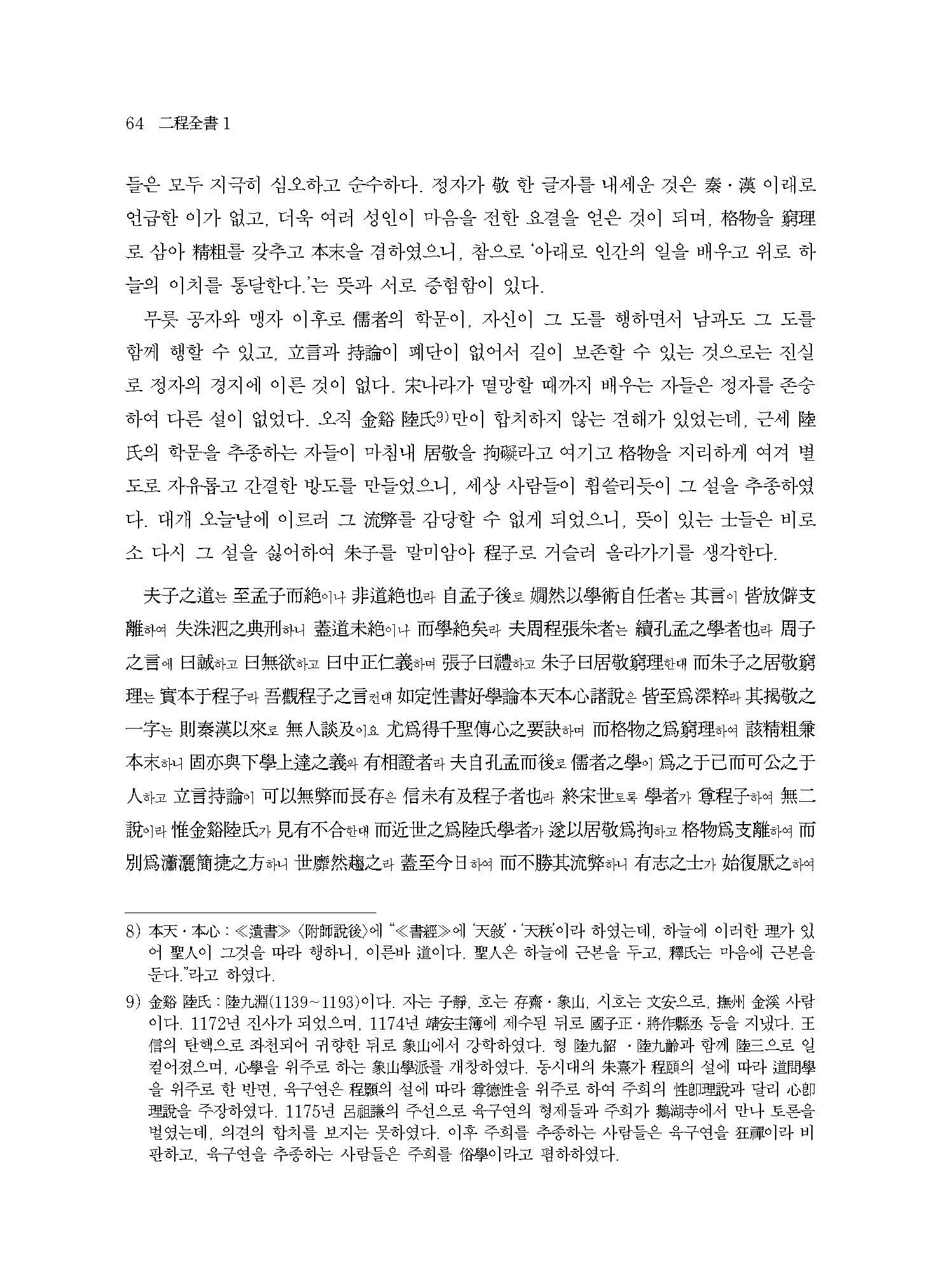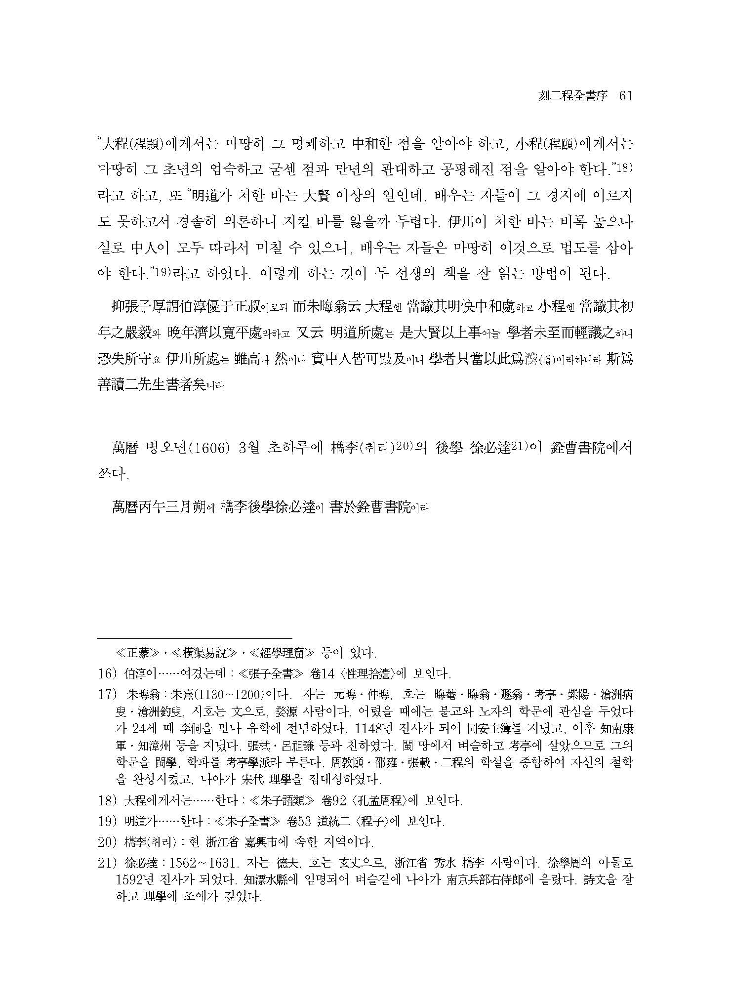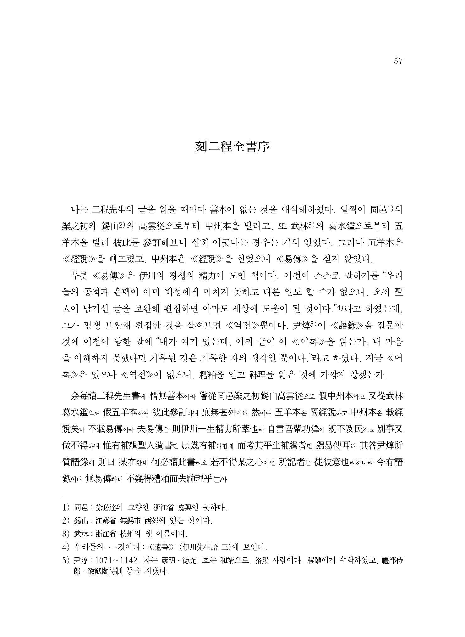 그런데 오늘날에는 이정의 학문과 사상에 대한 연구가 미미할 뿐만 아니라, ≪이정전서≫에 대한 번역도 이루어지지 못하고 있다. 그러나 조선시대 학문과 사상을 온전히 이해하기 위해서는 주자서朱子書는 물론 이정서二程書에 대한 충분한 이해가 선행되어야 한다.