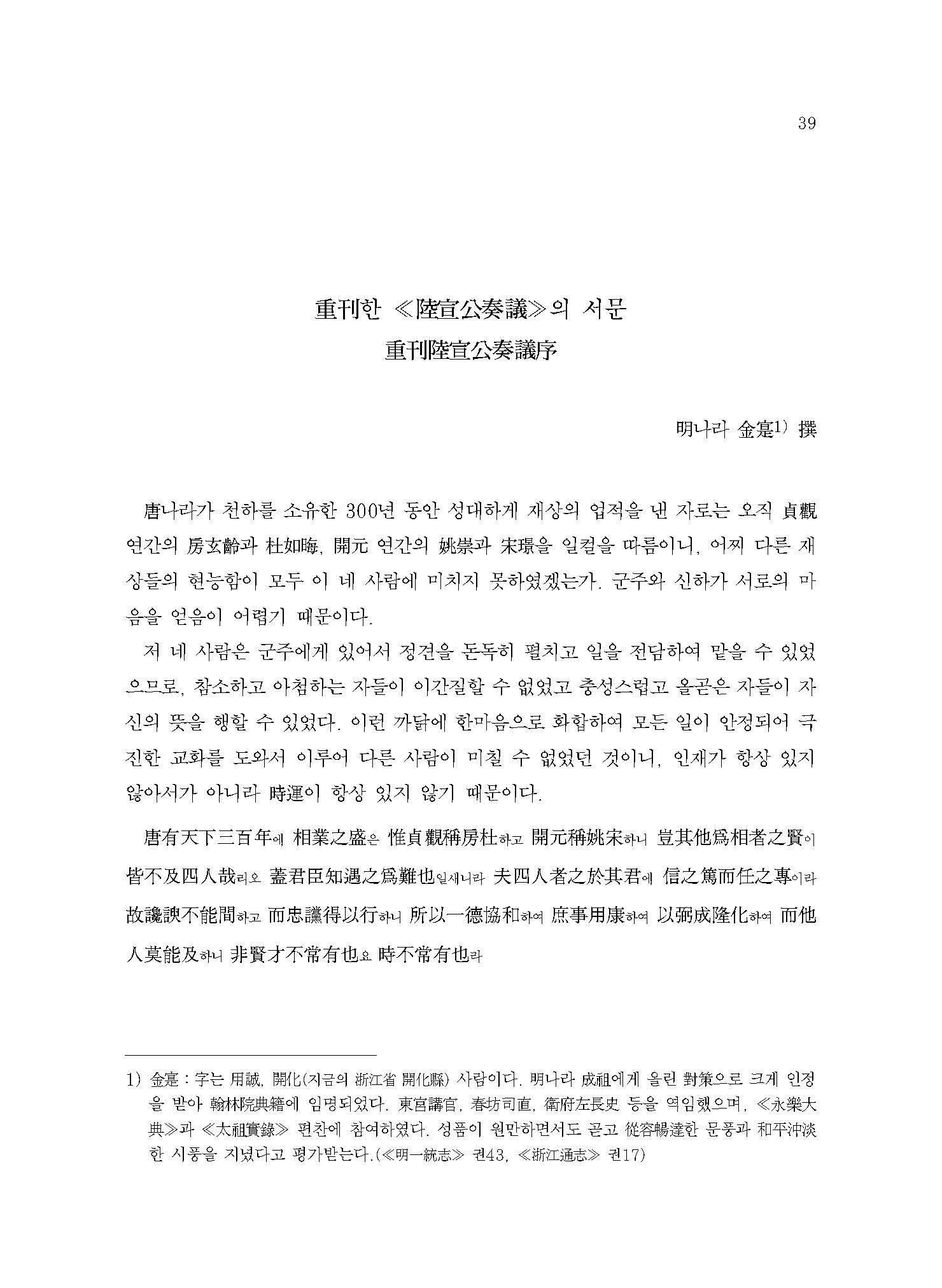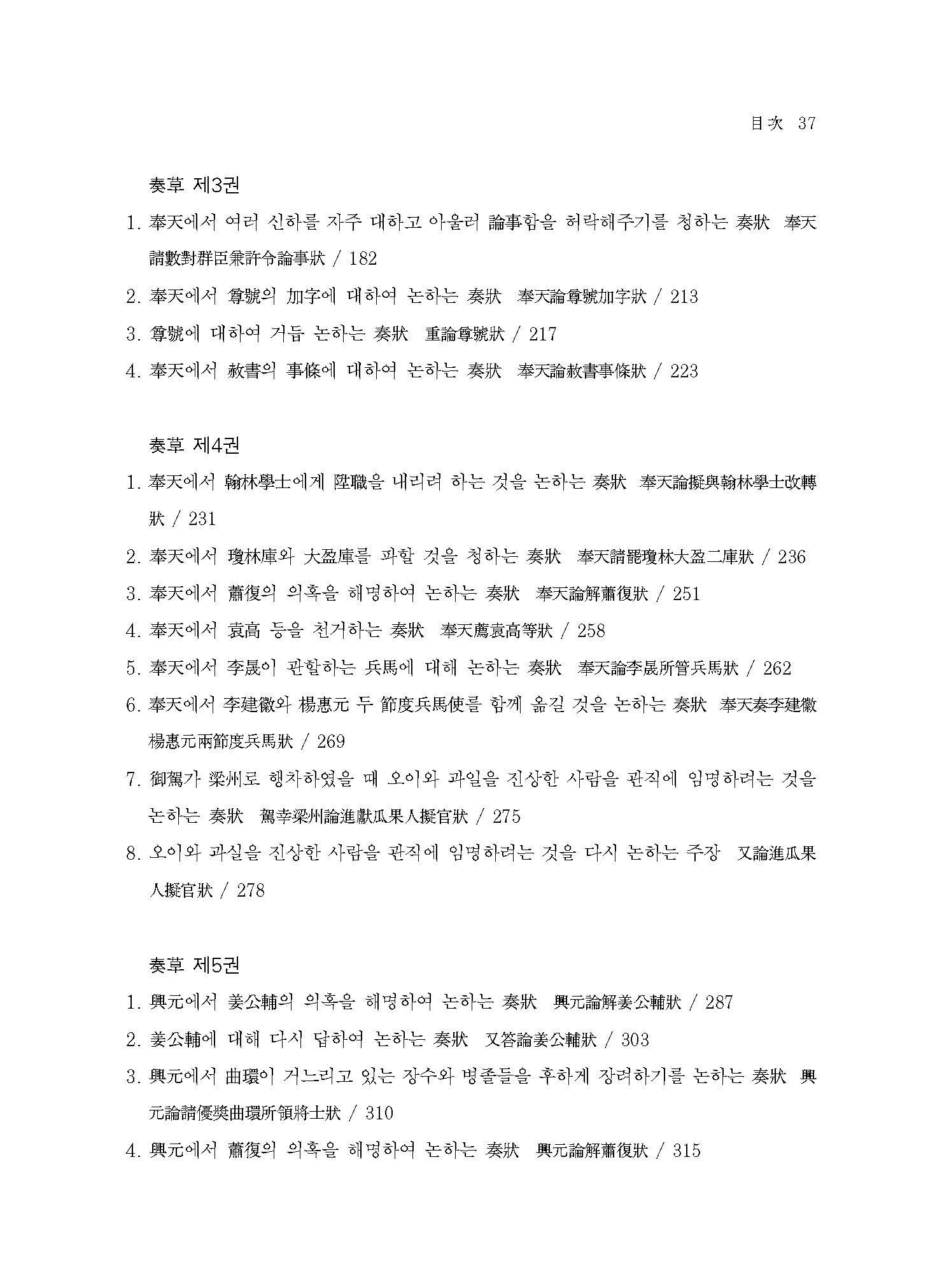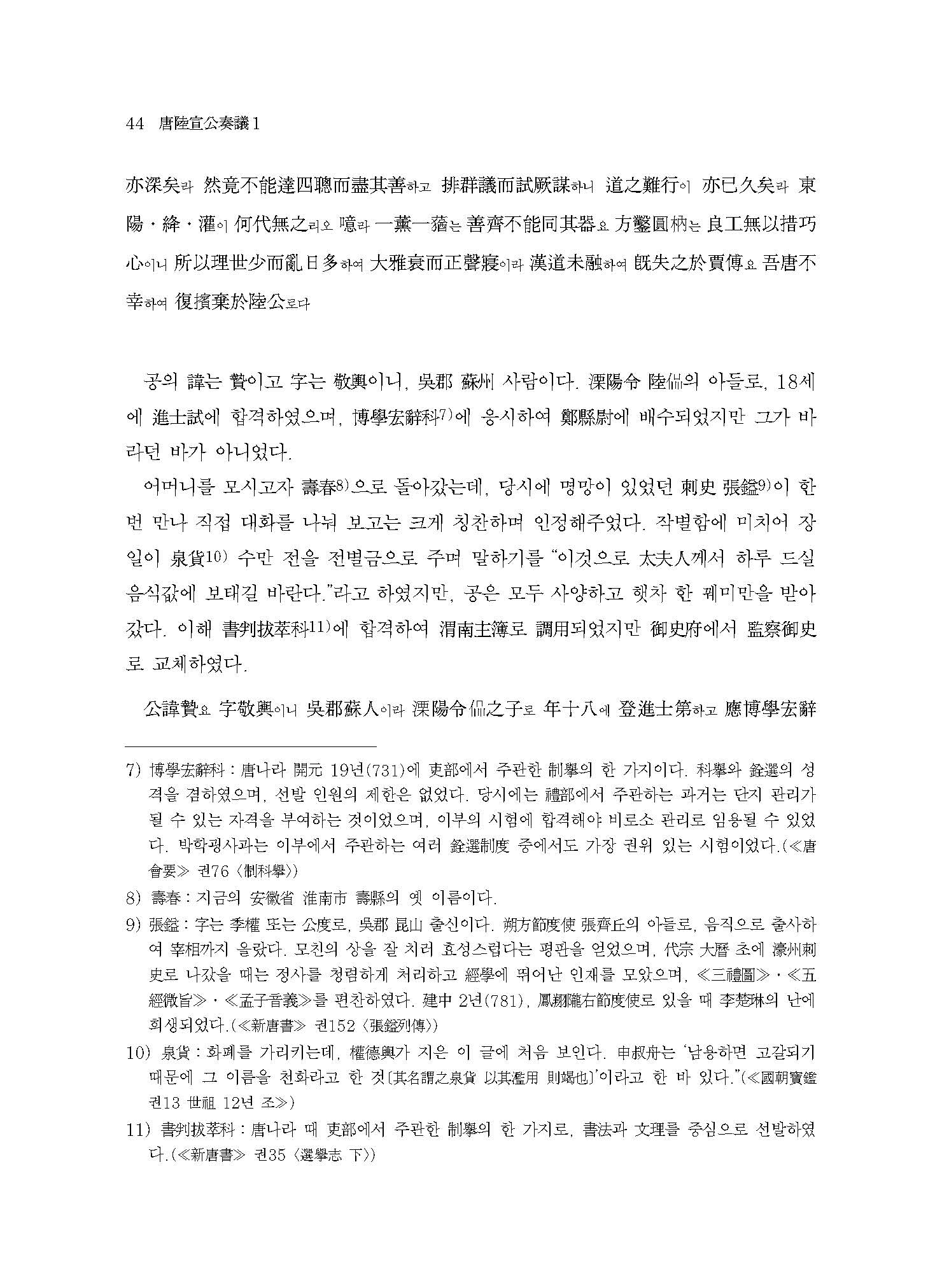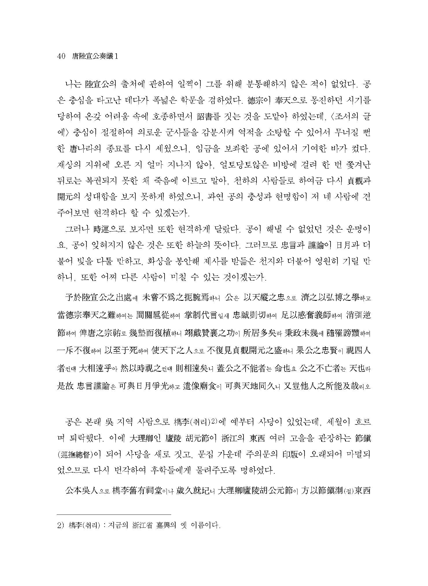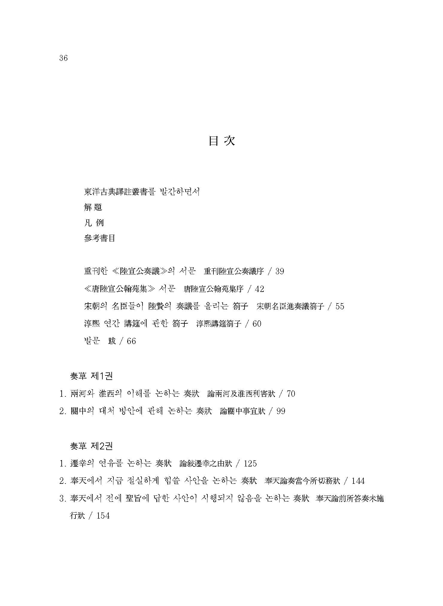 ≪당육선공주의≫는 모두 2책으로 간행될 예정이며 본서는 그 첫 책이다. 본서는 원본의 편집 체제의 특징을 그대로 구현하고자 하였으며, 번역문은 현대적으로 표현하여 일반 독자들이 번역문만 읽어도 그 내용을 쉽게 이해할 수 있게 하였다. 또한 번역문 아래 원문을 함께 실어놓았으며 원문에는 원문의 문장구조를 한국적인 방식으로 이해하는 데 도움이 되도록 우리나라 전통적 방식의 현토懸吐를 하였을 뿐만 아니라 교감을 하여 학술적 연구에 도움을 주고자 하였다.