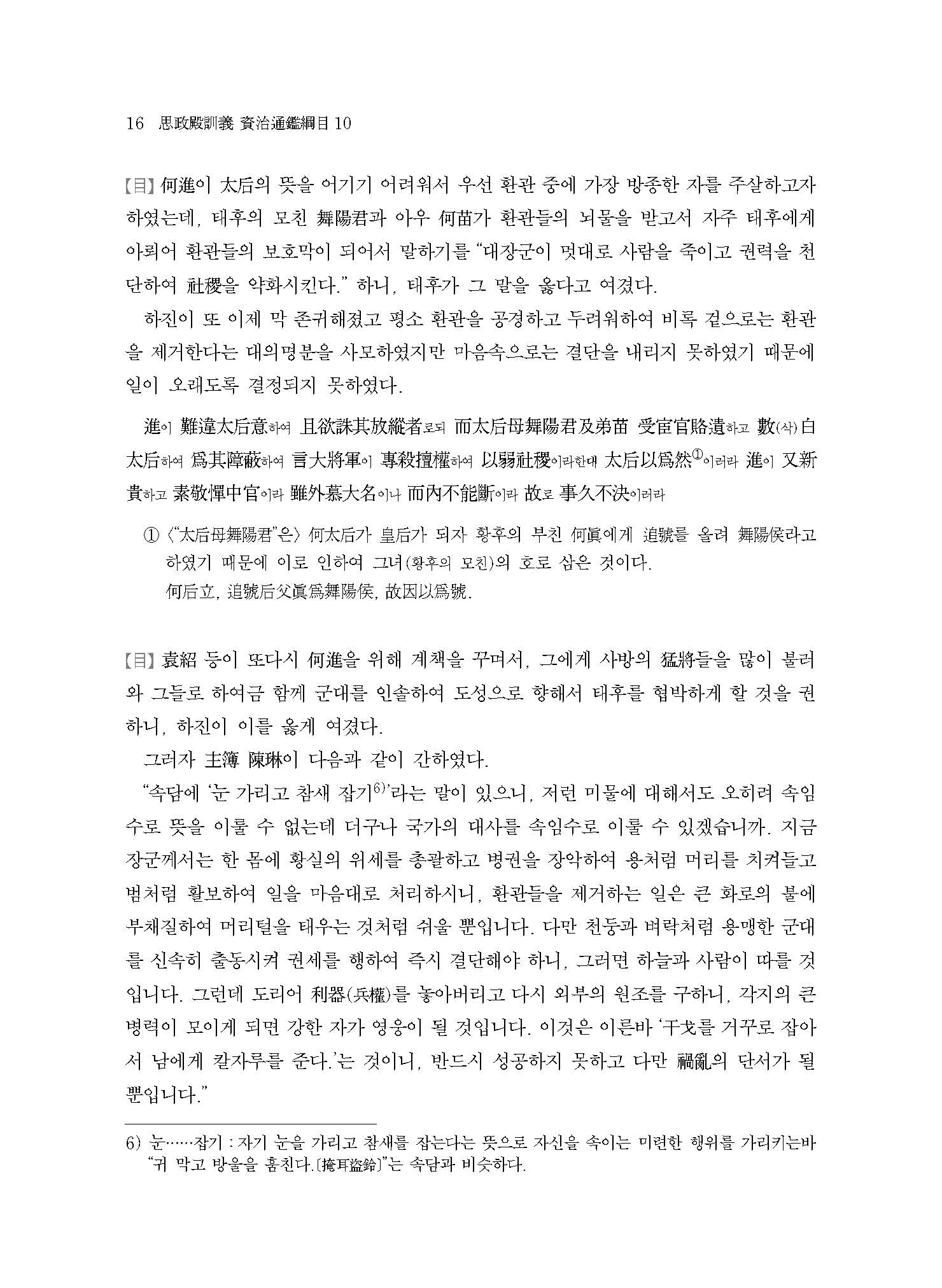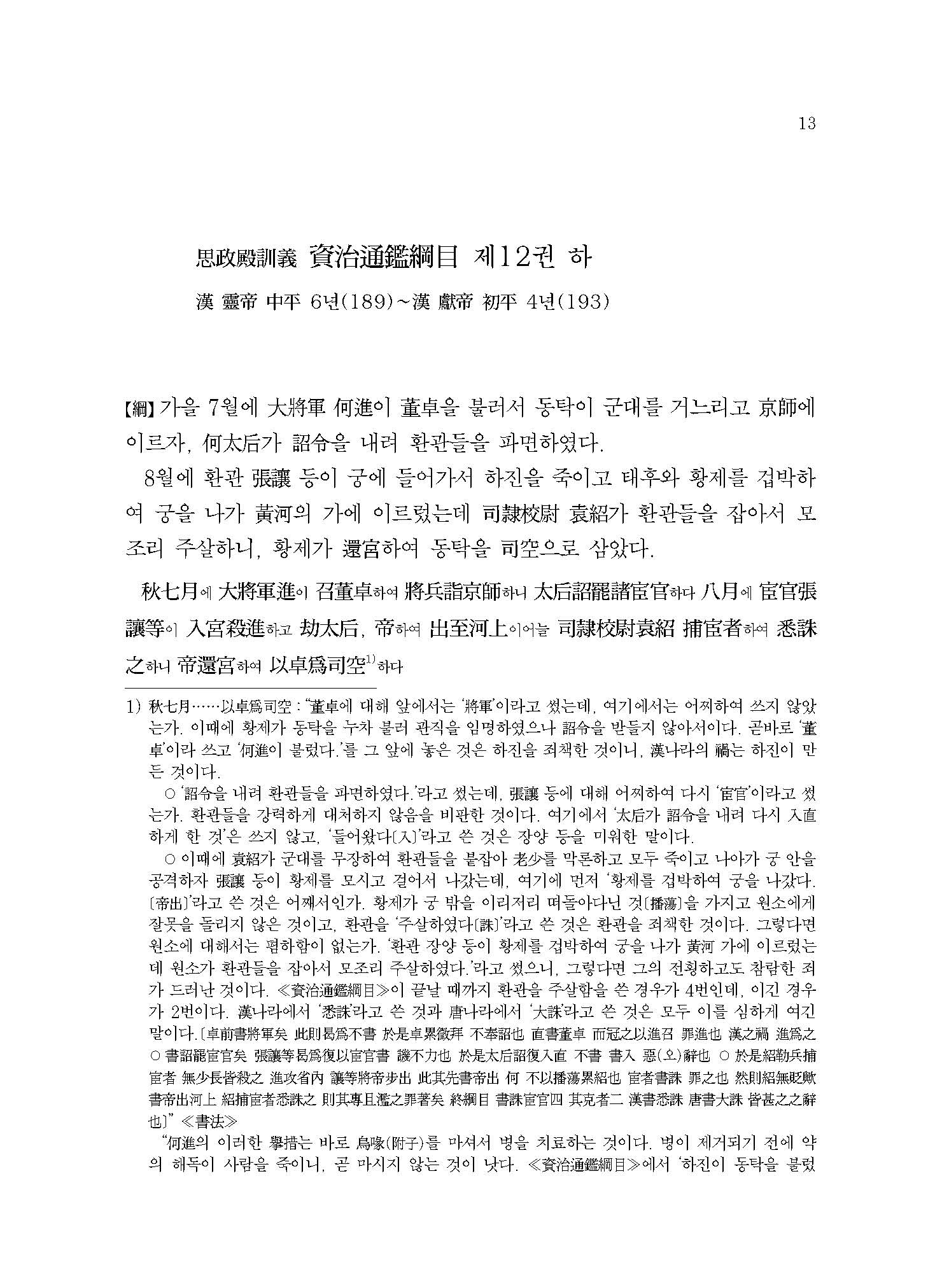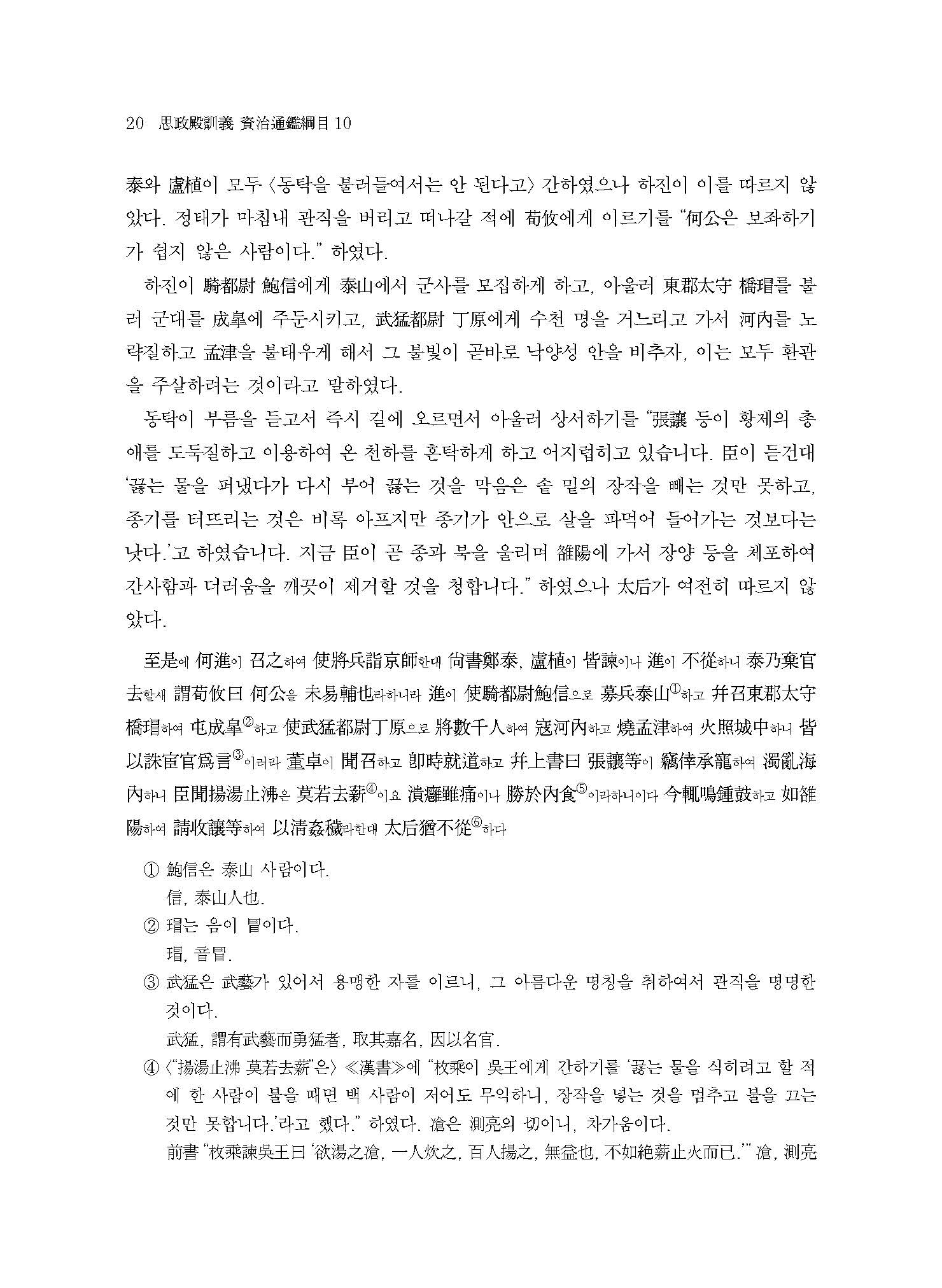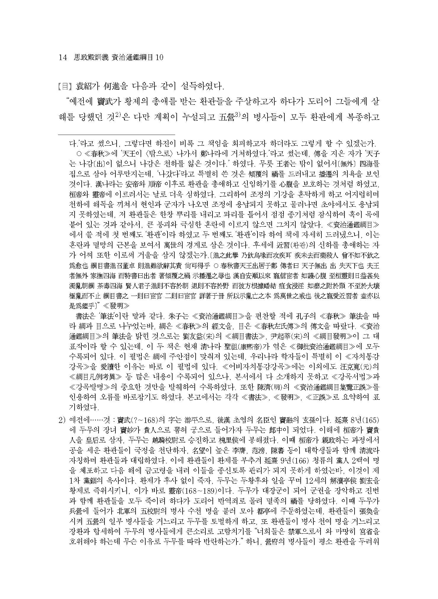≪역주 사정전훈의 자치통감강목≫는 모두 39책으로 간행될 예정이다. 본서는 원본의 편집 체제의 특징을 그대로 구현하고자 하였으며, 번역문은 현대적으로 표현하여 일반 독자들이 번역문만 읽어도 그 내용을 쉽게 이해할 수 있게 하였다. 또한 번역문 아래 원문을 함께 실어놓았으며 원문에는 원문의 문장구조를 한국적인 방식으로 이해하는 데 도움이 되도록 우리나라 전통적 방식의 현토懸吐를 하였을 뿐만 아니라 교감을 하여 학술적 연구에 도움을 주고자 하였다.