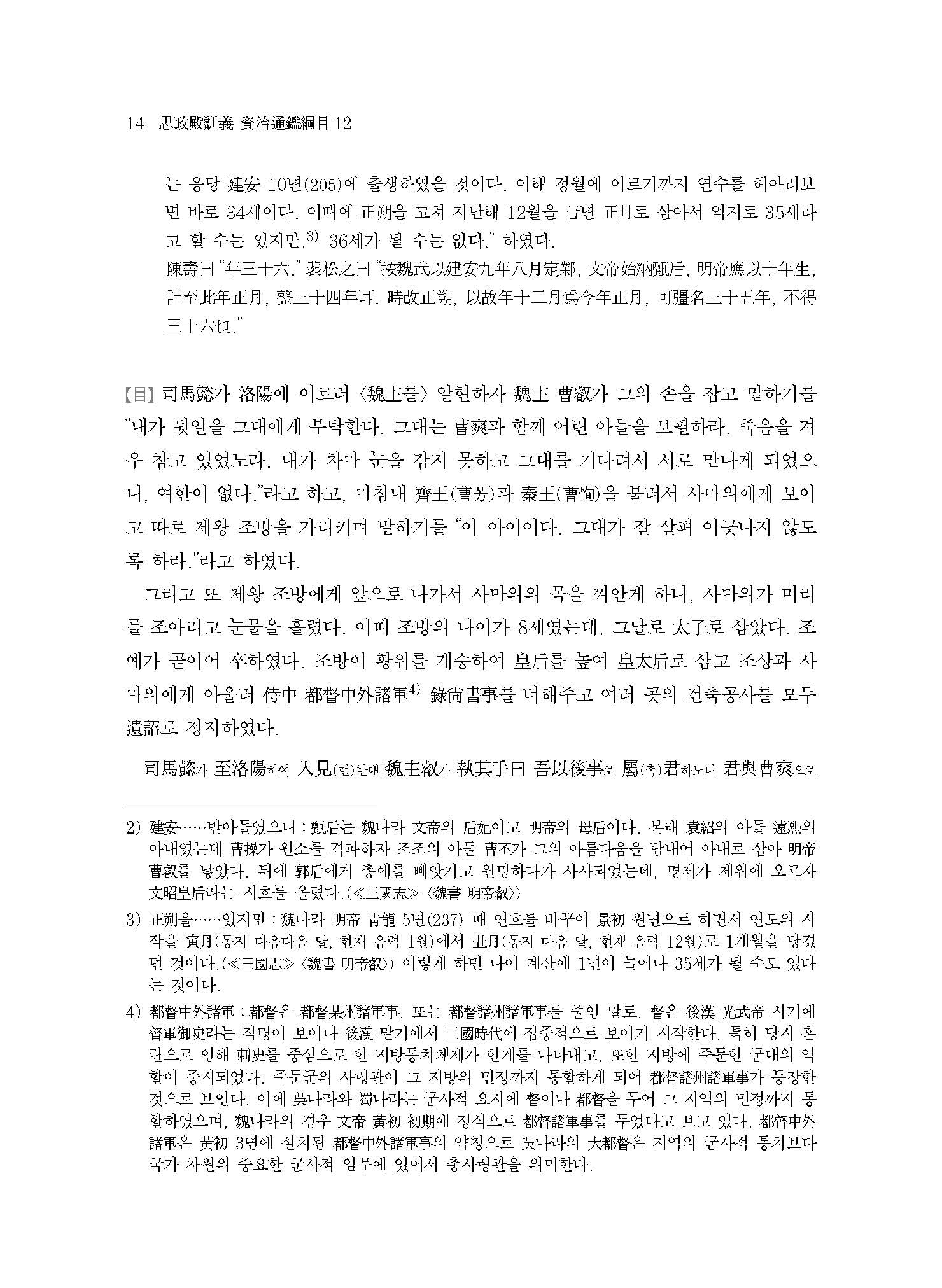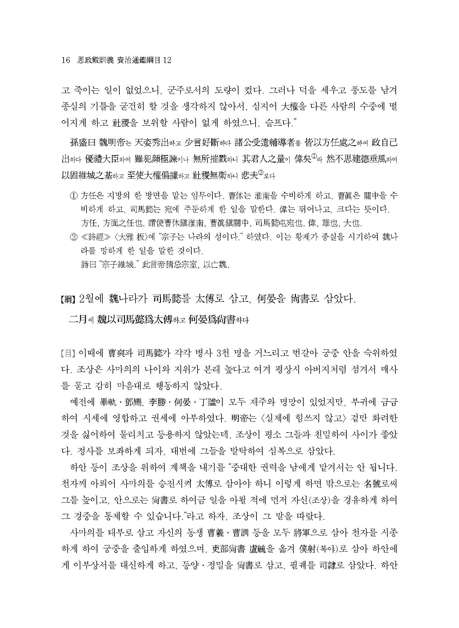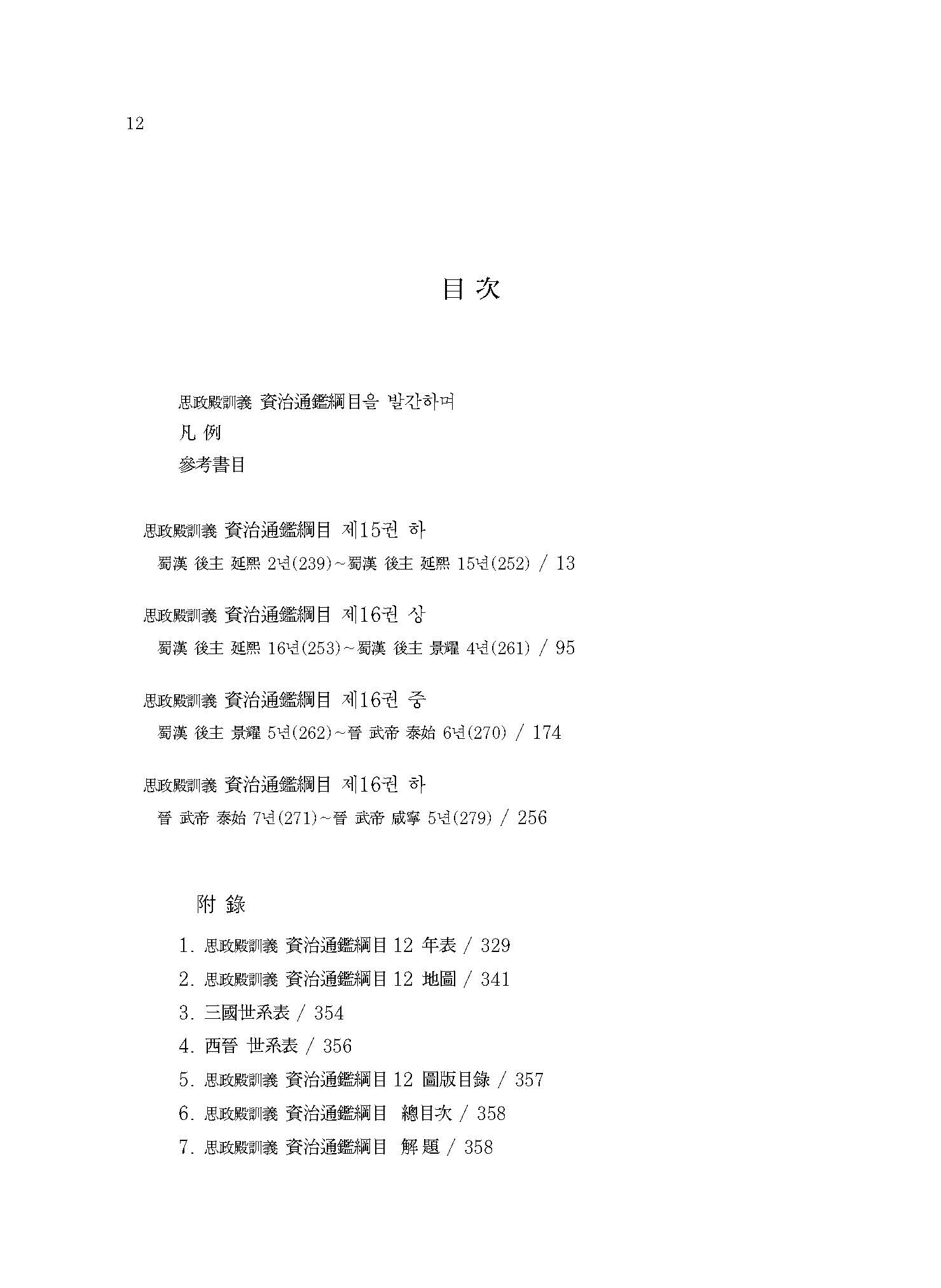≪사정전훈의 자치통감강목12≫는 ≪삼국지연의三國志演義≫의 종반부에 해당하는 이야기를 다루고 있다. 우리에게 친숙한 유비, 관우, 장비 등은 이미 죽음을 맞이한 뒤이고 소설로 읽는 삼국지에서는 소홀히 다뤄지는 부분이지만, 그렇기에 더더욱 정사(正史)로서 읽는 즐거움이 각별하다.