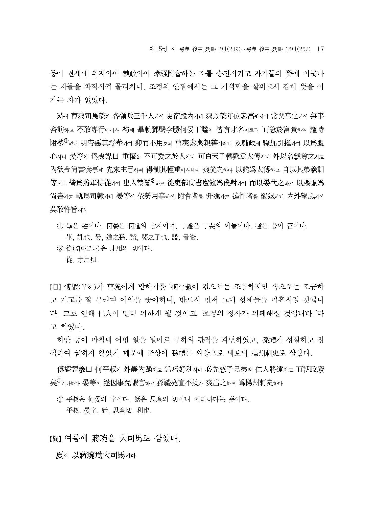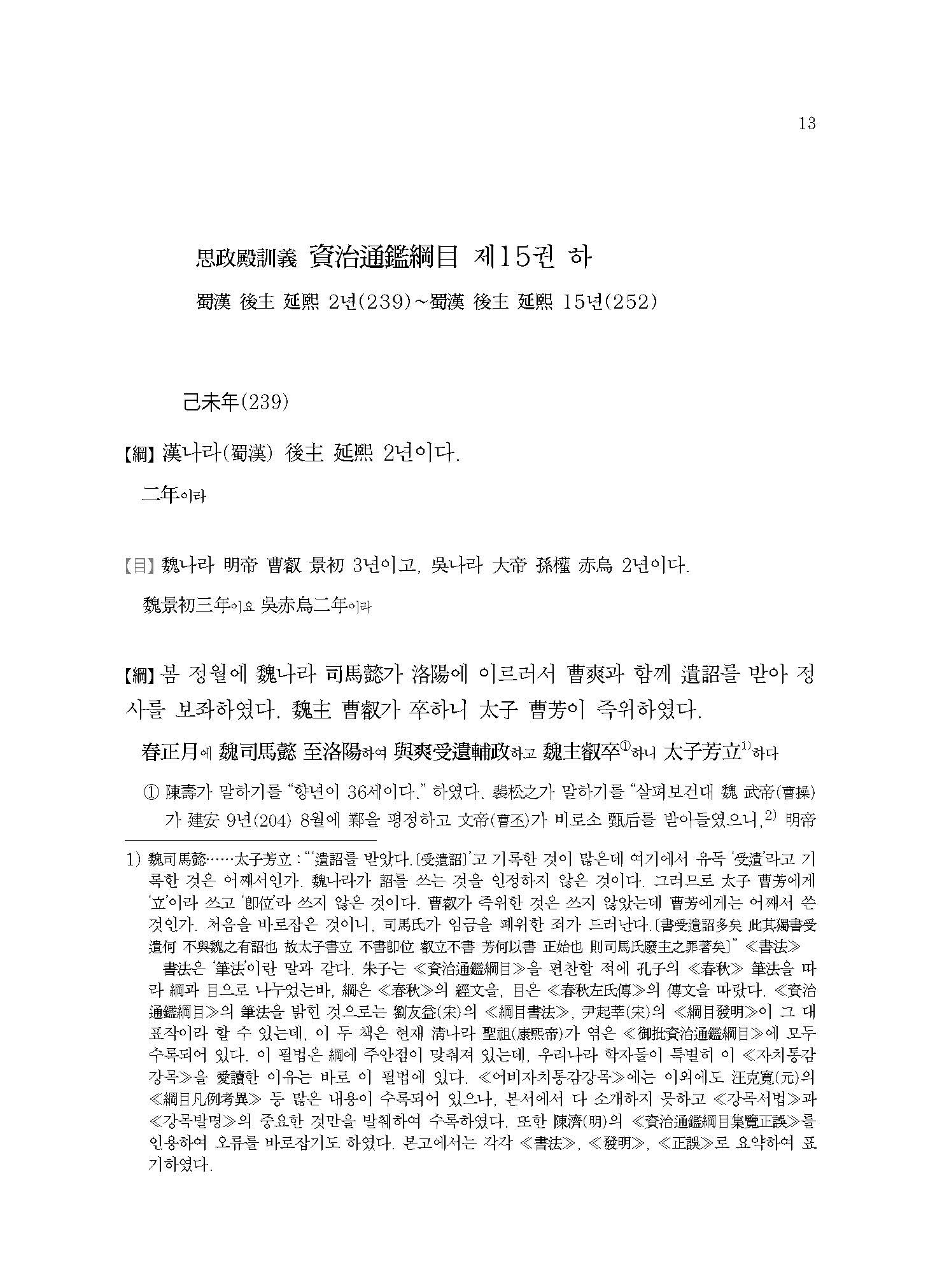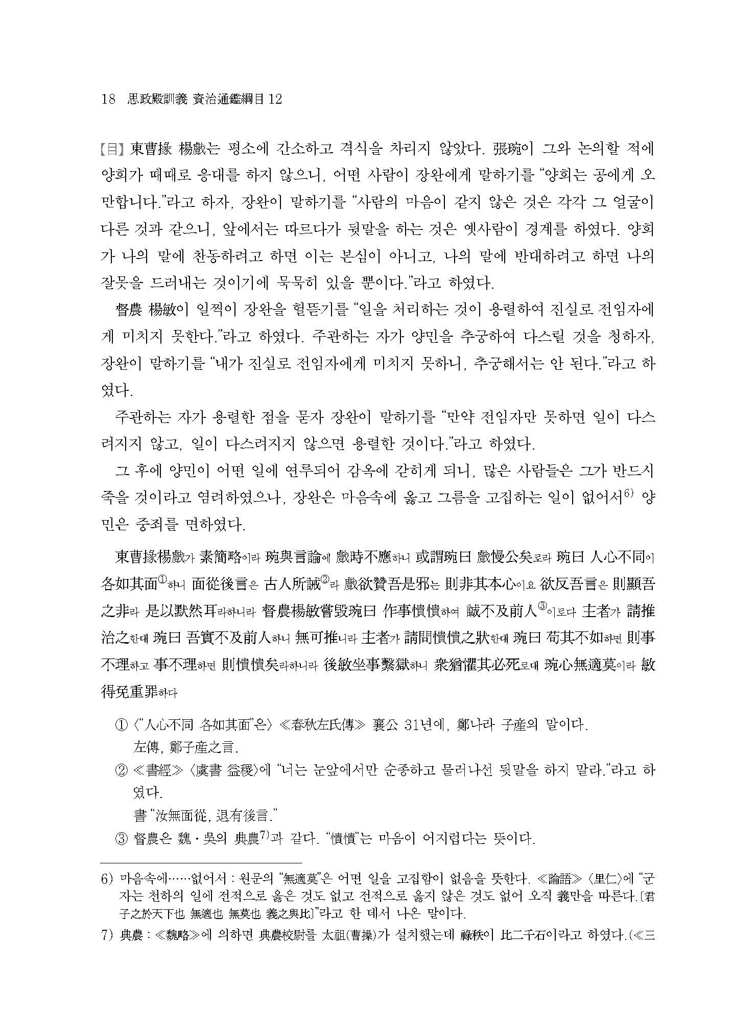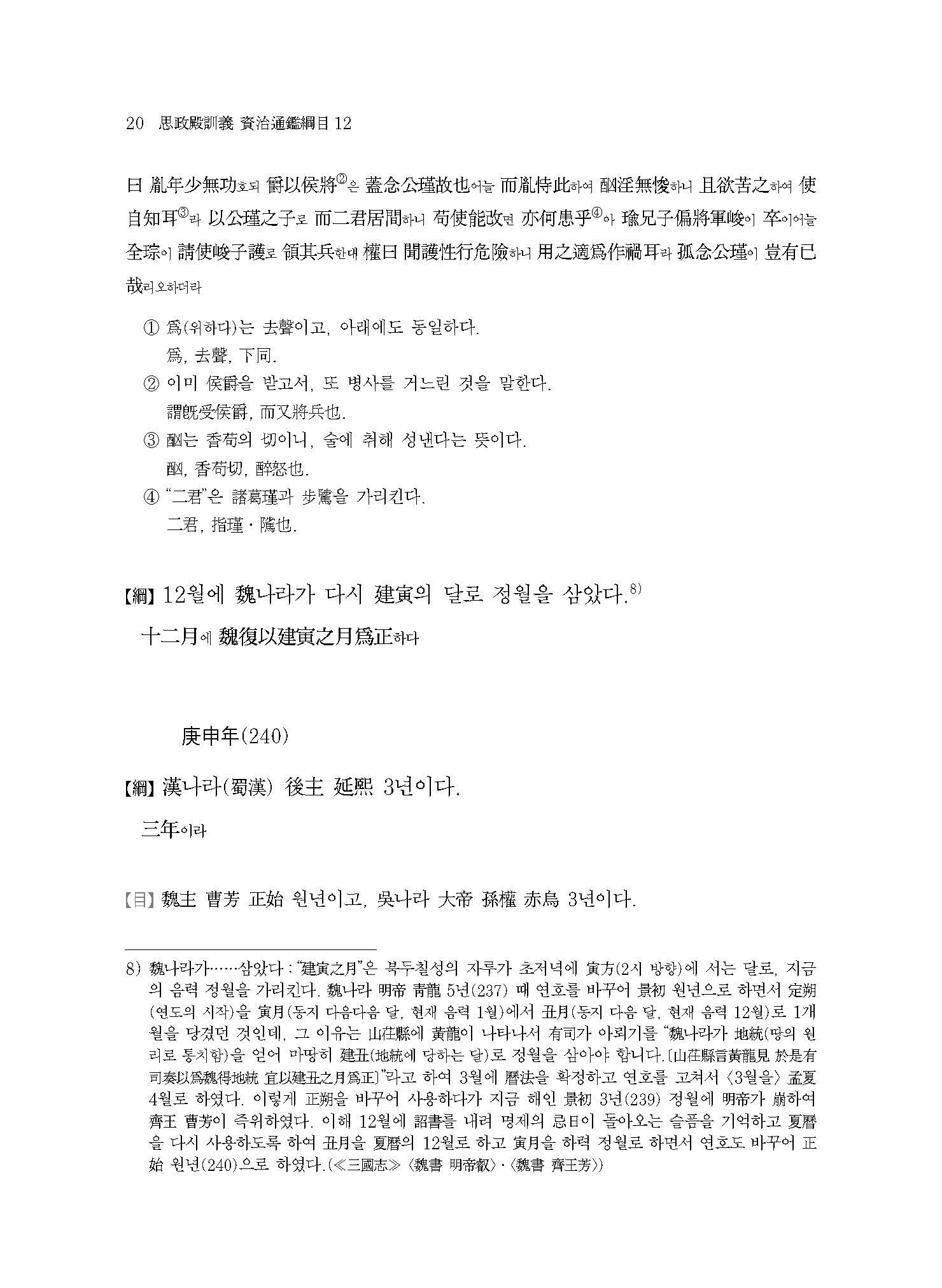 ≪사정전훈의 자치통감강목12≫는 ≪삼국지연의三國志演義≫의 종반부에 해당하는 이야기를 다루고 있다. 우리에게 친숙한 유비, 관우, 장비 등은 이미 죽음을 맞이한 뒤이고 소설로 읽는 삼국지에서는 소홀히 다뤄지는 부분이지만, 그렇기에 더더욱 정사(正史)로서 읽는 즐거움이 각별하다.