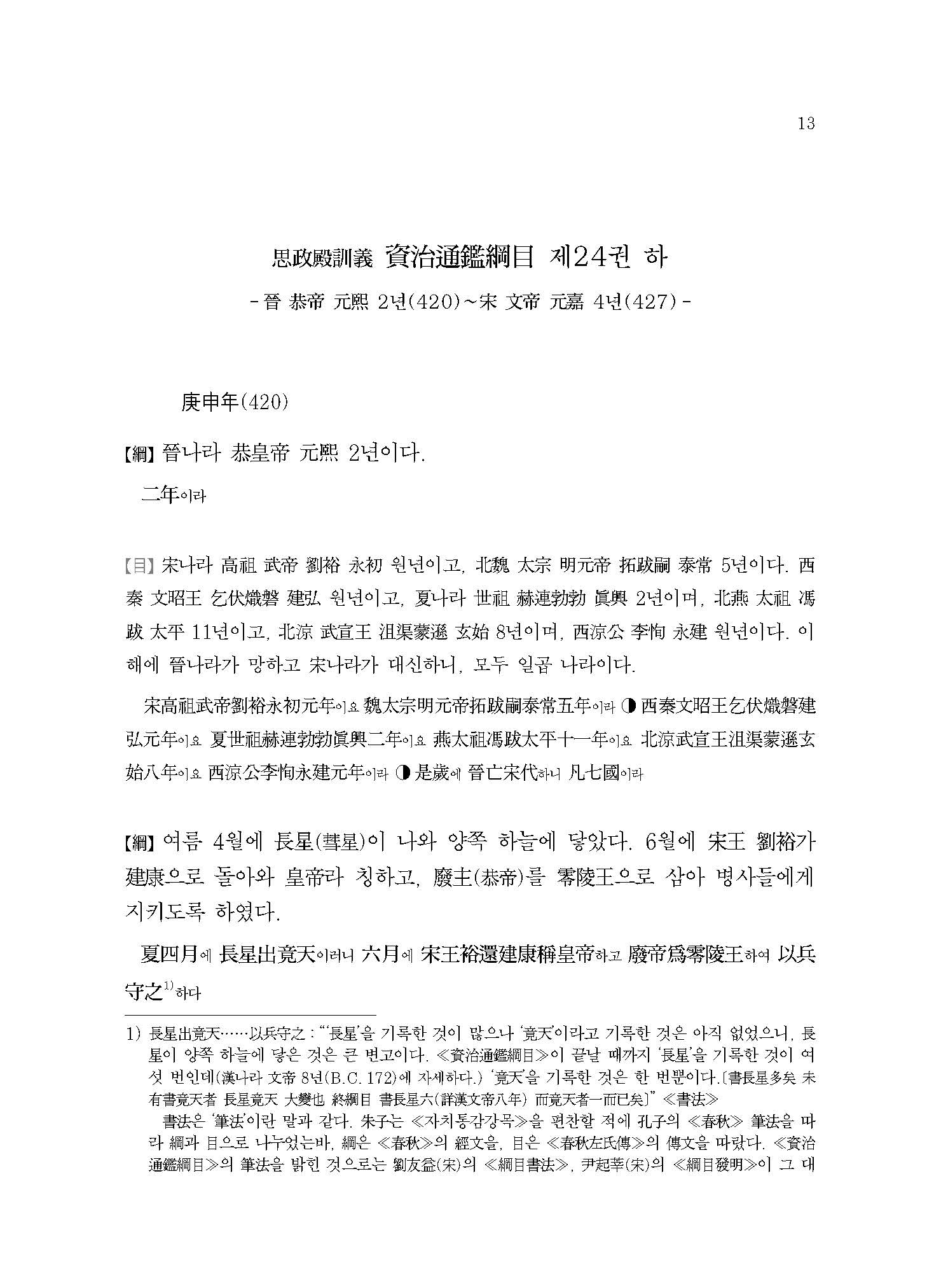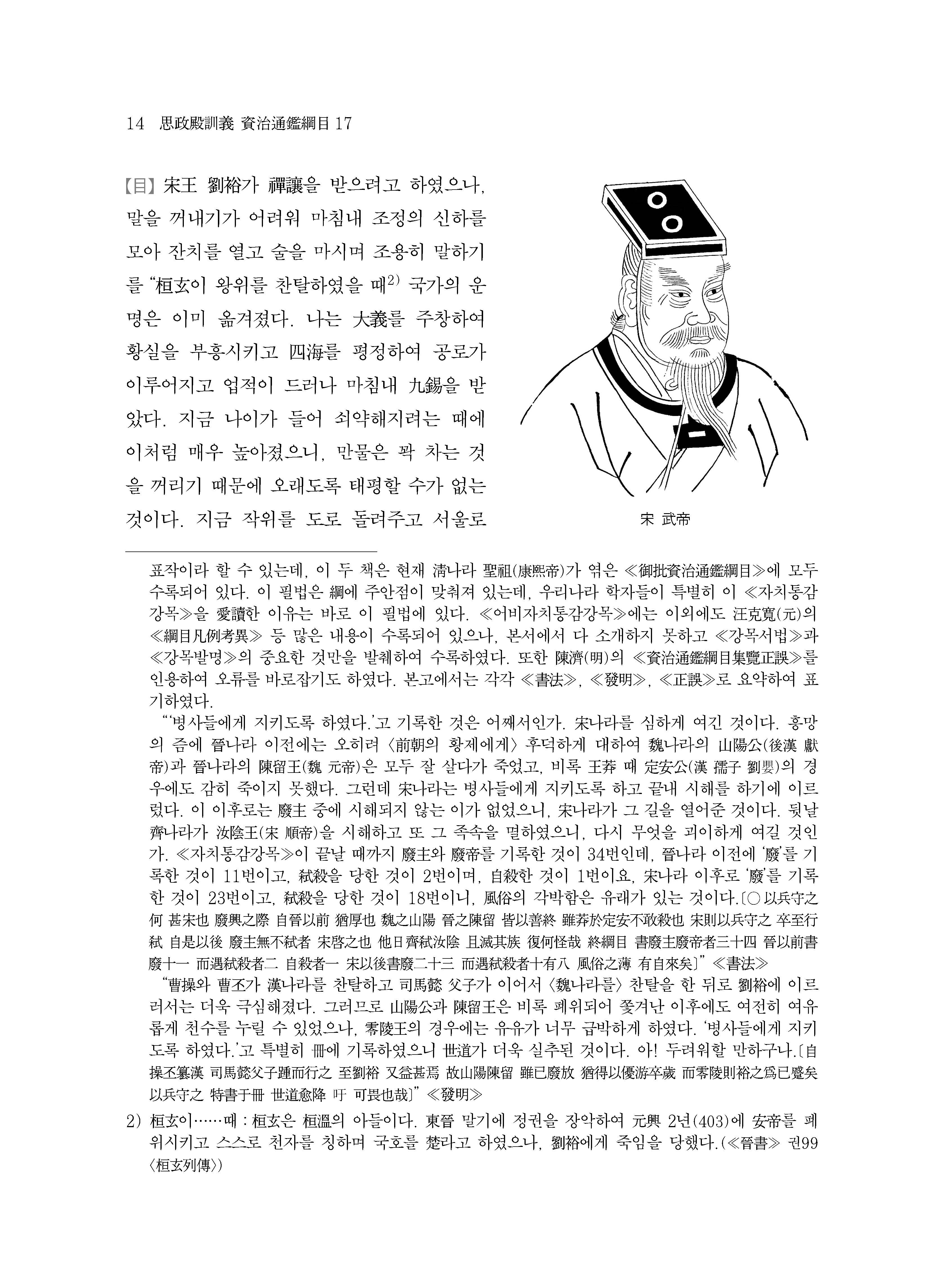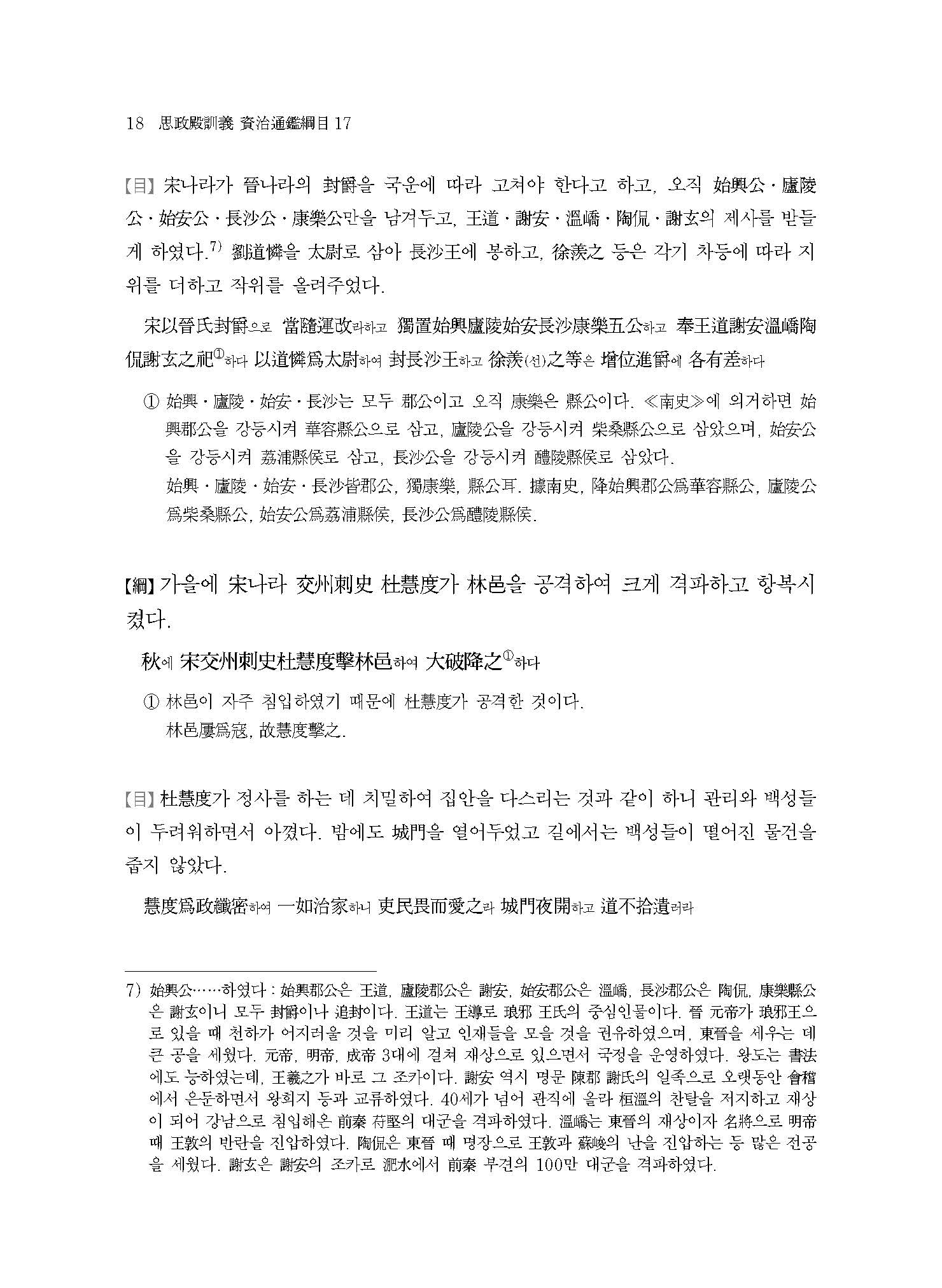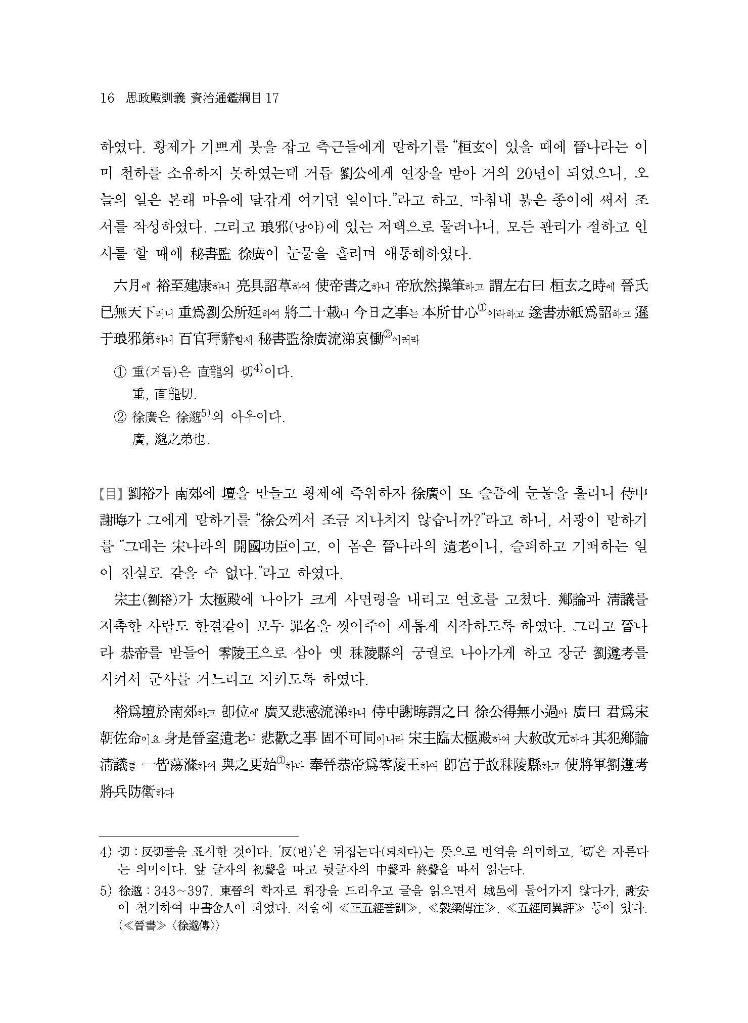 ≪사정전훈의 자치통감강목17≫은 진晉나라의 멸망과 송宋나라,북위北魏로 양분되는 남북조南北朝 시대의 서막을 다루고 있다. 420년 진나라 공제恭帝가 송왕宋王 유유劉裕에게 폐위되는 내용부터 이야기가 시작되는데, 주자朱子는 ≪자치통감강목≫을 저술하면서 진나라가 멸망한 421년 이후를 무통無統으로 기록하여 당시 할거割據하던 여섯 나라 중 어느 한 곳도 정통正統으로 인정하지 않았다. 이는 수隋나라 문제文帝가 천하를 통일하는 589년까지 지속된다.