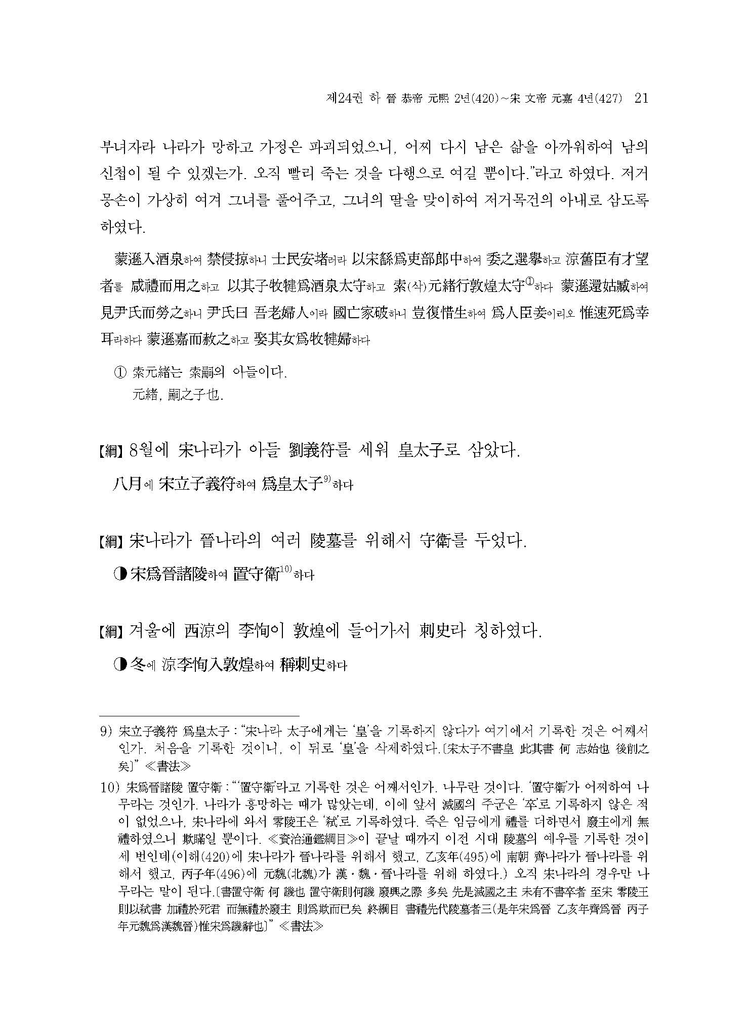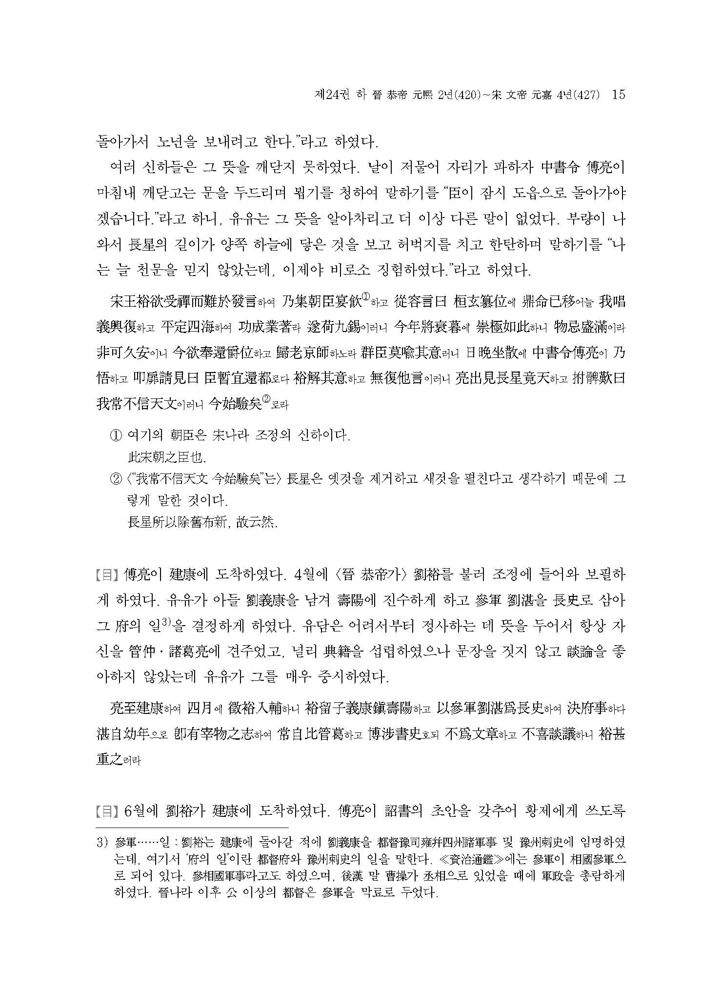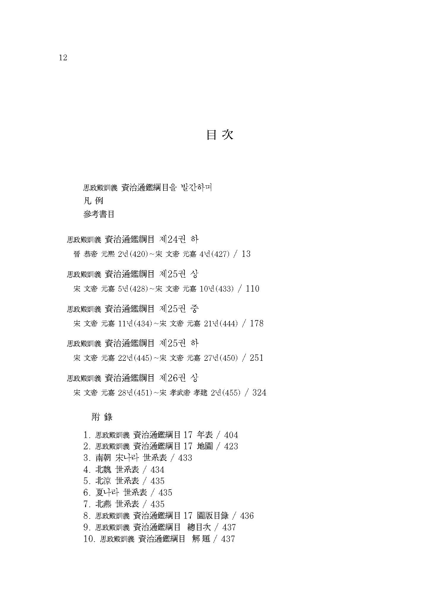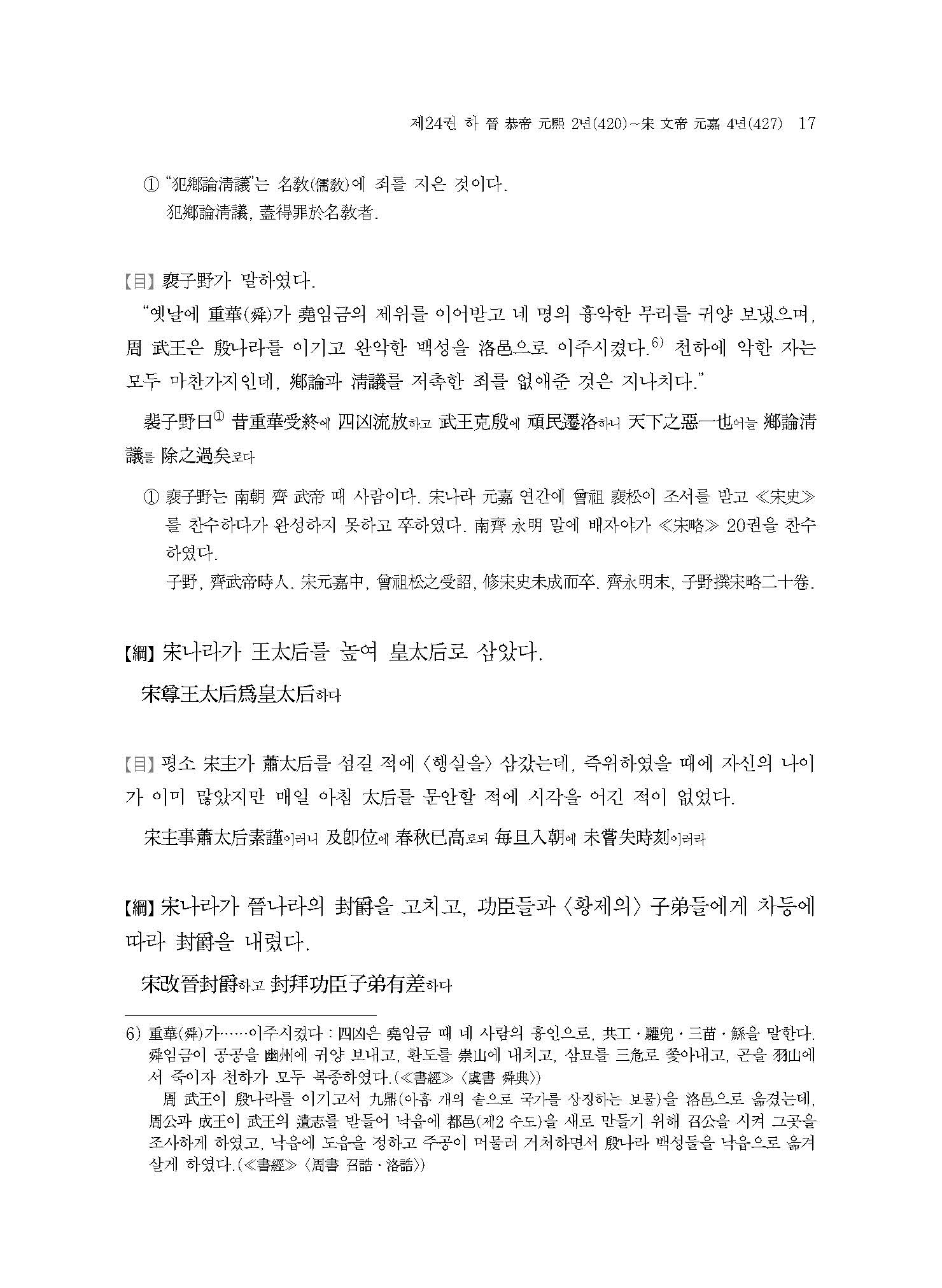 ≪사정전훈의 자치통감강목17≫은 진晉나라의 멸망과 송宋나라,북위北魏로 양분되는 남북조南北朝 시대의 서막을 다루고 있다. 420년 진나라 공제恭帝가 송왕宋王 유유劉裕에게 폐위되는 내용부터 이야기가 시작되는데, 주자朱子는 ≪자치통감강목≫을 저술하면서 진나라가 멸망한 421년 이후를 무통無統으로 기록하여 당시 할거割據하던 여섯 나라 중 어느 한 곳도 정통正統으로 인정하지 않았다. 이는 수隋나라 문제文帝가 천하를 통일하는 589년까지 지속된다.