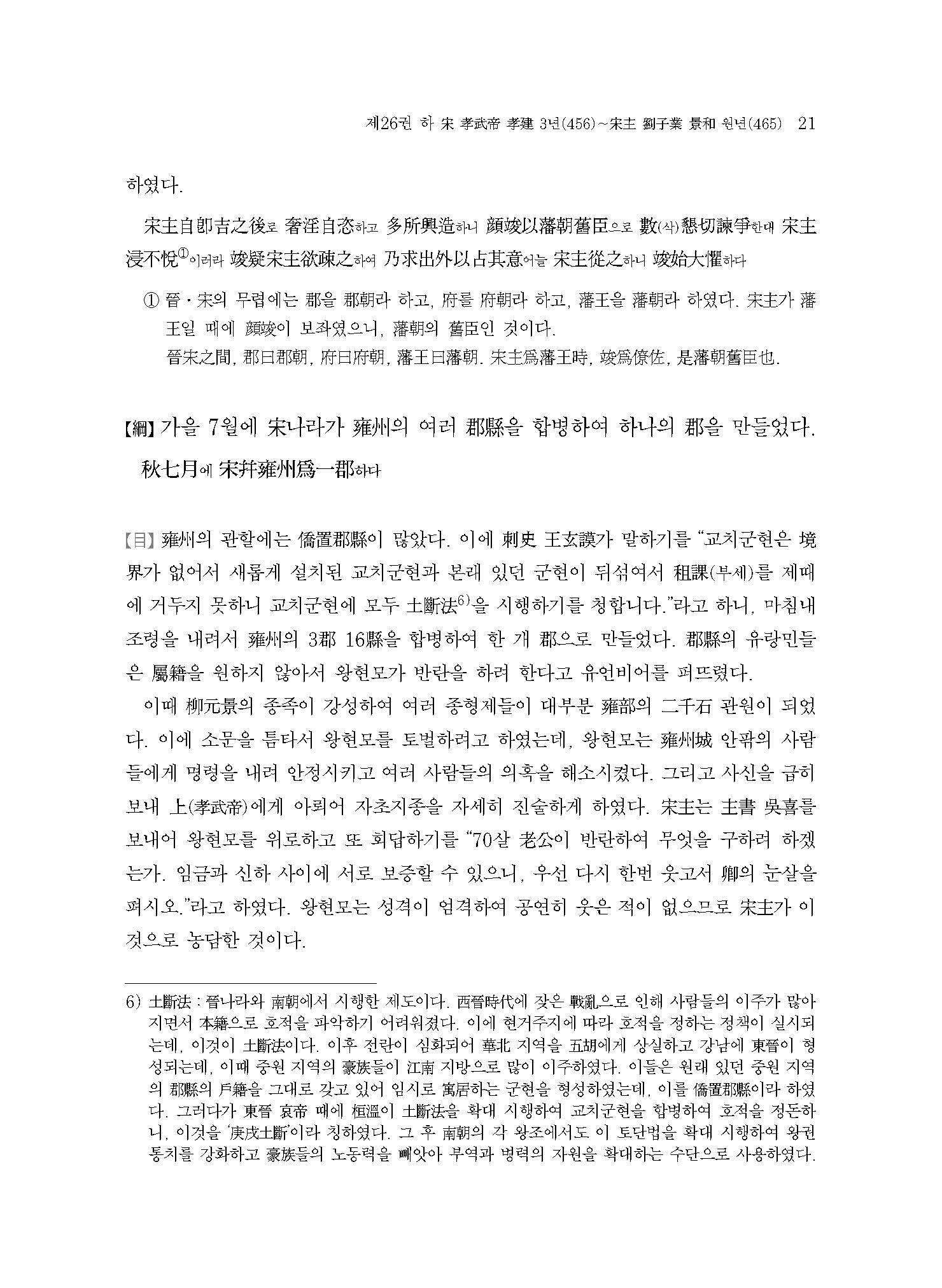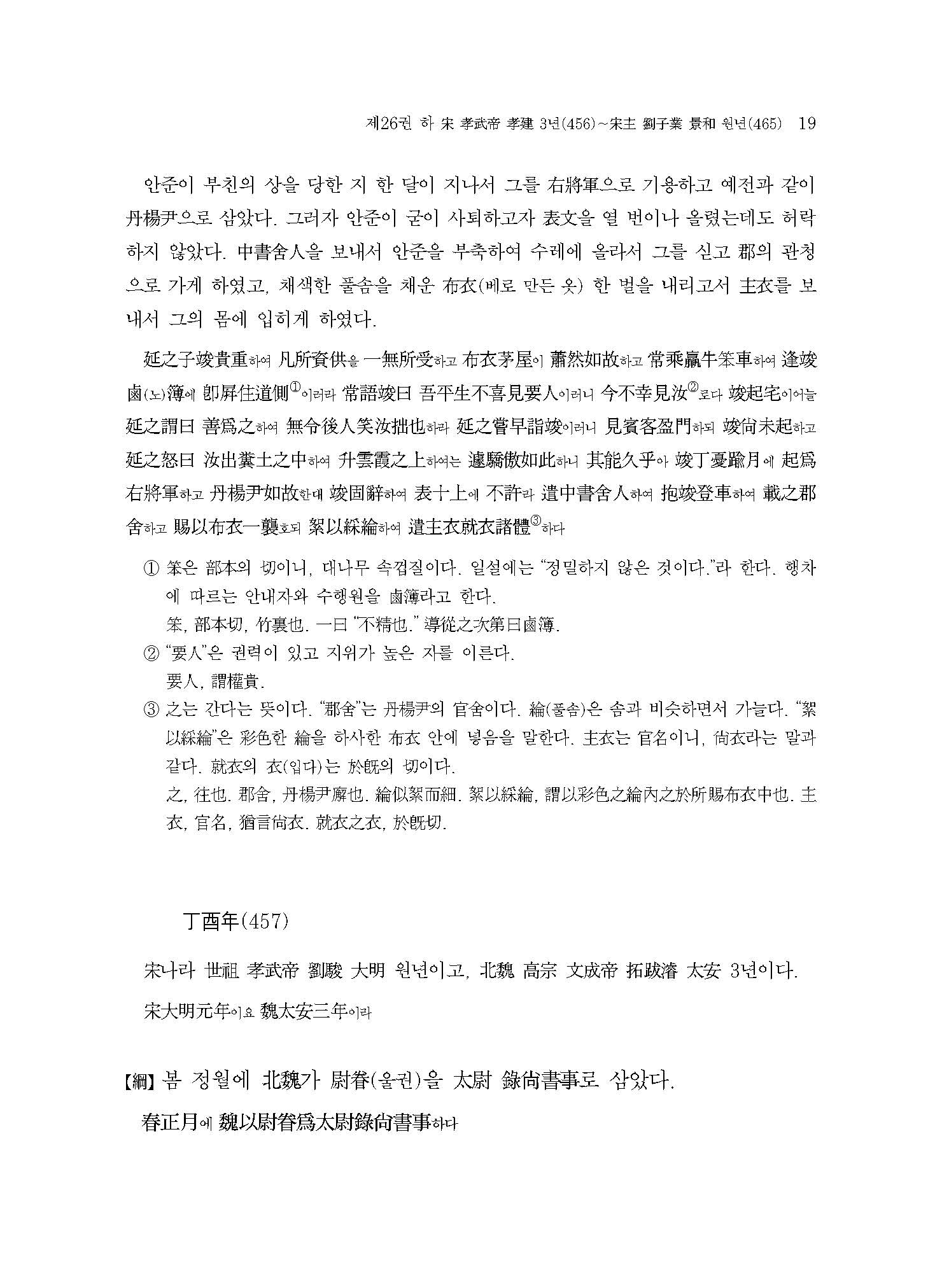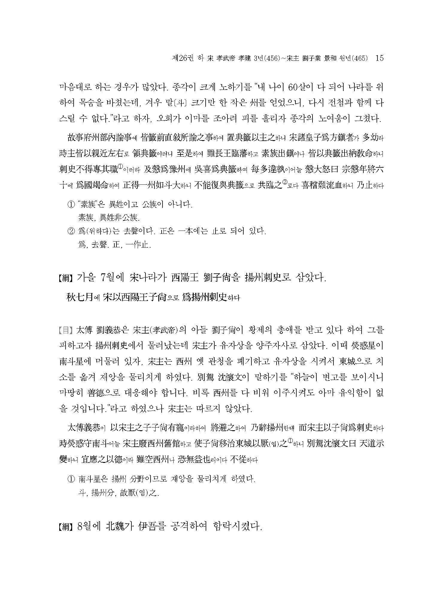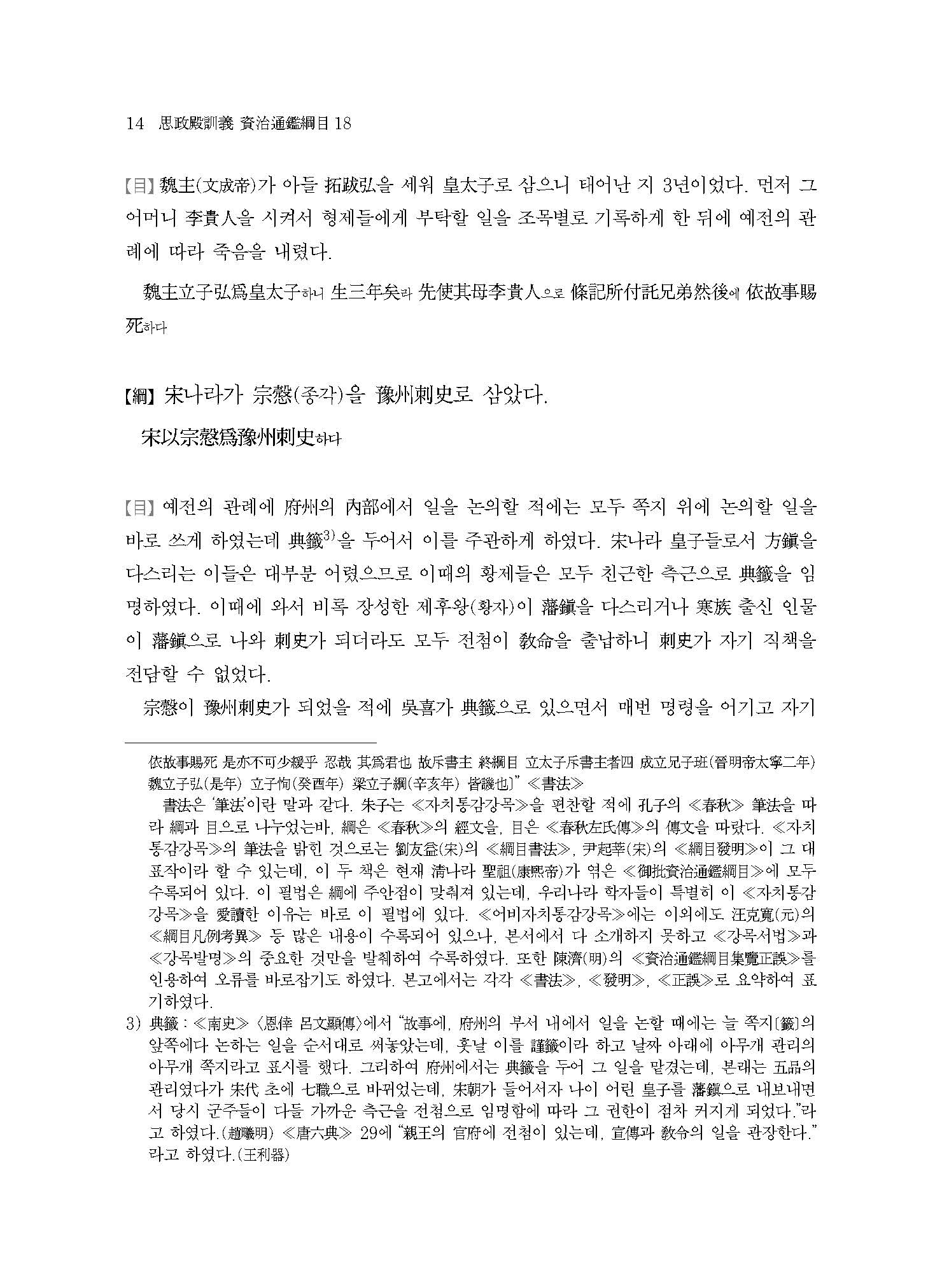 ≪역주 사정전훈의 자치통감강목≫는 모두 39책으로 간행될 예정이다. 본서는 원본의 편집 체제의 특징을 그대로 구현하고자 하였으며, 번역문은 현대적으로 표현하여 일반 독자들이 번역문만 읽어도 그 내용을 쉽게 이해할 수 있게 하였다. 또한 번역문 아래 원문을 함께 실어놓았으며 원문에는 원문의 문장구조를 한국적인 방식으로 이해하는 데 도움이 되도록 우리나라 전통적 방식의 현토懸吐를 하였을 뿐만 아니라 교감을 하여 학술적 연구에 도움을 주고자 하였다.