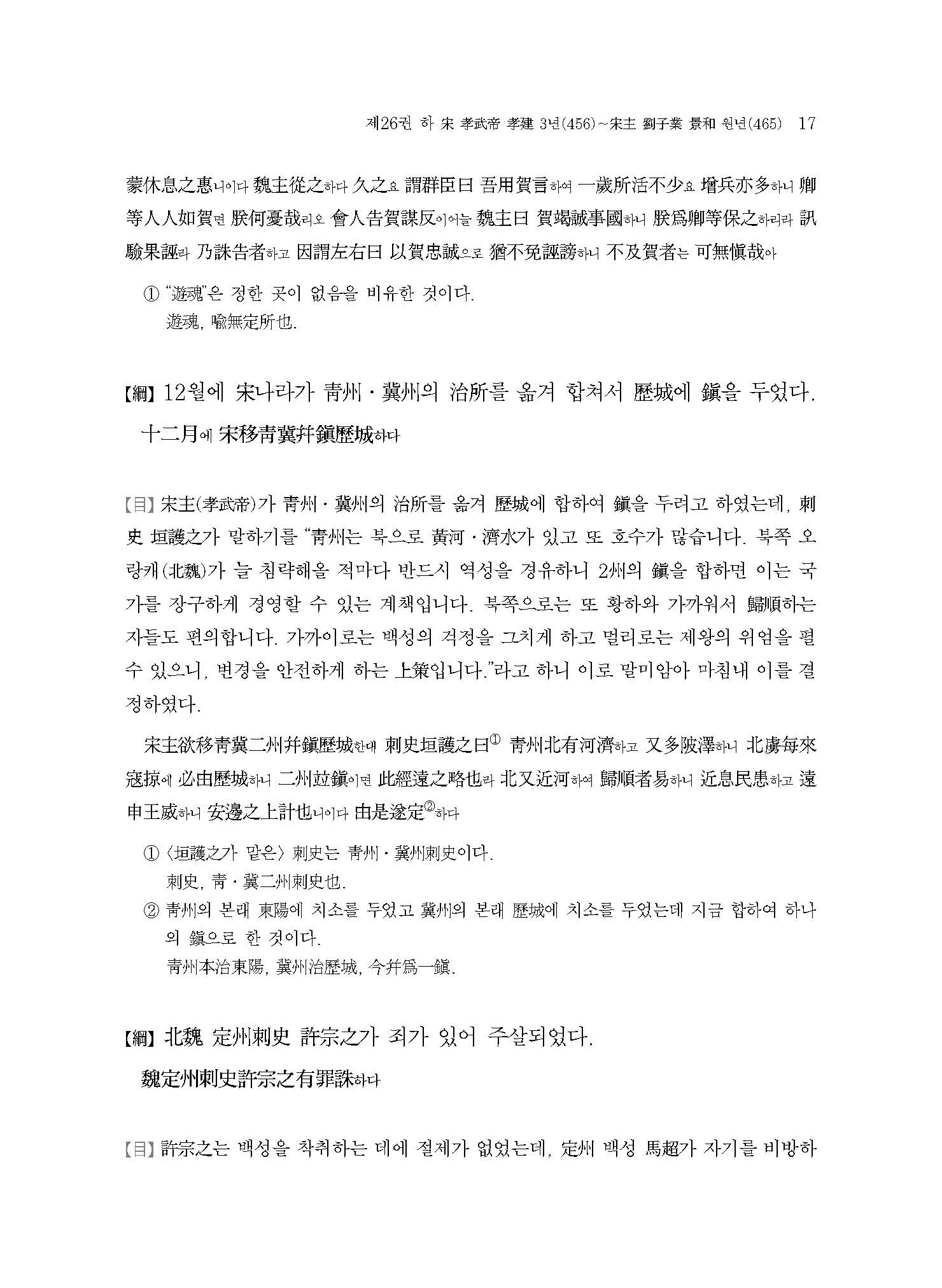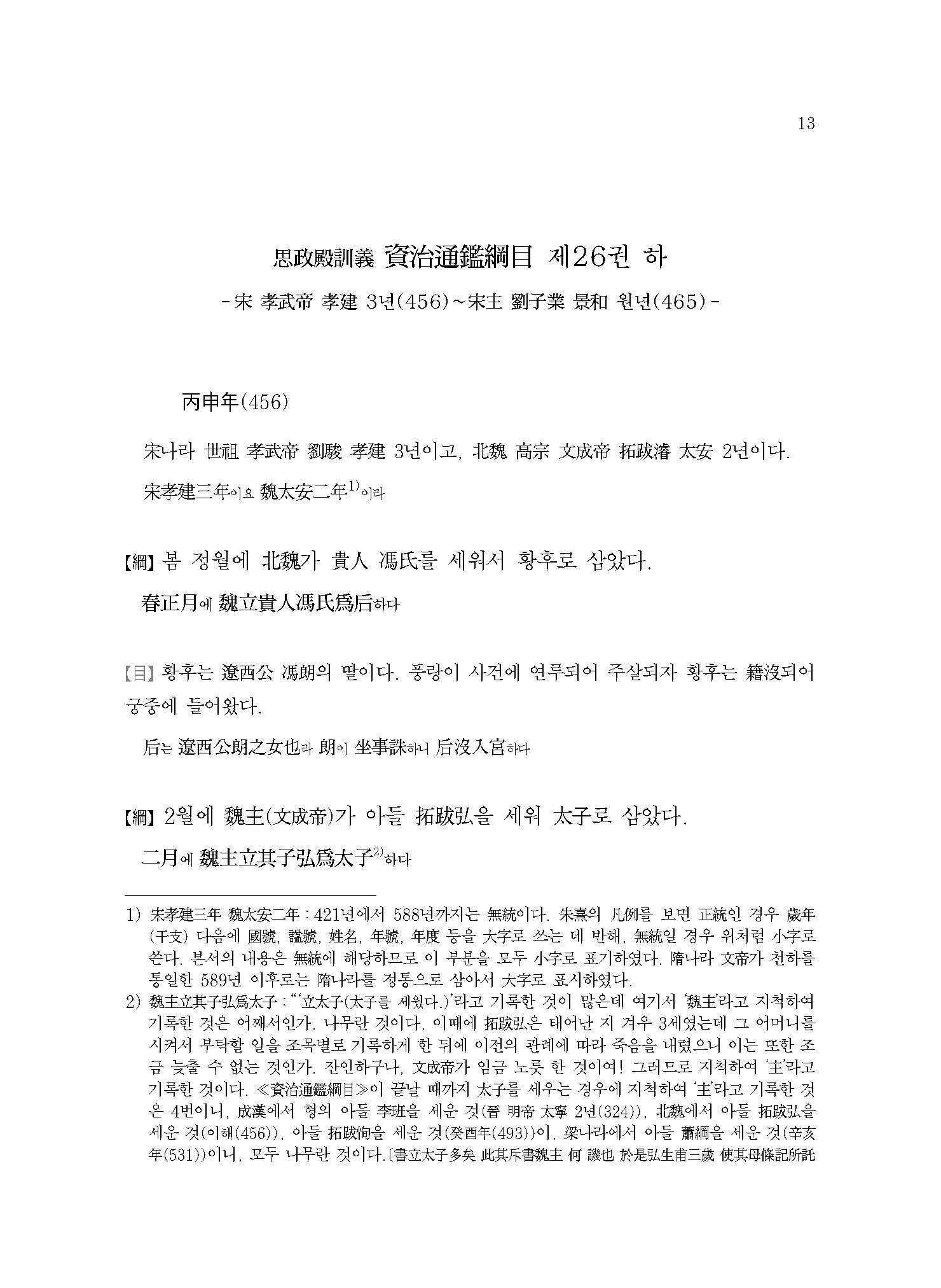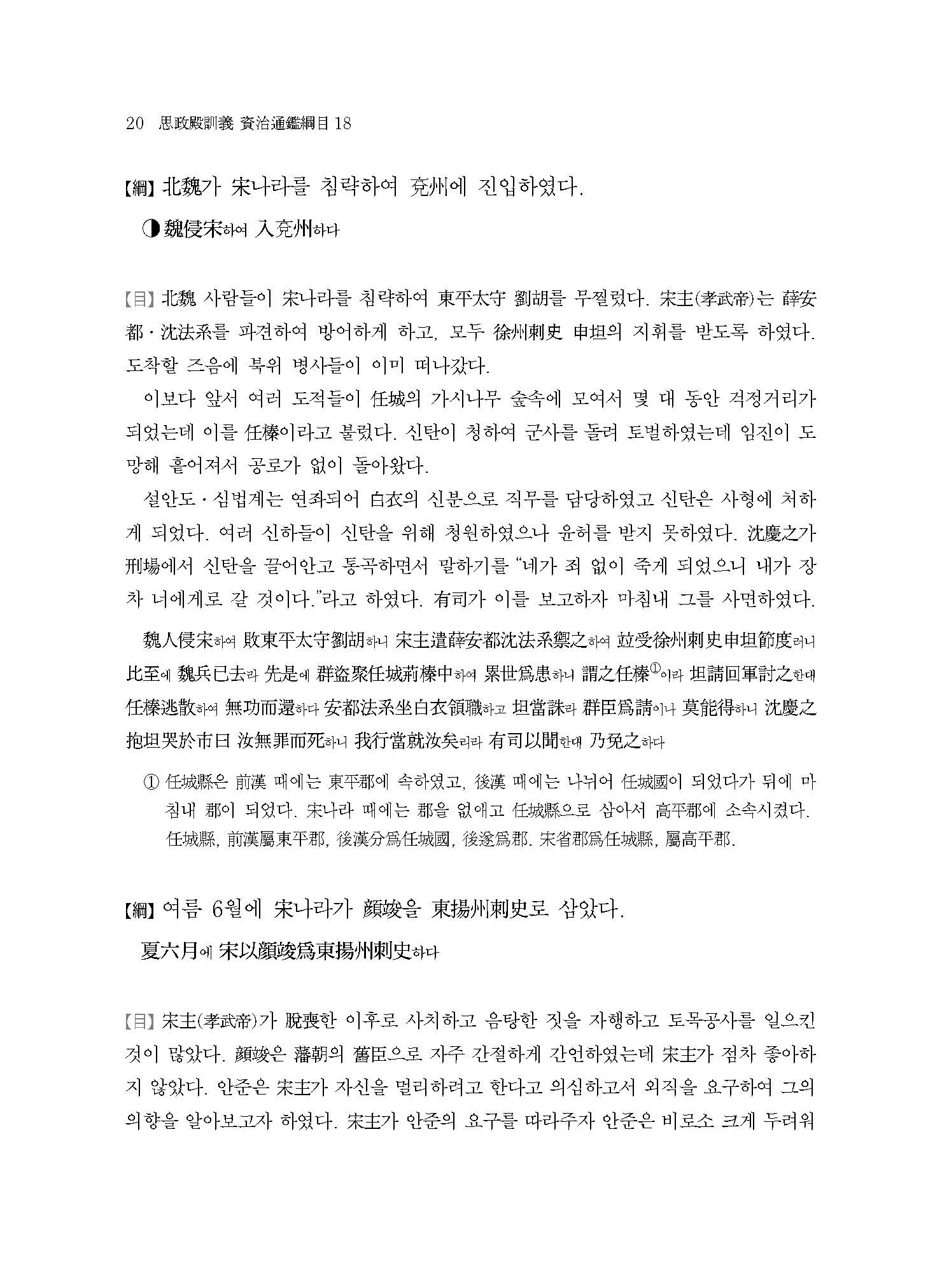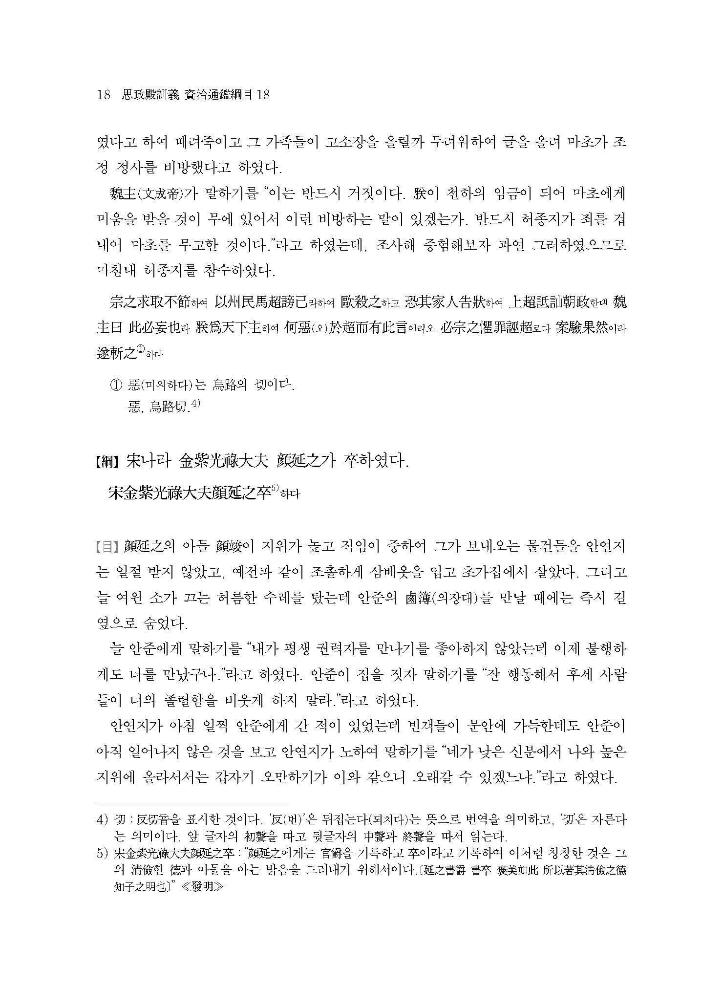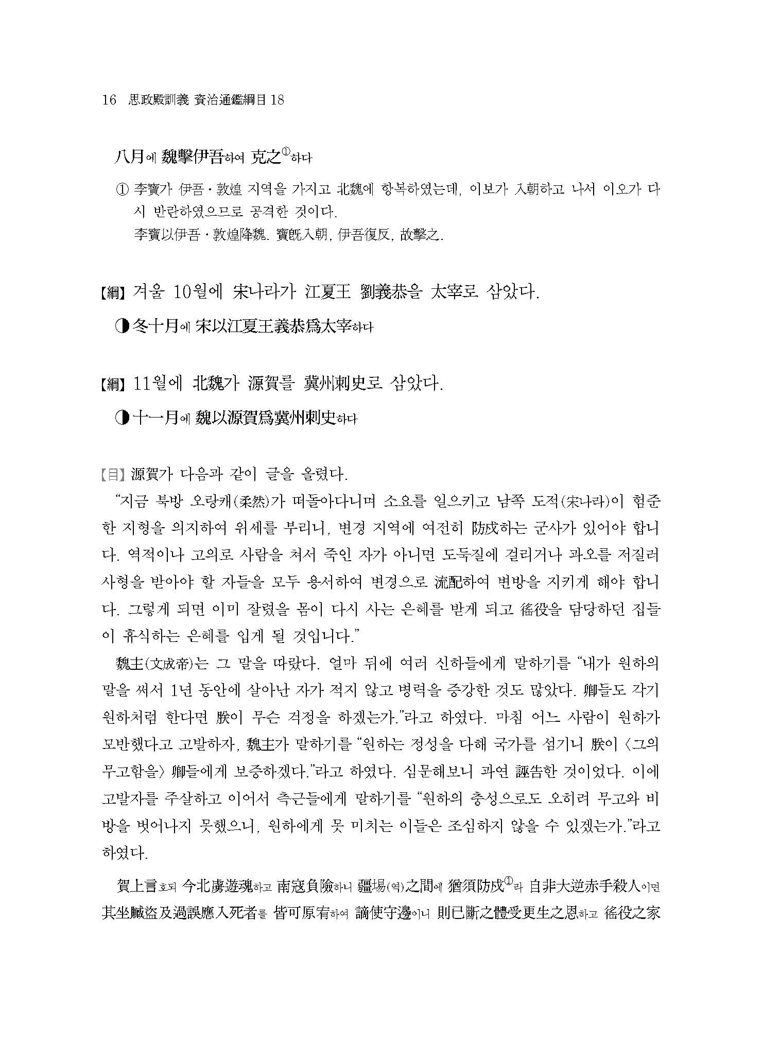 ≪사정전훈의 자치통감강목18≫은 남북조南北朝 전반부에 해당하는 이야기를 다루고 있다. 송宋나라와 북위北魏는 효무제孝武帝와 문성제文成帝의 정치에 의해 안정을 되찾았으나 효무제 사후 송나라는 황제와 제후왕 간의 갈등이 일어나거나 신하들의 모반으로 숙청과 반란이 연속되면서 정국이 매우 불안해져 일부 인사人士들은 북위로 도망가는 상황에 이르게 된다. 반대로 북위는 문성제 사후 풍태후馮太后가 정권을 장악하여 장기간 정치적 안정이 이어지면서 여러 개혁적 정책이 시행되어 전성기로 가는 발판을 마련하게 된다.