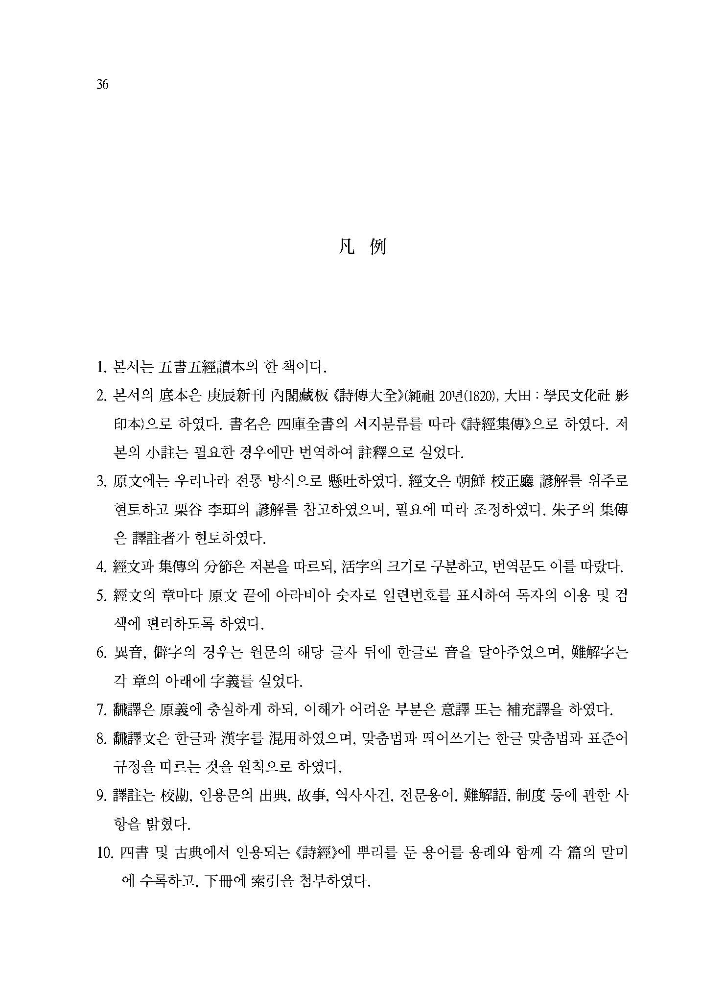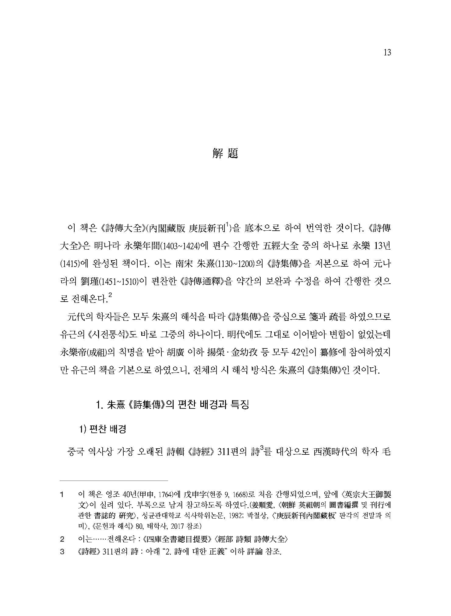 5. 詩에 대한 역대 연구서 64종의 내용과 특성 등을 간결하게 소개한 <四庫全書簡明目錄 詩類>를 번역 수록하여 漢代부터 淸代까지 시 연구에 대한 흐름을 파악하고, 역대 주석서에 대한 정보를 습득할 수 있도록 하였습니다.