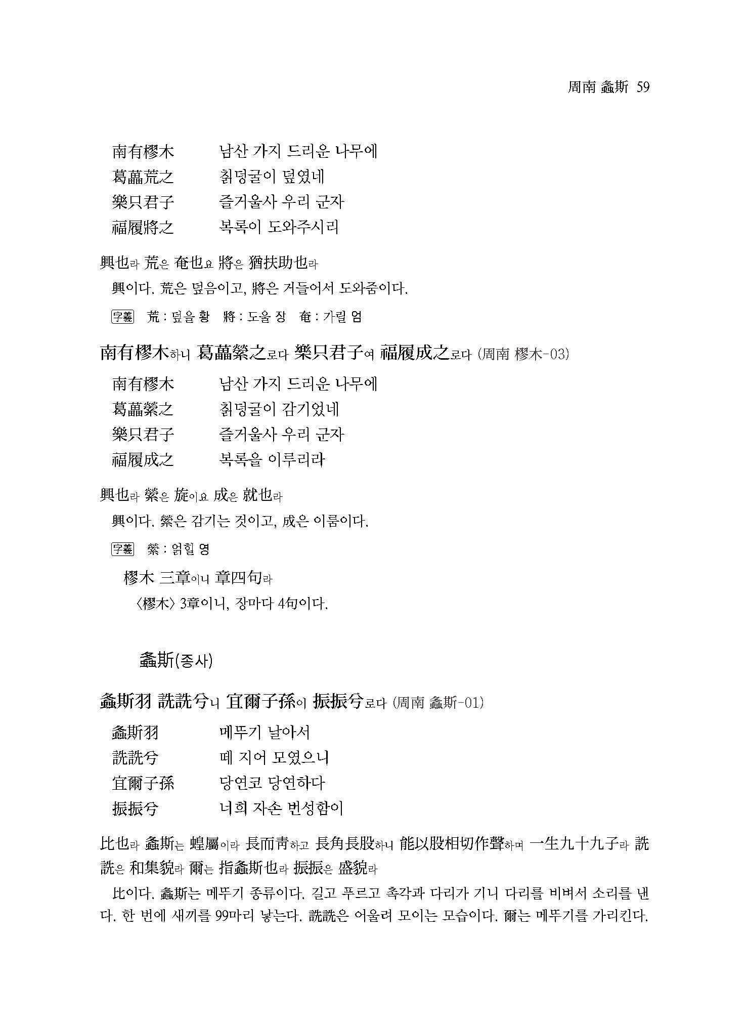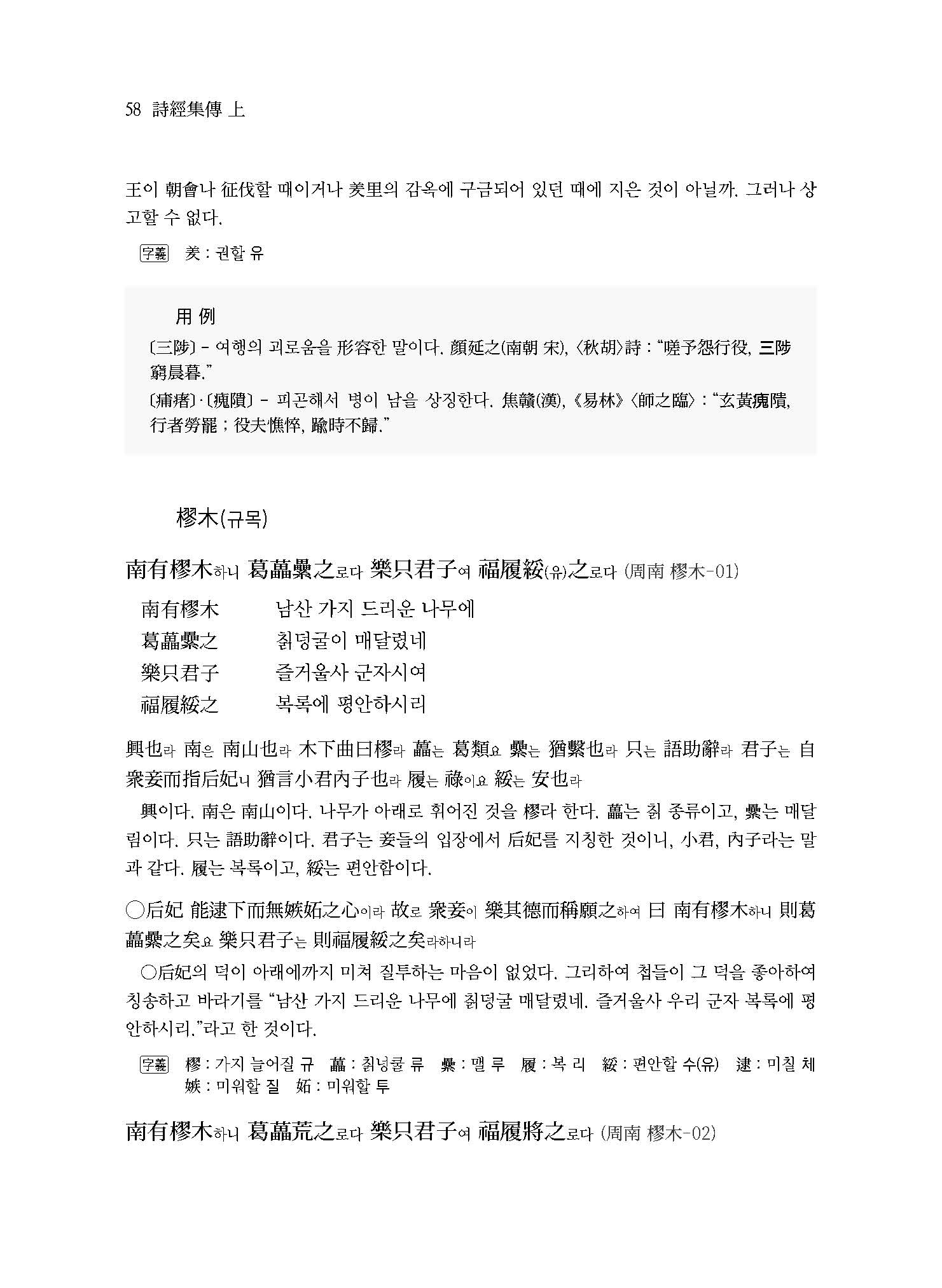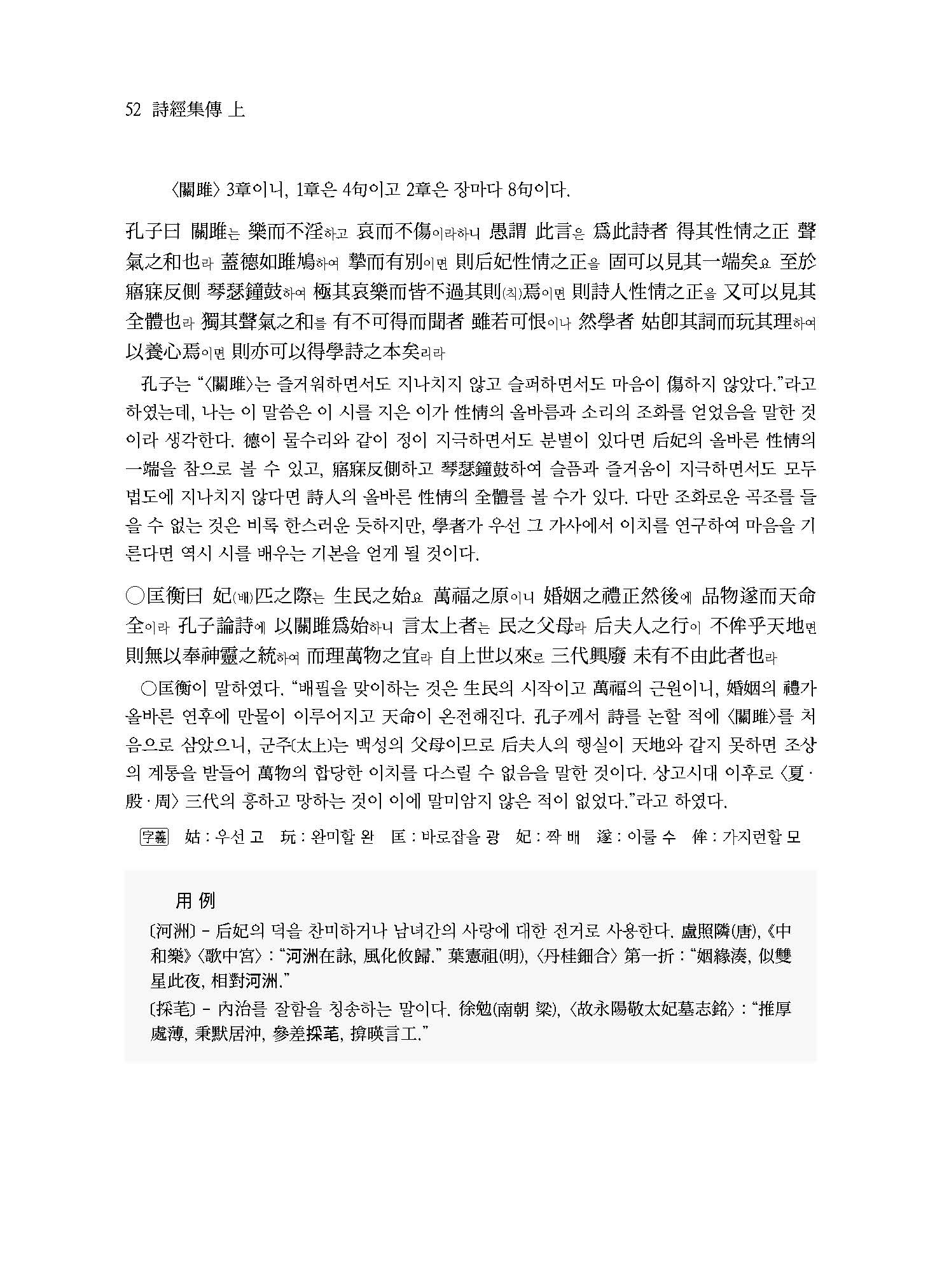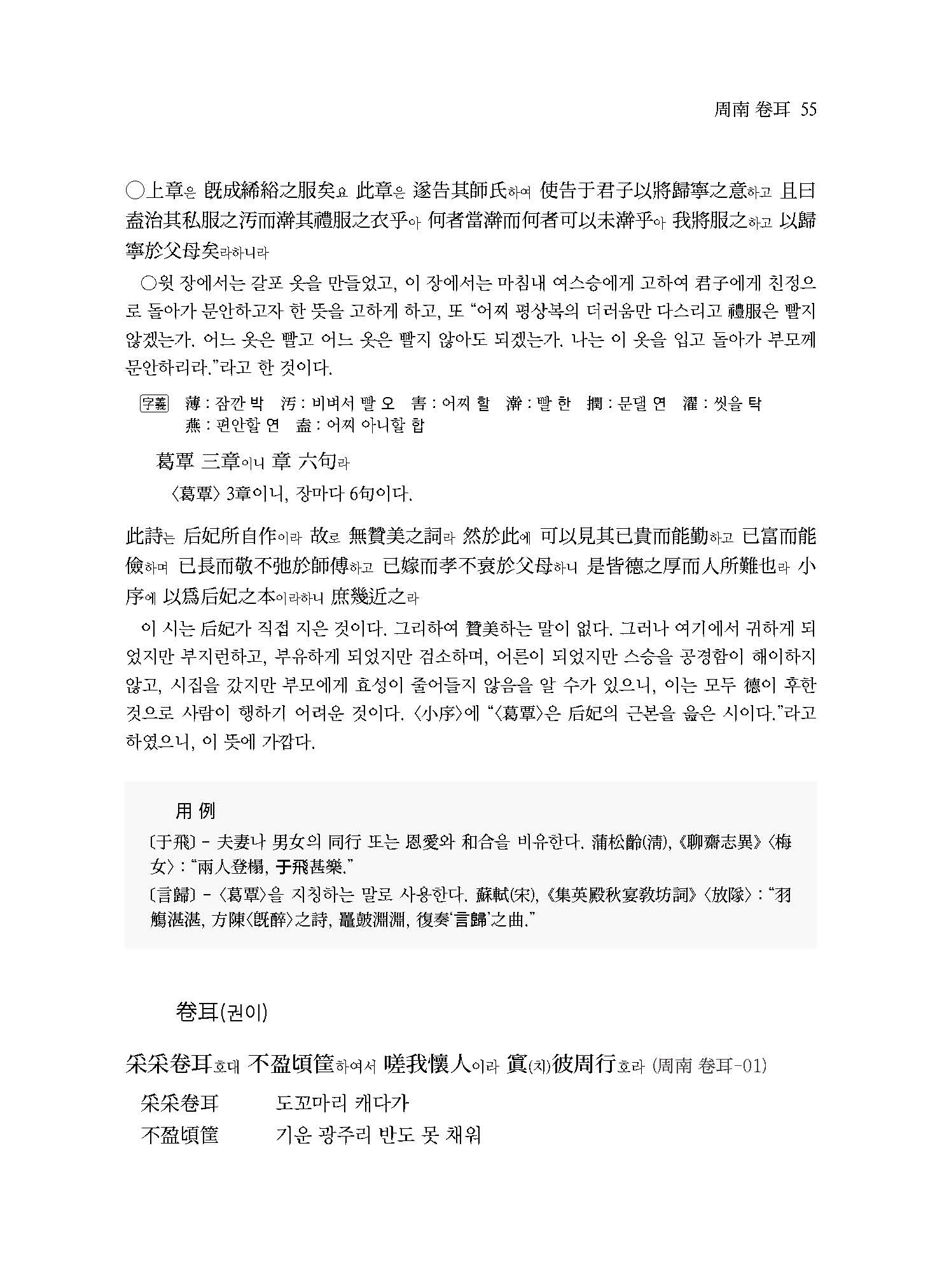 3. 각 詩篇의 끝에 四書 등 古典에서 자주 引用되는 用例와 사례를 添附하여 학습효과를 높이고, 또한 용례 총 660여 항목을 색인, 下冊에 붙여 독자가 편리하게 활용할 수 있도록 하였습니다.