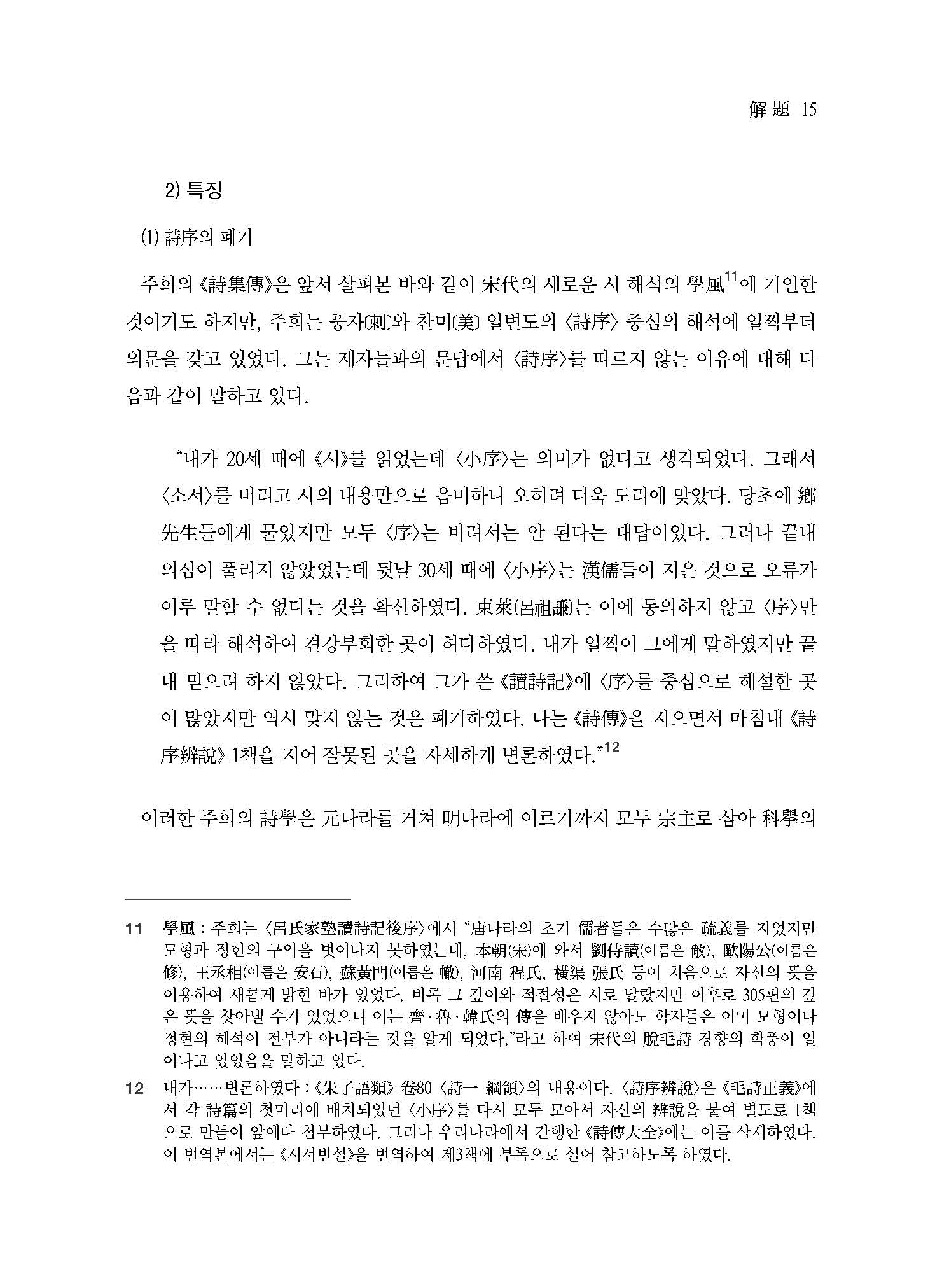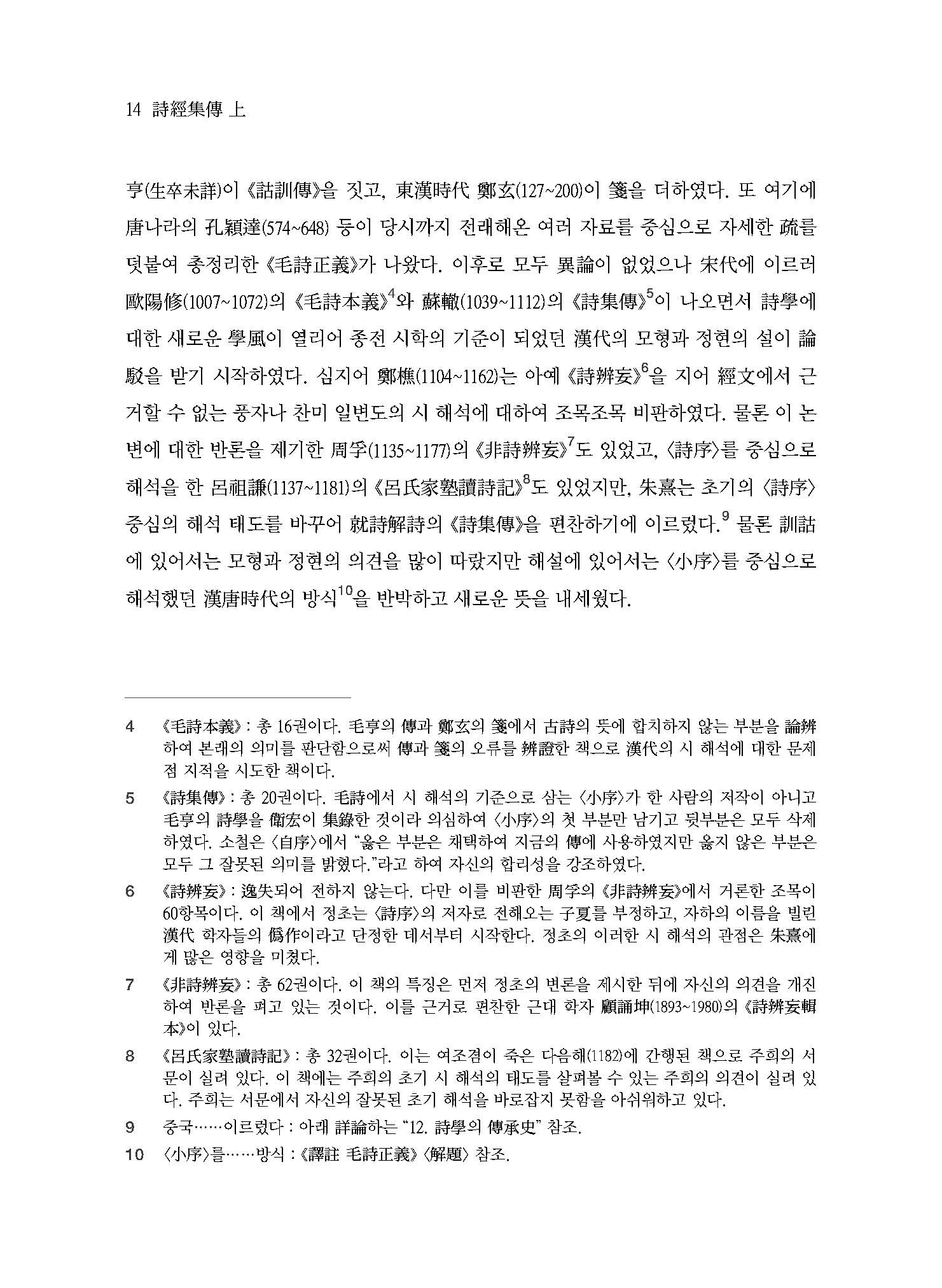 4. 宋代 朱熹는 唐나라 때에 완성된 <毛詩正義> 이후 官學化한 시 해석을 비판하며 <詩集傳>을 지었습니다. 그러나 <시집전>만으로는 주희의 시 해석에 대한 내면을 살펴보기 어려운 것이 사실입니다. 본 <시경집전>은 주희의 <모시정의> 비판과 새로운 시 해석의 내면을 오롯이 살펴볼 수 있는 주희의 <詩序辨說>을 국내에서 처음으로 번역 소개하였습니다. <시서변설>은 제목에서 알 수 있듯이 <시서>의 문제점을 논박하는 것이 주된 내용으로 <시서>에 대한 주희의 견해가 집약되어 있습니다. <모시정의>를 비판하고 <시집전>을 지은 이유와 주희의 詩經觀을 이해하기 위해서는 반드시 참고해야 하는 매우 중요한 자료로 <시경집전>의 하책에 부록하였습니다.