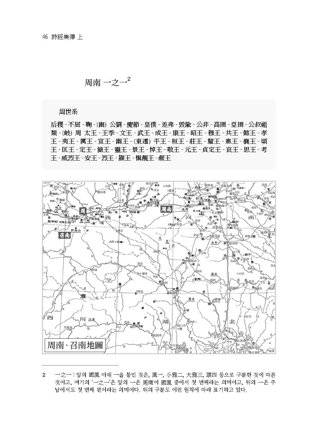 2. 物名의 이해를 돕기 위하여 <三禮圖>, <五經圖彙>, <詩名多識> 등 기존의 연구성과를 풍부하게 활용하여 圖版을 수록하였습니다. 또 歷史 背景과 地理의 이해를 돕기 위하여 각 國風과 魯頌의 앞에 ≪中國歷史地圖集≫을 바탕으로 해당 내용에 맞게 수정하여 地圖를 수록하였으며, 각 나라의 王世系를 함께 수록하여 시의 저작 왕대에 대한 이해에 도움이 되도록 하였습니다.