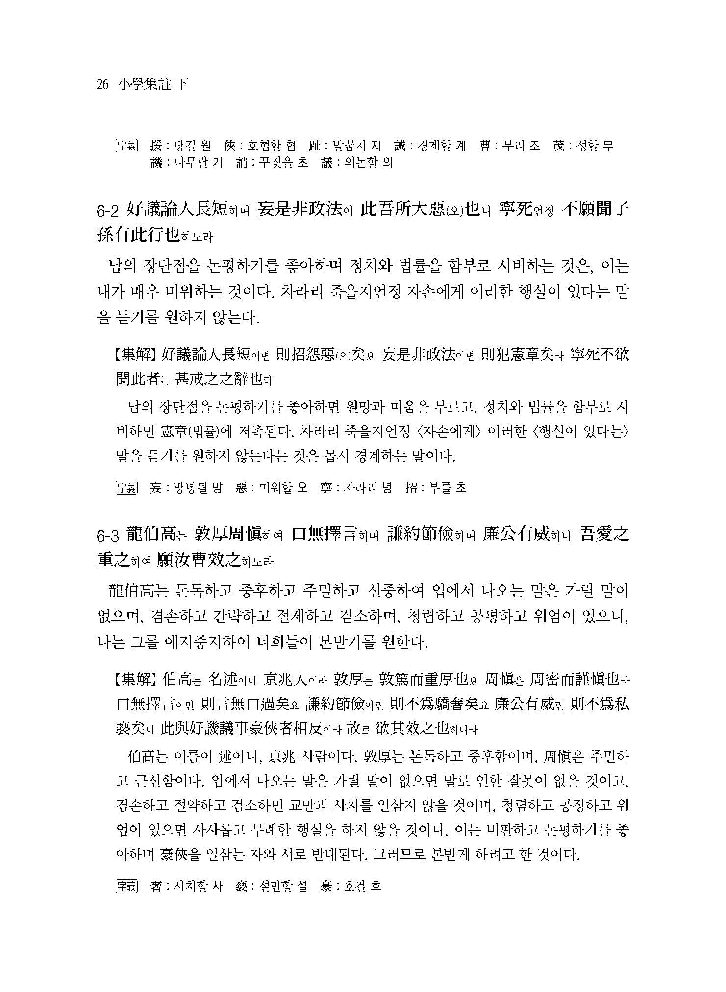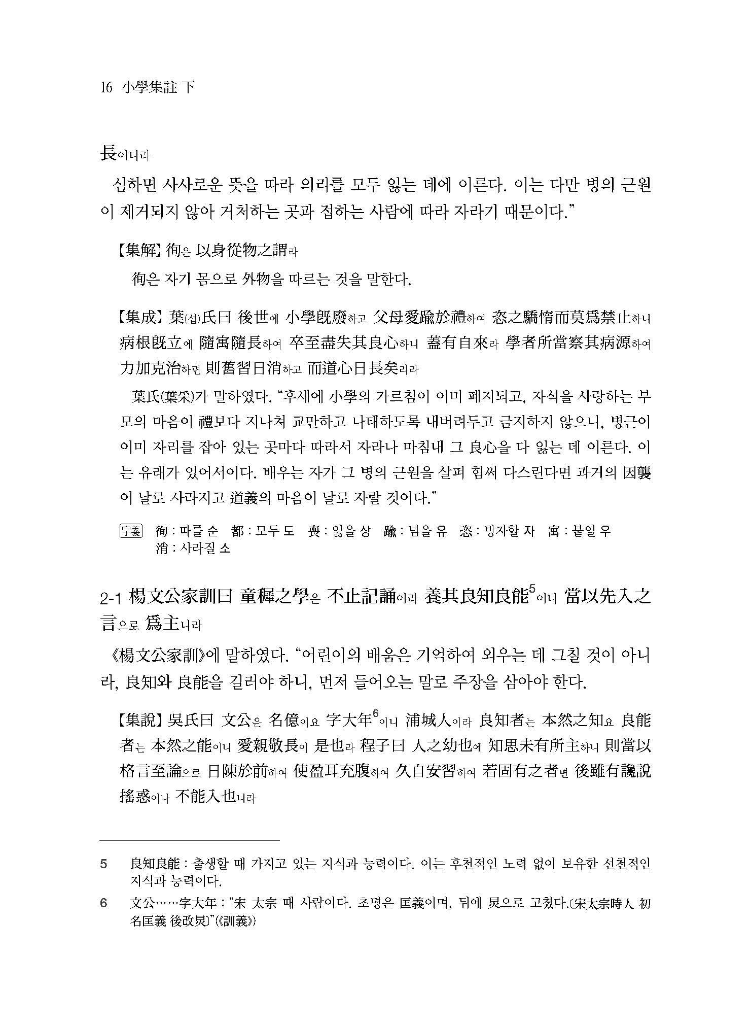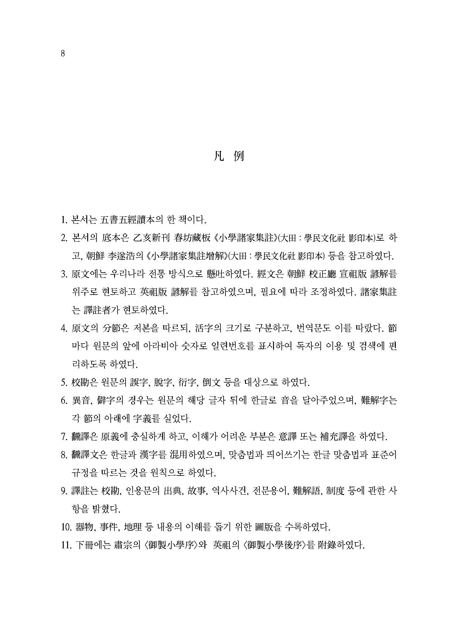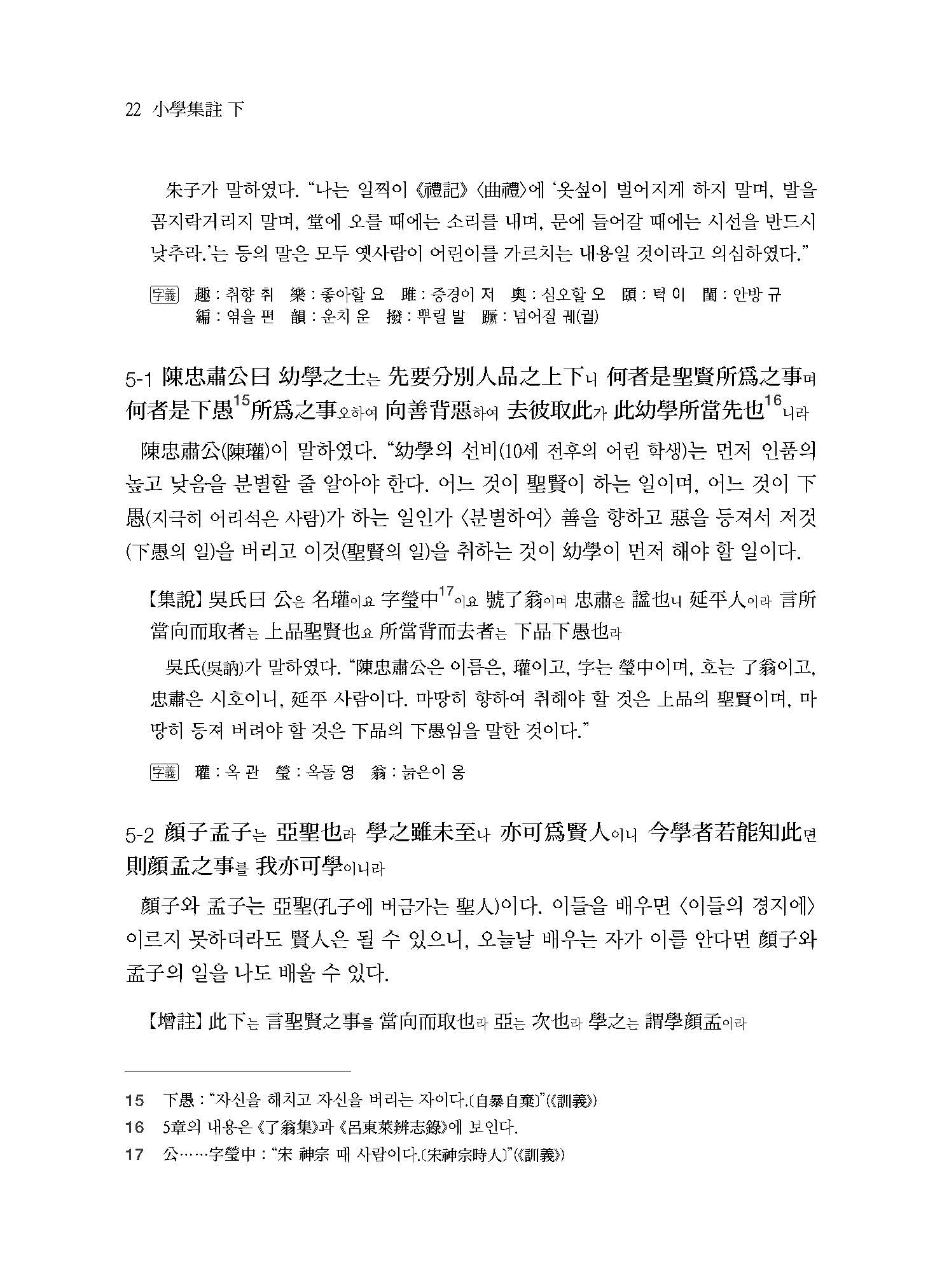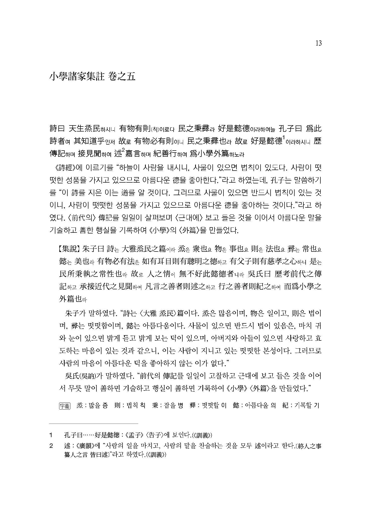 이를 해결하기 위해 2008년 21세기판 동양고전번역의 표준을 제시할 수 있는 새로운 총서를 기획하였다. 이것이 바로 ‘오서오경독본’ 시리즈다. 오서는 ≪대학大學≫, ≪논어論語≫, ≪맹자孟子≫, ≪중용中庸≫, ≪소학小學≫을, 오경은 ≪시경詩經≫, ≪서경書經≫, ≪주역周易≫, ≪예기禮記≫, ≪춘추春秋≫를 가리킨다. 오서오경은 유학儒學과 동아시아의 사회와 문화를 이해하기 위해서는 반드시 살펴보아야 하는 고전古典이다. 본회에서는 치밀한 준비와 연구를 거쳐 ≪논어집주≫, ≪대학 중용집주≫, ≪시경집전≫에 이어 ≪소학집주≫ 두 권을 ≪서경집전≫과 동시에 세상에 내놓게 되었다.