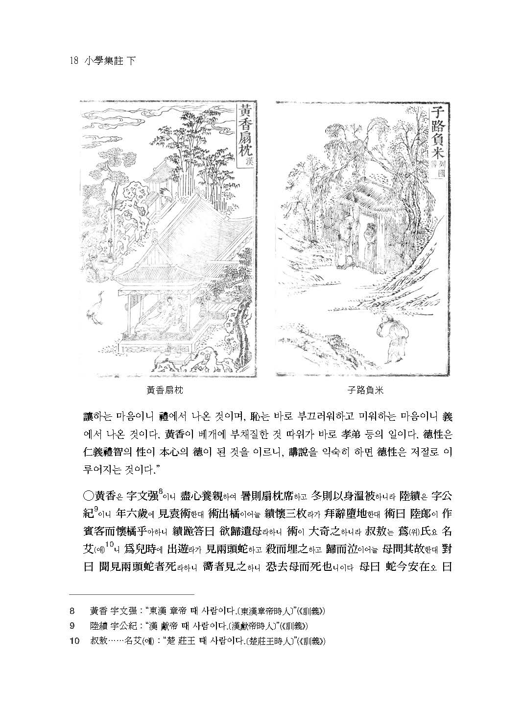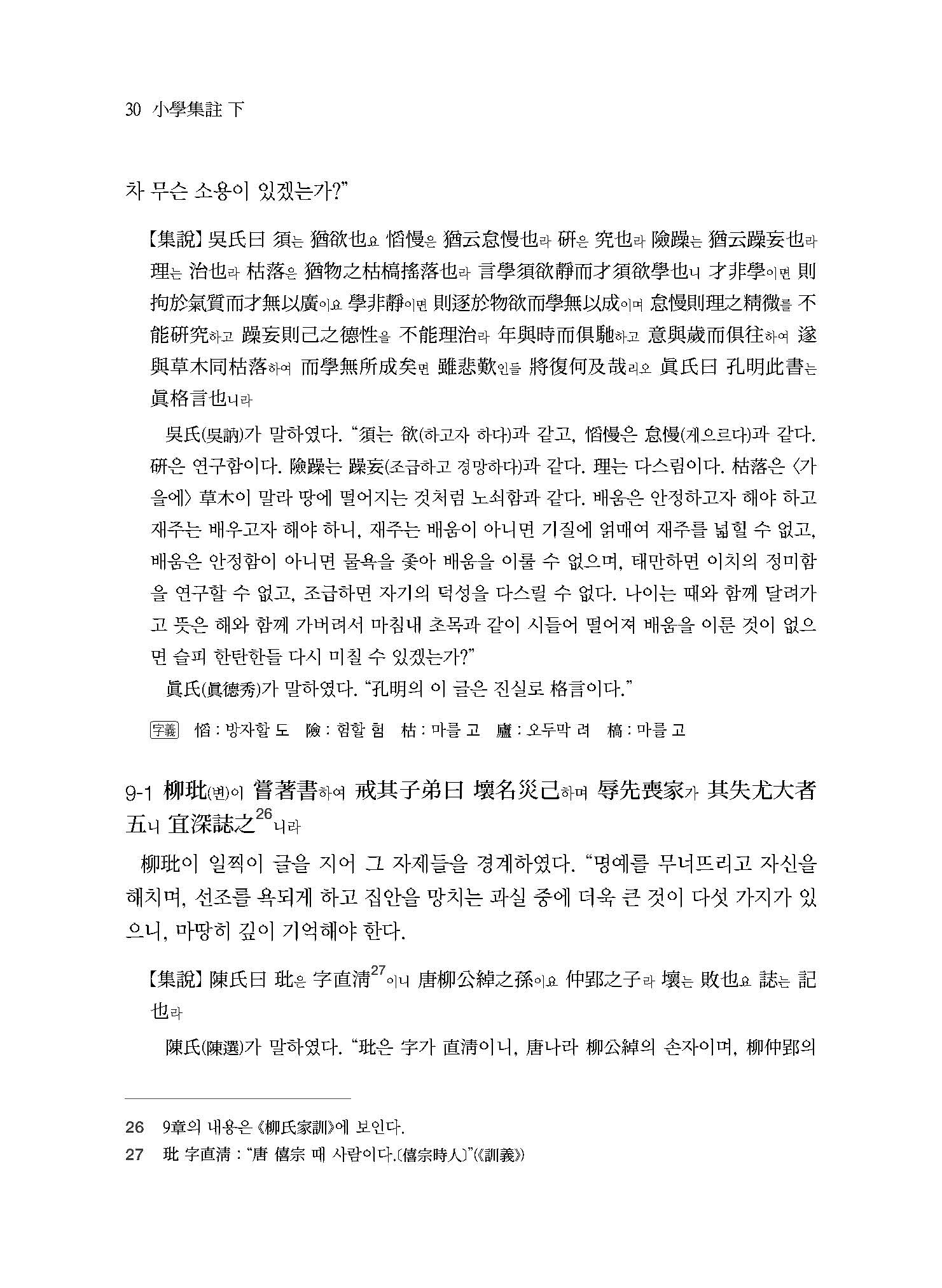조선시대에는 《소학》을 읽지 않은 선비가 없었다.《소학》으로 학문의 기초를 닦은 학자, 문인은 시문 등에 그 글을 많이 인용했다. 《소학》의 각 장은 각각 원전을 인용한 것이지만, 선비들은 그 문장을 원전에서보다도 우선 《소학》에서 습득했다. 그것은 자연히 광범하게 작문 등에 응용되었다. 그 결과 《소학》에 채록된 내용은 최고의 보편성을 획득하게 되었다. 따라서 《소학》은 학문을 하는 데에 으뜸가는 기본서이다. 《소학》이 단독 저술로서 학문에 파급되는 비중은 매우 크며, 교양서로서도 그 가치는 높다.
