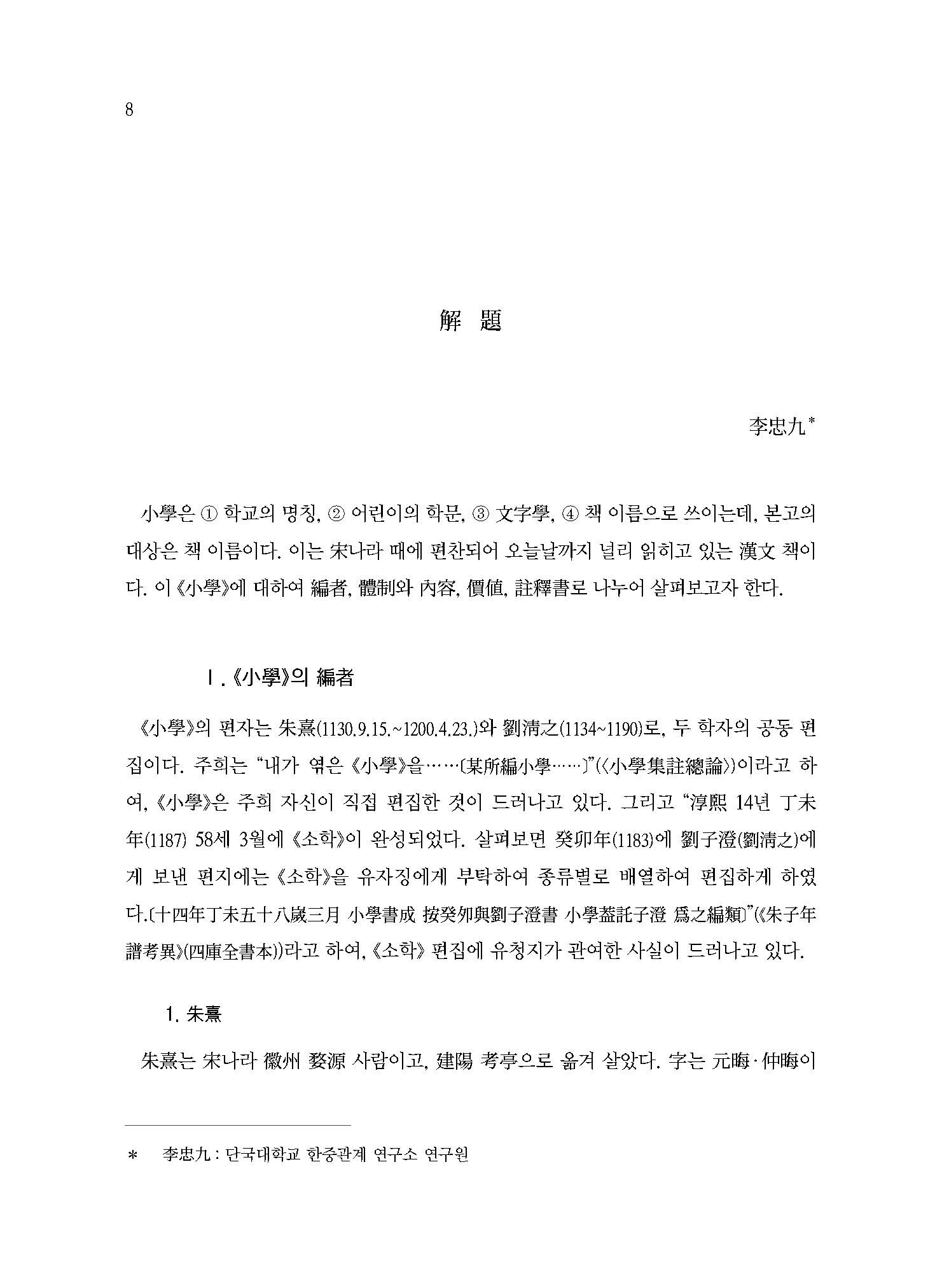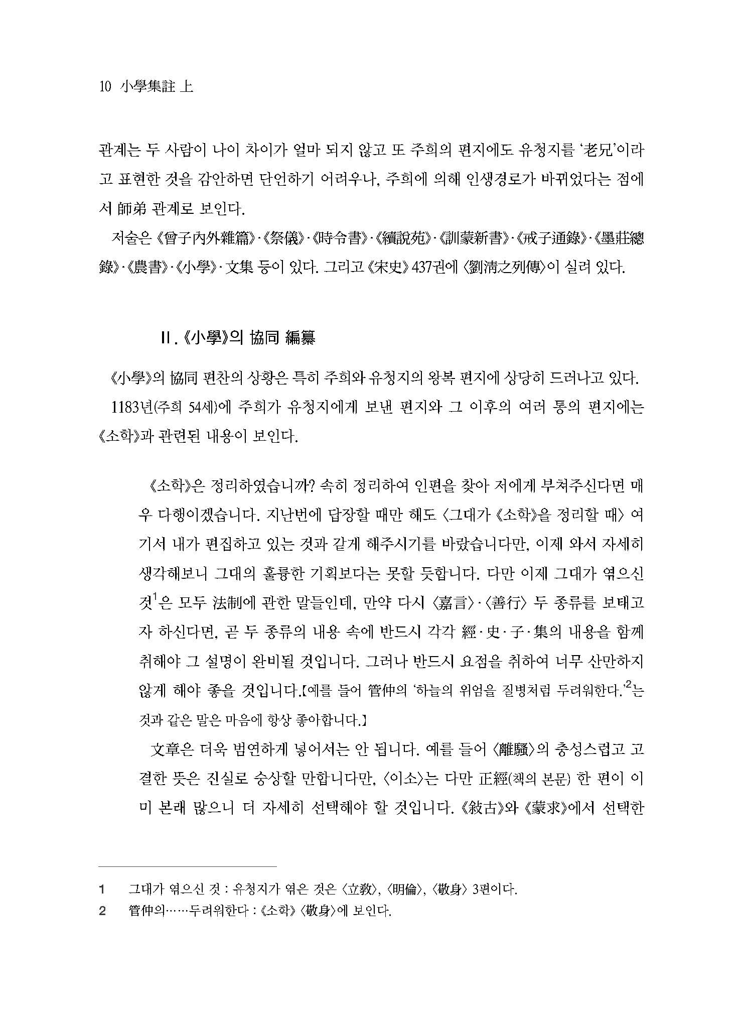 《소학小學》의 편자는 주희朱熹(1130~1200)와 유청지劉淸之(1134~1190)로, 두 학자의 공동 편집이다. 《소학》 편찬은 5년이 소요되었는데, 주편자는 주희로서 그 전체적인 일을 맡아 했고, 유청지는 주희를 도와 기획과 원고 정리를 했다고 할 수 있다. 처음에는 상편(내편)만 기획되었다가 뒤에 가언·선행의 하편(외편)이 이룩되었다. 뒤에 원고가 전체적으로 재정리되었는데, 그 일은 원고의 앞뒤를 변경하고, 문장·시부를 제거하고, 고금의 사례 및 송대 주돈이 등 선철들의 사적을 증보하고, <소학서제小學書題>·<소학제사小學題辭>를 책머리에 만들어 넣은 것이다.