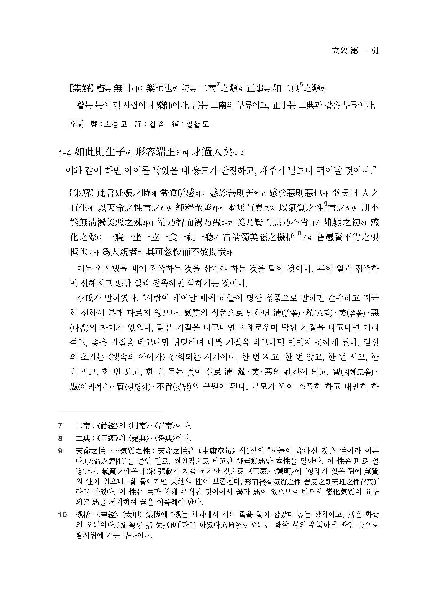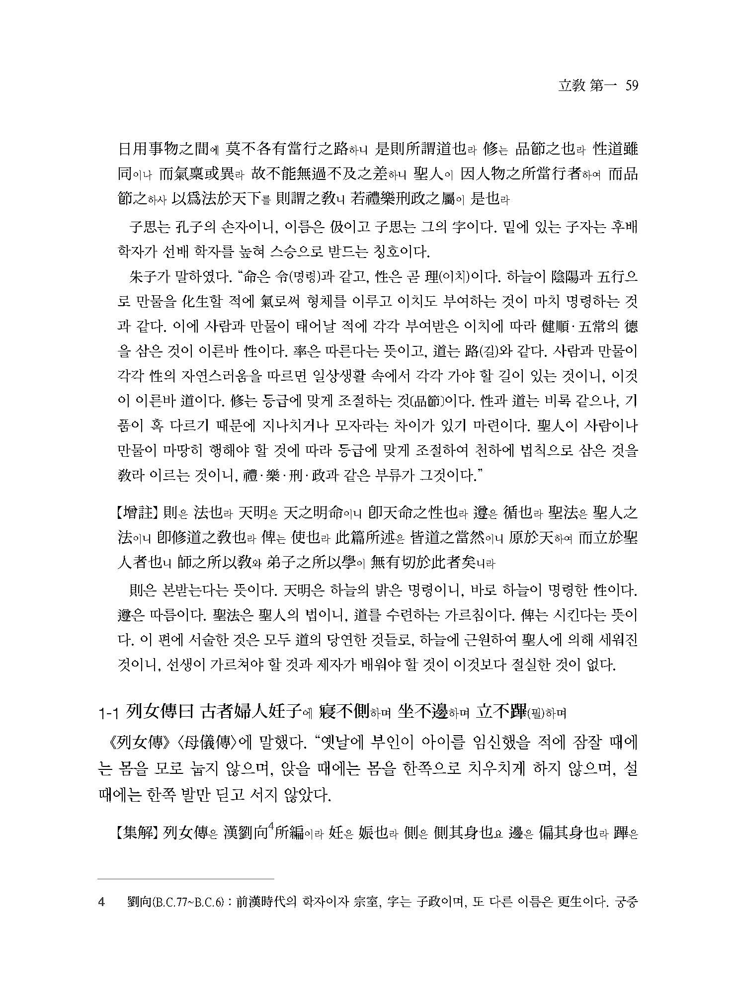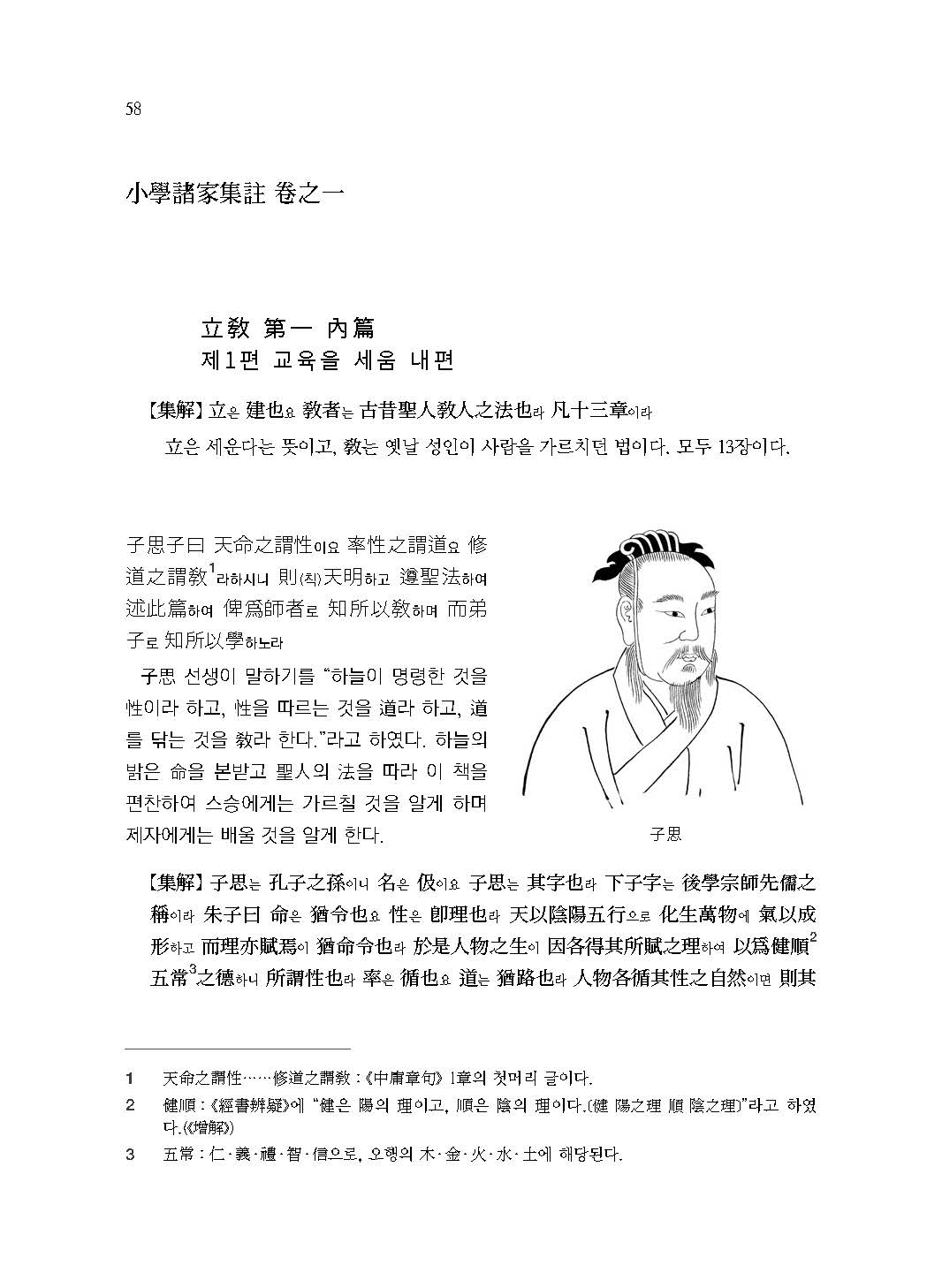 子思 선생이 말하기를 “하늘이 명령한 것을 性이라 하고, 性을 따르는 것을 道라 하고, 道를 닦는 것을 敎라 한다.”라고 하였다. 하늘의 밝은 命을 본받고 聖人의 法을 따라 이 책을 편찬하여 스승에게는 가르칠 것을 알게 하며 제자에게는 배울 것을 알게 한다. -(<立敎>)