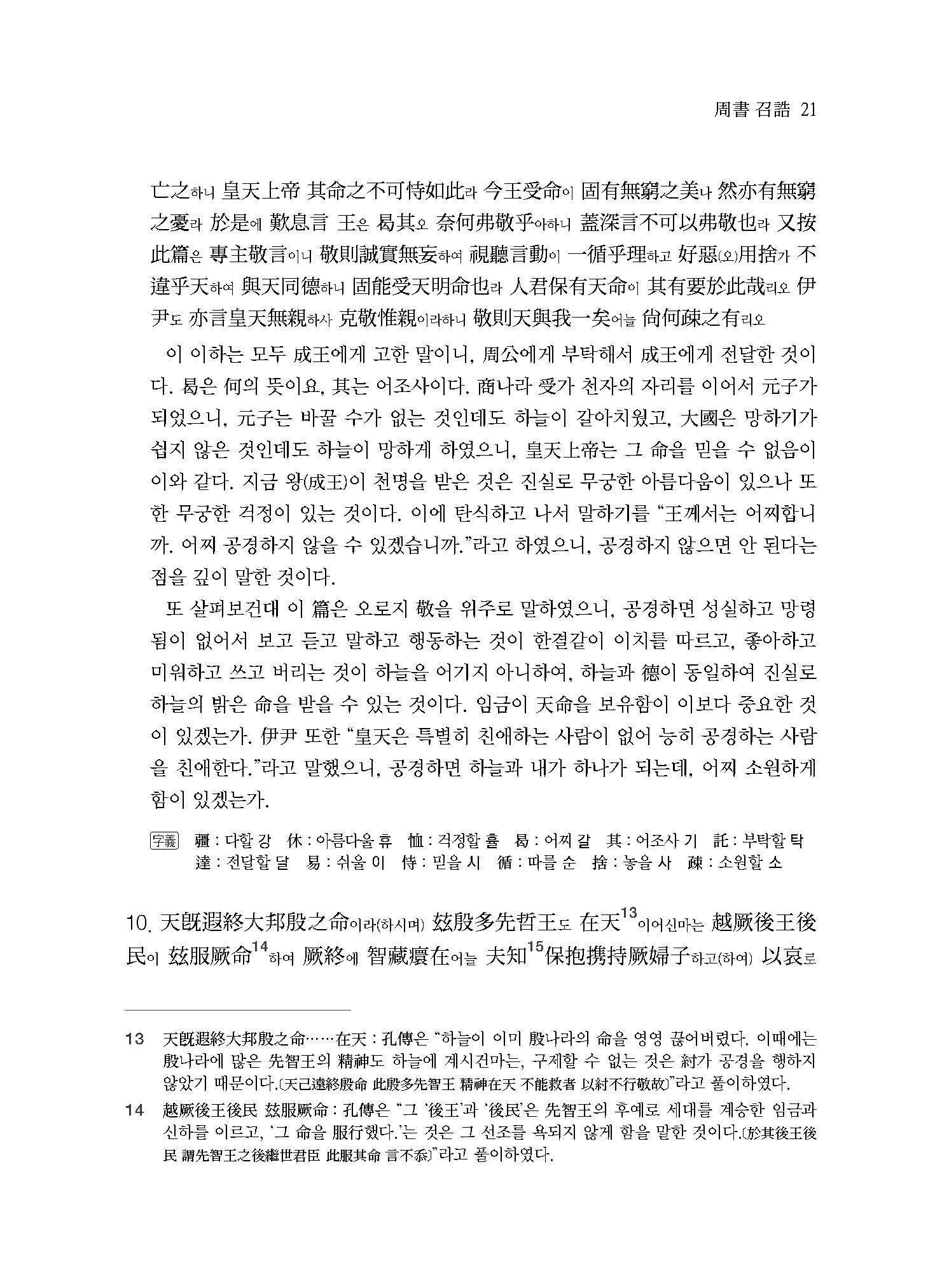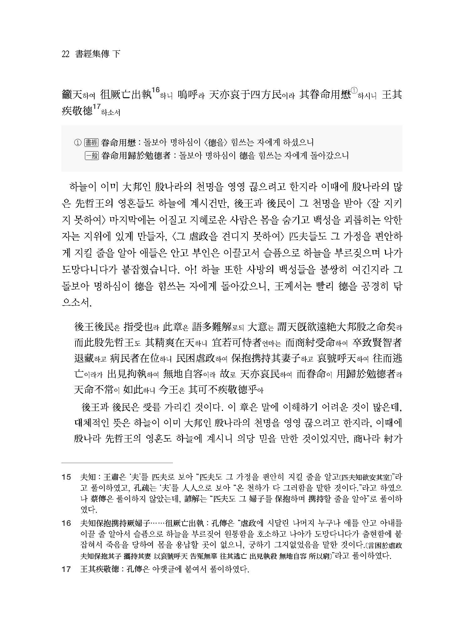 商나라 王의 죄를 <치러 갈 때에> 皇天과 后土와 지나가는 곳의 名山과 大川에 고하였다. “道를 가진 분의 曾孫인 周나라 王 發은 장차 商나라를 크게 바로잡으려고 하니, 지금 商나라 王인 受가 無道하여 하늘이 낸 물건을 함부로 버리며, 백성들을 해치고 학대하며, 천하에 도망친 자들의 주인이 되어 마치 못에 물고기가 모이듯 숲에 짐승이 모이듯 하고 있습니다. 나 小子는 이미 仁人을 얻었기 때문에 감히 上帝를 경건히 받들어 어지럽히는 謀略을 못하게 막으니, 華夏와 蠻貊이 따르지 않는 자가 없습니다. -(<武成>)