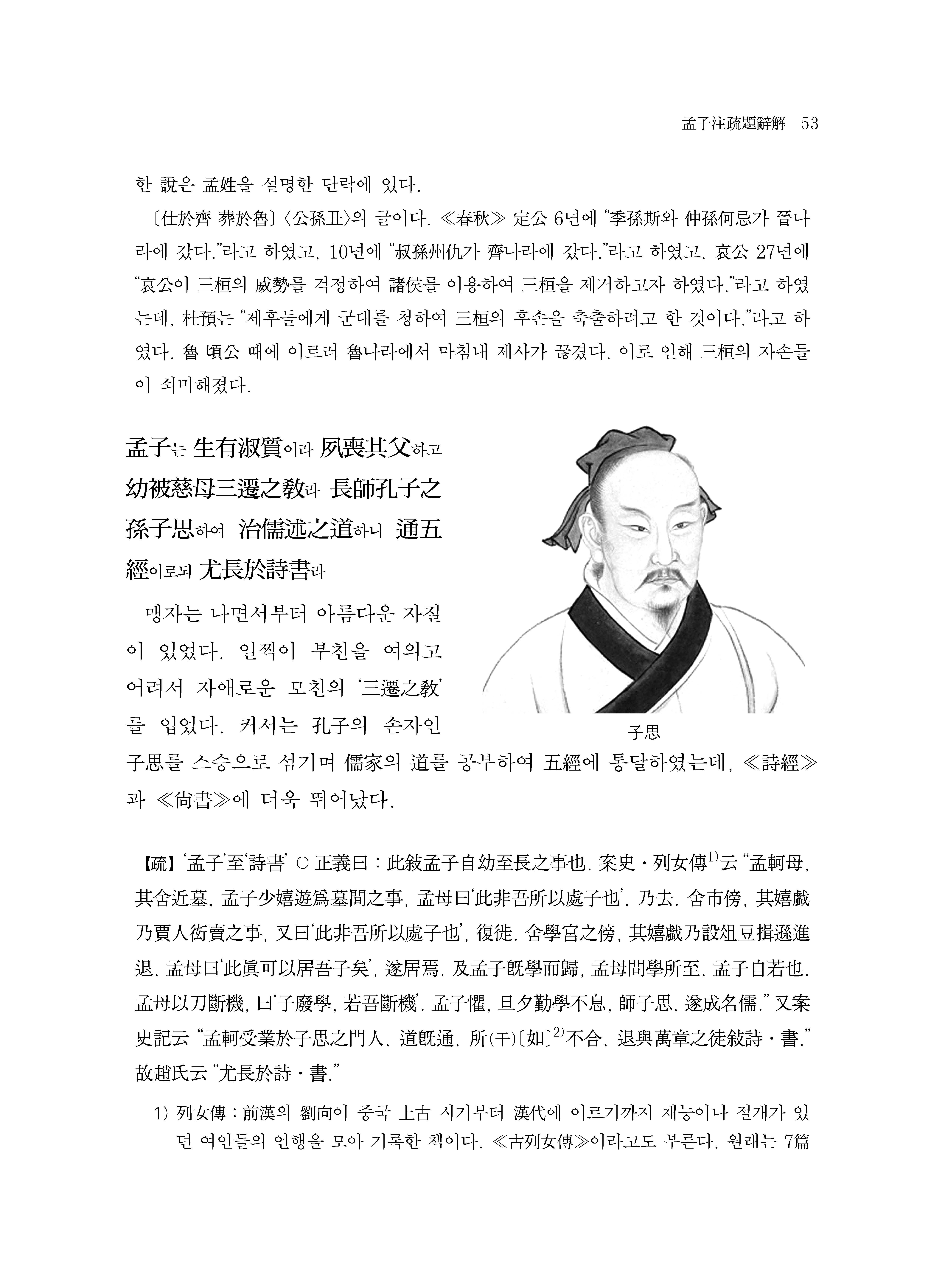 맹자는 공자의 손자인 자사의 문인에게 배우고, 공자의 사상을 계승 발전시켜 후대에 아성(亞聖)으로 추앙을 받았다. ≪맹자≫는 본래 <양혜왕(梁惠王)>, <공손추(公孫丑)>, <등문공(?文公)>, <이루(離婁)>, <만장(萬章)>, <고자(告子)>, <진심(盡心)>의 7편으로 이루어졌다. 조기가 ≪맹자장구≫를 편찬하면서 각 편을 상하로 나누어 현재의 모습인 14편이 되었다. ≪맹자≫는 본래 ≪장자(莊子)≫, ≪순자(荀子)≫ 등과 같이 제자(諸子)로 분류된 책이었다. 이 책이 경서의 반열에 끼게 된 것은 남송 때 주희(朱熹)가 ≪논어(論語)≫, ≪맹자(孟子)≫, ≪대학(大學)≫, ≪중용(中庸)≫을 사서(四書)로 편정(編定)하면서부터이다. 이를 계기로 유가(儒家)를 대표하는 성인을 지칭할 때에 공자와 맹자를 병칭하게 되었다.