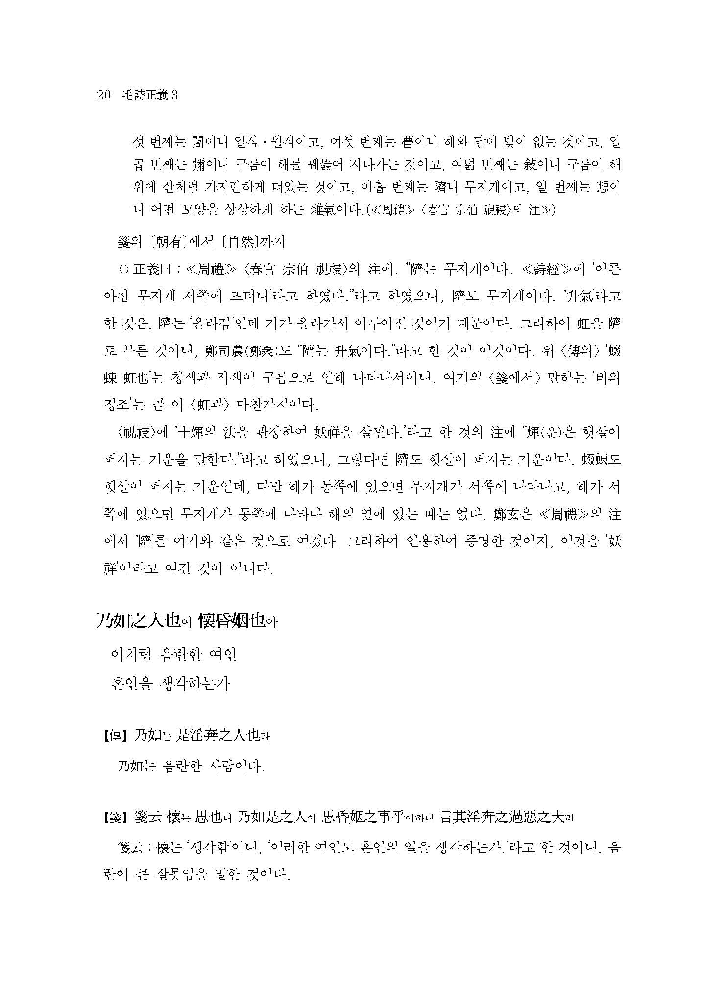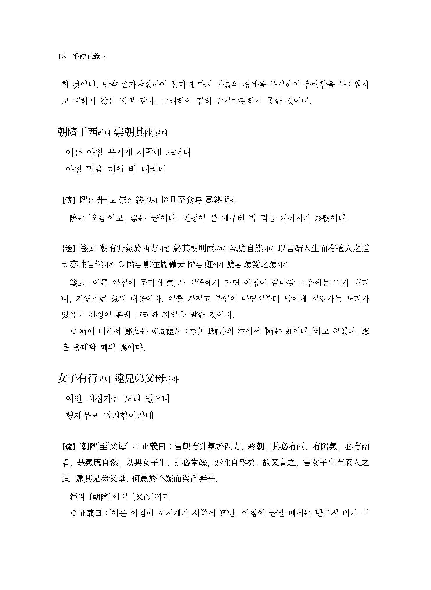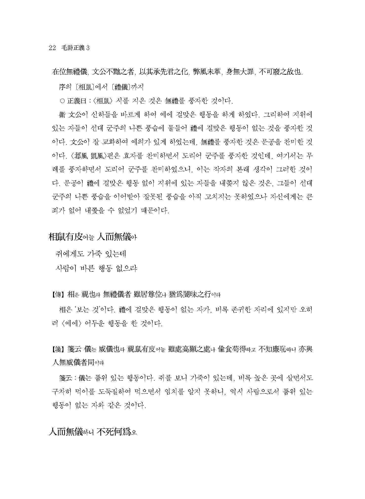 그러나 송대宋代 이후 주자朱子의 ≪시집전詩集傳≫이 유행하면서 우리나라의 시경학도 ≪시집전≫ 위주로 획일화되었던 것이 사실이다. 전통문화연구회에서 총 15책으로 완역 간행될 예정인 ≪모시정의≫는 모형과 정현, 그리고 공영달의 견해를 반영하여 ≪시경≫ 해석의 새로운 시각을 제시한다. 아울러 다양한 전적典籍과 주소注疏가 인용되어 있어 고전적古典籍 연구에 훌륭한 자료를 제공한다. ≪시경≫에 대한 다각적 접근은 바로 이 책에서 시작되어야 할 것이다.
