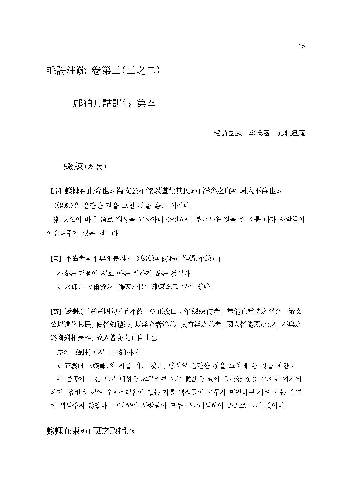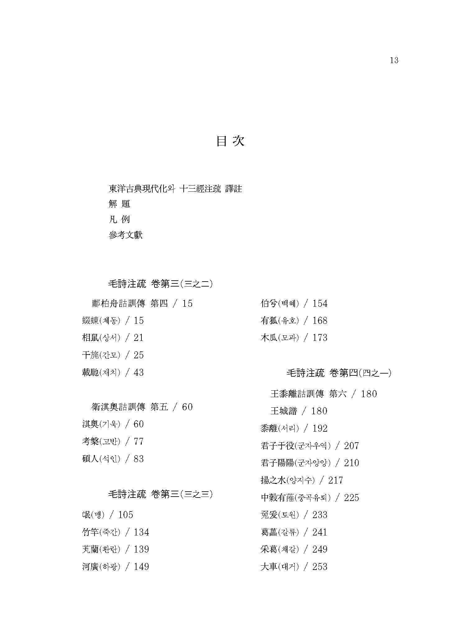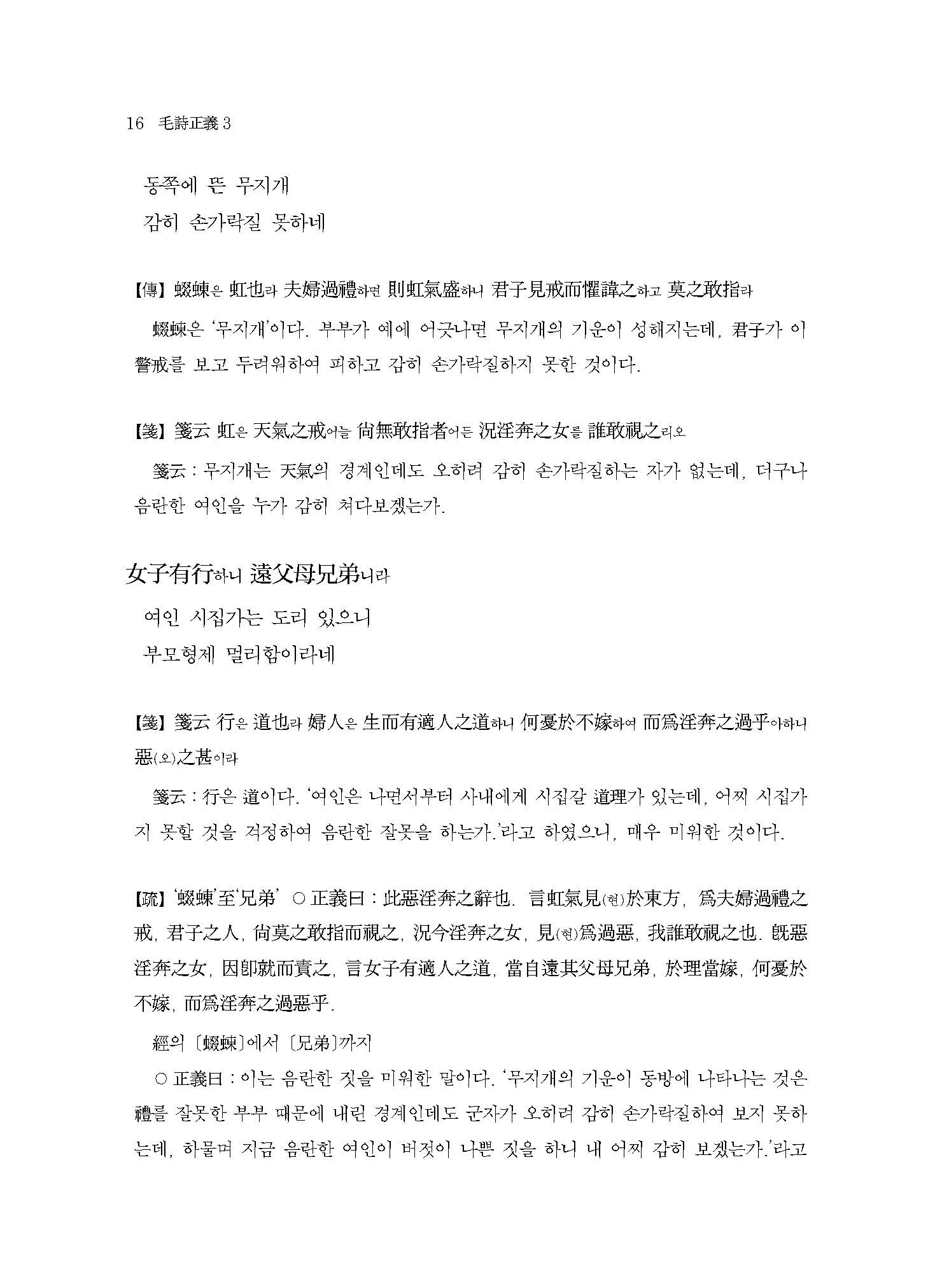 그러나 송대宋代 이후 주자朱子의 ≪시집전詩集傳≫이 유행하면서 우리나라의 시경학도 ≪시집전≫ 위주로 획일화되었던 것이 사실이다. 전통문화연구회에서 총 15책으로 완역 간행될 예정인 ≪모시정의≫는 모형과 정현, 그리고 공영달의 견해를 반영하여 ≪시경≫ 해석의 새로운 시각을 제시한다. 아울러 다양한 전적典籍과 주소注疏가 인용되어 있어 고전적古典籍 연구에 훌륭한 자료를 제공한다. ≪시경≫에 대한 다각적 접근은 바로 이 책에서 시작되어야 할 것이다.