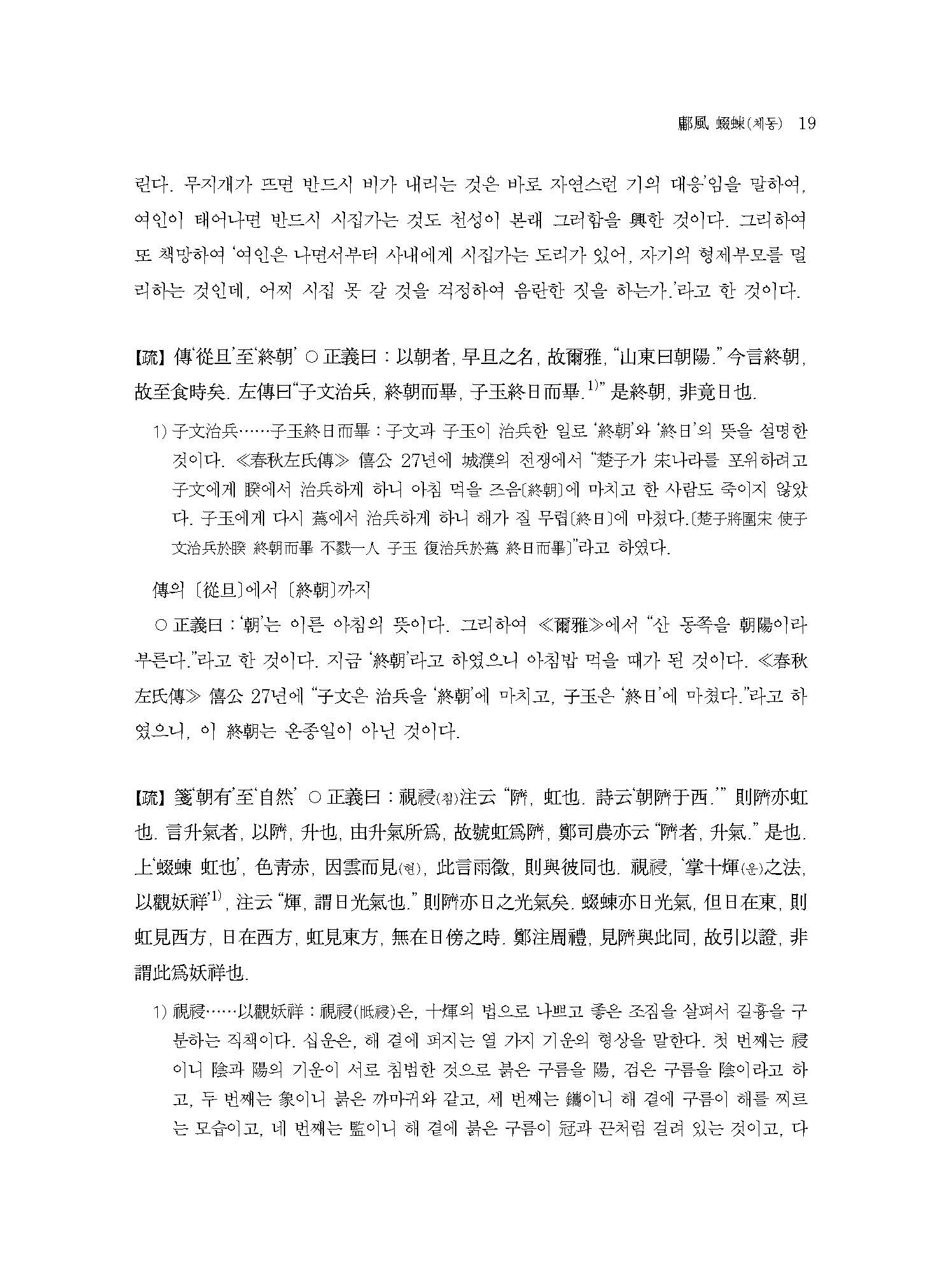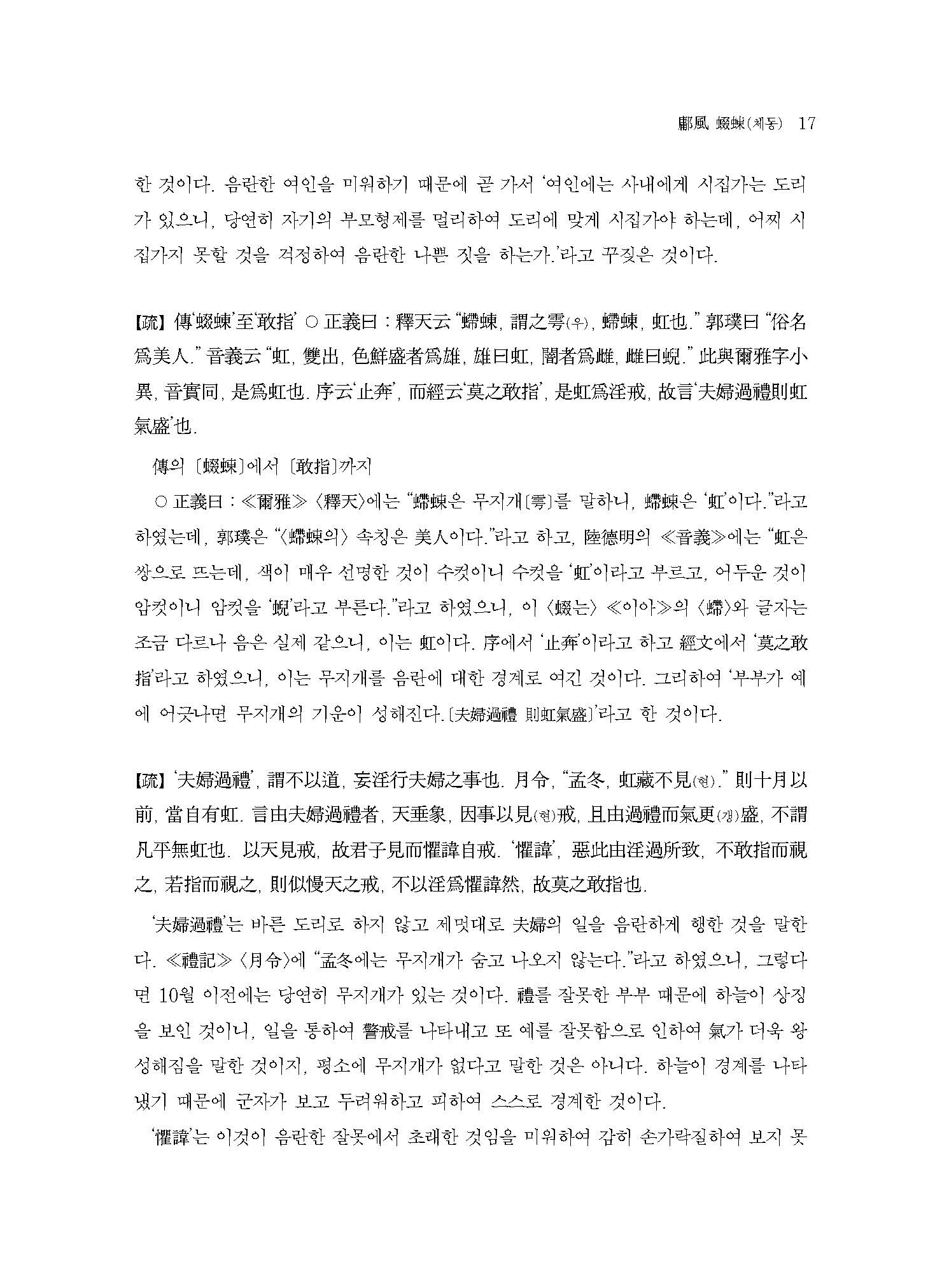 ≪이아爾雅≫ <석천釋天>에는 “체동??은 무지개[雩]를 말하니, 체동??은 ‘홍虹’이다.”라고 하였는데, 곽박郭璞은 “<체동??의> 속칭은 미인美人이다.”라고 하고, 육덕명陸德明의 ≪음의音義≫에는 “홍虹은 쌍으로 뜨는데, 색이 매우 선명한 것이 수컷이니 수컷을 ‘홍虹’이라고 부르고, 어두운 것이 암컷이니 암컷을 ‘예?’라고 부른다.”라고 하였으니, 이 <체?는> ≪이아≫의 <체?>와 글자는 조금 다르나 음은 실제 같으니, 이는 홍虹이다. 서序에서 ‘지분止奔’이라고 하고 경문經文에서 ‘막지감지莫之敢指’라고 하였으니, 이는 무지개를 음란에 대한 경계로 여긴 것이다. 그리하여 ‘부부가 예에 어긋나면 무지개의 기운이 성해진다.[夫婦過禮 則虹氣盛]’라고 한 것이다.