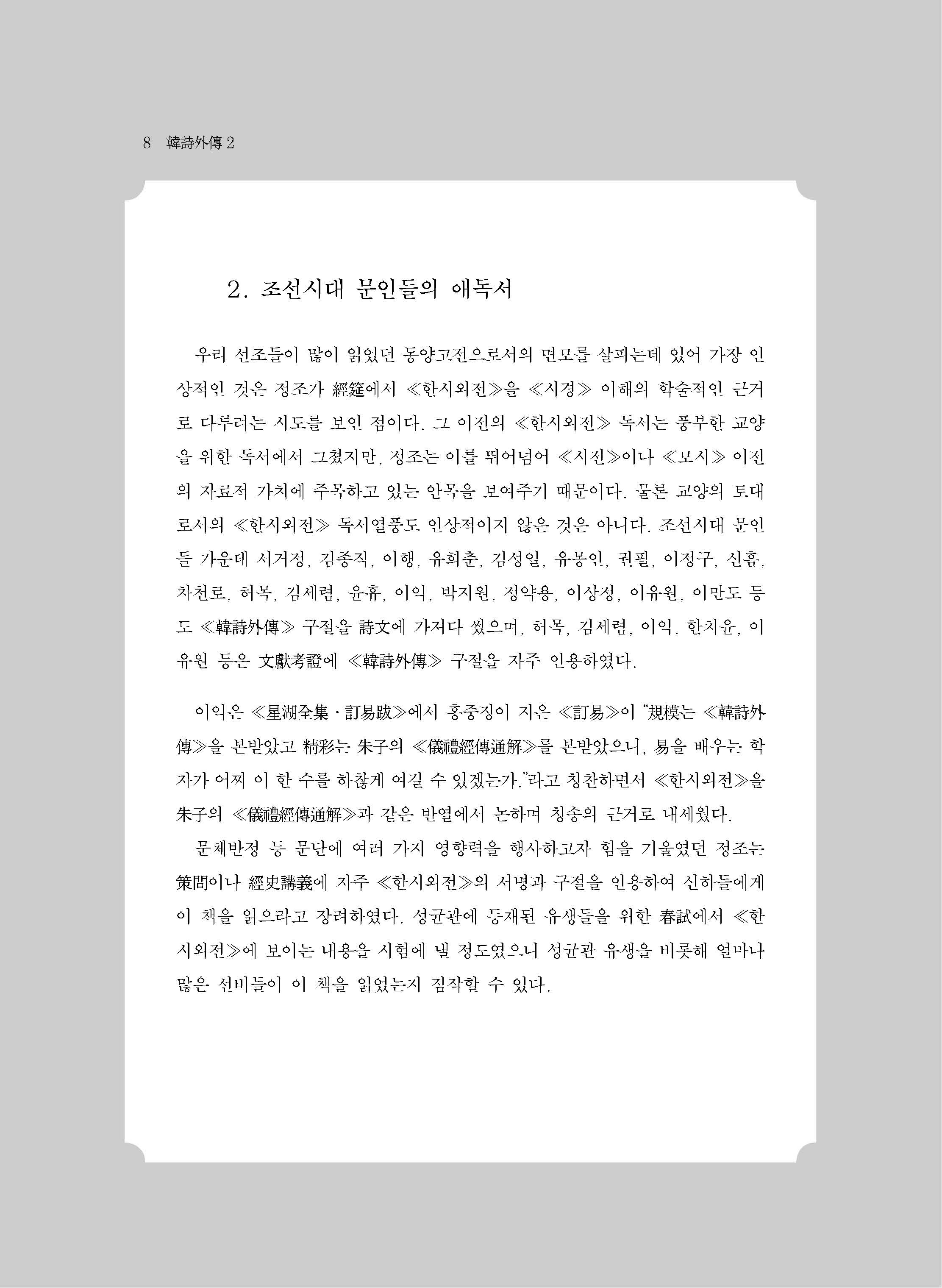 물론 교양의 토대로서의 ≪한시외전≫ 독서열풍도 인상적이지 않은 것은 아니다. 조선시대 문인들 가운데 서거정, 김종직, 이행, 유희춘, 김성일, 유몽인, 권필, 이정구, 신흠, 차천로, 허목, 김세렴, 윤휴, 이익, 박지원, 정약용, 이상정, 이유원, 이만도 등도 ≪한시외전≫ 구절을 시문에 가져다 썼으며, 허목, 김세렴, 이익, 한치윤, 이유원 등은 문헌고증(文獻考證)에 ≪한시외전≫ 구절을 자주 인용하였다.