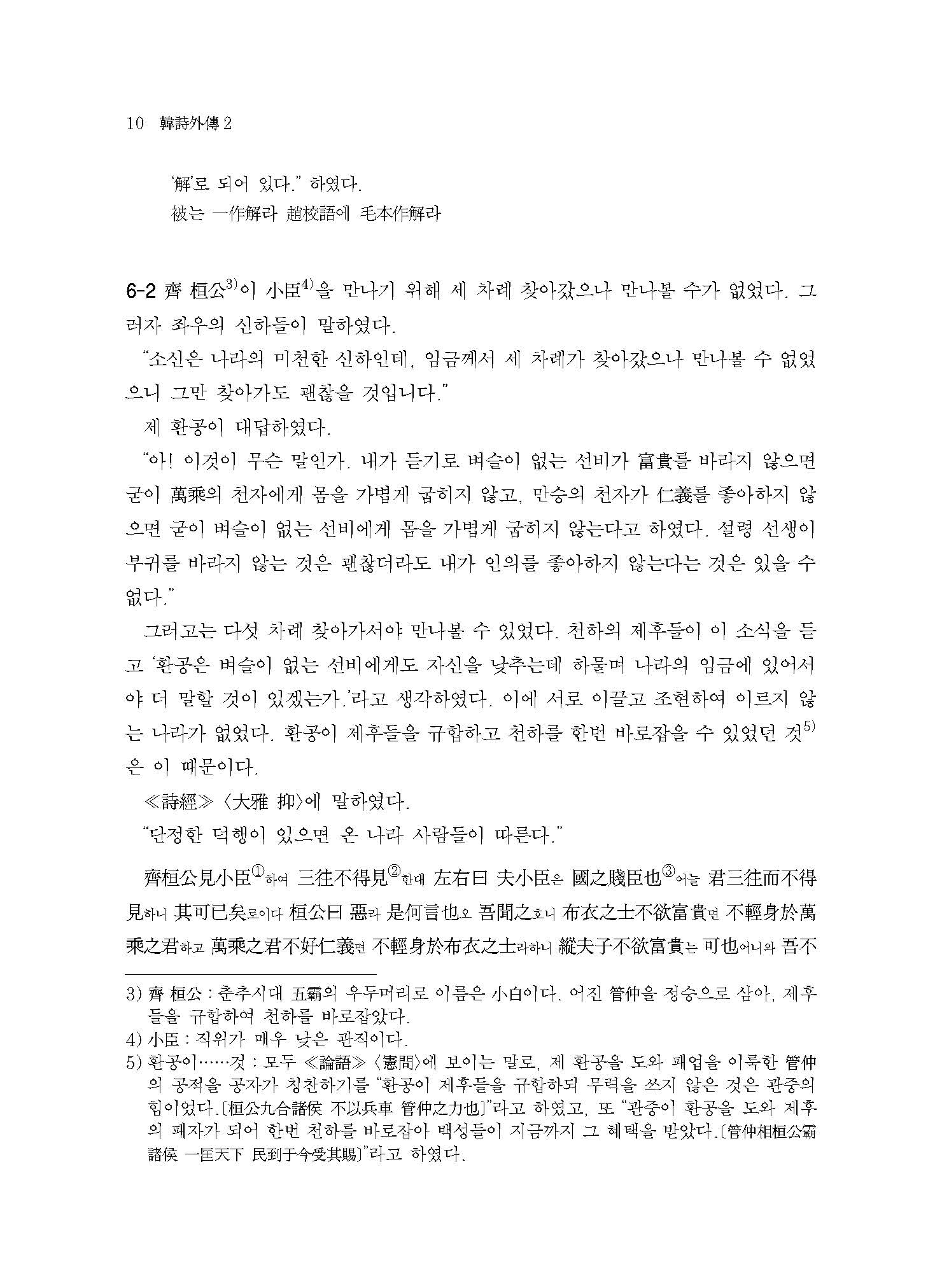 ≪한시외전(韓詩外傳)≫은 기보총서(畿輔叢書)를 기준으로 할 때, 309개의 장(章)으로 구성되어 있으며, 모두 314번에 걸쳐 ≪시경≫의 구절을 인용하고 있다. 대개의 경우 각 장마다의 삽화를 정리하면서 관련 ≪시경≫ 구절을 활용하고 있고, 굉장히 드문 경우이긴 하지만, 특정 구절을 먼저 제시한 후 이를 설명하면서 삽화를 동원하는 형식을 취하기도 한다. 그리고 ≪시경≫ 구절 외에 다른 출전을 동원하여 삽화를 요약하는 경우도 있는데, ≪주역(周易)≫은 6번, ≪논어≫는 3번, ≪노자≫는 2번, ≪서경≫은 1번 인용되었다. 이 밖에도 속담을 활용한 경우가 3번, 일시(逸詩)를 인용한 경우도 2번이나 된다. ≪한시외전≫에서 ≪시경≫을 인용하는 경우에도 양상이 단순하지는 않은데, 하나의 장에서 최대 7개의 ≪시경≫ 구절을 인용하는 경우가 1번, 5개 구절 인용도 1번, 3개 구절 인용은 2번, 2개의 구절 인용은 14번이며, 심지어 ≪시경≫ 구절을 인용하지 않는 장도 무려 23개나 된다. 본 ≪한시외전2≫에서는 총 열 권 가운데 다섯 권(6권~10권)이 수록되어있다.