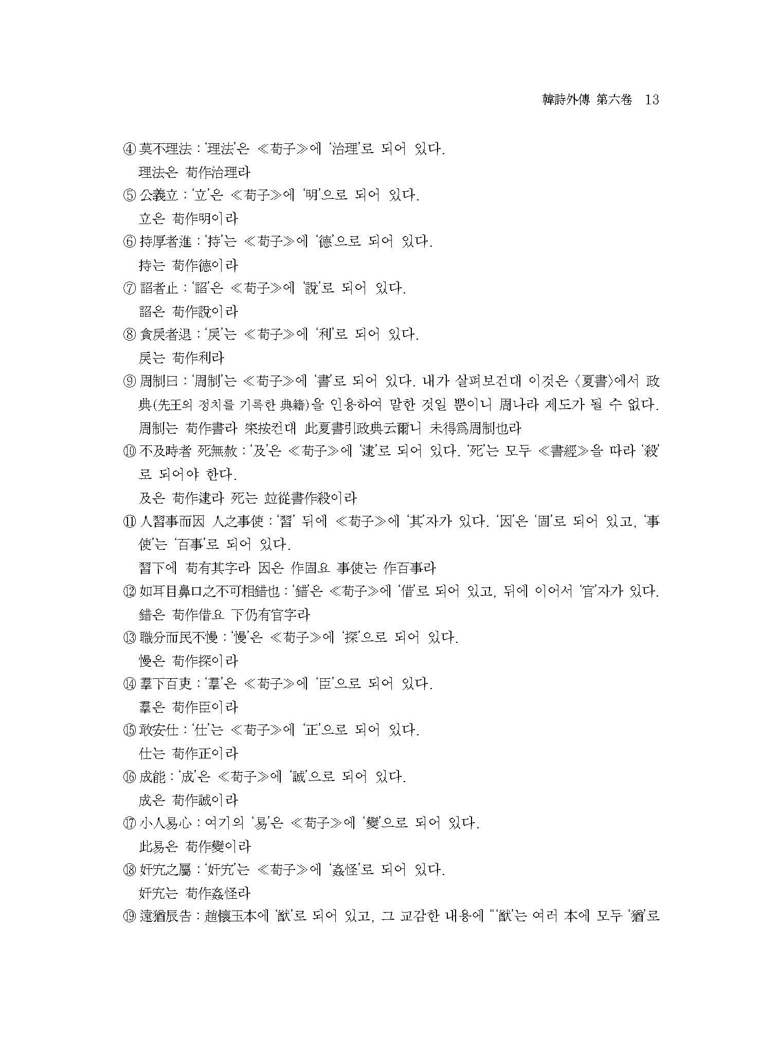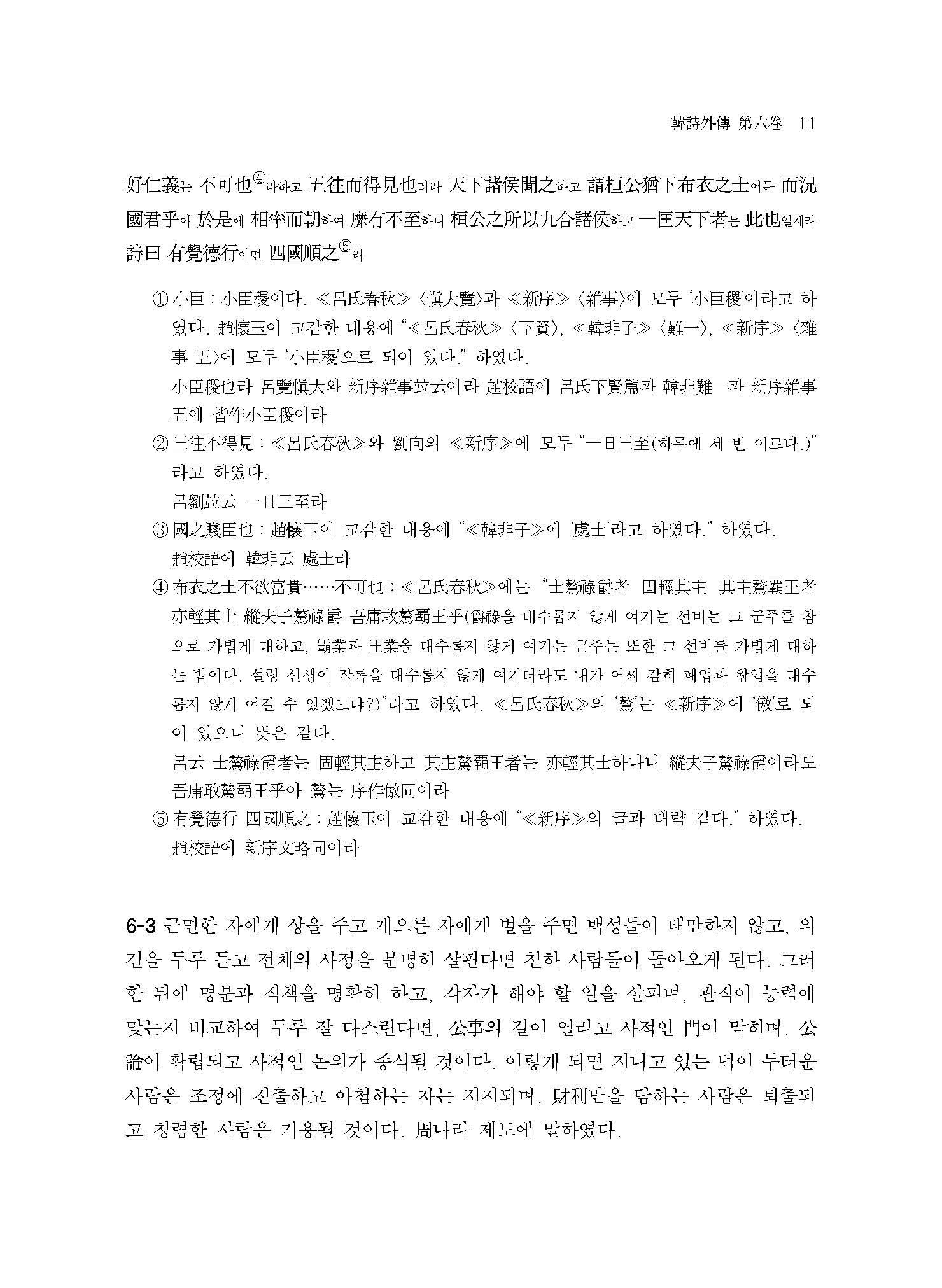 ≪한시외전(韓詩外傳)≫은 전고(典故)의 보고(寶庫)이다. 풍수지탄(風樹之嘆), 풍수지정(風樹之情), 당랑거철(螳螂拒轍), 등고능부(登高能賦), 해불양파(海不揚波), 시잠(蓍簪), 조가도수(朝歌屠?), 조구(糟丘), 계지오덕(鷄之五德), 삼비(三費), 오제(五際), 잠리(簪履), 석호(石虎), 토포악발(吐哺握髮) 등의 수많은 고사 숙어들의 출전이기에, 독자들이 이 번역서를 통해 원전과 함께 다양한 고사 숙어들을 배워서 활용할 수 있게 된다.