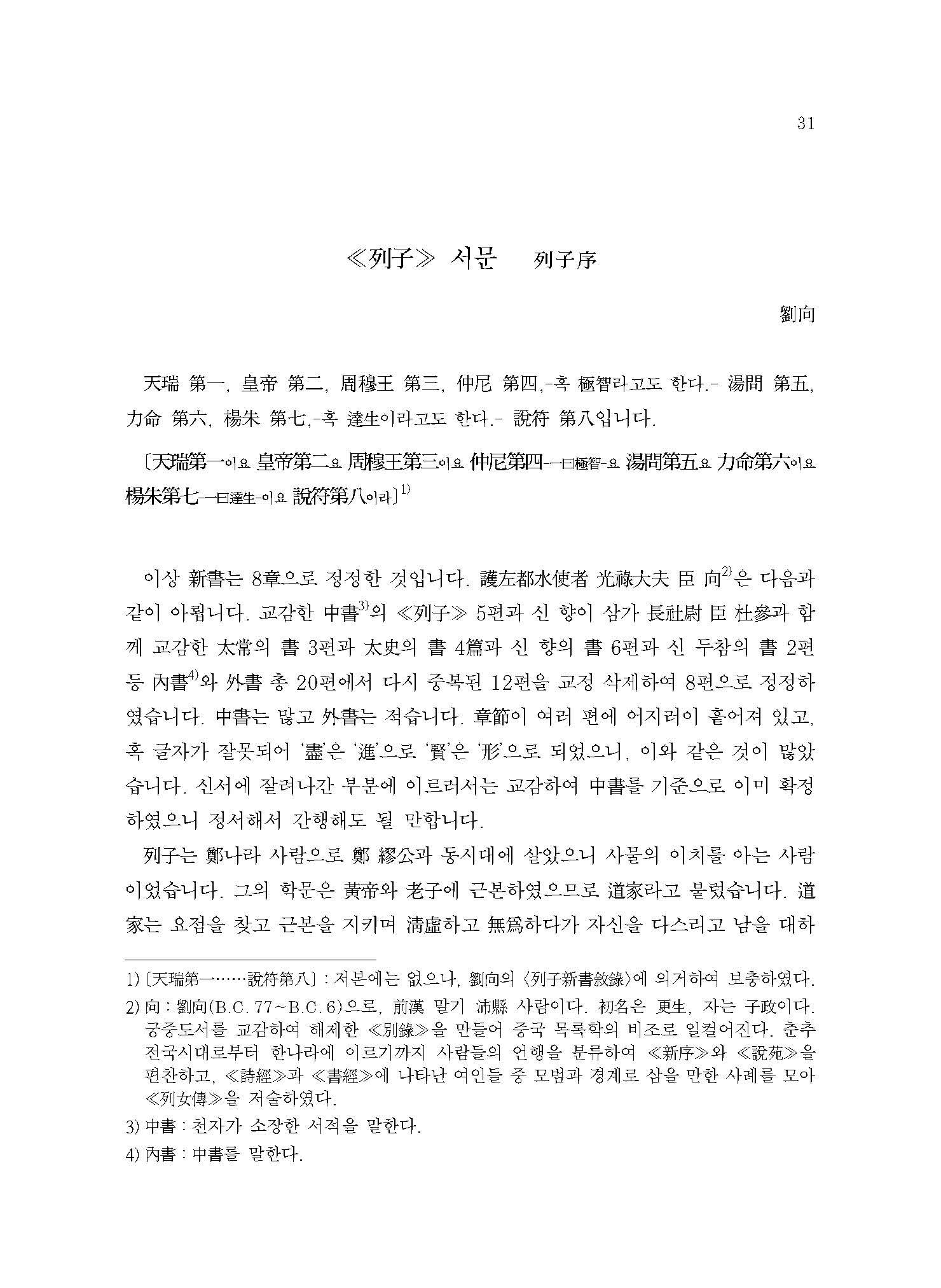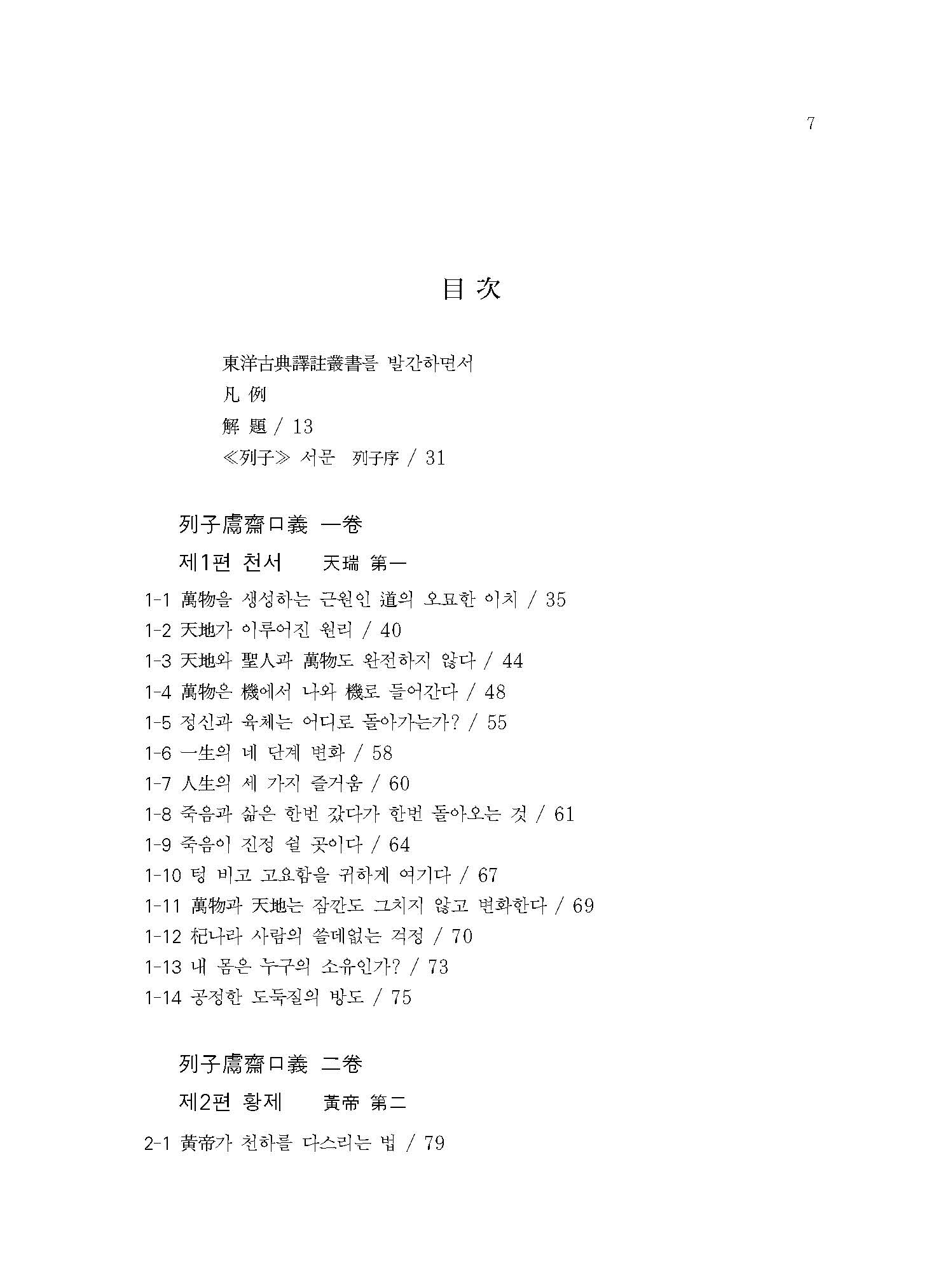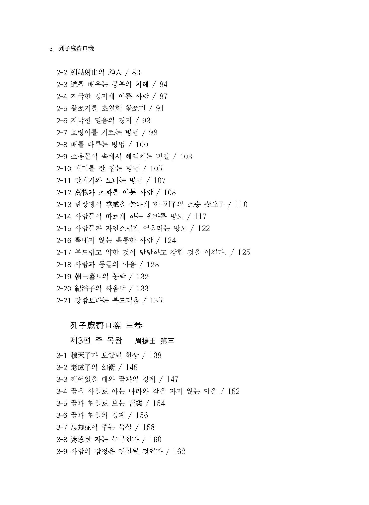 ≪열자≫는 ≪노자≫, ≪장자≫와 함께 도가道家의 3대 경전으로 손꼽히는 저술이다. ≪열자≫의 저자는 일반적으로 전국시대戰國時代 때 장자莊子보다 조금 앞선 시기에 살았던 열어구列禦寇라는 사람이라고 전해진다. 지금의 ≪열자≫에는 후한後漢 때 중국에 본격적으로 유입되었던 불교에 관한 내용이 실려 있는 등 ≪노자≫나 ≪장자≫에 비해 비교적 다양하고 잡다한 내용들이 많이 실려 있어서 순일한 저작으로 보기 어렵다. 그럼에도 ≪열자≫에는 청허淸虛와 방일放逸이라는 도가의 근본 사상이 전편에 깔려 있으며, 우공이산愚公移山이나 조삼모사朝三暮四, 주 목왕周穆王, 과보?父 등에 관련된 수많은 신화와 전설과 고사와 우화들을 통해 이를 전개하고 있다. 이 점에서 ≪열자≫는 도교道敎를 넘어서 동아시아의 사상적·문학적 전통의 형성에 지대한 영향을 끼친 매우 가치 있는 저작이라고 볼 수 있다.