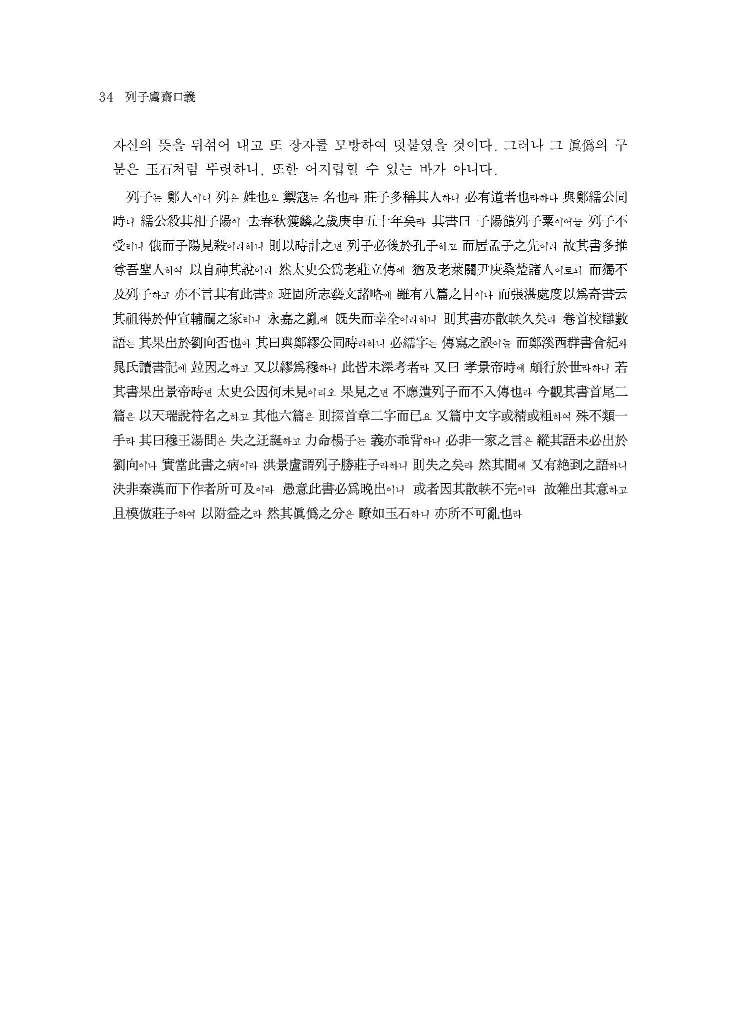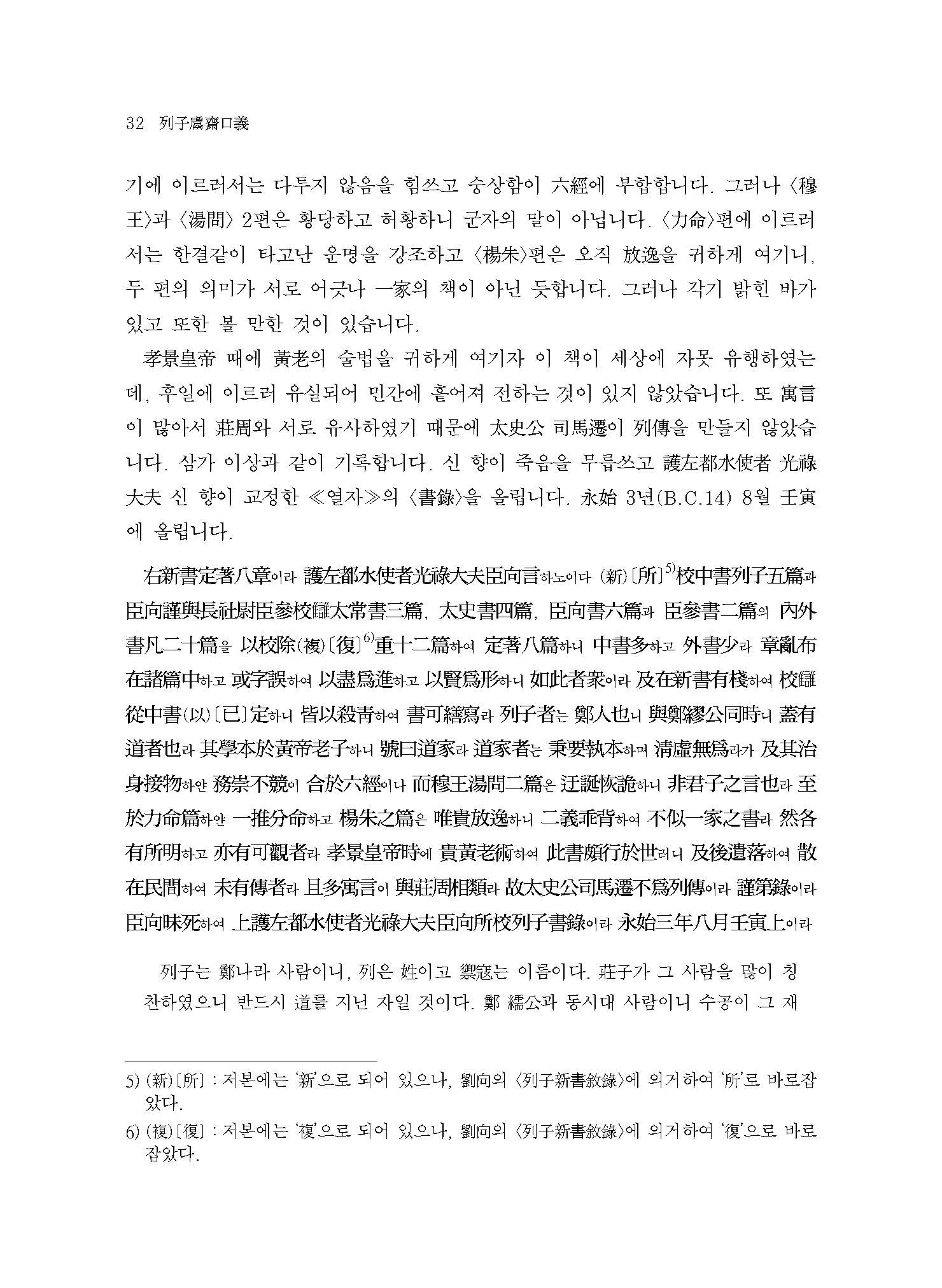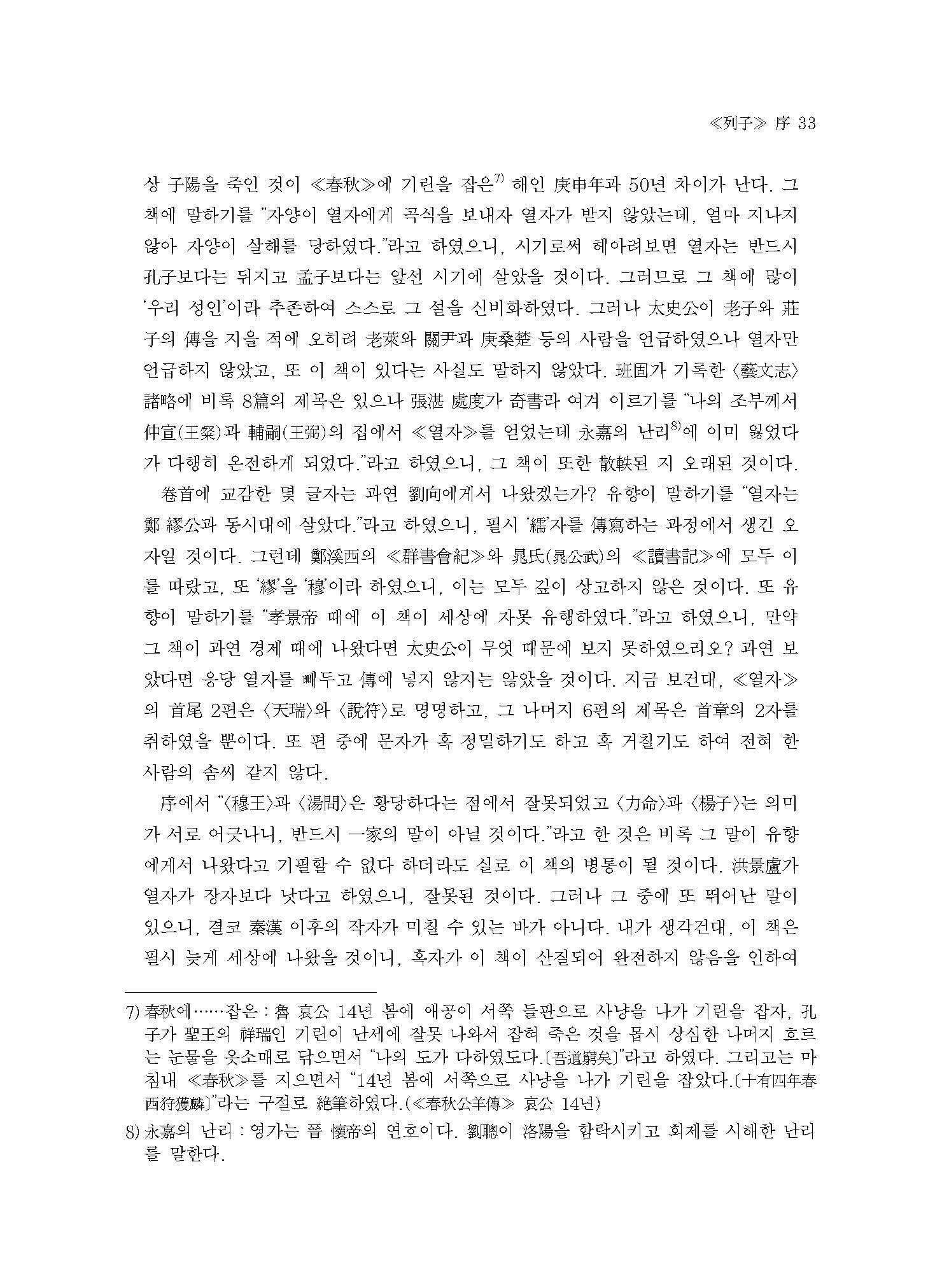 ≪열자≫는 ≪노자≫, ≪장자≫와 함께 도가道家의 3대 경전으로 손꼽히는 저술이다. ≪열자≫의 저자는 일반적으로 전국시대戰國時代 때 장자莊子보다 조금 앞선 시기에 살았던 열어구列禦寇라는 사람이라고 전해진다. 지금의 ≪열자≫에는 후한後漢 때 중국에 본격적으로 유입되었던 불교에 관한 내용이 실려 있는 등 ≪노자≫나 ≪장자≫에 비해 비교적 다양하고 잡다한 내용들이 많이 실려 있어서 순일한 저작으로 보기 어렵다. 그럼에도 ≪열자≫에는 청허淸虛와 방일放逸이라는 도가의 근본 사상이 전편에 깔려 있으며, 우공이산愚公移山이나 조삼모사朝三暮四, 주 목왕周穆王, 과보?父 등에 관련된 수많은 신화와 전설과 고사와 우화들을 통해 이를 전개하고 있다. 이 점에서 ≪열자≫는 도교道敎를 넘어서 동아시아의 사상적·문학적 전통의 형성에 지대한 영향을 끼친 매우 가치 있는 저작이라고 볼 수 있다.
