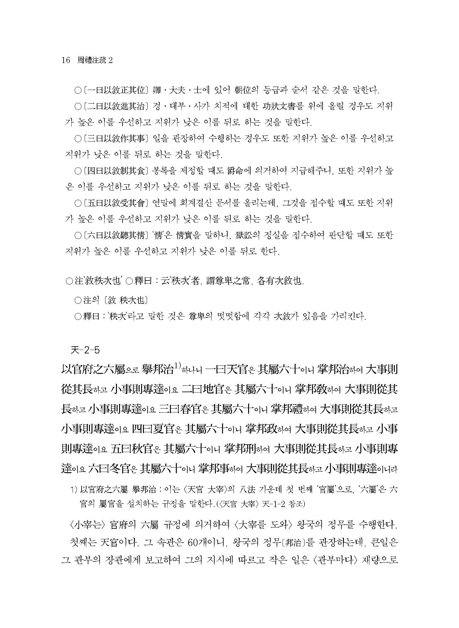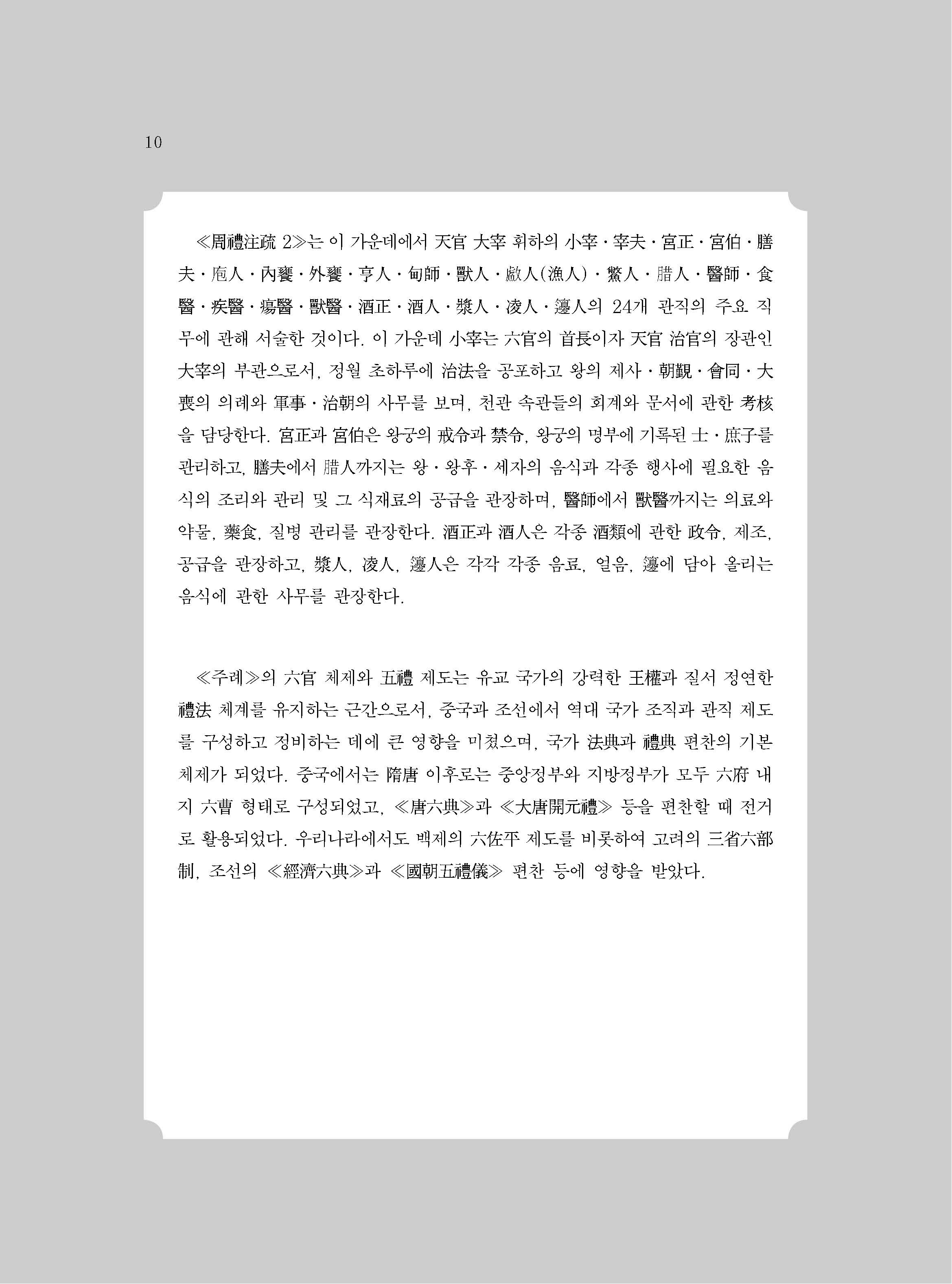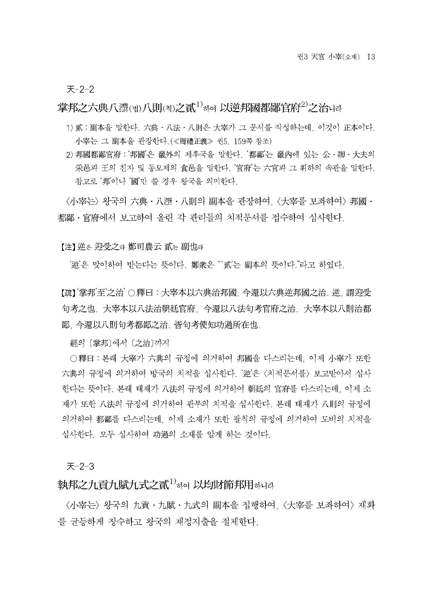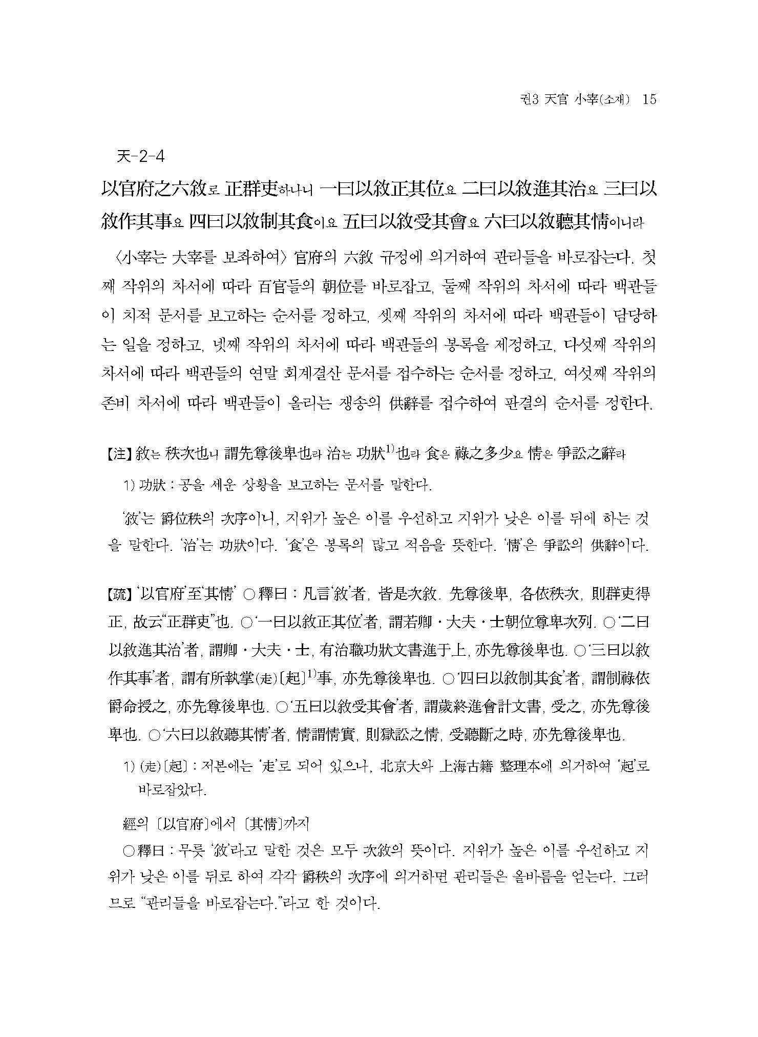 ≪역주 주례주소2≫는 천관天官 태재大宰 휘하의 소재小宰?재부宰夫?궁정宮正?궁백宮伯?선부膳夫?포인?人?내옹內饔?외옹外饔?팽인亨人?전사甸師?수인獸人?어인?人?별인鱉人?석인?人?의사醫師?사의食醫?질의疾醫?양의瘍醫?수의獸醫?주정酒正?주인酒人?장인漿人?능인凌人?변인?人의 24개 관직의 주요 직무에 관해 다루고 있다.