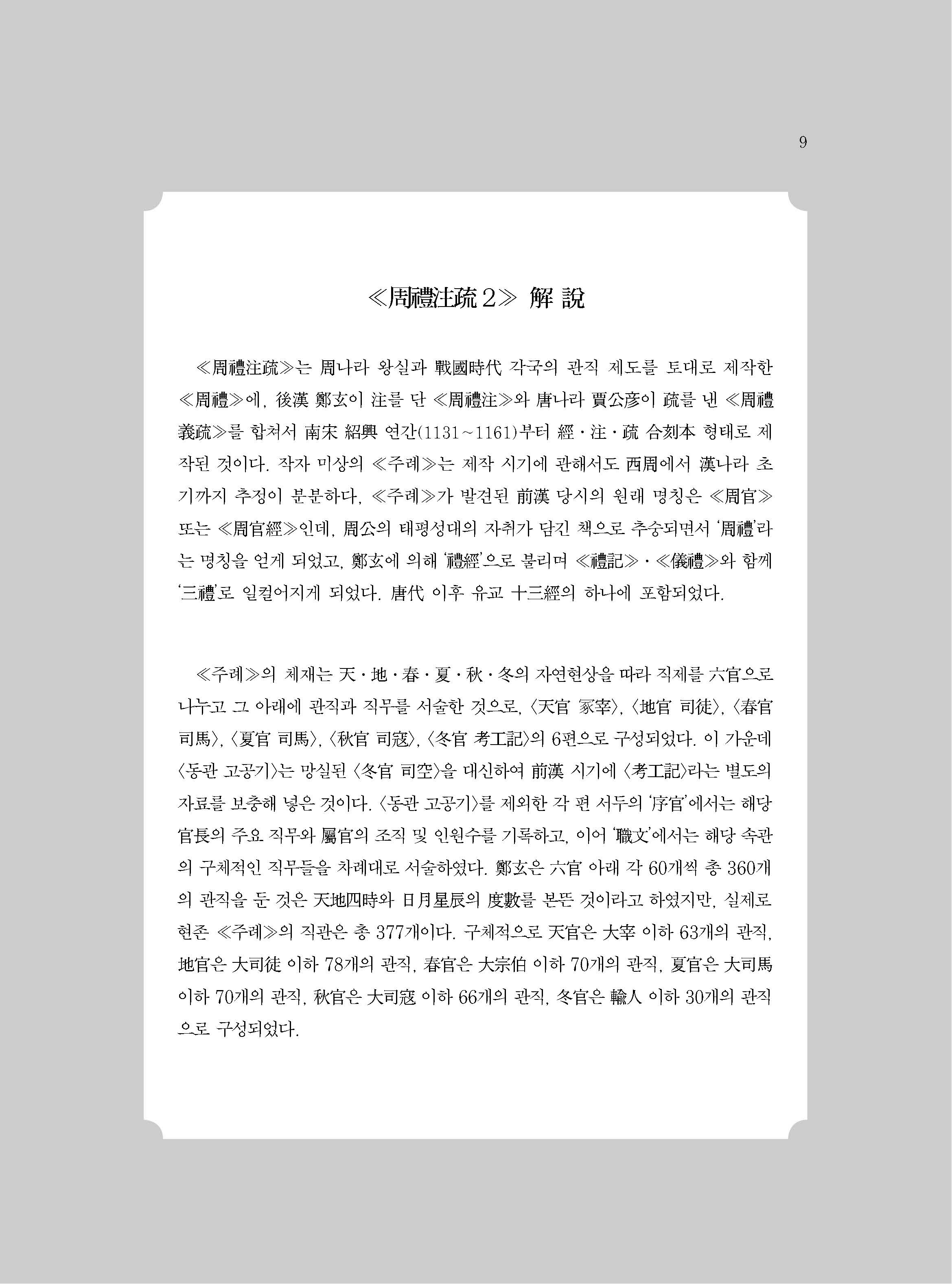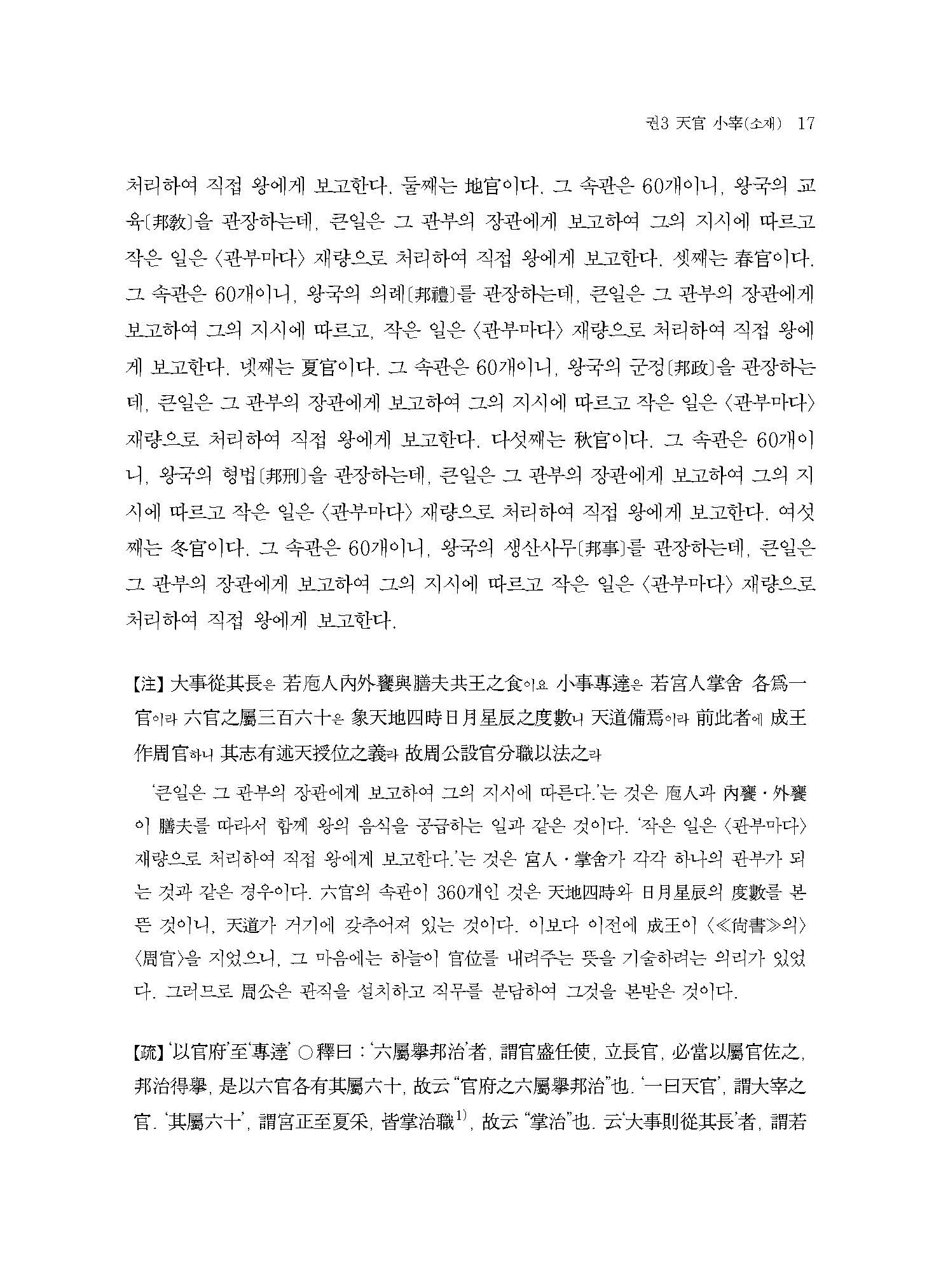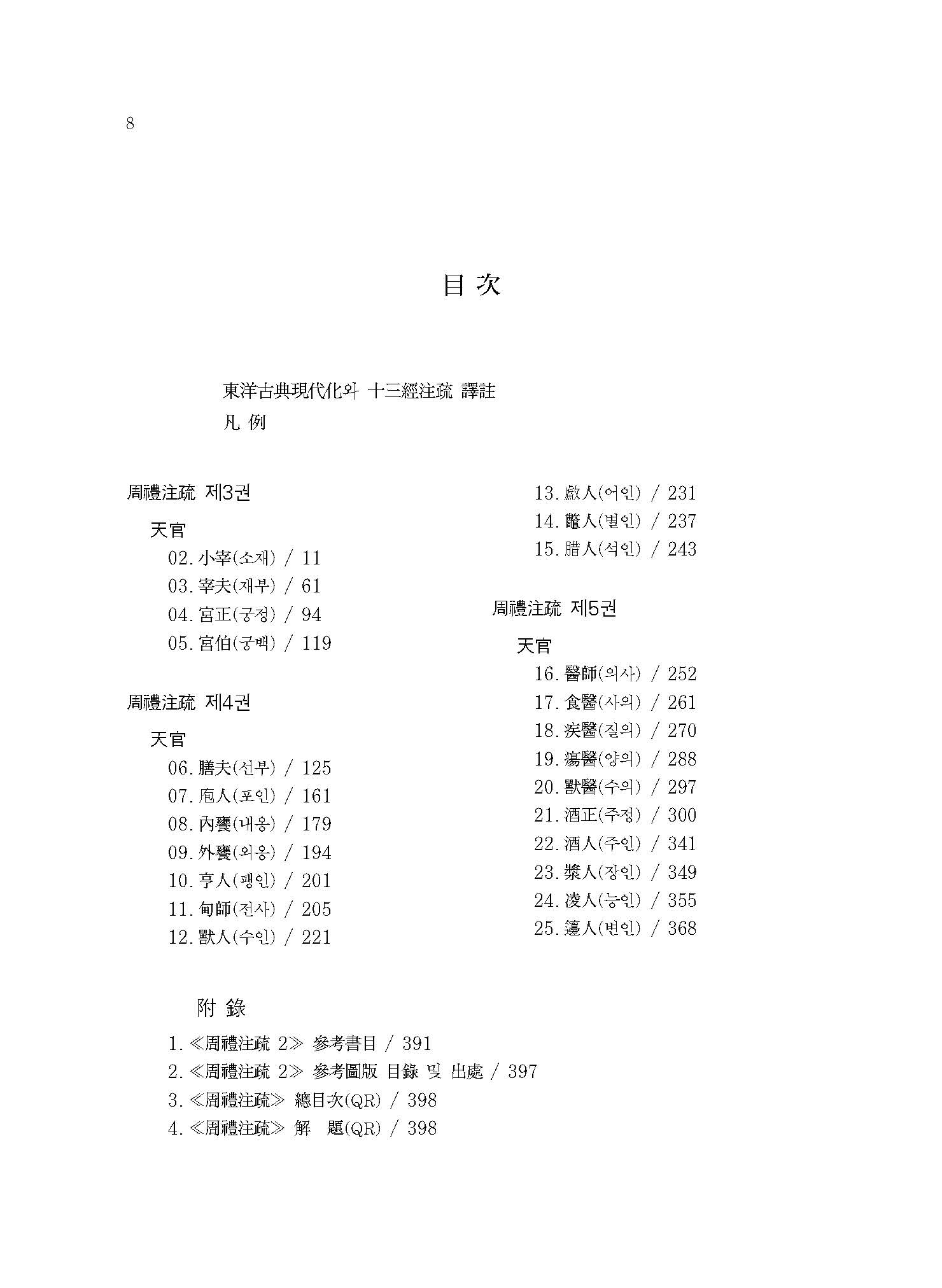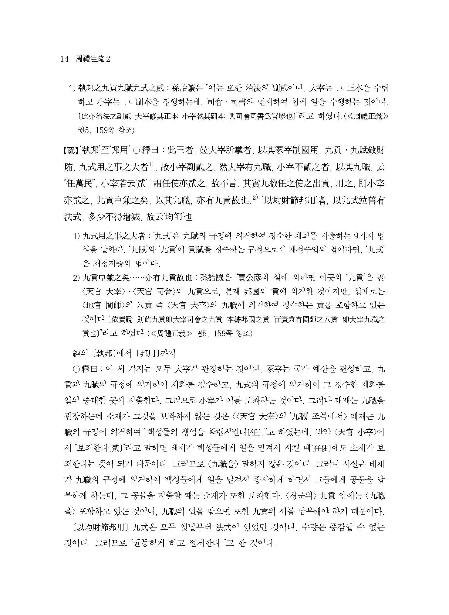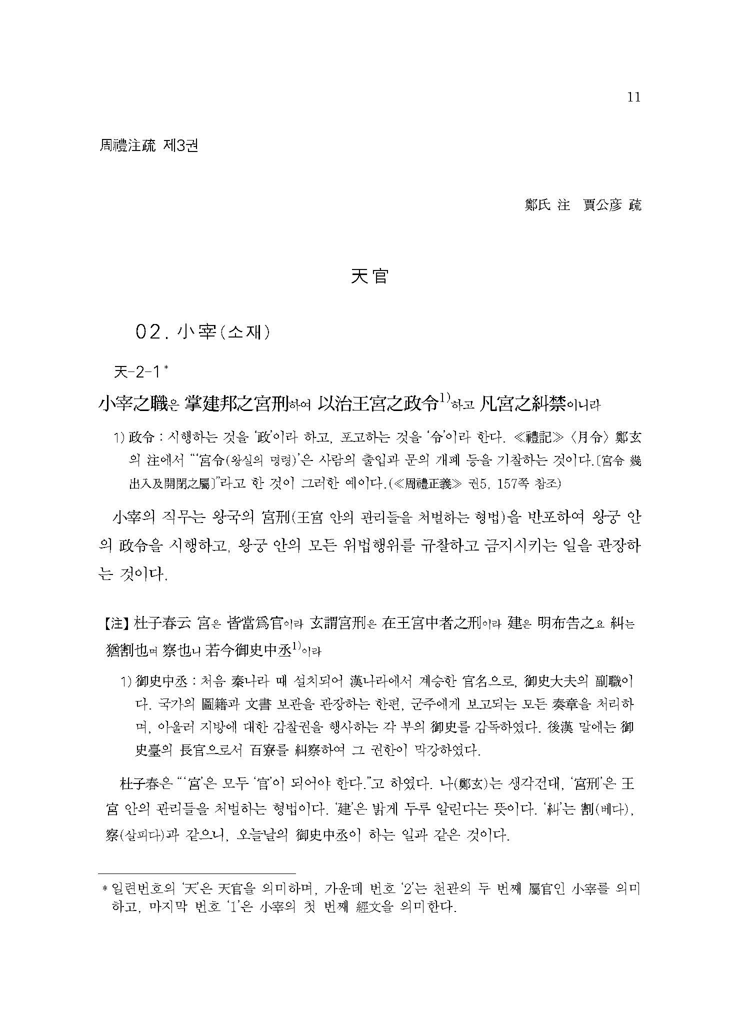 ≪역주 주례주소2≫는 천관天官 태재大宰 휘하의 소재小宰?재부宰夫?궁정宮正?궁백宮伯?선부膳夫?포인?人?내옹內饔?외옹外饔?팽인亨人?전사甸師?수인獸人?어인?人?별인鱉人?석인?人?의사醫師?사의食醫?질의疾醫?양의瘍醫?수의獸醫?주정酒正?주인酒人?장인漿人?능인凌人?변인?人의 24개 관직의 주요 직무에 관해 다루고 있다.
