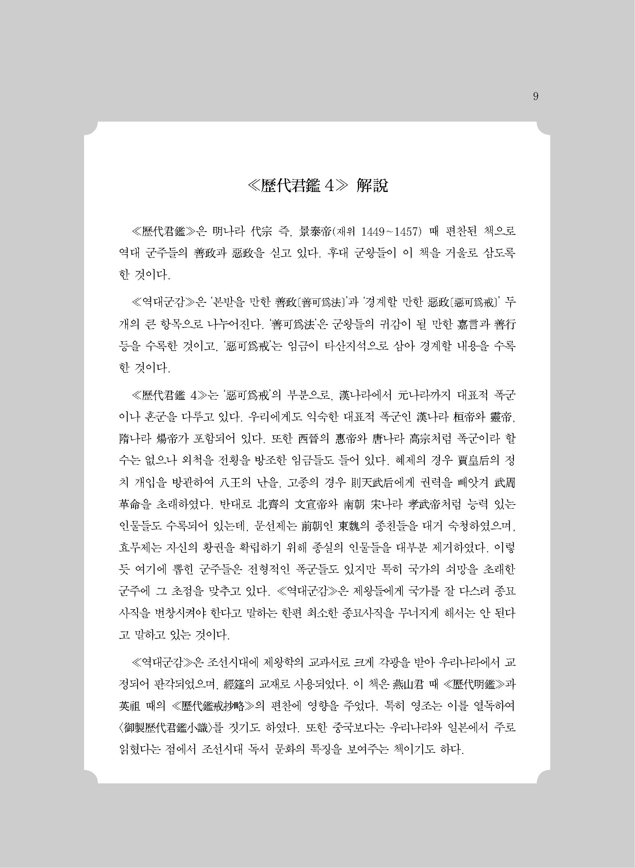‘감鑑’은 ‘거울로 삼다’는 뜻으로 본받거나 경계할 때 쓰는 말로, ≪역대군감歷代君鑑≫은 임금들이 자신의 행실을 반추할 수 있도록 만들어진 거울이다. 본서는 명나라 대종代宗 경태제景泰帝가 중국 상고시대부터 명나라까지 89명의 임금들을 뽑아서 선정善政을 본받고 악정惡政을 경계하기 위해 편찬한 책이다. 이들 중에 55명은 명군들이고, 34명은 폭군이나 무능한 임금들이다. 훌륭한 임금으로는 요?순?우?탕 같은 전설적인 성군부터 우리에게 익숙한 한 고조 유방, 명견만리明見萬里의 고사로 유명한 광무제, 삼고초려三顧草廬의 유비, 당 태종 이세민 등을 들고 있다. 악정에 행한 임금으로는 말희?喜와 달기?己 같은 미녀들에 빠져 있던 걸왕桀王과 주왕紂王에서부터 만리장성을 쌓은 진시황제, 술에 취하면 사람을 죽인 북제北齊의 문선제文宣帝 등을 들고 있다.