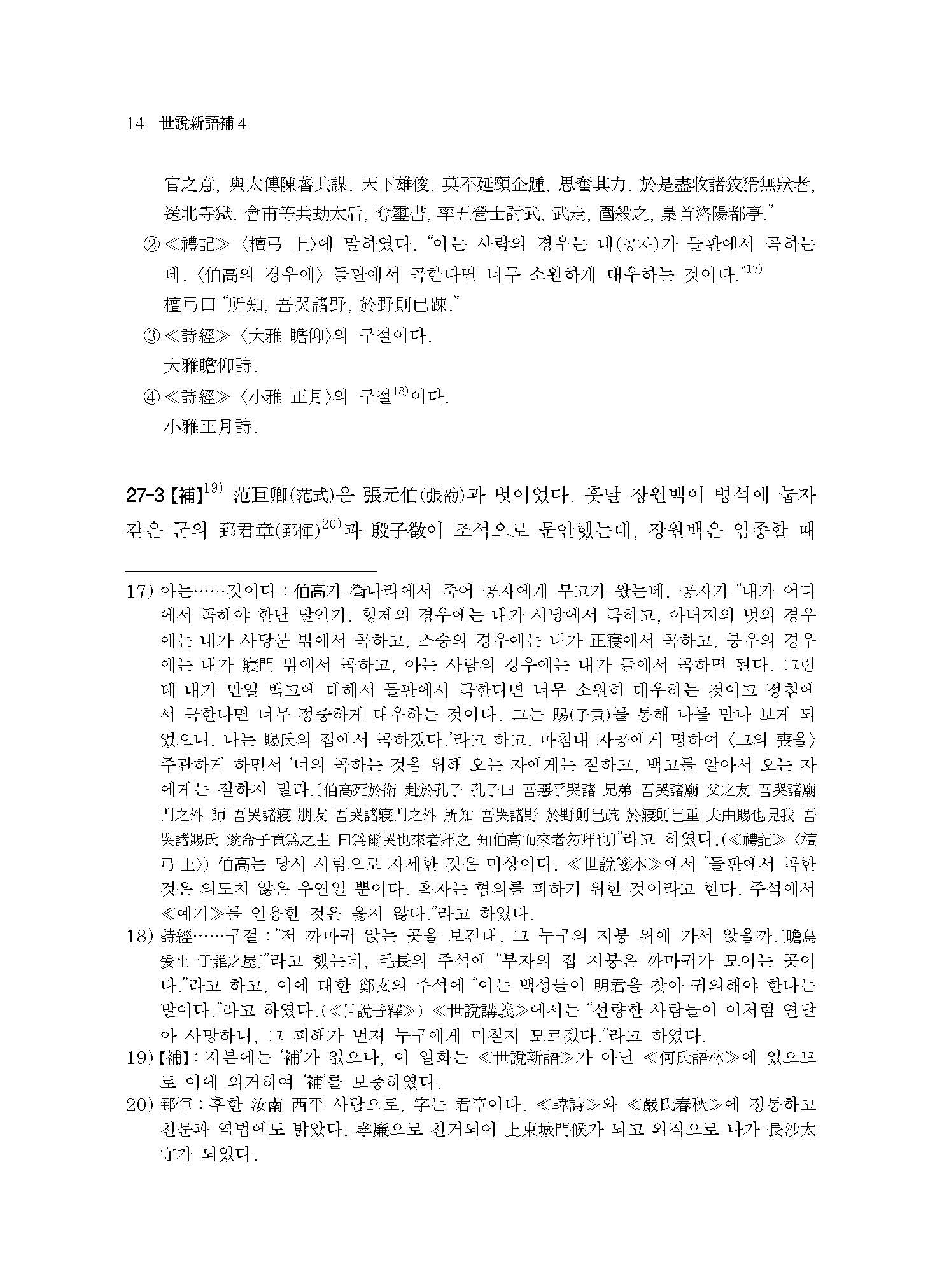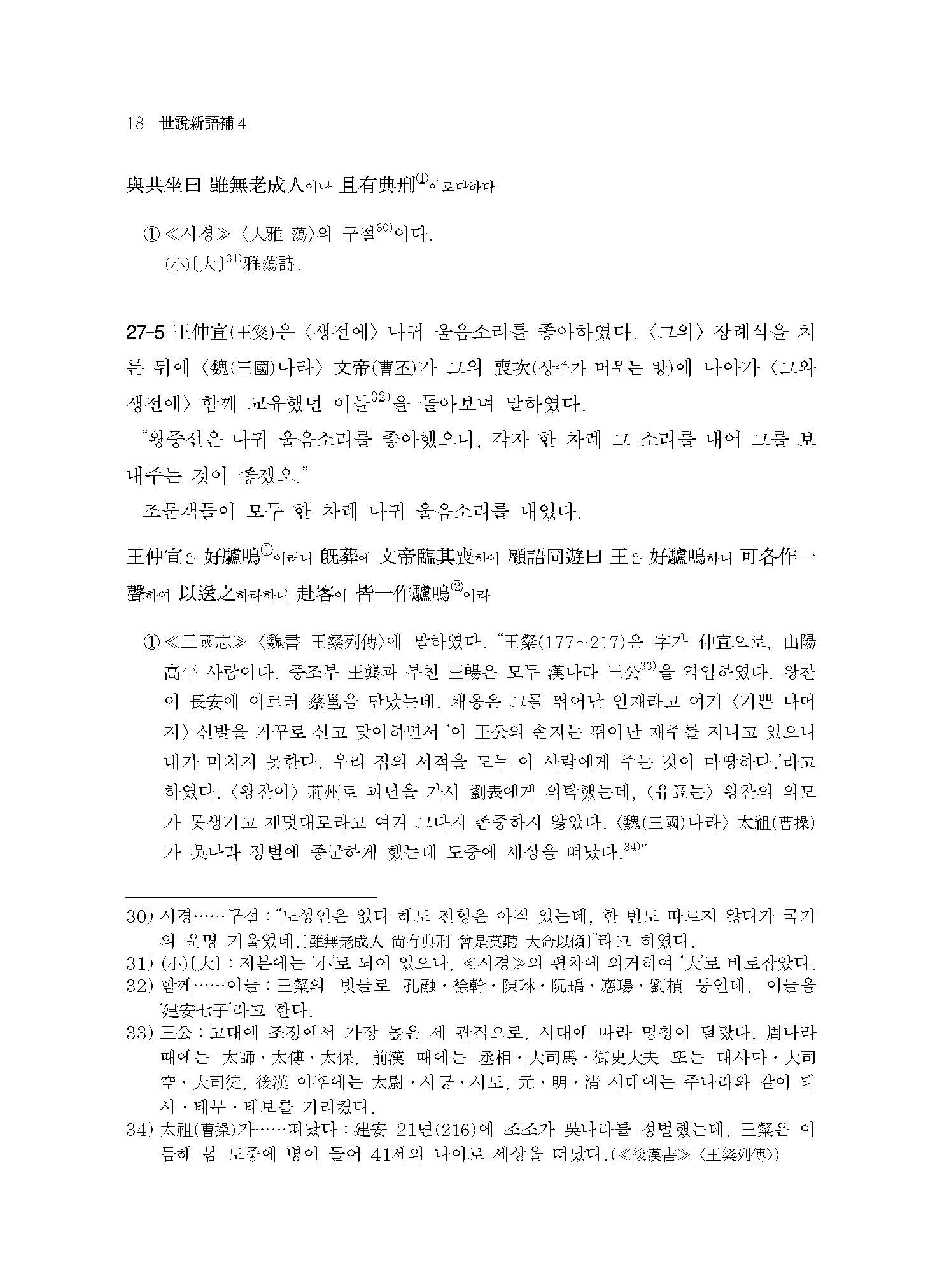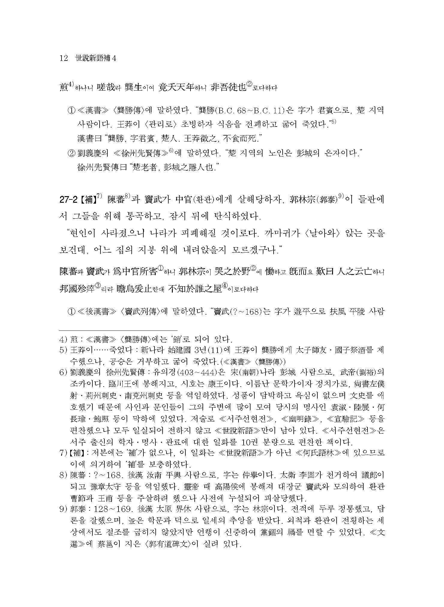≪세설신어보 4≫에서는 ≪세설신어보≫ 전체 36편 중 아홉 주제의 9편(14권 傷逝~17권 排調 上)이 수록되었다. 주제의 개요는 다음과 같다.