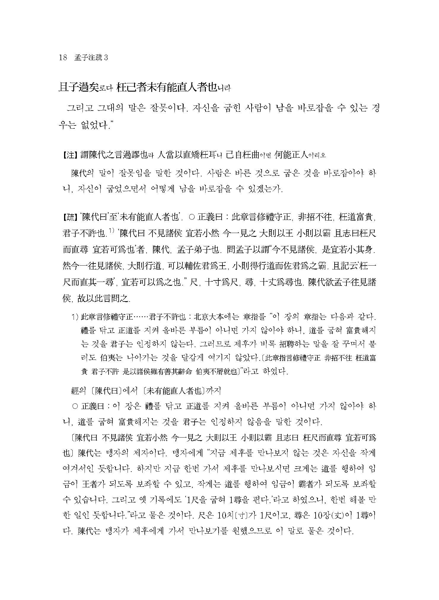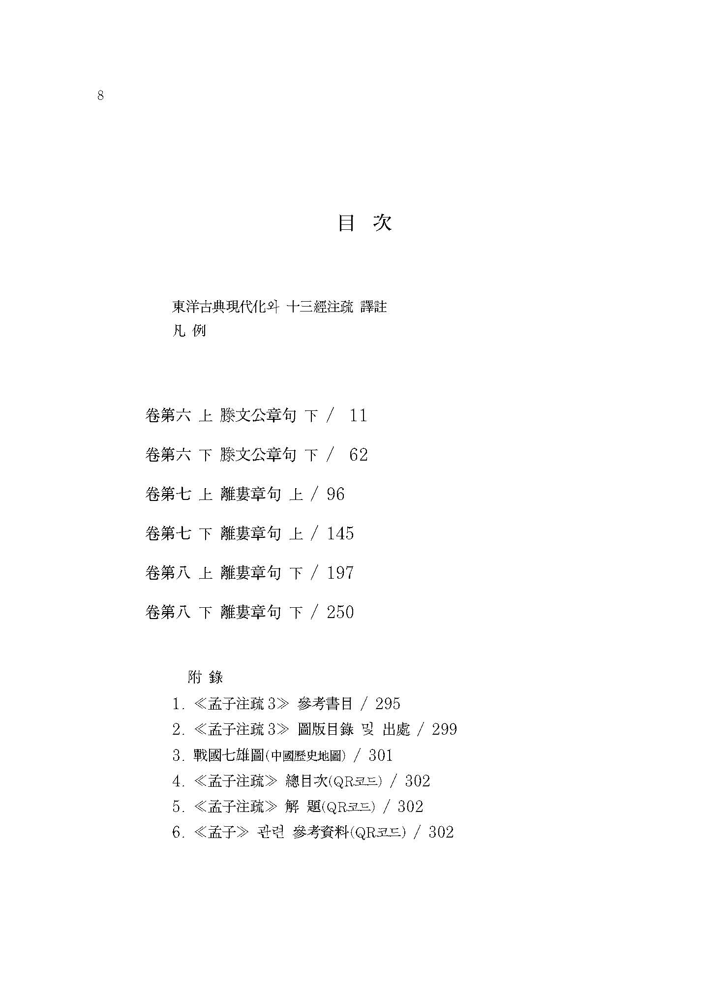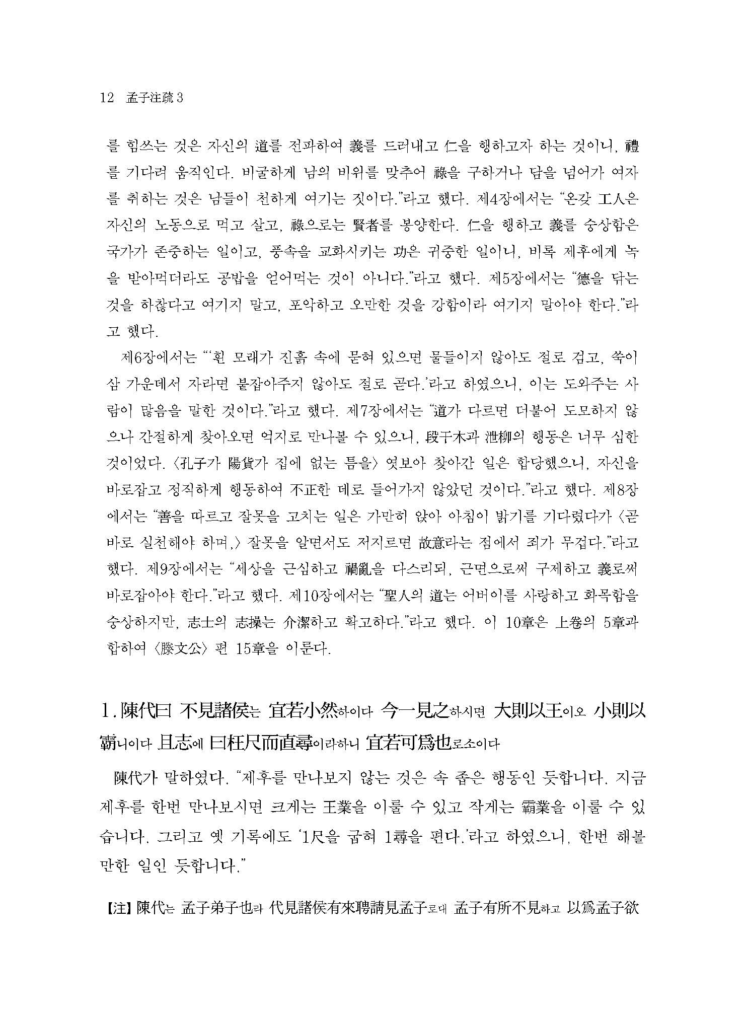 전통문화연구회가 발간하는 ≪역주 맹자주소≫는 ≪맹자주소≫를 처음으로 완역하는 책이다. 이번에 간행하는 ≪역주 맹자주소≫ 3권에는 등문공 장구(?文公章句) 하, 이루 장구(離婁章句) 상·하를 번역하여 수록하였다. ≪역주 맹자주소≫는 완성도 높은 번역을 위해 십여 년간 고전 번역에 종사한 고전 번역 전문가들이 협동연구번역을 하였다. 본서는 심도 있는 이해를 위해 상세한 역주를 달았으며, 가독성을 높이기 위해 현대적인 표현을 사용하는 것에 주안점을 두었다. 이를 위해 인용된 수많은 전거의 내용을 확인하고 이를 밝혀 전문성을 확보하였으며, 현대의 언어감각에 부합하는 적절한 어휘를 찾아 표현하려 노력하였다. 편마다 간략한 설명을 붙여 내용의 이해에 도움이 되도록 하였다.
