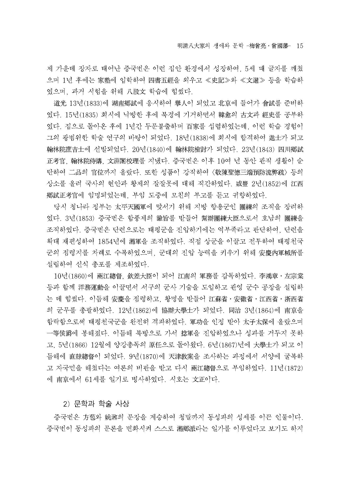 증국번(1811~1872)은 호남湖南 상향湘鄕 사람으로 동성이라는 지역적 연관성은 없으나 북경北京에 있으면서 고문을 연구할 적에 방포方苞와 요내姚?의 문장에 영향을 받고서 동성파로 자임하였다. 특히 그의 ≪경사백가잡초經史百家雜?≫는 요내의 ≪고문사류찬古文辭類纂≫을 잇는 대표적 고문 선집이라 할 수 있다. 이에 학자들은 증국번을 이후 동성파를 ‘상향파湘鄕派’ 또는 ‘후기 동성파’로 부르기도 한다.