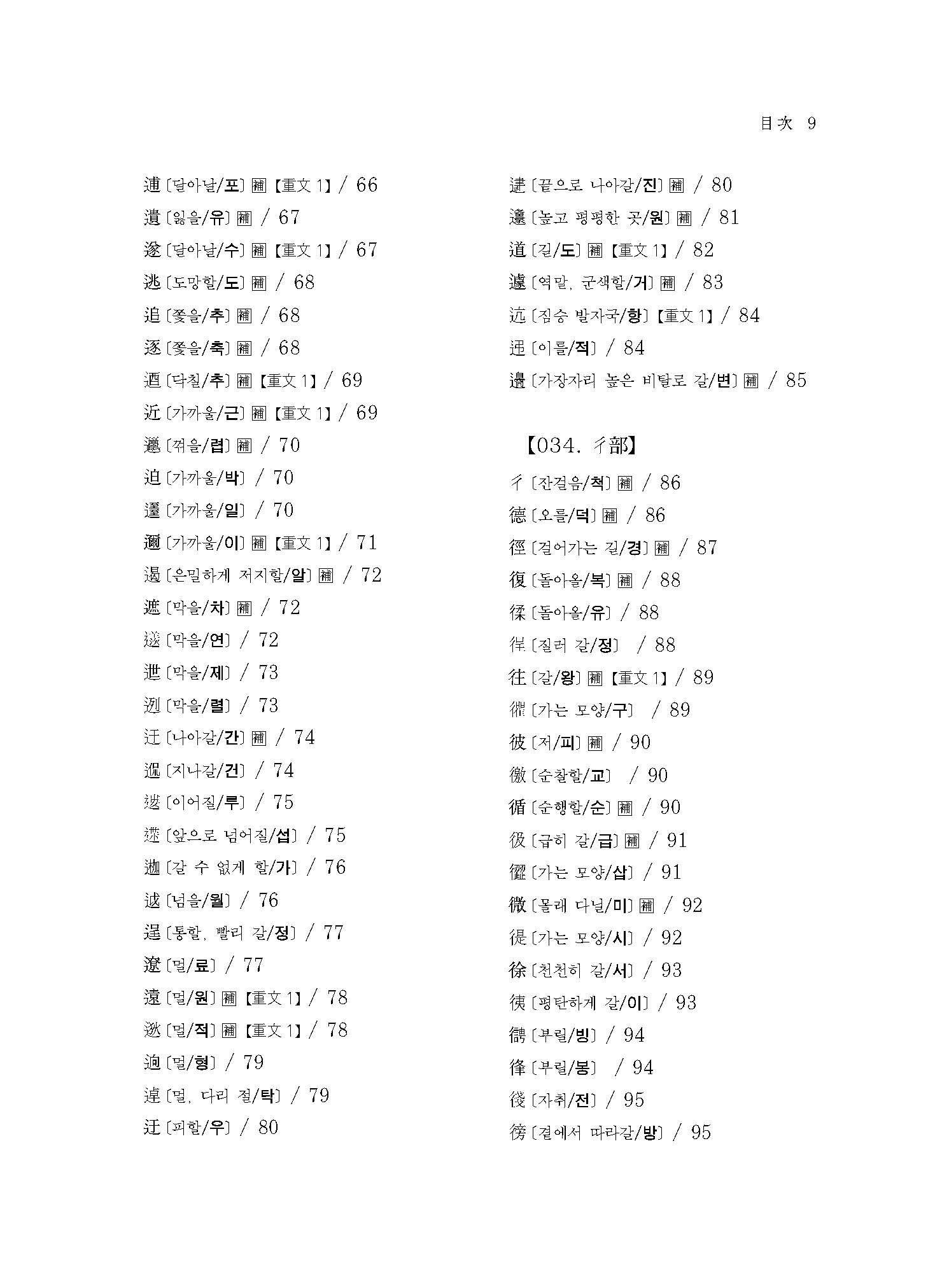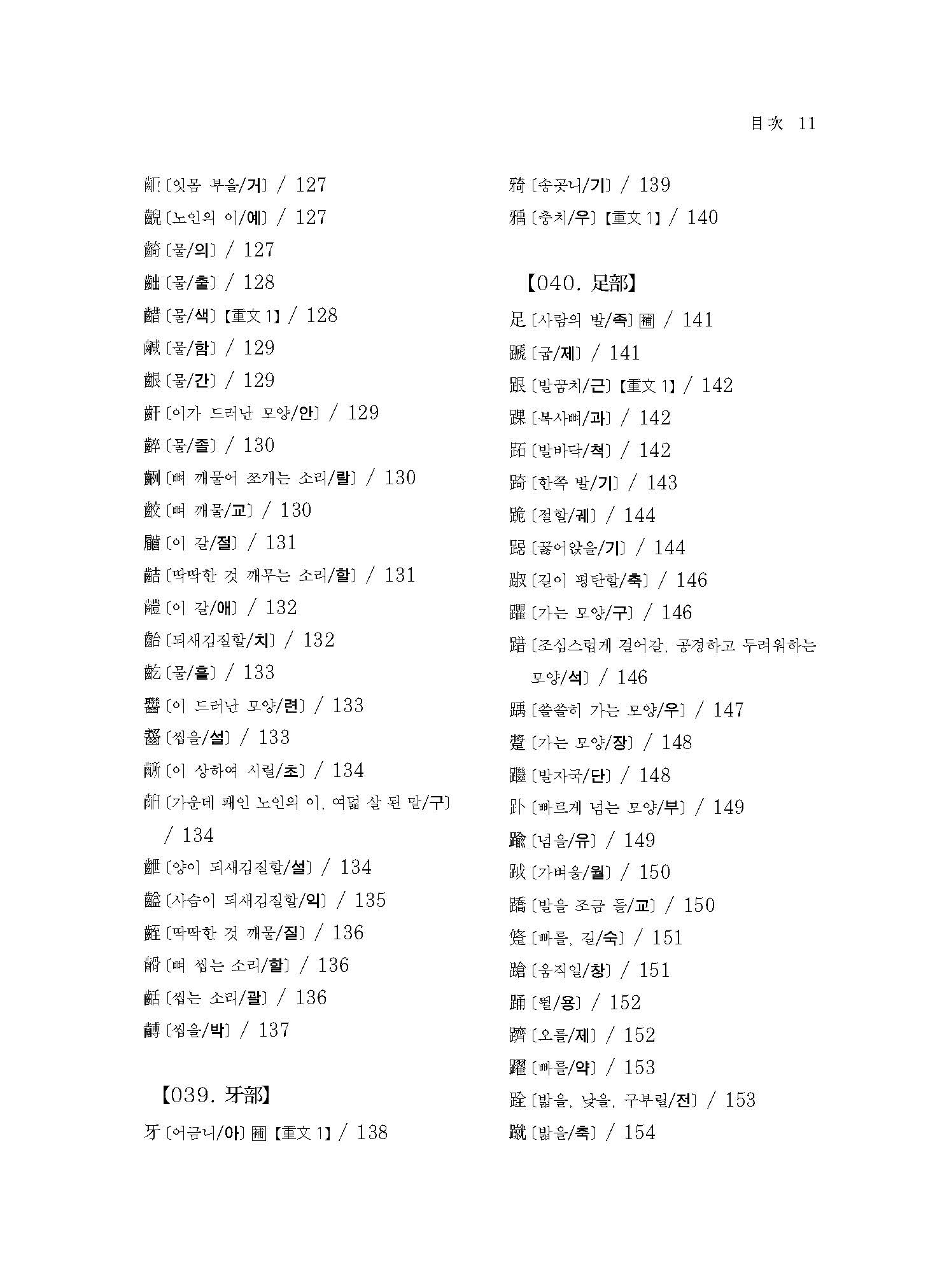 본서의 표제자는 대부분 사람의 발 모양을 본뜬 正·是·?·?·?·?·行·齒·牙·足 등의 부수(部首)로 구성되어 있다. ‘正’은 갑골문에서 발의 모양을 본뜬 止와 어떠한 지역을 뜻하는 ?이 합쳐진 ‘’의 형태로 발견된다. 이는 어떠한 지역[?]으로 나아가[止] 정벌을 통해 ‘바로잡다’는 의미로 지녔다. 나머지 부수 역시 발이나 길의 모양을 본뜬 글자로 구성되었다. 그런데 한 가지 생긴 의문점은 사거리의 모양을 본뜬 ‘行’이 사람의 이를 뜻하는 ‘齒’자가 오는 것이다. 그런데 ‘齒’자가 발의 모양을 본뜬 止와 그 나머지 글자로 구성된 글자임을 안다면 전혀 이상할 것이 없고, 치아의 뜻을 가진 ‘牙’자를 다음에 두어 ‘이빨/치아’에 해당하는 글자를 한 곳에서 정리하였다. 이후 발의 모양을 본뜬 ‘足’자로 돌아가 다시 부수를 정리하는 방식의 부수를 세우는[建部] 방법을 취하였다.